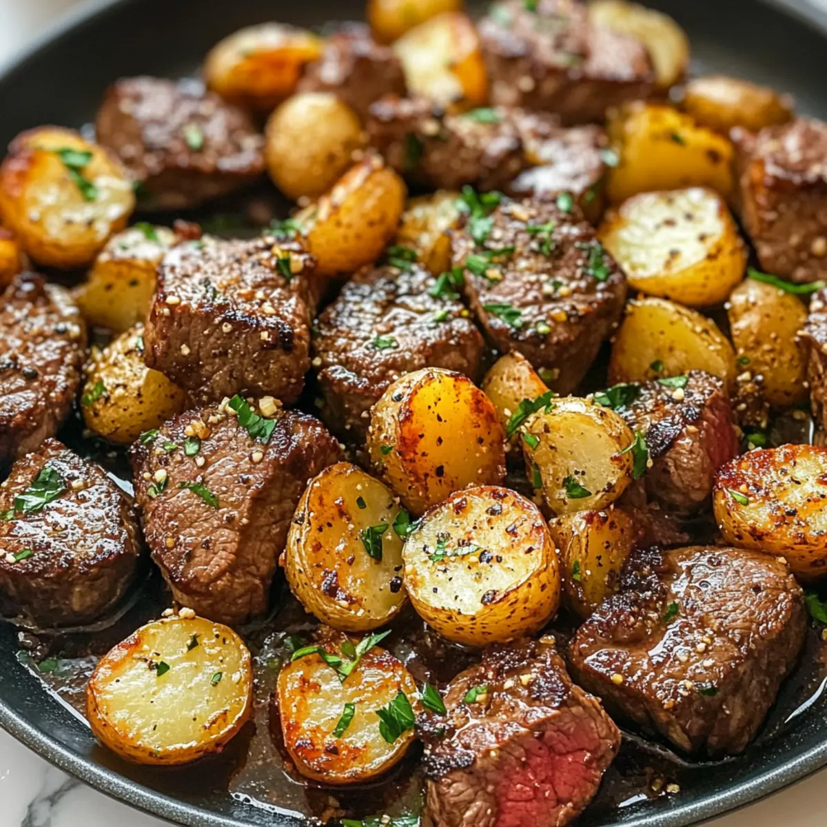 Herzhafter Geschmack: Die Kombination aus zartem Steak und knusprigen Kartoffeln in einer cremigen Knoblauchsoße bringt absolute Gaumenfreuden.