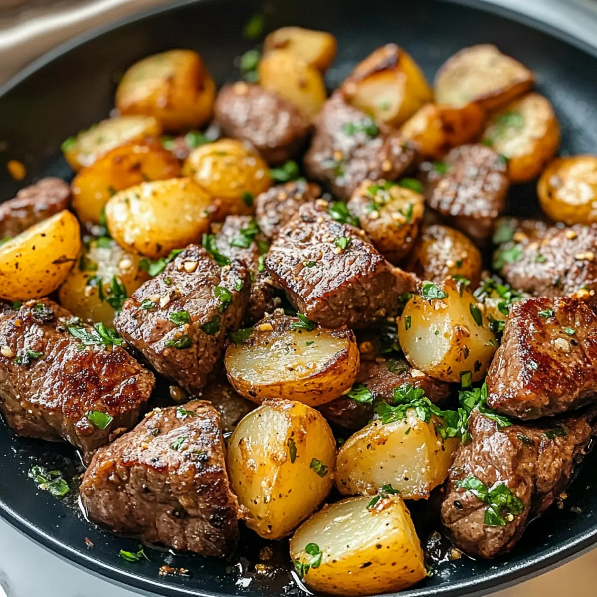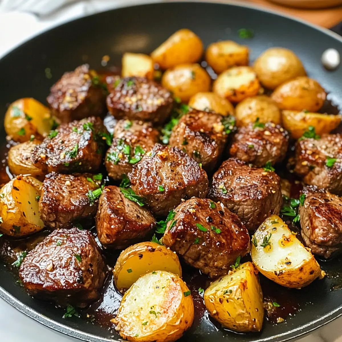 Knoblauch Steak Bissen und Kartoffeln Rezept: Ein herzhaftes und einfaches Gericht für ein gemütliches Abendessen.