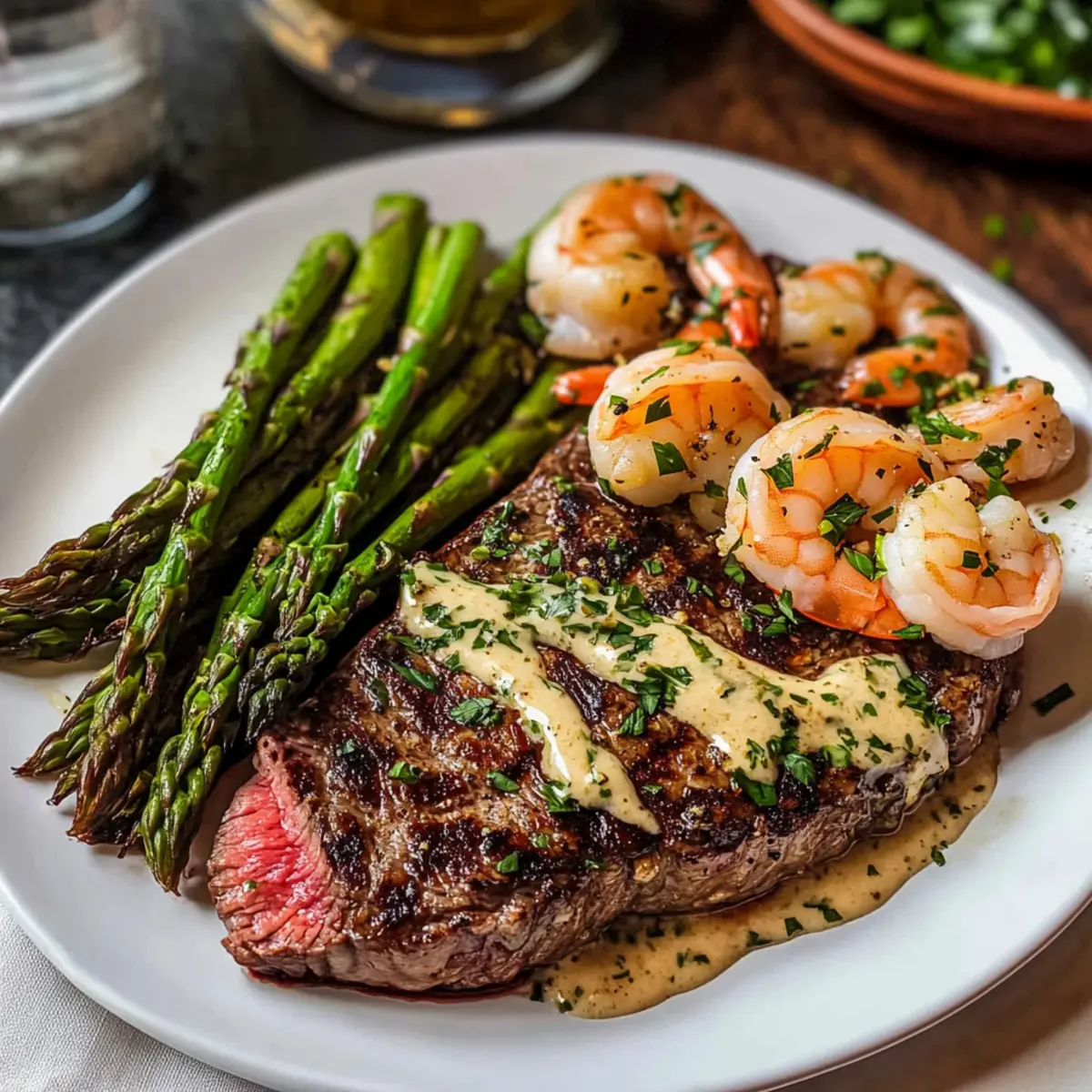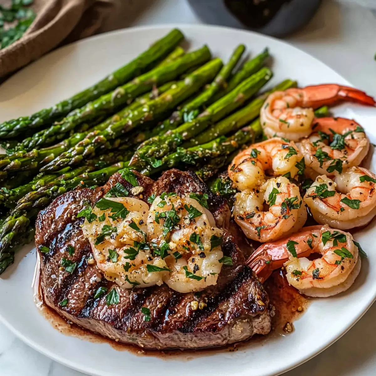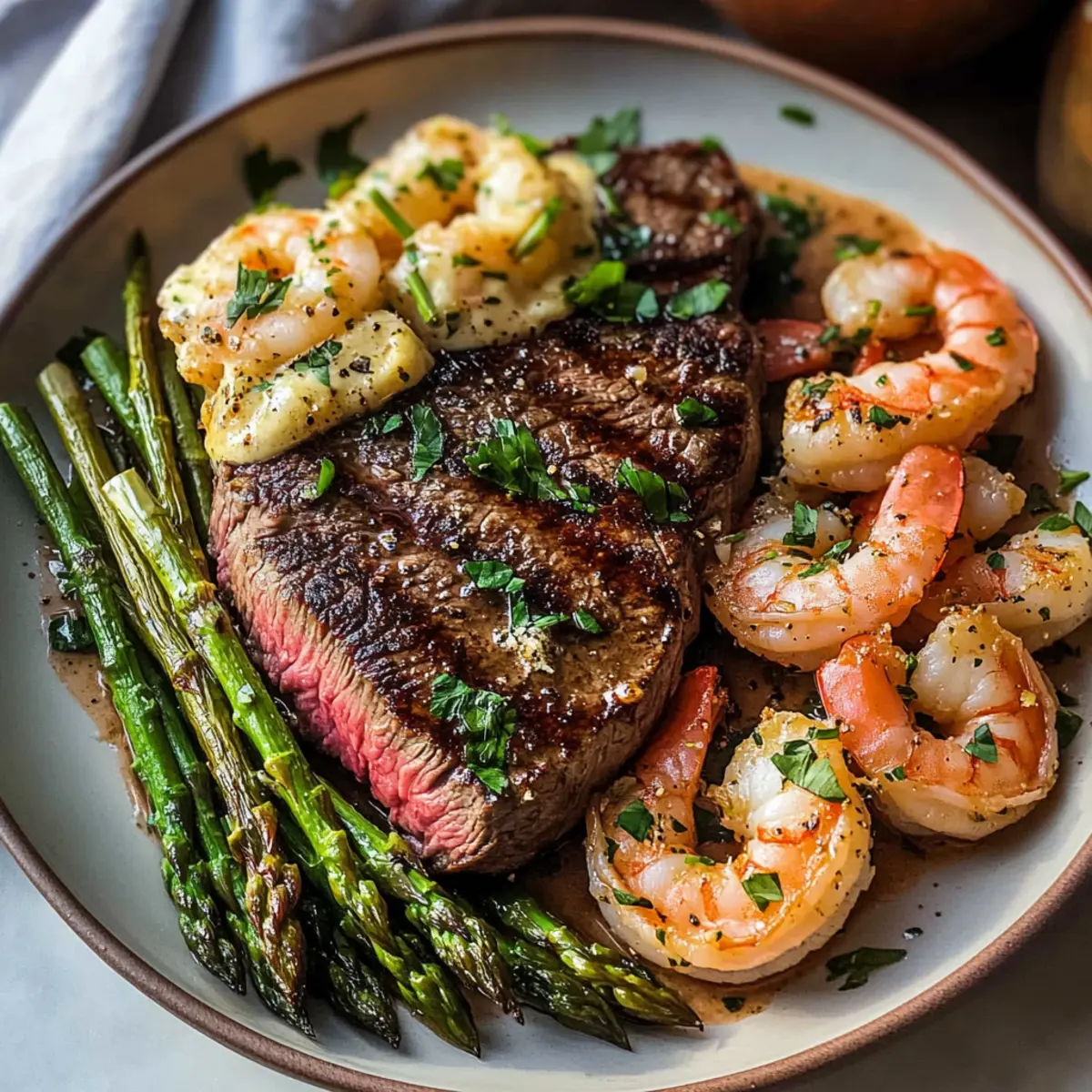 Ein köstlicher Duft zieht durch die Küche, während die Pfanne heiße Temperaturen erreicht. Heute bereite ich ein fantastisches Gericht zu: Knoblauchbutter-Ribeye-Steak und Garnelen. Diese Kombination aus saftigem Ribeye und zarten, in der Pfanne gebratenen Garnelen ist nicht nur ein Fest für die Sinne, sondern verwandelt auch ein gewöhnliches Abendessen in einen Hauch von Luxus. Perfekt für ein romantisches Date oder ein schnelles, aber beeindruckendes Abendessen mit Freunden, bietet dieses Rezept eine unkomplizierte Zubereitung und ist voller nahrhafter Proteinquellen. Kein Stress, nur ein einfacher Genuss! Wer könnte da widerstehen? Lass uns gemeinsam entdecken, wie man dieses Traumgericht zaubern kann! Warum wird dieses Rezept begeistert? Leichtigkeit: Die Zubereitung des Knoblauchbutter-Ribeye-Steaks und der Garnelen ist kinderleicht und benötigt nur grundlegende Kochkenntnisse. Vielfalt: Du kannst das Ribeye nach Belieben durch andere Cuts wie T-Bone oder Sirloin ersetzen, und sogar die Garnelen durch Scampi oder Hummer variieren, um deinen persönlichen Twist hinzuzufügen. Zartheit: Die Kombination aus saftigem, perfekt gebratenem Steak und zarten Garnelen sorgt für ein wahres Geschmackserlebnis. Genuss für jeden Anlass: Ob für ein romantisches Dinner oder eine entspannte Abendessenrunde mit Freunden, dieses Rezept eignet sich hervorragend für jede Gelegenheit. Zeitsparend: In weniger als 30 Minuten hast du ein Gourmet-Gericht gezaubert, das keine Wünsche offenlässt. Für mehr Ideen, wie du dein Fleisch zubereiten kannst, schau dir auch meine scharfen gegrillten Blumenkohlsteaks an oder entdecke, wie du mit gefüllten Champignons grillen kannst. Knoblauchbutter-Ribeye-Steak und Garnelen Zutaten Für das Steak und die Garnelen Rinder-Ribeye-Steak – Hauptproteingehalt, bringt den reichen, herzhaften Geschmack ins Spiel. Extra große Garnelen (16, entdarmt) – Fügen Meeresgeschmack und Textur hinzu, die das Steak perfekt ergänzen. Ungesalzene Butter (5 EL, aufgeteilt) – Sorgt für Cremigkeit und verstärkt den Geschmack der Knoblauchbutter. Knoblauch (3 Zehen, fein gehackt) – Verleiht dem Gericht ein aromatisches Aroma. Frische Petersilie (2 EL, gehackt) – Bringt Farbe und einen frischen, kräuterigen Hauch ins Gericht. Olivenöl (3 EL, aufgeteilt) – Ideales Öl zum Braten des Steaks und der Garnelen. Für die Beilage Spargel (12 Stangen, getrimmt) – Liefert eine knackige Beilage, die die Reichhaltigkeit des Fleisches ausgleicht. Meersalz (nach Geschmack) – Hebt die Gesamtgeschmackskomplexität des Gerichts. Wenn du ein unvergessliches Dinner zaubern möchtest, ist dieses Knoblauchbutter-Ribeye-Steak und Garnelen genau das Richtige für dich! Step-by-Step Instructions für Knoblauchbutter-Ribeye-Steak und Garnelen Step 1: Knoblauchbutter zubereiten Mische in einer kleinen Schüssel 4 Esslöffel ungesalzene Butter, den fein gehackten Knoblauch und die gehackte Petersilie. Rühre alles gut durch, bis eine homogene Masse entsteht. Stelle die Mischung für etwa 30 Minuten in den Kühlschrank, damit die Aromen sich optimal entfalten können. Diese Knoblauchbutter wird später über das Steak und die Garnelen gegeben und verleiht dem Gericht zusätzlichen Geschmack. Step 2: Garnelen vorbereiten Stelle sicher, dass die extra großen Garnelen vollständig aufgetaut sind, indem du sie mindestens 30 Minuten vor dem Kochen aus dem Gefrierfach nimmst. Tupfe die Garnelen mit einem Küchentuch trocken, um überflüssige Feuchtigkeit zu entfernen. Diese Vorbereitung sorgt dafür, dass die Garnelen beim Braten schön knusprig werden und sich gut auf dem Teller präsentieren. Step 3: Ribeye-Steak anbraten Erhitze eine große, schwere Pfanne bei mittlerer bis hoher Hitze und gebe 1 Esslöffel Olivenöl hinein. Würze das Ribeye-Steak großzügig mit Meersalz und lege es in die heiße Pfanne. Brate das Steak für 3-5 Minuten auf jeder Seite, bis es die gewünschte Garstufe erreicht hat. Ein schönes, karamellisiertes Äußeres und ein saftiges Inneres sind das Ziel. Lasse das Steak nach dem Anbraten mit Folie abgedeckt einige Minuten ruhen. Step 4: Spargel garen Nutze die gleiche Pfanne, in der du das Steak gebraten hast, um 2 Esslöffel Butter und 2 Esslöffel Olivenöl zu erhitzen. Füge die getrimmten Spargelstangen dazu und gib einen Esslöffel Wasser in die Pfanne, um Dampf zu erzeugen. Brate die Spargel für etwa 5 Minuten, wobei du gelegentlich wendest, bis sie leicht zart und leuchtend grün sind. Achte darauf, dass der Knoblauch nicht anbrennt und der Spargel perfekt gegart wird. Step 5: Garnelen braten Wische die Pfanne mit einem Küchentuch aus, um Rückstände zu entfernen, und füge die restlichen 2 Esslöffel Butter und 1 Esslöffel Olivenöl hinzu. Erhitze die Pfanne erneut bei mittlerer Hitze. Würze die vorbereiteten Garnelen mit etwas Meersalz und lege sie in die heiße Pfanne. Brate die Garnelen für 2-3 Minuten auf jeder Seite, bis sie rosa und durchscheinend sind. Achte darauf, dass sie nicht übergart werden, um ihre Zartheit zu bewahren. Step 6: Servieren Schneide das Ribeye-Steak gegen die Faser in Scheiben und richte es zusammen mit den Garnelen und dem gebratenen Spargel auf einer Servierplatte an. Übergieße alles großzügig mit der vorbereiteten Knoblauchbutter. Diese Kombination aus saftigem Knoblauchbutter-Ribeye-Steak und Garnelen, ergänzt durch den knackigen Spargel, wird sicherlich alle begeistern und ein unvergessliches Geschmackserlebnis bieten. Meal Prep für Knoblauchbutter-Ribeye-Steak und Garnelen Die Zubereitung des Knoblauchbutter-Ribeye-Steaks und der Garnelen ist perfekt für vielbeschäftigte Köche, die Zeit sparen möchten! Du kannst die Knoblauchbutter bis zu 24 Stunden im Voraus zubereiten und im Kühlschrank aufbewahren, damit sich die Aromen optimal entfalten. Außerdem ist es ratsam, die Garnelen bereits 30 Minuten vor dem Kochen aufzutauen und gut abzutrocknen, um eine knusprige Textur zu gewährleisten. Wenn du bere