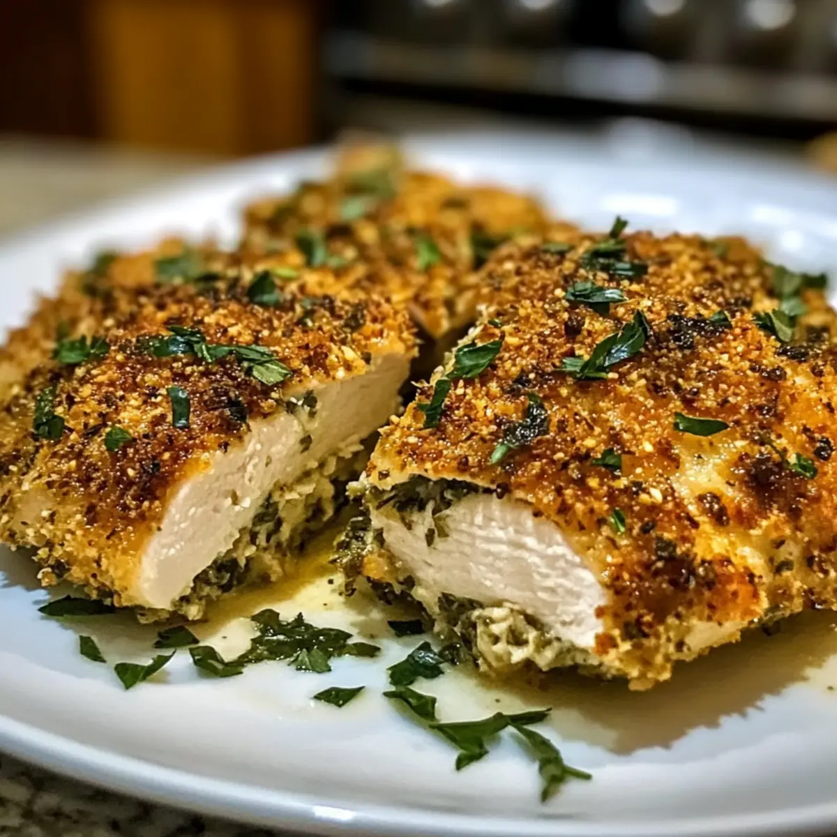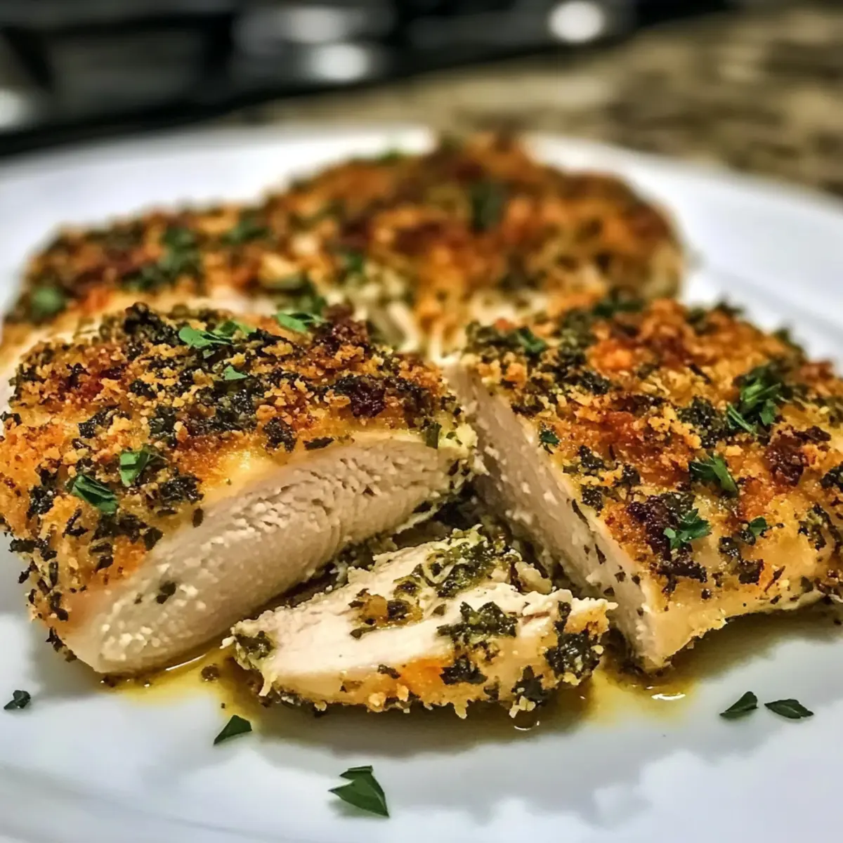 Ich erinnere mich an einen dieser hektischen Abende, an denen der Hunger sich mit der Zeit drängt. Inmitten des Trubels fiel mein Blick auf das Hähnchen im Kühlschrank. So wurde das Rezept für Kräuterkruste Gebackenes Boursin-Hühnchen geboren – eine köstliche, unkomplizierte Lösung für den Dinner-Stress. Während der zarte Hähnchenbrust in eine krosse, mit frischen Kräutern gefüllte Kruste gehüllt wird, lässt sich der Alltag ganz schnell vergessen. Diese einfache Abendessen-Idee lässt nicht nur den Gaumen jubeln, sondern ist auch perfekt für gesellige Abende mit Familie und Freunden. Und das Beste daran? Du benötigst nur wenige Zutaten, um ein essbares Meisterwerk zu kreieren. Bist du bereit, deinen Abend mit diesem köstlichen Gericht zu bereichern? Warum wirst du dieses Rezept lieben? Einfachheit pur: Die Zubereitung von Kräuterkruste Gebackenes Boursin-Hühnchen erfordert nur grundlegende Kochfertigkeiten und wenige Zutaten. Reicher, herzhaftes Aroma: Die Kombination aus frischen Kräutern und cremigem Boursin-Käse sorgt für einen unvergesslichen Geschmack. Familienfreundliche Wahl: Dieses Rezept ist perfekt für alle Altersgruppen und bringt die Familie zum gemeinsamen Essen zusammen. Vielseitigkeit: Du kannst die Kräuter oder den Käse nach Belieben variieren, um dein persönliches Lieblingsgericht zu kreieren. Zeitersparnis: In nur 30 Minuten hast du ein köstliches Gericht auf dem Tisch, das selbst an den geschäftigsten Abenden genossen werden kann! Vergiss nicht, es mit geröstetem Gemüse oder einem frischen Salat zu kombinieren, um das Erlebnis zu vervollständigen. Kräuterkruste Gebackenes Boursin-Hühnchen Zutaten • Für eine köstliche Zubereitung, hier die Zutaten auf einen Blick: Für das Hühnchen Boneless, skinless chicken breasts – Hähnchenbrust sollte gleichmäßig dick sein, um eine konstante Garung zu gewährleisten. Boursin cheese – Cremige Füllung, die für Reichtum sorgt; kann durch Frischkäse oder gewürzten Ziegenkäse ersetzt werden. Für die Kruste Panko breadcrumbs – Sorgt für eine knusprige Panade; normale Semmelbrösel können die Textur verändern. Grated Parmesan cheese – Verstärkt den herzhaften Geschmack der Kruste. Chopped fresh parsley – Bringt Frische und Farbe; getrocknete Petersilie kann in kleiner Menge (1 Teelöffel) verwendet werden. Chopped fresh thyme – Fügt aromatischen Geschmack hinzu; getrockneter Thymian ist ein akzeptabler Ersatz (1 Teelöffel). Chopped fresh rosemary – Verleiht einen kräuterigen Geschmack; kann durch 1 Teelöffel getrockneten Rosmarin ersetzt werden. Olive oil – Hilft, die Brösel zu verbinden und trägt zur Knusprigkeit bei. Garlic powder – Hebt das gesamte Aroma hervor. Onion powder – Fügt Tiefe hinzu; je nach Geschmack anpassen. Salt and pepper – Wesentliche Gewürze für die Anpassung des Geschmacks. Melted butter – Sorgt für eine reiche, goldbraune Kruste. Entdecke mit diesem Rezept für Kräuterkruste Gebackenes Boursin-Hühnchen eine einfache und köstliche Woche! Schritt-für-Schritt-Anleitung für Kräuterkruste Gebackenes Boursin-Hühnchen Schritt 1: Ofen vorheizen Heizen Sie den Ofen auf 190°C (375°F) vor. Dies sorgt dafür, dass das Kräuterkruste Gebackenes Boursin-Hühnchen gleichmäßig gart und eine ideale Knusprigkeit erreicht. Nutzen Sie ein Gitterthermometer, um die Temperatur im Auge zu behalten, während Sie die anderen Vorbereitungen treffen. Schritt 2: Hähnchenbrust vorbereiten Prüfen Sie die Hähnchenbrust auf gleichmäßige Dicke. Schneiden Sie sie bei Bedarf auf, um eine gleichmäßige Garung zu gewährleisten. Achten Sie darauf, den Fettanteil zu entfernen, damit die Oberfläche beim Backen schön knusprig wird. Legen Sie die Hähnchenbrüste beiseite und beginnen Sie mit der Käsefüllung. Schritt 3: Boursin-Käse auftragen Verteilen Sie den Boursin-Käse gleichmäßig auf jeder Hähnchenbrust. Verwenden Sie einen Spatel oder einen Löffel, um eine großzügige Schicht zu erzeugen, die für einen cremigen, geschmackvollen Kern sorgt. Achten Sie darauf, dass der Käse gut an den Rändern haftet, damit beim Backen nichts ausläuft. Schritt 4: Bröselmix anrühren Mischen Sie in einer Schüssel die Panko-Brösel, den geriebenen Parmesan, die gehackte Petersilie, den Thymian, den Rosmarin, das Knoblauchpulver, das Zwiebelpulver, Salz und Pfeffer. Rühren Sie die Zutaten gut um, bis sie vermischt sind und die Kräuter gleichmäßig verteilt sind. Diese Mischung wird der knusprigen Kruste den perfekten Geschmack verleihen. Schritt 5: Olivenöl hinzufügen Träufeln Sie das Olivenöl in die Bröselmischung und vermengen Sie alles gründlich. Das Öl hilft, die Brösel zu verbinden und sorgt für eine goldene, knusprige Kruste beim Backen. Achten Sie darauf, dass die gesamte Bröselmischung leicht feucht ist, damit sie gut an den Hähnchenbrüsten haftet. Schritt 6: Hähnchen mit Bröseln panieren Nehmen Sie jede Hähnchenbrust und drücken Sie die Bröselmischung fest darauf, sodass sie gut haftet. Es ist wichtig, dass die gesamte Oberfläche bedeckt ist, damit das Kräuterkruste Gebackenes Boursin-Hühnchen einen gleichmäßigen und knusprigen Belag erhält. Legen Sie die panierten Hähnchenbrüste auf ein mit Backpapier ausgelegtes Backblech. Schritt 7: Mit Butter beträufeln Träufeln Sie die geschmolzene Butter über die panierten Hähnchenbrüste auf dem Backblech. Dies verleiht dem Gericht zusätzlichen Geschmack und sorgt dafür, dass die Kruste schön goldbraun wird. Achten Sie darauf, dass die Butter gleichmäßig verteilt ist, um ein optimales Backergebnis zu erzielen. Schritt 8: Backen Backen Sie das Kräuterkruste Gebackenes Boursin-Hühnchen im vorgeheizten Ofen für 25-30 Minuten. Achten Sie darauf, dass die Hähnchenbrust vollständig durchgegart ist; eine Kerntemperatur von 74°C (165°F) ist ideal. Die Kruste sollte golden und knusprig sein, wodurch das Gericht besonders appetitlich aussieht. Schritt 9: Abkühlen lassen 