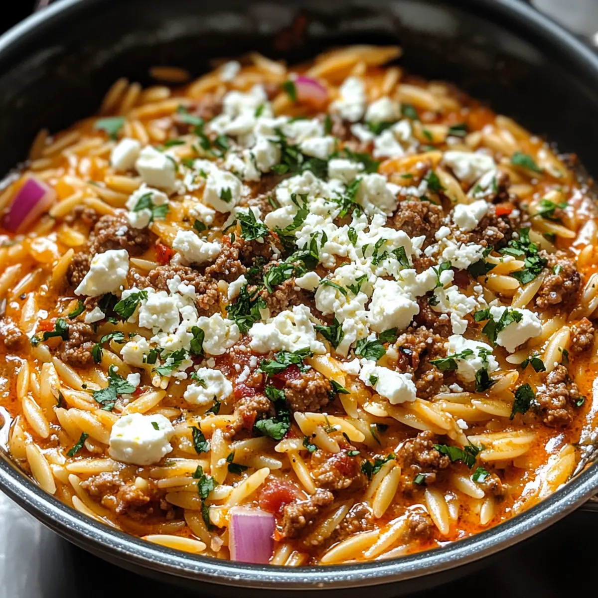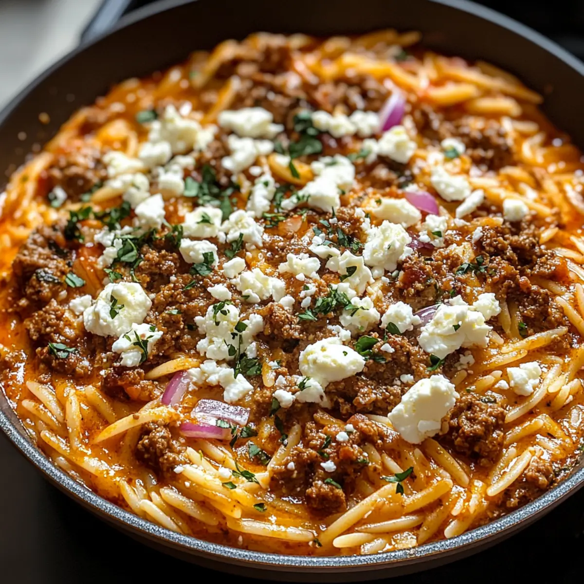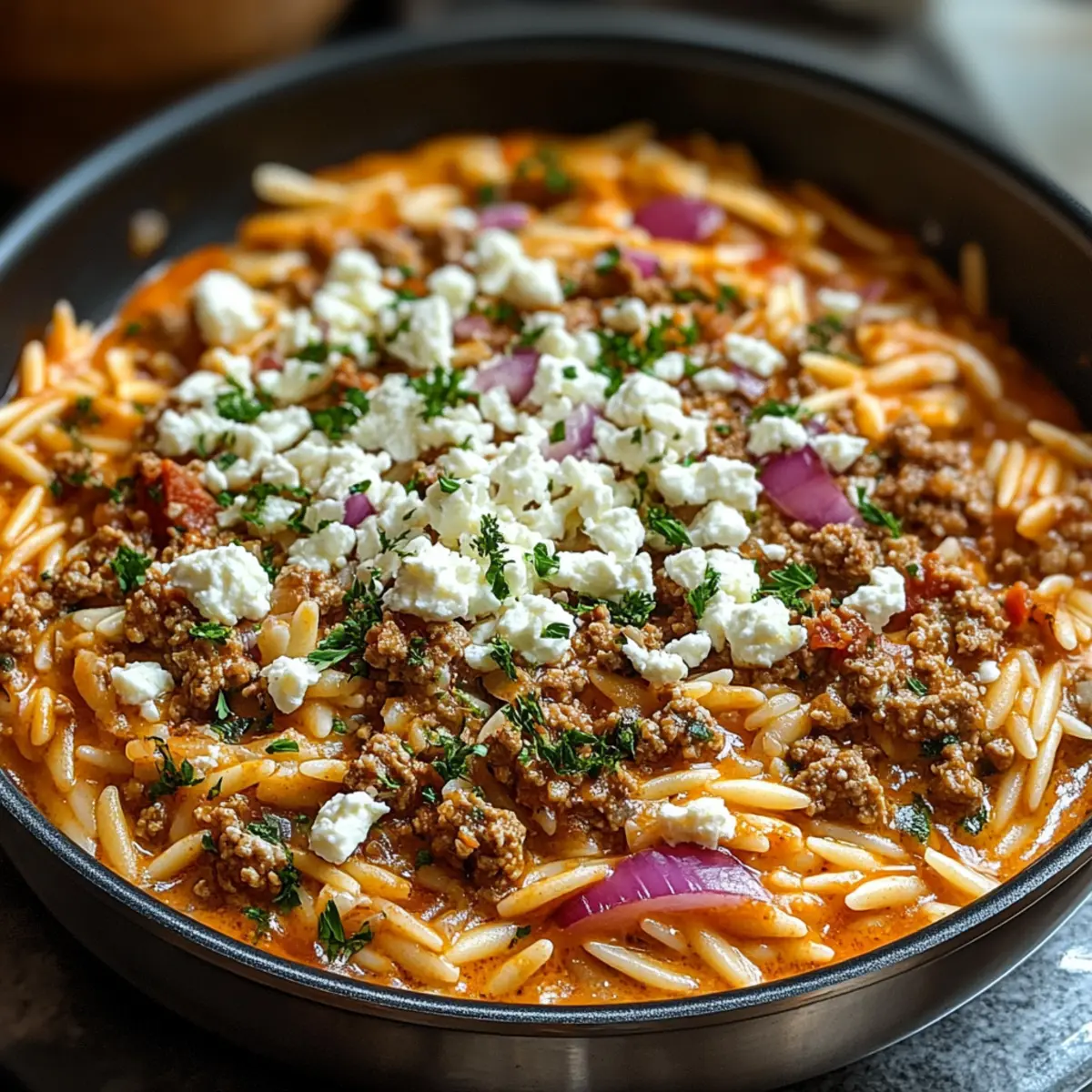 Ein warmes, einladendes Aroma zieht durch die Küche, während ich die einzelnen Zutaten für meine Kritharaki-Hackfleischpfanne mit Feta bereitstelle. Dieses Rezept vereint saftiges Hackfleisch, cremige Kritharaki und den charakteristischen Würze von Feta in einer köstlichen One-Pot-Mahlzeit, die in nur 30 Minuten zubereitet ist. Es ist die perfekte Lösung für stressige Wochentage und zaubert im Handumdrehen mediterranes Flair auf den Tisch. So einfach, dass sogar Kochanfänger begeistert mitmachen können, und so lecker, dass jede Portion wie ein kleines Festmahl anmutet. Hast du schon einmal darüber nachgedacht, wie viel Freude ein schnelles, aber herzhaftes Gericht bringen kann? Lass uns gemeinsam in die Welt dieses unwiderstehlichen Rezeptes eintauchen! Warum ist diese Kritharaki-Hackfleischpfanne so beliebt? Einfachheit: Dieses Rezept ist perfekt für alle, die wenig Zeit haben. In nur 30 Minuten steht ein köstliches Gericht auf dem Tisch! Vielseitigkeit: Du kannst kreativ werden! Füge Gemüse wie Spinat hinzu oder verwende verschiedene Käsesorten, um deine persönliche Note zu setzen. Aromatische Aromen: Der harmonische Mix aus würzigem Hackfleisch und der Frische des Fetas macht jeden Bissen zu einem Erlebnis. Einfache Zubereitung: Alles kommt in einen Topf, was dir das Kochen und die Reinigung erleichtert. Warum also nicht auch eine frische grüne Beilage wie Salat dazu servieren? Crowd-Pleasing: Ob für die Familie oder Freunde, dieses Gericht erfreut sich großer Beliebtheit und wird garantiert alle satt! Kritharaki-Hackfleischpfanne Zutaten • Einfache Zutaten für ein leckeres Gericht! Für die Hauptzutaten Kritharaki (Orzo) – die perfekte Basis, die die Aromen wunderbar aufnimmt; kleine Pasta-Alternativen sind auch möglich. Hackfleisch (z.B. Rind oder Lamm) – sorgt für eine herzhafte und reichhaltige Note; für eine leichtere Variante kannst du auch gemahlenes Geflügel verwenden. Feta-Käse – verleiht eine cremige Textur und salzige Frische; probiere auch Ziegenkäse für eine neue Geschmacksrichtung. Tomatenmark – fügt Tiefe und Reichtum zur Sauce hinzu; zerdrückte Tomaten sind eine frische Alternative. Crème Légère – schafft eine leichte, cremige Sauce; für einen säuerlichen Geschmack kannst du auch Schmand verwenden. Für die Garnitur Frische Petersilie – bringt Farbe und zusätzliches Aroma; ideal für die Dekoration deines fertigen Gerichts. Zusätzlicher Feta – für alle Feta-Liebhaber, der perfekte letzte Schliff! Mit dieser Kritharaki-Hackfleischpfanne mit Feta verwandelst du einfache Zutaten in ein unvergessliches Gericht! Schritt-für-Schritt-Anleitung für die Kritharaki-Hackfleischpfanne mit Feta Step 1: Hackfleisch anbraten Erhitze eine große Pfanne bei mittlerer Hitze und füge das Hackfleisch hinzu. Brate es etwa 5–7 Minuten lang, während du es mit einem Holzlöffel zerbrichst, bis es gleichmäßig gebräunt und durchgegart ist. Du erkennst, dass es bereit ist, wenn es eine goldbraune Farbe angenommen hat und keine rosafarbenen Stellen mehr sichtbar sind. Step 2: Tomatenmark und Crème Légère hinzufügen Rühre nun das Tomatenmark und die Crème Légère in die Pfanne ein. Koche die Mischung 2–3 Minuten lang weiter, bis die Komponenten gut vermischt sind und eine einheitliche, cremige Sauce entsteht. Der Duft der Aromen wird anfangen, deine Küche zu durchziehen und die Vorfreude auf die Kritharaki-Hackfleischpfanne mit Feta steigern. Step 3: Kritharaki und Flüssigkeit einrühren Gib die Kritharaki in die Pfanne und füge gerade genug Wasser oder Brühe hinzu, um die Pasta vollständig zu bedecken. Rühre alles gut um, damit die Kritharaki gleichmäßig mit der Sauce in Kontakt kommt. Achte darauf, dass alles gut vermischt ist, bevor du den nächsten Schritt angehst. Step 4: Kochen und köcheln lassen Bring die Mischung zum Kochen und reduziere dann die Hitze, um das Ganze zugedeckt etwa 10–12 Minuten lang simmern zu lassen. Rühre gelegentlich um, um sicherzustellen, dass die Kritharaki nicht anbrennt. Die Pasta sollte weich sein und die meiste Flüssigkeit aufgenommen haben, wenn du sie nach dieser Zeit überprüfst. Step 5: Feta hinzufügen Nimm die Pfanne vom Herd und streue den zerbröckelten Feta gleichmäßig über die fertige Kritharaki-Hackfleischpfanne. Lasse den Käse für ein paar Minuten stehen, damit er leicht schmelzen kann. Dies verleiht dem Gericht eine köstliche, cremige Note, die perfekt mit den anderen Aromen harmoniert. Step 6: Servieren und genießen Richte die Kritharaki-Hackfleischpfanne mit Feta auf Tellern an und garniere sie nach Belieben mit frischer Petersilie. Dieses Gericht kann heiß serviert werden und schmeckt hervorragend allein oder als Beilage zu einem einfachen grünen Salat oder knusprigem Brot. Genieße deine köstliche, schnelle Zubereitung! Kritharaki-Hackfleischpfanne Variationen Erlaube deiner Kreativität freien Lauf und passe dieses köstliche Rezept ganz nach deinem Geschmack an! Gemüse hinzufügen: Füge frisches Gemüse wie Spinat oder Paprika hinzu, um mehr Farbe und Nährstoffe reinzubringen. Diese gesunde Ergänzung macht das Gericht noch schmackhafter und bunter. Käse variieren: Ersetze den Feta durch Ziegenkäse, um eine neue Geschmacksdimension zu entdecken. Der weiche Ziegenkäse bringt eine dezente Würze, die perfekt zum Gericht passt. Kräuter austauschen: Experimentiere mit getrockneten Kräutern wie Oregano oder frischen Basilikumblättern. Jedes Kraut verleiht seiner eigenen Note und ergänzt die Aromen auf wunderbare Weise. Proteinwechsel: Verwende statt Rind- oder Lammhackfleisch gemahlenes Geflügel, um das Gericht leichter zu gestalten. Gleiche Saftigkeit und Geschmack, aber weniger Fett! Kochmethoden: Gönne dir eine schnelle Variante, indem du vorgekochtes Fleisch verwendest. So sparst du Zeit und hast trotzdem ein schnelles, leckeres Gericht. Würze erhöhen: Wenn du es schärfer magst, füge eine Prise Cayennepfeffer oder einige Chiliflocken h