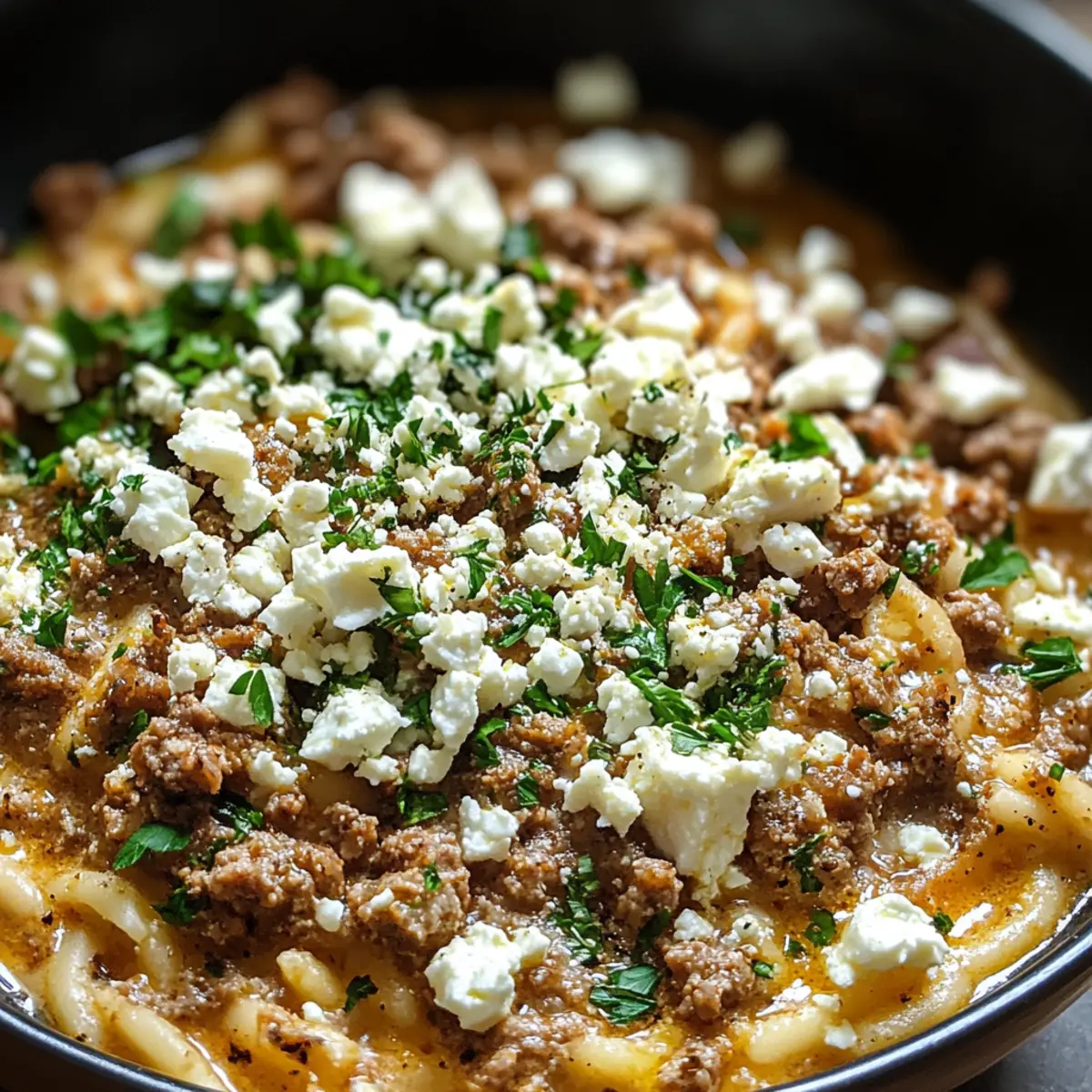 Es gibt nichts Besseres, als an einem gemütlichen Abend in der Küche zu stehen und mit einem einzigen Gericht eine kleine kulinarische Reise zu unternehmen. Meine Kritharaki-Hackfleischpfanne mit Feta ist genau das – ein Traum aus den sonnenverwöhnten Regionen des Mittelmeers, der in nur 30 Minuten auf den Tisch kommt. Diese cremige One-Pot-Mahlzeit vereint saftiges Hackfleisch mit zarten Kritharaki und einem Hauch von würzigem Feta, und das Beste daran? Minimaler Aufwand und kaum Geschirr, sodass du mehr Zeit hast, das Essen mit deinen Lieben zu genießen. Ob für ein schnelles Wochendinner oder zum Verwöhnen am Wochenende – dieses Gericht wird dich und deine Gäste begeistern! Welches Gemüse würdest du in deiner Version hinzufügen? Warum wirst du dieses Rezept lieben? Einfachheit: Die Zubereitung ist kinderleicht und benötigt keine aufwendigen Kochtechniken – perfekt für jeden Koch! Reiche Aromen: Die Kombination aus herzhaftem Hackfleisch und cremigem Feta sorgt für einen intensiven Geschmack, der Lust auf mehr macht. Ein Gericht, viele Möglichkeiten: Personalisiere die Kritharaki-Hackfleischpfanne mit deinen Lieblingsgemüsen oder wähle eine andere Käsesorte für ganz neue Geschmackserlebnisse. Ruckzuck fertig: In nur 30 Minuten servierbereit, ist dieses Gericht die ideale Lösung für hektische Wochentage. Wenig Abwasch: Da alles in einem Topf zubereitet wird, genießt du weniger Aufräumstress und mehr Zeit zum Feiern. Beliebt bei allen: Dieses mediterrane Rezept wird sicher bei Familie und Freunden gut ankommen, egal ob beim Abendessen oder bei einem gemütlichen Brunch. Kritharaki-Hackfleischpfanne Zutaten • Dies ist die perfekte Grundlage für deine köstliche Kritharaki-Hackfleischpfanne mit Feta! Für die Kritharaki-Hackfleischpfanne Kritharaki (Orzo) – saugt die Aromen wunderbar auf und sorgt für eine befriedigende Textur; du kannst auch kleine Pasta verwenden. Hackfleisch (Rind oder Schwein) – gibt dem Gericht die nötige Proteinäquivalente und Herzhaftigkeit; kann bei Bedarf durch Putenfleisch ersetzt werden für eine fettärmere Variante. Feta-Käse – bringt eine salzige, cremige Note; für einen anderen Geschmack kannst du Ziegenkäse oder Ricotta verwenden. Tomatenmark – verleiht eine reichhaltige Basis für die Sauce und intensiviert den herzhaften Geschmack; reduziere die Menge, wenn du eine fertige Sauce nutzt. Crème Légère (leichte Sahne) – sorgt für Cremigkeit ohne viele Kalorien; für so richtig viel Genuss kannst du auch Vollrahm verwenden. Gewürze (Salz, Pfeffer, Kräuter) – heben den Gesamtgeschmack; passe die Mengen nach deinem persönlichen Geschmack an, frische Kräuter bringen mehr Aromen ins Spiel. Optional für die Verfeinerung Gemüse – füge Blattspinat oder Paprika hinzu, um mehr Farbe und Nährstoffe zu integrieren. Kräuter – frische Kräuter wie Basilikum oder Oregano können kurz vor dem Servieren für zusätzlichen Geschmack hinzugefügt werden. Schritt-für-Schritt-Anleitung für die Kritharaki-Hackfleischpfanne mit Feta und lecker Step 1: Hackfleisch anbraten Erhitze einen großen Topf bei mittlerer Hitze und gebe das Hackfleisch hinein. Brate es etwa 5–7 Minuten lang an, bis es von allen Seiten gut durchgegart und schön braun ist. Rühre gelegentlich um, damit das Fleisch gleichmäßig brät. Achte darauf, dass es keine rosa Stellen mehr gibt, bevor du mit dem nächsten Schritt fortfährst. Step 2: Kritharaki hinzufügen Füge nun die Kritharaki (Orzo) zum Hackfleisch hinzu und rühre alles gut um. Koche die Mischung weitere 2 Minuten, damit die Kritharaki die Aromen des Hackfleischs aufnehmen kann. Halte Ausschau nach einer leichten Bräunung, die den Geschmack vertieft und das Gericht noch schmackhafter macht. Step 3: Soßen einrühren Gib das Tomatenmark und die Crème Légère in den Topf und vermische alles gründlich. Achte darauf, dass die Kritharaki gleichmäßig mit der Sauce überzogen wird. Lass die Mischung für 1–2 Minuten köcheln, während die Aromen sich verbinden und das Gericht eine herrlich cremige Konsistenz annimmt. Step 4: Simmern lassen Füge nun nach Bedarf Wasser oder Brühe hinzu, bis alle Zutaten gut bedeckt sind. Decke den Topf ab und lasse das Ganze bei niedriger Hitze 15–20 Minuten köcheln. Rühre gelegentlich um, um zu verhindern, dass die Kritharaki am Boden festklebt. Die Pasta ist fertig, wenn sie weich und al dente ist. Step 5: Feta einrühren Nimm den Topf vom Herd und brich den Feta über die Kritharaki-Hackfleischpfanne. Füge ihn direkt in die Mischung hinzu und falte alles sanft zusammen, sodass der Feta leicht schmilzt und sich verteilt. Die Kritharaki-Hackfleischpfanne mit Feta und lecker ist nun bereit zum Servieren und wird durch den zerbröckelten Käse perfekt abgerundet. Kritharaki-Hackfleischpfanne mit Feta Variationen Lass deiner Kreativität freien Lauf und passe dieses Rezept ganz nach deinem Geschmack an! Vegetarisch: Tausche das Hackfleisch gegen pflanzliches Protein aus, um eine herzhafte vegetarische Variante zu kreieren. Das verleiht der Pfanne einen frischen und lebendigen Geschmack! Gemüse-reich: Füge Blattspinat, Paprika oder Zucchini hinzu, um das Gericht mit mehr Nährstoffen und Farben zu bereichern. Würzig: Gebe eine Prise Cayennepfeffer oder Chili-Flocken hinzu, wenn du es lieber schärfer magst. Die Hitze wird perfekt durch die Cremigkeit des Fetas ausgeglichen! Käsevielfalt: Probiere statt Feta Ziegenkäse oder Ricotta für einen anderen Geschmack. Der Ziegenkäse bietet eine frische Note und ist eine tolle Abwechslung! Zitronig: Ein Spritzer frischer Zitronensaft kurz vor dem Servieren bringt eine angenehme Säure und erhellt die Aromen des Gerichts. Wer kann dazu schon Nein sagen? Kräuterfeuerwerk: Verwende frische Kräuter wie Basilikum oder Oregano, um die mediterranen Aromen noch intensiver zur Geltung zu bringen. Pasta-Kombination: Mische die Kritharaki mit einer anderen Pasta-Sorte wie Penne oder Fusilli, um eine int