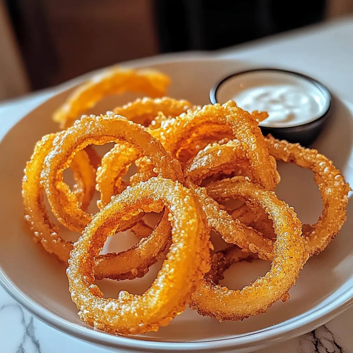 Serviere die Zwiebelringe mit deinem Lieblingsdip wie Ranch-Sauce oder Ketchup.