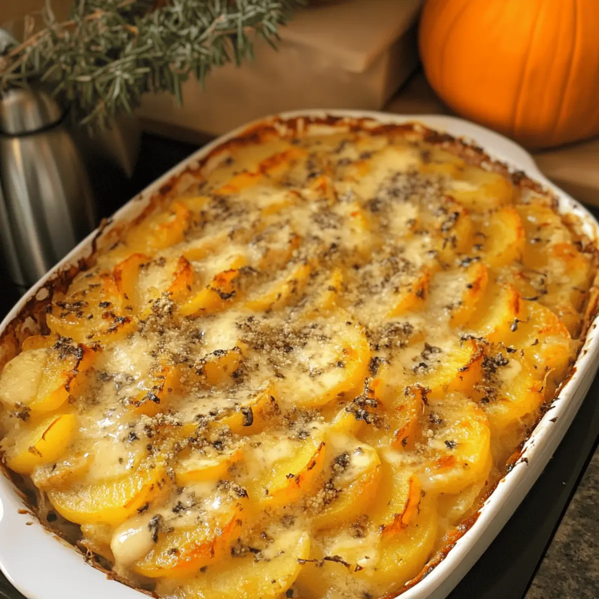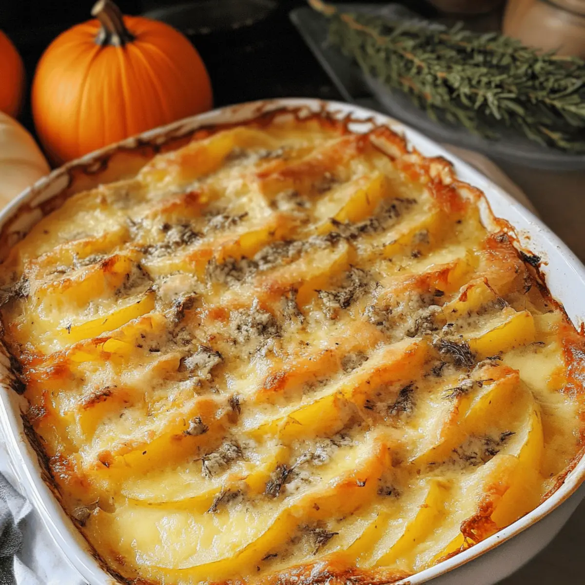 Es gibt diesen einen perfekten Moment im Herbst, wenn die Luft frisch und die Blätter golden sind. In dieser Zeit sehne ich mich oft nach einem Gericht, das nicht nur den Gaumen verwöhnt, sondern auch das Herz erwärmt. Mein Kürbis-Kartoffel-Gratin mit Gorgonzola vereint die süßen, erdigen Aromen von Kürbis mit der herzhaften Konsistenz dünn geschnittener Kartoffeln und einem verführerischen Käse-Twist. Es ist schnell zubereitet und bietet eine unwiderstehliche goldene Kruste, die sowohl als Hauptgericht als auch als Beilage begeistert. Hier entdeckt ihr, wie einfach es ist, den köstlichen Geschmack des Herbstes auf den Tisch zu bringen. Seid ihr bereit, euch in dieses himmlische Gratin zu verlieben? Warum lieben alle dieses Gratin? Einzigartiger Geschmack: Die Kombination aus süßem Kürbis und herzhaften Kartoffeln sorgt für ein unverwechselbares Aroma, das die Sinne verführt. Einfach und schnell: Dank der klaren Anleitung ist dieses Rezept auch für Kochanfänger einfach umzusetzen. Vielseitigkeit: Ob als Hauptgericht oder Beilage – das Kürbis-Kartoffel-Gratin mit Gorgonzola passt zu vielen Anlässen und Gerichten. Beeindruckende Präsentation: Mit einer goldenen Kruste und geschmolzenem Käse ist es ein echter Blickfang auf jedem Esstisch. Saisonale Frische: Perfekt für den Herbst, bringt dieses Gericht die Aromen der Saison in euer Zuhause. Vorbereiten leicht gemacht: Ihr könnt es einen Tag im Voraus zubereiten und später einfach im Ofen aufwärmen, was es ideal für Dinnerpartys macht. Kürbis-Kartoffel-Gratin mit Gorgonzola Zutaten Für die Auflaufmasse Kartoffeln – sorgen für die herzliche Basis des Gratins; wählt am besten festkochende Sorten für die beste Konsistenz. Kürbis – bringt eine süße und leicht nussige Note ins Gericht; Muskatkürbis ist besonders schmackhaft. Gorgonzola – verleiht eine cremige und würzige Tiefe; alternatively, könnt ihr Feta oder einen anderen Weichkäse verwenden. Eier – binden die Zutaten und sorgen für zusätzlichen Reichtum; für eine vegetarische Option könnt ihr ein Flachs-Ei oder Aquafaba verwenden. Sahne – sorgt für die cremige Textur; eine pflanzliche Sahne kann als vegane Option verwendet werden. Für die Würze Butter – verwendet zum Fetten der Backform und für das Sautieren des Kürbisses. Salz, Pfeffer – grundlegende Gewürze, die den Geschmack hervorrufen; an persönliche Vorlieben anpassen. Oregano & Thymian – ergänzen die Erdigkeit der Gemüse und fügen aromatische Noten hinzu; frisch oder getrocknet verwendbar. Schritt-für-Schritt-Anleitung für Kürbis-Kartoffel-Gratin mit Gorgonzola Step 1: Ofen vorheizen Heizt euren Ofen auf 180 °C (350 °F) für die Umluftfunktion vor. Dies sorgt dafür, dass das Kürbis-Kartoffel-Gratin mit Gorgonzola gleichmäßig gebacken wird und eine schöne goldene Kruste entsteht. Während der Ofen vorheizt, könnt ihr bereits mit den Vorbereitungen der Zutaten beginnen. Step 2: Kartoffeln vorbereiten Schält die Kartoffeln und schneidet sie in dünne Scheiben. Bringt einen Topf mit gesalzenem Wasser zum Kochen und blanchiert die Kartoffelscheiben für etwa 5–8 Minuten, bis sie leicht weich, aber nicht durchgegart sind. Anschließend abgießen und die Scheiben auf einem Küchentuch abkühlen lassen. Step 3: Kürbis vorbereiten Schält den Kürbis und schneidet ihn in ähnlich große Stücke wie die Kartoffeln. Erhitzt etwas Butter in einer Pfanne und sautiert die Kürbisscheiben für 3-5 Minuten, bis sie gerade zart sind und ihr süßes Aroma entfalten. Diese Schritt sorgt dafür, dass der Kürbis im Gratin perfekt zur Geltung kommt. Step 4: Backform vorbereiten Fettet eine runde Backform mit einem Durchmesser von etwa 24 cm gründlich mit Butter ein. Beginnt dann, die vorbereiteten Kartoffeln und Kürbisse abwechselnd in der Form zu schichten. sorgt dafür, dass jede Schicht gleichmäßig verteilt ist, um ein harmonisches Gesamtbild zu erreichen. Step 5: Schichten würzen Würzt jede Schicht des Gratins mit Salz, Pfeffer, Oregano und Thymian, um den Geschmack des Kürbis-Kartoffel-Gratins mit Gorgonzola zu intensivieren. Diese Würzschicht sorgt dafür, dass die Aromen gut miteinander verschmelzen und die gesamte Speise bereichern. Step 6: Eimischung zubereiten Schlagt in einer Schüssel die Eier mit der Sahne und fügt nach Belieben zusätzliche Gewürze hinzu. Gießt diese Mischung gleichmäßig über die geschichteten Kartoffeln und Kürbisse in der Backform. So wird das Gratin schön cremig und erhält zusätzlichen Geschmack. Step 7: Gorgonzola hinzufügen Bröckelt den Gorgonzola gleichmäßig über die oberste Schicht des Gratins. Der Käse wird beim Backen schmelzen und eine herrlich cremige Textur sowie einen unverwechselbaren Geschmack beisteuern, der die anderen Zutaten perfekt ergänzt. Step 8: Gratins backen Stellt die Backform in den vorgeheizten Ofen und lasst das Kürbis-Kartoffel-Gratin mit Gorgonzola etwa 30 Minuten backen, bis die Oberfläche goldbraun und das Innere fest ist. Achtet darauf, das Gratin während des Backens zu beobachten, damit es nicht zu dunkel wird. Kürbis-Kartoffel-Gratin mit Gorgonzola Variationen Lasst eurer Kreativität freien Lauf und passt dieses köstliche Gratin nach euren Vorlieben an! Vegan: Nutzt pflanzliche Sahne und lasst die Eier weg; eine Mischung aus Cashew-Creme kann die gleiche Cremigkeit bieten. Käse-Alternative: Ersetzt Gorgonzola durch Feta oder Ziegenkäse für einen anderen Geschmacksprofil – jeder Käse bringt seine eigene Note in das Gericht! Spinat hinzufügen: Schichtet frischen Spinat zwischen die Kartoffel- und Kürbisscheiben; das fügt Farbe und zusätzliche Nährstoffe hinzu. Karamellisierte Zwiebeln: Für mehr Süße und Tiefe, fügt karamelisierte Zwiebeln zwischen die Schichten hinzu; das abrundet die Aromen perfekt. Scharfe Note: Streut etwas Cayennepfeffer in die Eimischung oder richtet das Gratin mit roten Pfefferflocken an für eine prickelnde Würze. Frische Kräuter: Tausc