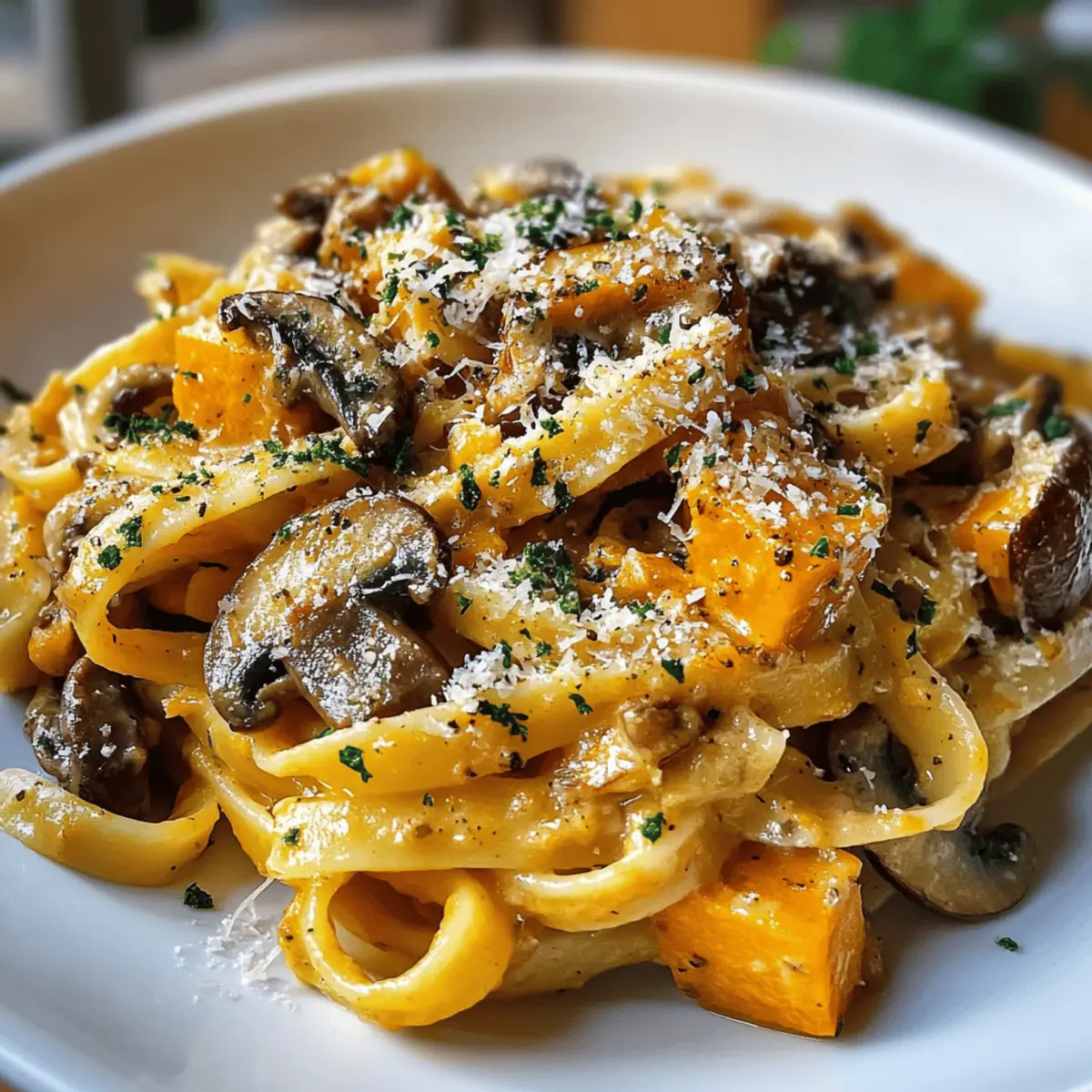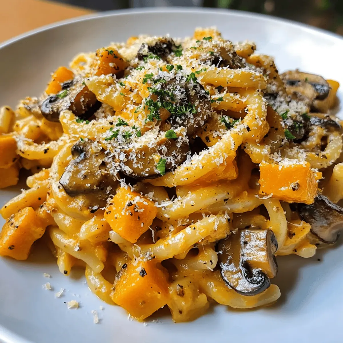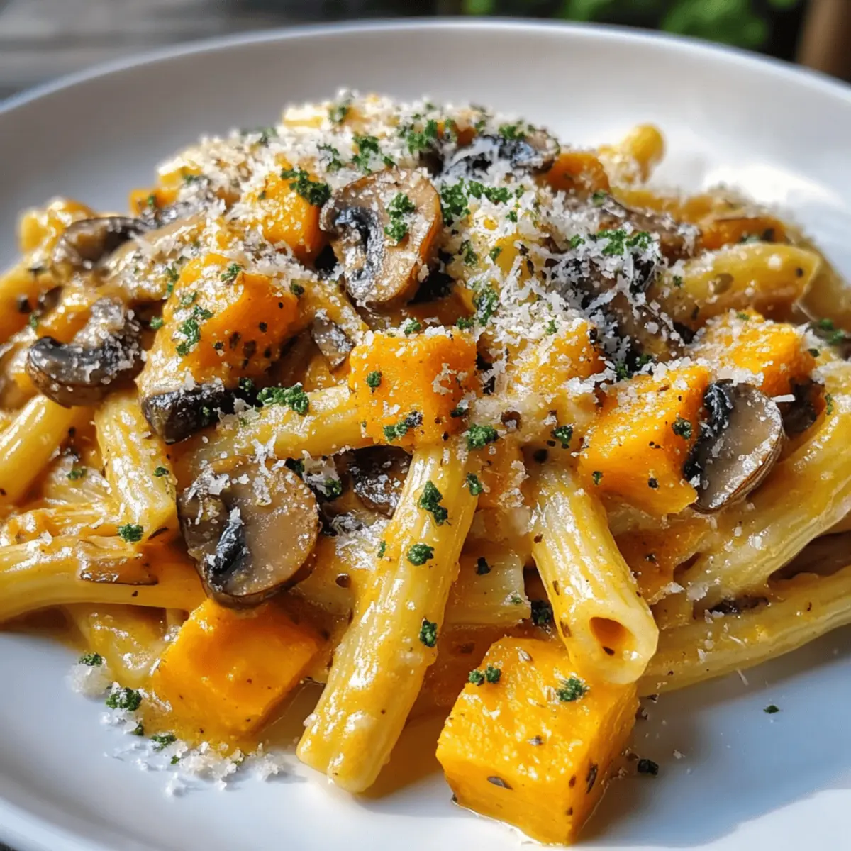 Während ich letzte Woche durch den Bauernmarkt schlenderte, zog der süße Duft von frisch geröstetem Kürbis meine Aufmerksamkeit an. Für die beste Herbstküche kann ich nichts Leichteres und Köstlicheres als meine Kürbis-Pilz-Pasta empfehlen! Diese einfache und cremige Pasta vereint die süßen Aromen des Kürbisses mit der erdigen Tiefe der Pilze und bietet ein wärmendes, herzhaftes Gericht, das nicht nur sättigt, sondern auch das Herz erwärmt. Das Beste daran? Sie ist schnell zubereitet und perfekt für eine gesellige Abendmahlzeit unter der Woche, auch wenn die Zeit drängt. Nach einem langen Tag gibt es nichts Besseres, als sich mit einem Teller dieser köstlichen Pasta zu verwöhnen. Neugierig, wie diese herbstliche Köstlichkeit deine Familie begeistern wird? Lass uns direkt in die Zubereitung starten! Warum wirst du diese Pasta lieben? Einfachheit: Die Zubereitung dieser Kürbis-Pilz-Pasta ist unkompliziert und erfordert nur grundlegende Kochfähigkeiten, perfekt für alle, die wenig Zeit haben. Aromatische Vielfalt: Die harmonische Kombination aus süßem Kürbis und erdigen Pilzen sorgt für ein Geschmacksabenteuer, das jeden Bissen zu etwas Besonderem macht. Herbstlich inspiriert: Mit seinen saisonalen Zutaten bringt dieses Gericht die warme Atmosphäre des Herbstes direkt in deine Küche. Schnelles Abendessen: Ideal für hektische Wochentage, kannst du diese Pasta in weniger als 30 Minuten zubereiten. Vielseitigkeit: Du kannst sie nach Belieben anpassen, sei es durch die Zugabe von Spinat oder einem Spritzer Weißwein für mehr Tiefe. Probiere auch, diese Pasta mit einem frischen Salat zu servieren, um ein ausgewogenes Menü zu kreieren! Kürbis-Pilz-Pasta Zutaten Für die Pasta • Pasta – Verwende deine Lieblingssorte wie Fettuccine oder Penne für die beste Textur. • Salz – Ein gutes Meersalz verstärkt den Geschmack der ganzen Zutaten. Für die Sauce • Kürbis – Sorgt für eine natürliche Süße und Cremigkeit; ersetze ihn durch Butternut-Kürbis, falls nötig. • Pilze – Champignon, Shiitake oder Austernpilze bringen eine erdige Tiefe ins Gericht. • Zwiebel – Für ein aromatisches Fundament; kann durch Schalotten ersetzt werden. • Knoblauch – Frisch oder gehackt verleiht der Sauce ein leckeres Aroma. • Olivenöl – Ideal zum Anbraten der Zutaten; Butter sorgt für eine reichhaltigere Note. • Sahne – Macht die Sauce schön cremig; für eine leichtere Variante nutze pflanzliche Sahne. • Pfeffer – Frisch gemahlen ist perfekt zum Würzen; passe die Menge nach deinem Geschmack an. • Muskatnuss (optional) – Ein Hauch davon bringt Wärme und einen exotischen Twist in die Sauce. • Parmesan – Für die servierte Schicht mehr Geschmack; weglassen oder veganen Käse verwenden für eine vegane Option. Schritt-für-Schritt-Anleitung für Kürbis-Pilz-Pasta Step 1: Pasta kochen Bring einen großen Topf mit gesalzenem Wasser zum Kochen. Gib die Pasta hinein und koche sie gemäß den Anweisungen auf der Verpackung, bis sie al dente sind, in der Regel etwa 8-10 Minuten. Rühre gelegentlich um, damit die Pasta nicht zusammenklebt. Sobald die Pasta fertig ist, lass sie abtropfen, aber spüle sie nicht. Step 2: Sauce vorbereiten Erhitze in einer großen Pfanne bei mittlerer Hitze einen Esslöffel Olivenöl. Füge die fein gehackte Zwiebel hinzu und brate sie, bis sie glasig ist, etwa 3-4 Minuten. Gib dann den gehackten Knoblauch dazu und brate ihn kurz, bis er duftet, etwa 1 Minute. So entsteht die aromatische Basis für deine Kürbis-Pilz-Pasta. Step 3: Gemüse garen Füge die gewürfelte Kürbis und die in Scheiben geschnittenen Pilze in die Pfanne. Sauté das Gemüse für etwa 5-7 Minuten, bis es weich und leicht gebräunt ist. Achte darauf, es regelmäßig umzurühren, damit nichts anbrennt. Die Kombination aus Kürbis und Pilzen sorgt für eine köstliche Tiefe in der Sauce. Step 4: Cremigkeit erzeugen Gieße die Sahne in die Pfanne, bringe alles zum Köcheln und reduziere die Hitze. Lass die Sauce etwa 5 Minuten leicht einkochen, bis sie schön dick wird. Würze mit Salz, Pfeffer und einer Prise Muskatnuss, um den herbstlichen Geschmack der Kürbis-Pilz-Pasta zu intensivieren. Step 5: Kombinieren Gib die abgetropfte Pasta direkt in die Pfanne zur Sauce. Rühre alles gut um, damit die Pasta gleichmäßig mit der cremigen Sauce überzogen wird. Lass es für eine Minute zusammen kochen, damit die Aromen sich verbinden. Dies stellt sicher, dass jede Nudel von der köstlichen Kürbis-Pilz-Sauce umhüllt ist. Step 6: Servieren Entferne die Pfanne vom Herd und serviere die Kürbis-Pilz-Pasta in tiefen Tellern. Bestreue jedes Gericht mit frisch geriebenem Parmesan und etwas gehackter Petersilie für einen frischen Geschmack. Genieße das Gericht sofort, um die Cremigkeit und die aromatischen Aromen voll auszukosten! Kürbis-Pilz-Pasta Variationen Lass deiner Kreativität freien Lauf und passe dieses Rezept nach deinem Geschmack an! Piccante Note: Füge Chili-Flocken hinzu, um deiner Pasta eine angenehme Schärfe zu verleihen. Ein kleiner Schuss bringt fluoreszierende Aromen in dein Gericht. Grünes Gemüse: Integriere frischen Spinat oder Grünkohl für einen Farbtupfer und zusätzliche Nährstoffe. Es sorgt auch für eine schöne Präsentation! Glutenfrei: Ersetze die traditionelle Pasta durch glutenfreie Alternativen, um ein köstliches Gericht für alle zu kreieren. So steht der Genuss nichts im Wege. Protein-Booster: Ergänze die Pasta mit gebratenem Hähnchen oder Würstchen für eine herzhaftere Variante. Das gibt dir den ultimativen Energie-Kick! Nüsse für Crunch: Streue geröstete Pinienkerne oder Walnüsse über die Pasta für einen zusätzlichen Crunch. Der Kontrast macht das Gericht interessant. Frische Kräuter: Mische frische Kräuter wie Thymian oder Rosmarin unter die Sauce. Diese Aromen harmonieren wunderbar mit Kürbis und Pilzen. Zitroniger Twist: Ein Spritzer frischer Zitrone am Ende sorgt für einen herrlichen Frischekick.