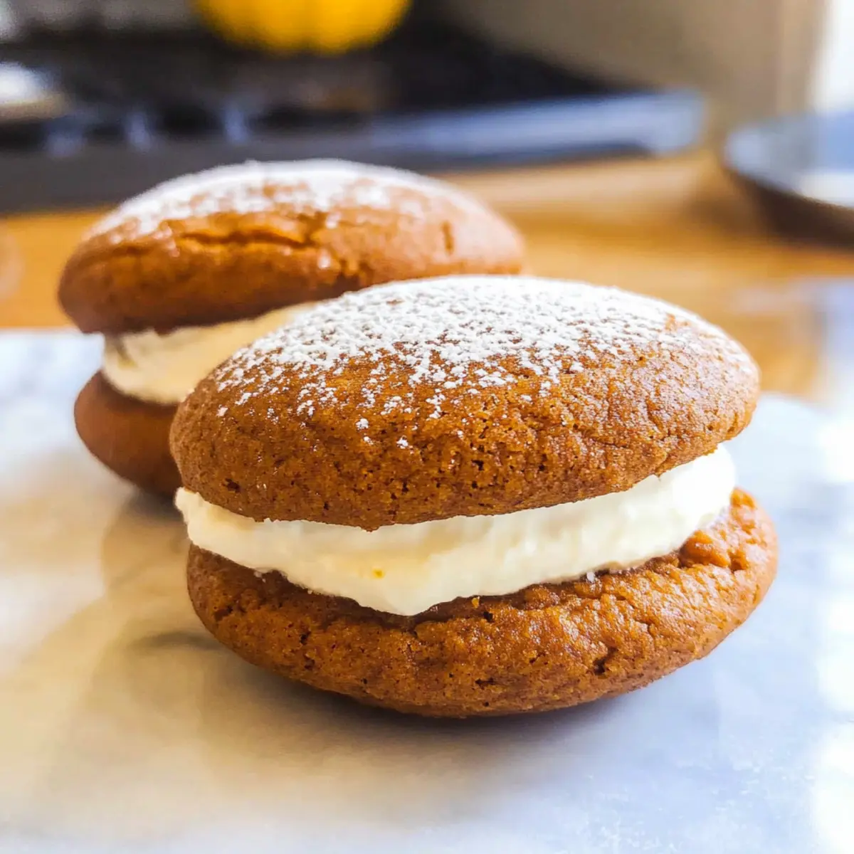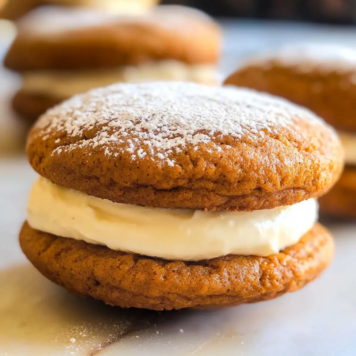Kürbis Whoopie Pies sind zarte Kekse mit würzigem Zimt und Ingwer, gefüllt mit cremigem Frischkäse für den perfekten Herbstgenuss.