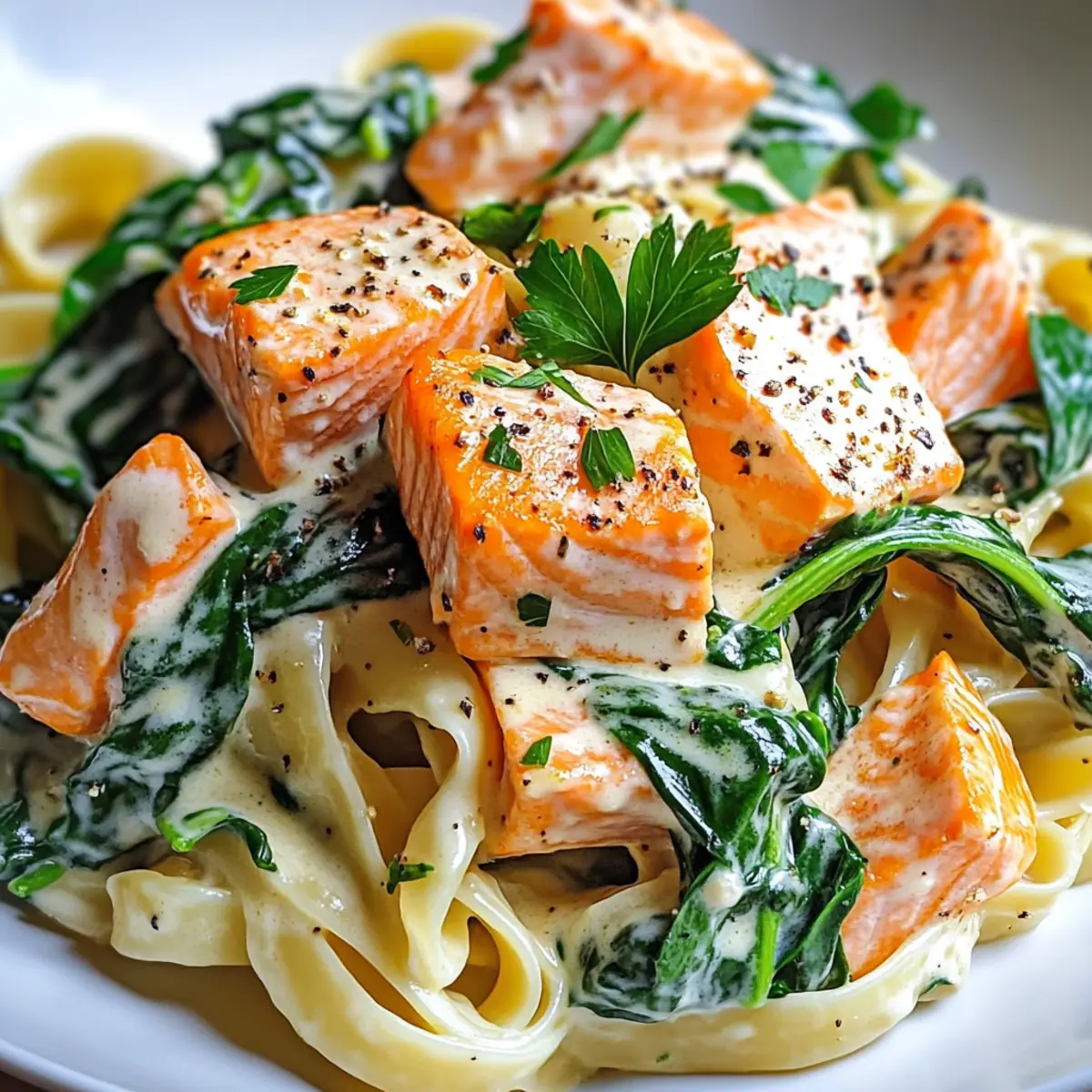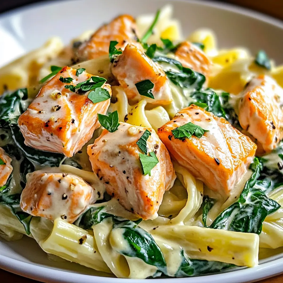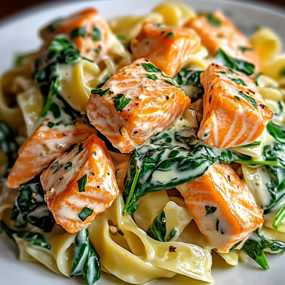 Der Duft von frisch gekochtigem Pasta kann mich immer wieder in eine andere Welt entführen. Besonders wenn es um mein Lachs Spinat Pasta Gericht geht – ein köstliches, cremiges Vergnügen, das nicht nur den Gaumen verwöhnt, sondern auch schnell zubereitet ist. Diese Woche hatte ich einfach keine Zeit für aufwendige Rezepte, aber das ist der perfekte Weg, um einen Hauch von mediterraner Cuisine in mein Zuhause zu bringen. Die Kombination aus zartem, würzigem Lachs und lebendigem Spinat in einer reichhaltigen Knoblauch-Parmesan-Sauce sorgt dafür, dass auch hektische Abende zu einem kleinen Festmahl werden. Und das Beste daran? Es ist nährstoffreich und lässt sich wunderbar variieren! Neugierig, wie einfach es ist, dieses Gericht nachzukochen? Warum wirst du dieses Rezept lieben? Einfachheit: Die Zubereitung ist kinderleicht und erfordert keine besonderen Kochkünste. Schnell: In nur 30 Minuten hast du ein nahrhaftes und schmackhaftes Gericht auf dem Tisch. Vielfältig: Du kannst den Lachs nach Belieben durch Garnelen oder Hühnchen ersetzen oder sogar mehr Gemüse wie Erbsen hinzufügen. Reichhaltiger Geschmack: Die Kombination aus frischem Spinat, cremiger Sauce und würzigem Lachs sorgt für ein Geschmackserlebnis, das Du nicht missen möchtest. Perfektes Abendessen: Ideal, um deine Liebsten zu beeindrucken oder einfach einen gemütlichen Abend zu Hause zu genießen. Entdecke auch die Variationen deiner gewünschten Zutaten für noch mehr Inspiration! Lachs Spinat Pasta Zutaten Entdecke die Zutaten für dein köstliches Lachs Spinat Pasta Gericht, das ganz einfach und schnell zubereitet werden kann! Für die Pasta Pasta (8 Unzen) – Verwende Fettuccine oder Linguine für das beste Ergebnis. Olivenöl (2 Esslöffel) – Zum Anbraten von Lachs und Knoblauch; Butter ist ein guter Ersatz. Für die Sauce Knoblauch (2 Zehen, gehackt) – Für das aromatische Geschmackserlebnis der Sauce; frischer Knoblauch wird empfohlen. Frisches Lachsfilet (1 Pfund, Haut entfernt) – Hauptprotein, das für die Cremigkeit sorgt; kann durch Garnelen oder Hühnchen ersetzt werden. Frischer Spinat (4 Tassen, gehackt) – Verleiht Farbe und Nährstoffe; gefrorener Spinat kann ebenfalls verwendet werden. Schlagsahne (1 Tasse) – Macht die Sauce reichhaltig und cremig; halb-fettige Sahne kann als leichterer Ersatz dienen. Geriebener Parmesan (1/2 Tasse) – Fügt salzigen, nussigen Geschmack hinzu; frisch gerieben ist am besten. Zitronenschale (1 Teelöffel) – Bringt Frische und Zitrusgeschmack in die Sauce; Limettenschale ist ein guter Ersatz. Frischer Zitronensaft (2 Esslöffel) – Sorgt für einen Hauch von Säure; nach Geschmack anpassen. Salz & Pfeffer – Essentielle Gewürze zur Geschmacksausgewogenheit; nach Belieben anpassen. Rote Pfefferflocken (1/4 Teelöffel, optional) – Für eine angenehme Schärfe; weglassen für ein milderes Gericht. Frische Petersilie (zum Garnieren) – Bringt Farbe und Frische ins Gericht; kann durch Basilikum ersetzt werden. Dieses Lachs Spinat Pasta Gericht wird dich und deine Gäste begeistern! Schritt-für-Schritt-Anleitung für das Lachs Spinat Pasta Gericht Step 1: Pasta kochen Bringe einen großen Topf mit gesalzenem Wasser zum Kochen. Füge die Pasta hinzu und koche sie für 8-10 Minuten, bis sie al dente ist. Während die Pasta kocht, hebe dir 1 Tasse Nudelwasser auf. Gieße die Pasta ab und mische sie mit einem Esslöffel Olivenöl, um ein Verkleben zu vermeiden. Stelle sie beiseite. Step 2: Lachs anbraten Würze das Lachsfilet mit Salz, Pfeffer und dem Zitronensaft. Erhitze in einer großen Pfanne 2 Esslöffel Olivenöl bei mittlerer Hitze. Brate den Lachs 4-5 Minuten auf jeder Seite, bis er durchgegart und leicht goldbraun ist. Zerteile den Lachs in kleine Stücke und stelle ihn beiseite. Step 3: Sauce zubereiten Verwende die gleiche Pfanne, in der du den Lachs gebraten hast. Füge den gehackten Knoblauch hinzu und brate ihn etwa 30 Sekunden an, bis er aromatisch ist. Gib den gehackten Spinat dazu und koche ihn für 2-3 Minuten, bis er verwelkt. Reduziere die Hitze und rühre die Sahne ein, gefolgt von dem geriebenen Parmesan, bis dieser schmilzt. Step 4: Zitronen- und Gewürze hinzufügen Nach dem Schmelzen des Parmesans füge die Zitronenschale, den Zitronensaft und optional die roten Pfefferflocken hinzu. Lass die Sauce für 2-3 Minuten leicht köcheln, damit die Aromen gut durchziehen können. Stelle sicher, dass die Sauce eine glatte und cremige Konsistenz hat. Step 5: Pasta und Lachs kombinieren Gib die abgetropfte Pasta in die Pfanne mit der Sauce und vermische alles gut, sodass die Pasta gleichmäßig bedeckt ist. Füge die flakigen Lachsstücke vorsichtig hinzu und rühre sanft um. Wenn die Sauce zu dick ist, gieße nach Bedarf etwas vom reservierten Nudelwasser dazu, bis die gewünschte Konsistenz erreicht ist. Step 6: Anrichten und Servieren Verteile das fertige Lachs Spinat Pasta Gericht auf Teller und garniere es mit frischer Petersilie. Diese zusätzliche Frische und Farbe bringt das Gericht optisch zur Geltung. Serviere es sofort, um den vollen Geschmack der cremigen Sauce und des zarten Lachses zu genießen. Zeit sparen mit dem Lachs Spinat Pasta Gericht Du möchtest dein Lachs Spinat Pasta Gericht im Voraus zubereiten, um Zeit zu sparen? Gute Nachricht: Die Pasta und die Sauce können bis zu 3 Tage im Voraus vorbereitet werden! Koche die Pasta al dente und bewahre sie in einem luftdichten Behälter im Kühlschrank auf. Auch die Sauce kannst du im Voraus zubereiten und bis zu 24 Stunden im Voraus im Kühlschrank lagern; achte darauf, die Hitze niedrig zu halten, wenn du die Sauce wieder erhitzt, um ihre cremige Konsistenz zu bewahren. Am Abend des Servierens musst du einfach die Pasta mit der Sauce kombinieren und den gebratenen Lachs unterheben – so hast du in kürzester Zeit ein köstliches, gesundes Abendessen auf dem Tisch! Tipps für das beste Lachs Spinat Pasta Gericht Pasta Al Dente: Achte darauf, die Pasta al dente zu kochen.