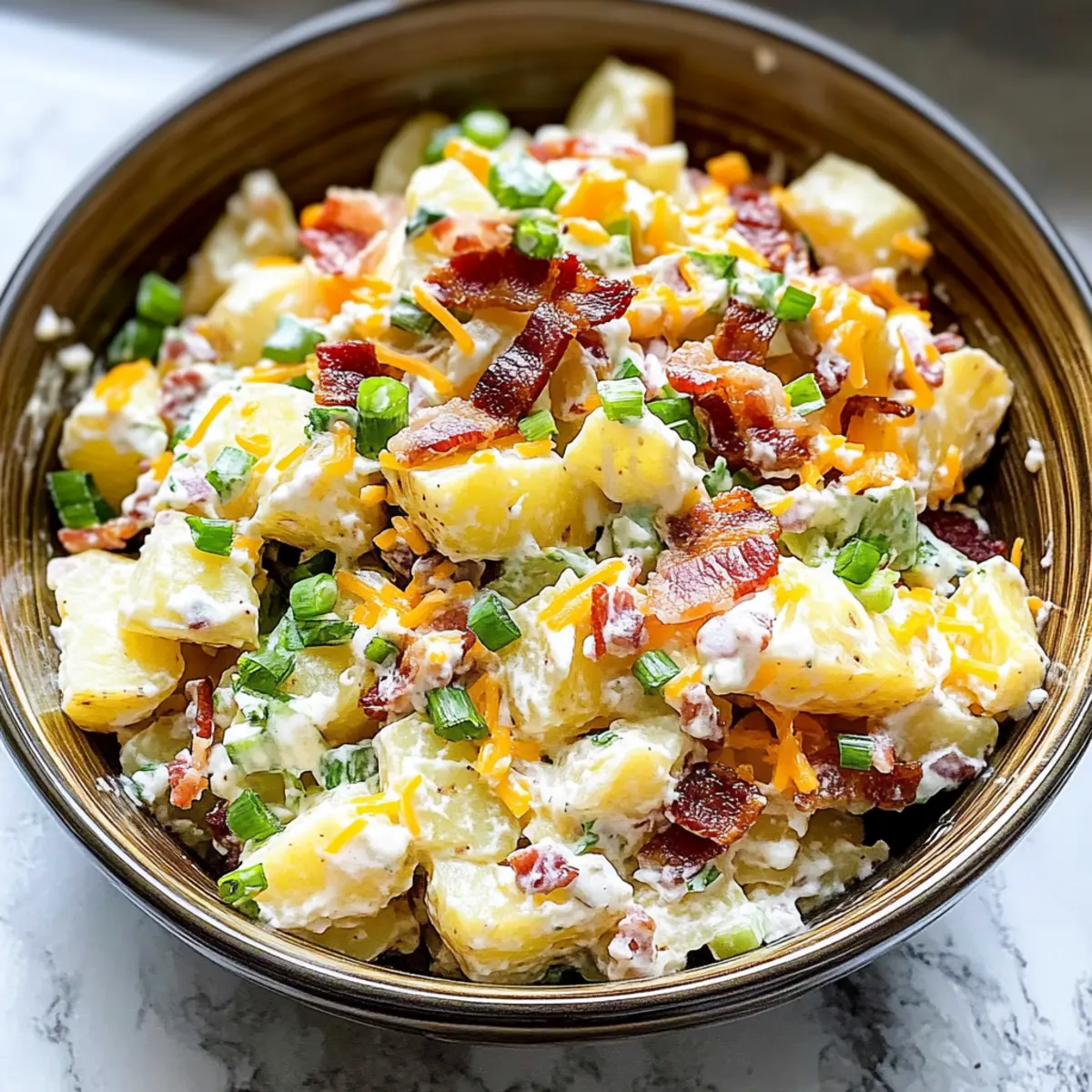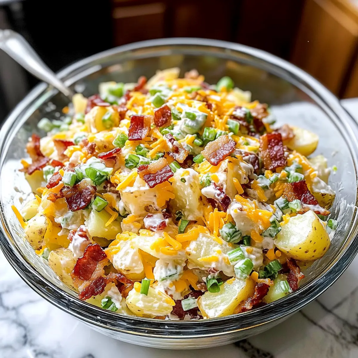 Es war ein warmes Sommerwochenende, als ich mit Freunden am Grill saß und wir uns über die klassischen Beilagen für unsere Grillpartys unterhielten. Irgendwann fiel der Begriff „Ladung gebackene Kartoffelsalat“ – und sofort war ich begeistert! Diese köstliche Variante des Steakhouse-Klassikers kombiniert cremige, flauschige Kartoffeln mit dem rauchigen Aroma von Speck, würzigem Cheddar und einem frischen Hauch von Zwiebel. Diese einfache und schnelle Rezeptur ist perfekt für Potlucks oder Familienfeiern und bringt nicht nur den gewohnten Komfort auf den Tisch, sondern ist auch ein echter Publikumsmagnet. Warum nicht ein wenig Abwechslung in die alltäglichen Beilagen bringen? Ich verspreche dir, dieser Kartoffelsalat wird garantiert zum neuen Star deiner nächsten Zusammenkunft. Bist du bereit, ihn auszuprobieren? Warum wird dieser Kartoffelsalat so geliebt? Leckere Kombination: Die Mischung aus cremigen Kartoffeln, spritzigem Apfelessig und dem rauchigen Speck sorgt für eine Geschmacksexplosion, die alle begeistert. Einfache Zubereitung: In nur wenigen Schritten kannst du diesen komfortablen Begleiter zu deinen Grillgerichten zaubern. Vielseitigkeit: Egal ob zu BBQs, Picknicks oder Familienfeiern – dieser Kartoffelsalat passt immer! Er ist wirklich für jede Gelegenheit geeignet, die du planst. Zukunft des Rezeptes: Mit einfachen Variationen kannst du das Rezept an deine Vorlieben anpassen, wie den Austausch von Speck durch Pilze für eine vegetarische Option. Zeitersparnis: Bereite es am Vortag zu und die Aromen haben Zeit, perfekt miteinander zu verschmelzen. Wenn du den Salat schon einen Tag im Voraus machst, sind die Geschmackserlebnisse einfach himmlisch! Ladung gebackene Kartoffelsalat Zutaten Für die Kartoffeln • Russet Kartoffeln – Diese stärkehaltigen Kartoffeln sorgen für eine wunderbar cremige Textur. • Olivenöl – Eine optionale Zutat, die den Kartoffeln einen zusätzlichen Geschmack verleiht und ein gleichmäßiges Garen unterstützt. • Apfelessig – Fügt einen dezenten Säurekick hinzu; immer warmen Kartoffeln beifügen für beste Aufnahme. Für das Dressing • Mayonnaise – Bildet die Basis für das Dressing; für eine leichtere Variante kann griechischer Joghurt verwendet werden. • Sauerrahm – Sorgt für eine angenehme Frische; kann ebenfalls durch griechischen Joghurt ersetzt werden. • Küchen- oder Kosher-Salz – Einfach für die Geschmacksverstärkung; nach Geschmack anpassen. • Schwarzer Pfeffer – Für die richtige Würze, am besten frisch gemahlen. Für die Mischung • Speck – Bringt einen rauchigen Geschmack und knusprige Textur; idealerweise knusprig gebraten. Vegetarische Option: Ersetze durch sautierte Champignons. • Frühlingszwiebeln – Für eine frische, zwiebelige Note; sowohl grüne als auch weiße Teile verwenden. Chives sind eine schöne Alternative. • Mittlerer Cheddar Käse – Verleiht Fülle und Geschmack, kann durch Monterey Jack ersetzt werden, wenn gewünscht. Jede Komponente dieses Ladung gebackenen Kartoffelsalats trägt dazu bei, ein ausgewogenes und köstliches Ergebnis zu erzielen – ideal für jede gesellige Runde! Step-by-Step Instructions für Ladung gebackene Kartoffelsalat Step 1: Ofen vorheizen und Kartoffeln vorbereiten Heize den Ofen auf 200 °C (400 °F) vor. Steche die Russet Kartoffeln mehrmals mit einer Gabel ein, um Dampf entweichen zu lassen. Gare die Kartoffeln mit etwas Olivenöl und bestreue sie großzügig mit Kosher-Salz. Backe die Kartoffeln 50 bis 60 Minuten lang, bis sie zart und mit einer Gabel durchstochen werden können. Step 2: Kartoffeln abkühlen und schneiden Nachdem sie aus dem Ofen kommen, lasse die Kartoffeln etwa 5 Minuten abkühlen. Schäle die noch warmen Kartoffeln dann vorsichtig und schneide sie in etwa 2,5 cm große Stücke. Überführe die Kartoffelstücke in eine große Rührschüssel, um sie für die weiteren Schritte bereit zu machen. Step 3: Apfelessig hinzufügen Sobald die Kartoffeln in der Schüssel sind, streue den Apfelessig über die warmen Stücke. Lass die Kartoffeln für 15 bis 30 Minuten ruhen, damit sie den Essig aufnehmen und intensiv im Geschmack werden. Dies sorgt für eine köstliche fruchtige Note in deinem Ladung gebackenen Kartoffelsalat. Step 4: Speck zubereiten In der Zwischenzeit kannst du den Speck in einer Pfanne bei mittlerer Hitze knusprig braten. Dies dauert etwa 6 bis 8 Minuten. Lasse den gebratenen Speck auf einem Küchenpapier abtropfen, bevor du ihn in kleine Stücke zerbrichst. Der knusprige Speck wird deinem Kartoffelsalat einen herrlichen Geschmack verleihen. Step 5: Dressing zubereiten In einer separaten Schüssel kombiniere die Mayonnaise, den Sauerrahm, sowie Salz und frisch gemahlenen schwarzen Pfeffer nach Geschmack. Rühre die Mischung gut um, bis eine cremige und einheitliche Konsistenz entsteht. Dieses Dressing ist die Grundlage für deinen ausgezeichneten Ladung gebackenen Kartoffelsalat. Step 6: Zutaten vermengen Füge die warmen Kartoffelstücke, den zerbröselten Speck, die geschnittenen Frühlingszwiebeln und den mittleren Cheddar Käse in die Rührschüssel hinzu. Gib das vorbereitete Dressing darüber und falte vorsichtig alles zusammen, bis eine gleichmäßige Verteilung erreicht ist. Achte darauf, die Kartoffeln nicht zu zerdrücken. Step 7: Kühlen und servieren Decke die Schüssel mit Frischhaltefolie ab und stelle den Salat für mindestens 3 Stunden, besser über Nacht, in den Kühlschrank. Das Kühlen lässt die Aromen perfekt miteinander verschmelzen und sorgt dafür, dass dein Ladung gebackener Kartoffelsalat noch schmackhafter wird, wenn er serviert wird. So bereitest du den Ladung gebackenen Kartoffelsalat im Voraus vor Dieser Ladung gebackene Kartoffelsalat ist ideal für eine effiziente Mahlzeitenvorbereitung! Du kannst die Kartoffeln bis zu 24 Stunden im Voraus backen und sie dann abkühlen lassen, bevor du sie in Stücke schneidest und mit dem Apfelessig vermischst. Das Vorbereiten des Dr