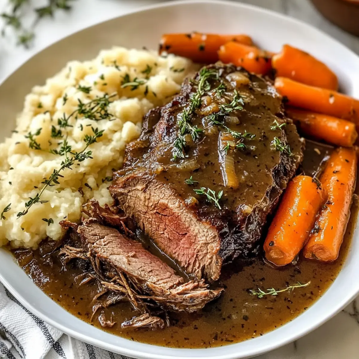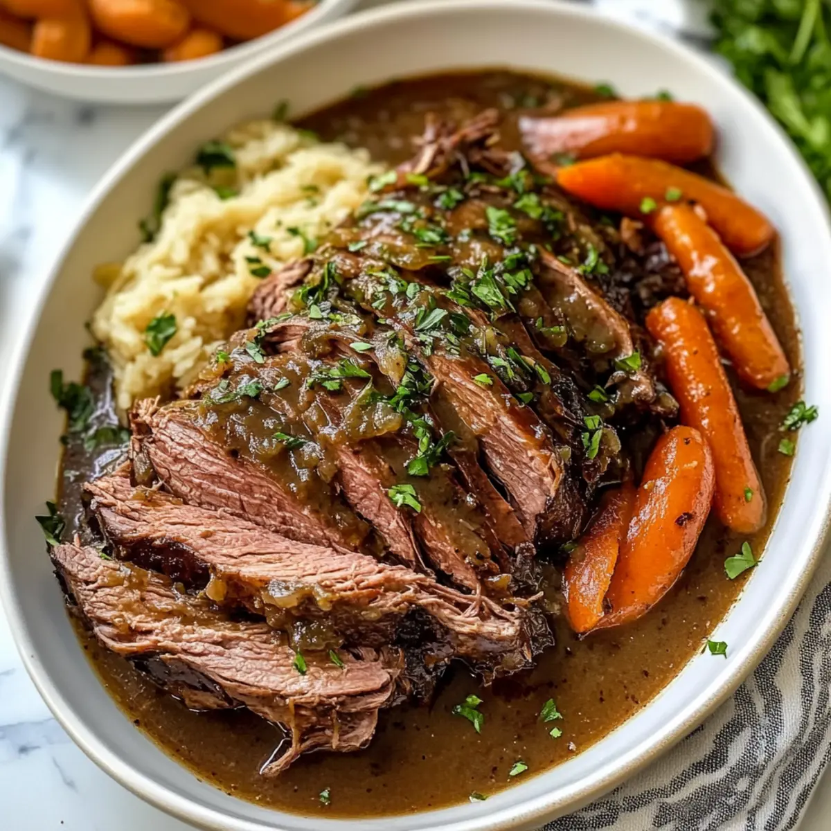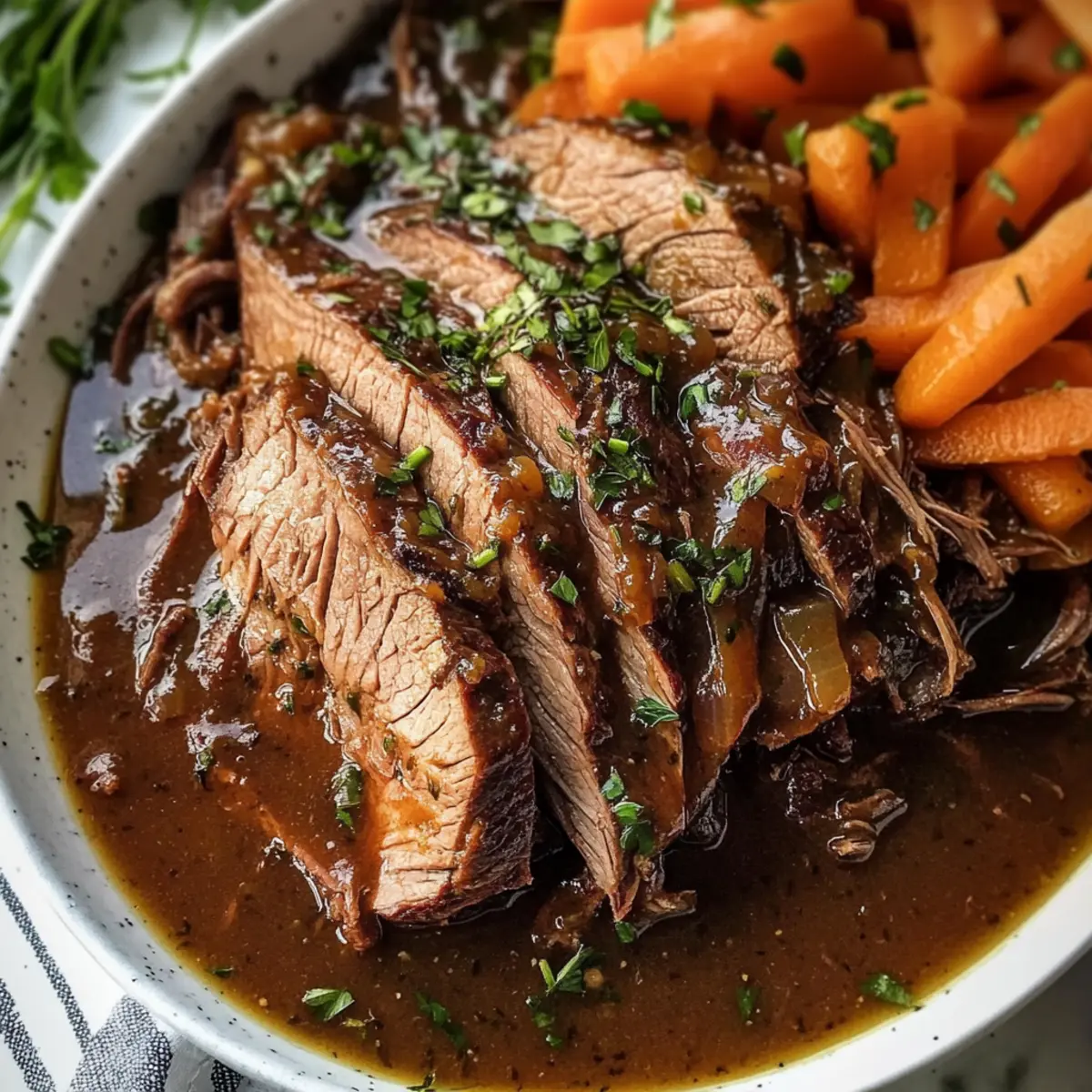 7. Nehmen Sie den Braten vorsichtig aus dem Slow Cooker und schneiden oder zerteilen Sie ihn in Stücke. Servieren Sie ihn warm mit der reichhaltigen Sauce.