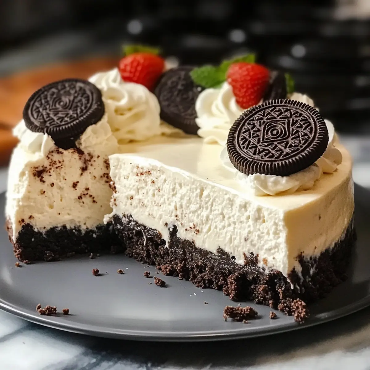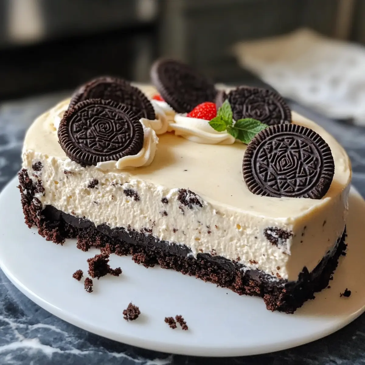 In der Welt der Desserts gibt es Momente, die einen sofort in ihren Bann ziehen – wie der erste Biss in einen köstlichen No-Bake Oreo-Kruste Käsekuchen. Diese süße Verführung bringt die perfekte Balance zwischen reichhaltigem Käsekuchen und knuspriger, schokoladiger Kruste. Egal, ob für einen gemütlichen Abend mit Freunden oder als krönender Abschluss eines besonderen Essens – dieses Rezept ist nicht nur blitzschnell zubereitet, sondern auch unglaublich anpassbar, ideal für verschiedene Geschmäcker und Diätbedürfnisse. Und das Beste? Sie benötigen keinerlei Ofen! Neugierig, wie einfach Sie diesen Genuss nach Hause holen können? Warum werden Sie diesen Käsekuchen lieben? Einfachheit pur: Die Zubereitung erfordert nur wenige Schritte und keine Backkünste – perfekt für jeden, der schmackhafte Desserts liebt. Vielfalt der Aromen: Sie können mit verschiedenen Oreos und frischen Früchten experimentieren, um Ihren ganz persönlichen Lieblingsgeschmack zu kreieren. Schnell zubereitet: In wenigen Minuten und ohne Ofen genießen Sie einen köstlichen Käsekuchen, der jedem Freude bereitet. Nie wieder Fast Food: Diese erfrischende Alternative zu schnell zubereiteten Desserts bringt das echte, hausgemachte Geschmackserlebnis zurück. Gelingsicherheit: Mit unseren Tipps gelingt der Käsekuchen immer – perfekt für Anlässe oder spontanen Genuss! Kreative Varianten: Von glutenfrei bis vegan – dieses Rezept bietet zahlreiche Anpassungsoptionen für alle. Möchten Sie mehr erfahren? Dauerhaft leckere Variationen stehen Ihnen zur Verfügung! Leckere No-Bake Oreo-Kruste Käsekuchen Zutaten Hinweis: Diese Zutatenliste hilft Ihnen, einen wundervollen No-Bake Oreo-Kruste Käsekuchen zuzubereiten, der allen schmeichelt. Für den Boden Oreos – der Basis der Kruste; sorgt für Schokoladengeschmack und Textur. Alternative: Verwenden Sie aromatisierte Oreos für eine einzigartige Abwandlung. Butter – bindet die Zutaten der Kruste und sorgt für Struktur. Alternative: Kokosöl für eine milchfreie Option verwenden. Salz – hebt die Süße hervor und balanciert die Aromen. Für die Füllung Frischkäse – schafft eine reichhaltige und cremige Füllung. Alternative: Veganen Frischkäse für eine milchfreie Alternative verwenden. Zucker – süßt die Füllung. Alternative: Puderzucker verwenden für eine glattere Mischung. Vanilleextrakt – fügt Tiefe zum Geschmack hinzu. Alternative: Mandelessenz für ein anderes Geschmacksprofil verwenden. Zitronensaft – belebt den Geschmack des Käsekuchens. Alternative: Limettensaft für eine tropische Note verwenden. Schlagsahne – wird für Leichtigkeit und Volumen in der Füllung geschlagen. Alternative: Kokoscreme für eine milchfreie Option verwenden. Gelatine – stabilisiert den Käsekuchen und sorgt dafür, dass er richtig fest wird. Hinweis: Agar-Agar für eine vegane Option verwenden. Wasser – wird verwendet, um die Gelatine aufzulösen. Jetzt sind Sie bereit, das Vergnügen eines selbstgemachten No-Bake Oreo-Kruste Käsekuchens zu genießen! Schritt-für-Schritt-Anleitung für Leckere No-Bake Oreo-Kruste Käsekuchen Schritt 1: Oreos zerbröseln Zerdrücken Sie 36 Oreos in feine Krümel, bis sie die Konsistenz von Sand erreichen. Verwenden Sie dazu einen Mixer oder einen Gefrierbeutel und einen Nudelholz. Fügen Sie 5 Esslöffel geschmolzene Butter und 0,5 Teelöffel Salz hinzu und vermischen Sie alles gründlich, bis die Mischung gleichmäßig feucht ist. Schritt 2: Kruste herstellen Drücken Sie die Oreo-Mischung fest in eine gefettete Springform, um eine gleichmäßige Schicht zu bilden. Achten Sie darauf, die Krümel etwa 2 Zoll hoch an den Rändern zu formen. Stellen Sie die Springform für mindestens 30 Minuten in den Kühlschrank, damit die Kruste fest wird und ihre Form behält. Schritt 3: Gelatine vorbereiten Bestreuen Sie 1 Teelöffel Gelatine mit 1 Esslöffel kaltem Wasser und lassen Sie es für einige Minuten an einem kühlen Ort ruhen. Dies ist ein wichtiger Schritt, da die Gelatine quellen muss, bevor sie in die Käsekuchenfüllung integriert werden kann. Schritt 4: Frischkäse cremig schlagen Schlagen Sie 16 Unzen weichen Frischkäse in einer Rührschüssel mit einem Handmixer oder einer Küchenmaschine auf, bis die Masse weich und cremig ist. Fügen Sie 0,75 Tasse Zucker hinzu und mischen Sie weiter, bis keine Zuckerkristalle mehr sichtbar sind und die Mischung glänzend erscheint. Schritt 5: Aroma hinzufügen Rühren Sie 1 Teelöffel Vanilleextrakt und 1 Teelöffel Zitronensaft in die Frischkäsemischung ein. Diese Aromen sorgen dafür, dass der Leckere No-Bake Oreo-Kruste Käsekuchen frisch und lebhaft schmeckt. Mischen Sie gut, bis die Zutaten vollständig integriert sind. Schritt 6: Gelatine auflösen Lösen Sie die eingeweichte Gelatine in 2 Esslöffeln heißem Wasser auf und rühren Sie, bis sie vollständig aufgelöst ist. Diese Mischung muss nun abkühlen, bevor Sie sie zur Käsekuchenfüllung hinzufügen, damit die Gelatine ihre stabilisierende Wirkung entfalten kann. Schritt 7: Sahne schlagen Schlagen Sie 1 Tasse Schlagsahne mit dem restlichen Zucker, bis sich steife Spitzen bilden. Dies verleiht der Füllung eine luftige Textur, die perfekt mit der dichten Kruste harmoniert. Achten Sie darauf, die Sahne nicht zu übermixen, um die Luftigkeit nicht zu verlieren. Schritt 8: Füllung verbinden Heben Sie die geschlagene Sahne vorsichtig unter die Frischkäsemischung. Verwenden Sie einen Spatel und falten Sie die beiden Mischungen zusammen, bis sie gut vermischt sind, ohne die Luftigkeit zu verlieren. Fügen Sie schließlich die aufgelöste Gelatine hinzu und mischen Sie alles vorsichtig zusammen. Schritt 9: Füllung einfüllen Gießen Sie die cremige Füllung vorsichtig in die gekühlte Oreo-Kruste und glätten Sie die Oberfläche mit einem Spatel. Achten Sie darauf, die Füllung gleichmäßig zu verteilen, sodass die Oberseite schön aussieht, wenn der Leckere No-Bake Oreo-Kruste Käsekuchen fertig ist.