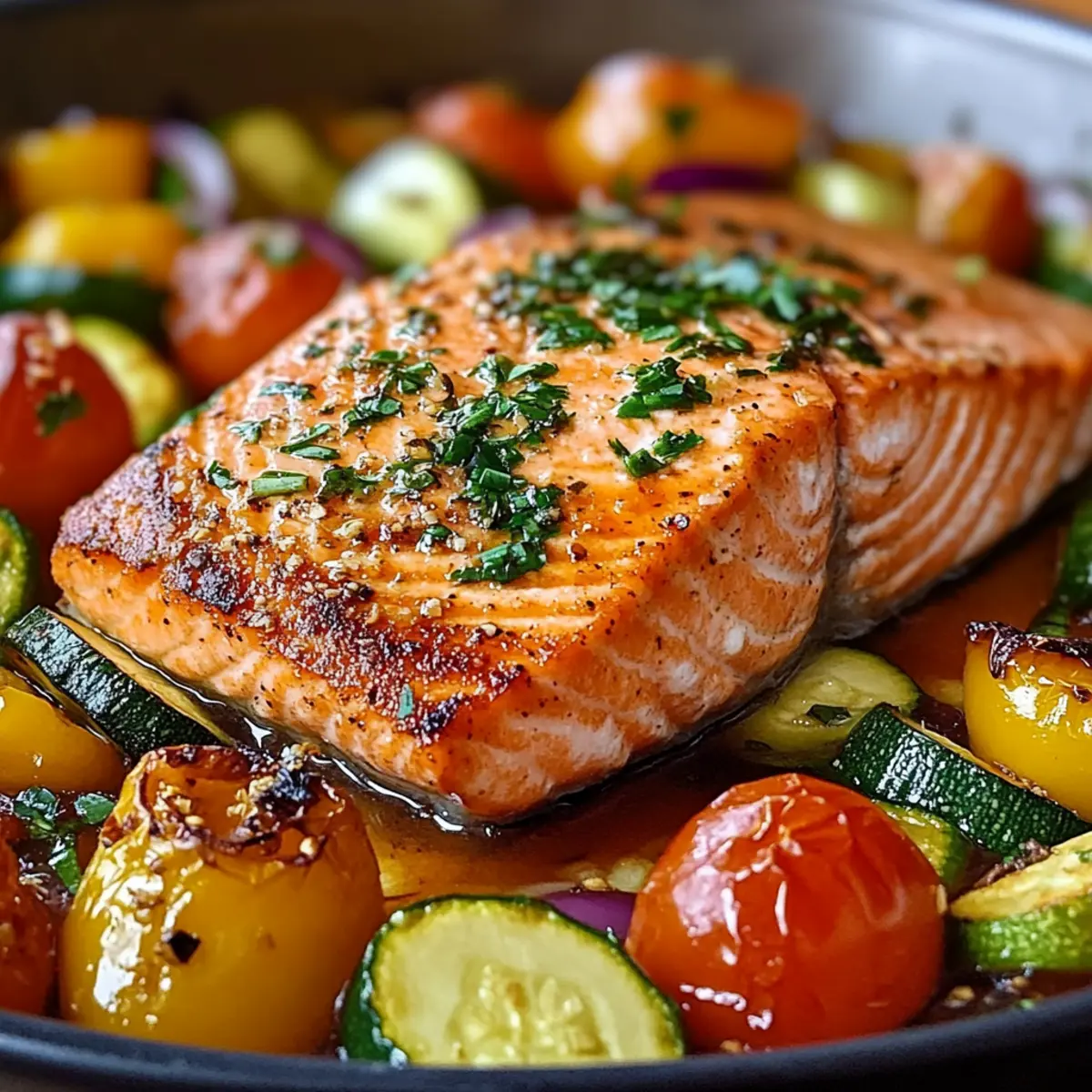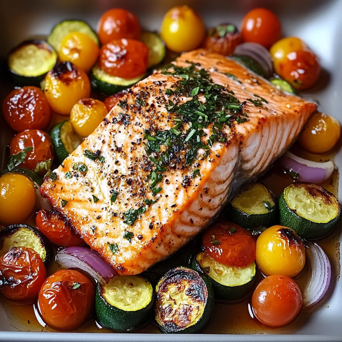 Es war einmal ein hektischer Wochentag, als ich mich in der Küche wiederfand, völlig überwältigt von der Auswahl an Fertiggerichten. Plötzlich überkam mich der Drang nach etwas Hausgemachtem. Das Ergebnis? Dieses leckere Rezept für einfach gebackenen Lachs mit buntem Gemüse! Mit zartem, flockigem Lachs, der perfekt mit lebhaften, gerösteten Gemüse harmoniert, ist dieses Gericht nicht nur eine Wohltat für den Gaumen, sondern auch eine gesunde Wahl, die in weniger als 30 Minuten auf dem Tisch stehen kann. Ideal für stressige Abende oder einfach, um das Wochenende entspannt zu genießen. Wer kann da widerstehen? Lass uns gemeinsam in die Details eintauchen und entdecken, wie einfach es ist, eine köstliche Mahlzeit zuzubereiten! Warum wirst du dieses Rezept lieben? Einfachheit: Die Zubereitung ist unkompliziert und benötigt nur grundlegende Kochfähigkeiten. Mit nur wenigen Handgriffen zauberst du ein köstliches Gericht! Gesunde Wahl: Mit wenigen Zutaten erhältst du eine nahrhafte Mahlzeit, die glutenfrei und milchfrei ist – ideal für jede Diät. Schnell zubereitet: Dieses Rezept ist perfekt für hektische Wochentage und steht in weniger als 30 Minuten auf dem Tisch! Vielfältig: Du kannst die Gemüsevarianten je nach Saison oder Vorlieben anpassen – perfekt für kreative Köche! Und wenn du nach weiteren tollen Ideen suchst, schau dir unser Rezept für duftenden Couscous an! Guten Appetit: Die Kombination aus zartem Lachs und geröstetem Gemüse sorgt für ein Geschmackserlebnis, das selbst die wählerischsten Esser begeistert. Leckeres Rezept: Lachs mit Gemüse Zutaten • Für die Marinade: Olivenöl – wichtig für das Rösten und sorgt für zusätzlichen Geschmack. Minced Garlic – verbreitet ein herrliches Aroma und bringt den ganzen Geschmack zur Geltung. Zitronenschale – verleiht der Mischung Frische und eine angenehme Säure. Getrockneter Oregano – fügt eine harmonische Kräuternote hinzu; kann durch italienische Gewürze ersetzt werden. Salz und Pfeffer – essentielle Würzmittel, die du nach Geschmack anpassen kannst. • Für den Lachs und Gemüse: Lachsfilets – die Hauptzutat, sorgt für eine zarte, flockige Textur. Ersatz: Nutze festen Fisch wie Kabeljau oder Forelle. Kirschtomaten – bringen Süße und Saftigkeit ins Spiel. Ersatz: Auch Traubentomaten eignen sich hervorragend. Zucchini – mild im Geschmack und sorgt für eine zarte Konsistenz. Ersatz: Du kannst auch Spargel oder grüne Bohnen verwenden. Paprika – sorgt für Farbe und Knusprigkeit; verstärkt die Süße des Gerichts. Ersatz: Verwende jede beliebige Paprikafarbe oder Zuckerschoten. Rote Zwiebel – bringt Tiefe und eine leichte Schärfe. Ersatz: Schalotten sind eine milde Alternative.” Dieses leckere Rezept ist nicht nur gesund, sondern auch einfach und schnell zuzubereiten! Schritt-für-Schritt-Anleitung für Leckeres Rezept: Einfacher Lachs mit Gemüse Step 1: Ofen vorheizen Heize den Ofen auf 200 °C (400 °F) vor und stelle das Backblech in die Mitte des Ofens. Dies sorgt dafür, dass dein Lachs gleichmäßig gart und die Kräuteraromen sich entfalten können. Die richtige Temperatur ist entscheidend für eine perfekte Textur des Lachses und der gerösteten Gemüse. Step 2: Gemüse vorbereiten Schneide die Kirschtomaten, Zucchini, Paprika und rote Zwiebel in gleichmäßige Stücke. Gib das Gemüse in eine große Schüssel und füge Olivenöl, Salz, Pfeffer und Oregano hinzu. Vermische alles gründlich, sodass das Gemüse gleichmäßig mit den Gewürzen umhüllt ist, und lege es dann auf das Backblech. Step 3: Lachs anrichten Platziere die Lachsfilets mit der Hautseite nach unten zwischen dem Gemüse auf dem Backblech. Achte darauf, dass genügend Platz für die Hitzezirkulation bleibt, damit alles gleichmäßig gart. So kann der Lachs saftig bleiben und der Geschmack des Gemüses auf ihn übergehen. Step 4: Lachs würzen Träufle etwas Olivenöl über die Lachsfilets und bestreue sie mit dem gehackten Knoblauch, Zitronenschale, zusätzlichem Salz und Pfeffer sowie Oregano. Diese Aromen verstärken das leckere Rezept und runden das Gericht perfekt ab, sodass der Lachs gut gewürzt und geschmackvoll ist. Step 5: Backen Schiebe das Backblech in den vorgeheizten Ofen und backe das Gemüse und den Lachs für 15 bis 18 Minuten. Achte darauf, dass der Lachs leicht flockig wird und das Gemüse zart, aber nicht matschig ist. Du kannst an das Gemüse klopfen, um zu testen, ob es die richtige Konsistenz hat. Step 6: (Optional) Überbacken Falls du eine goldene Kruste wünschst, schalte den Ofen auf Grillfunktion und lasse alles für 1 bis 2 Minuten broil’en. Beobachte dabei das Gericht genau, um sicherzustellen, dass der Lachs nicht verbrennt. Diese Option verleiht dem Gericht einen zusätzlichen köstlichen Crunch. Step 7: Anrichten und servieren Nimm das Backblech aus dem Ofen und garniere den gebackenen Lachs mit frisch gehackter Petersilie und ein paar Zitronenscheiben an der Seite. Das sorgt für zusätzlichen Geschmack und eine ansprechende Präsentation. Jetzt ist dein Leckeres Rezept bereit, serviert zu werden! Leckeres Rezept: Variationen & Alternativen Lass deiner Kreativität freien Lauf und passe dieses Rezept ganz nach deinen Vorlieben an! Glutenfrei: Verwende glutenfreie Sojasauce oder Tamari anstelle von üblichen Soßen, um das Gericht noch gesünder zu gestalten. Würzig: Füge eine Prise Cayennepfeffer oder rote Pfefferflocken hinzu, um dem Lachs eine angenehme Schärfe zu verleihen. Diese kleine Veränderung kann das gesamte Geschmackserlebnis umdrehen. Afrika an den Tisch: Experimentiere mit Harissa oder einer anderen Gewürzmischung für einen aufregenden, würzigen Auftritt. Das gibt dem Gericht eine spannende, exotische Note, die deine Geschmacksknospen erfreuen wird. Getränkeempfehlung: Serviere einen frischen Weißwein oder einen spritzigen Rosé, um die Aromen des Lachsgerichtes perfekt zu ergänzen und eine angenehme Essensatmosphäre zu schaffen. Du wi