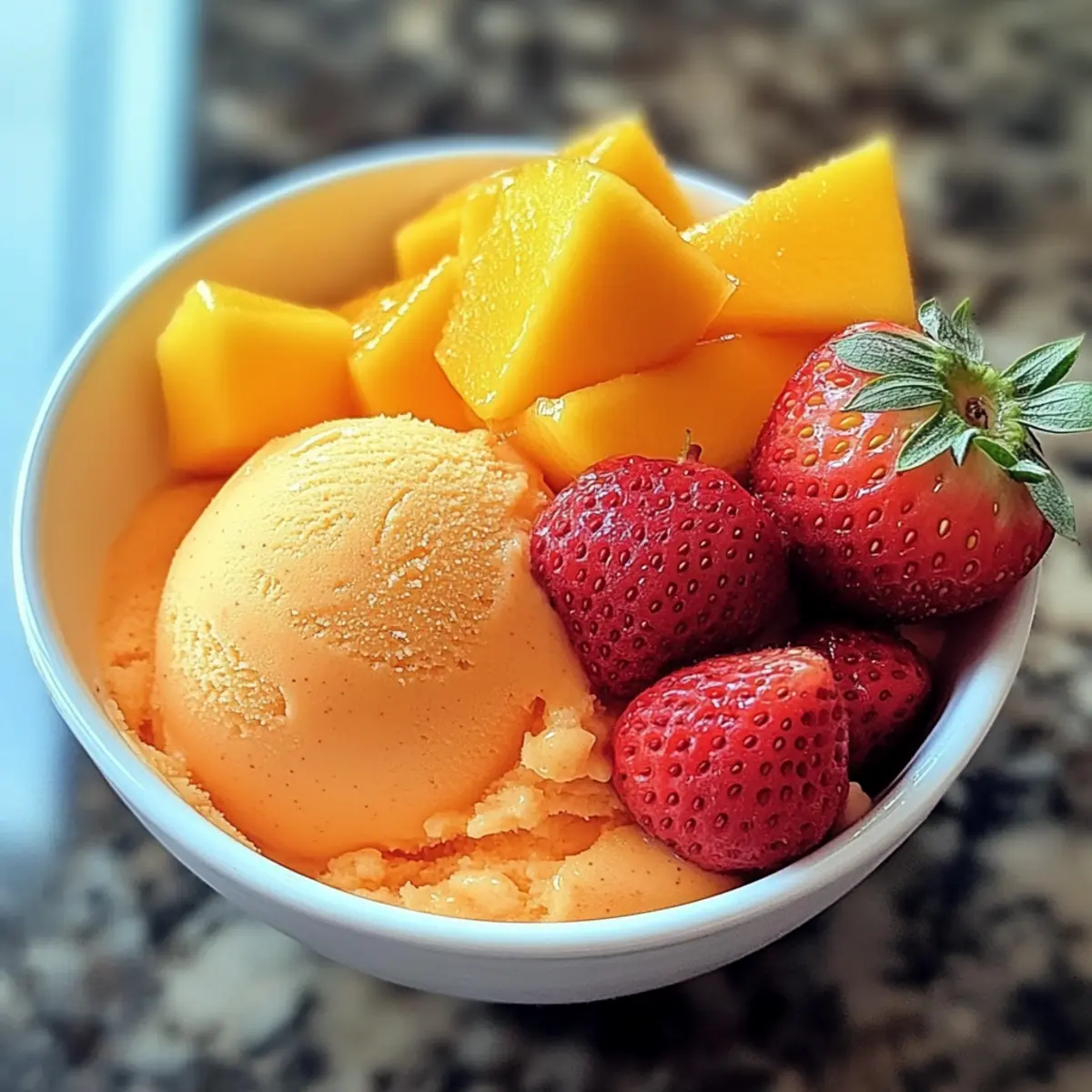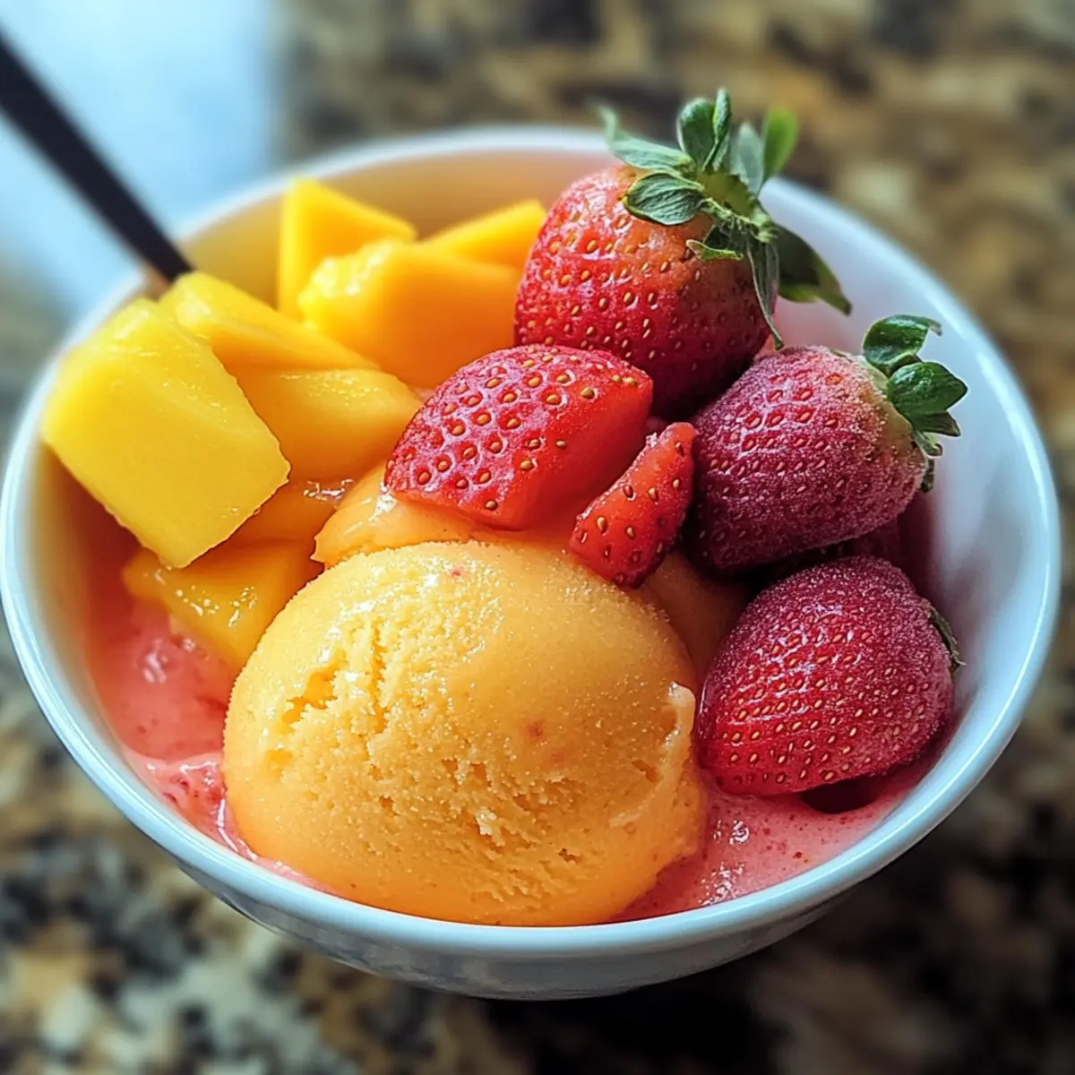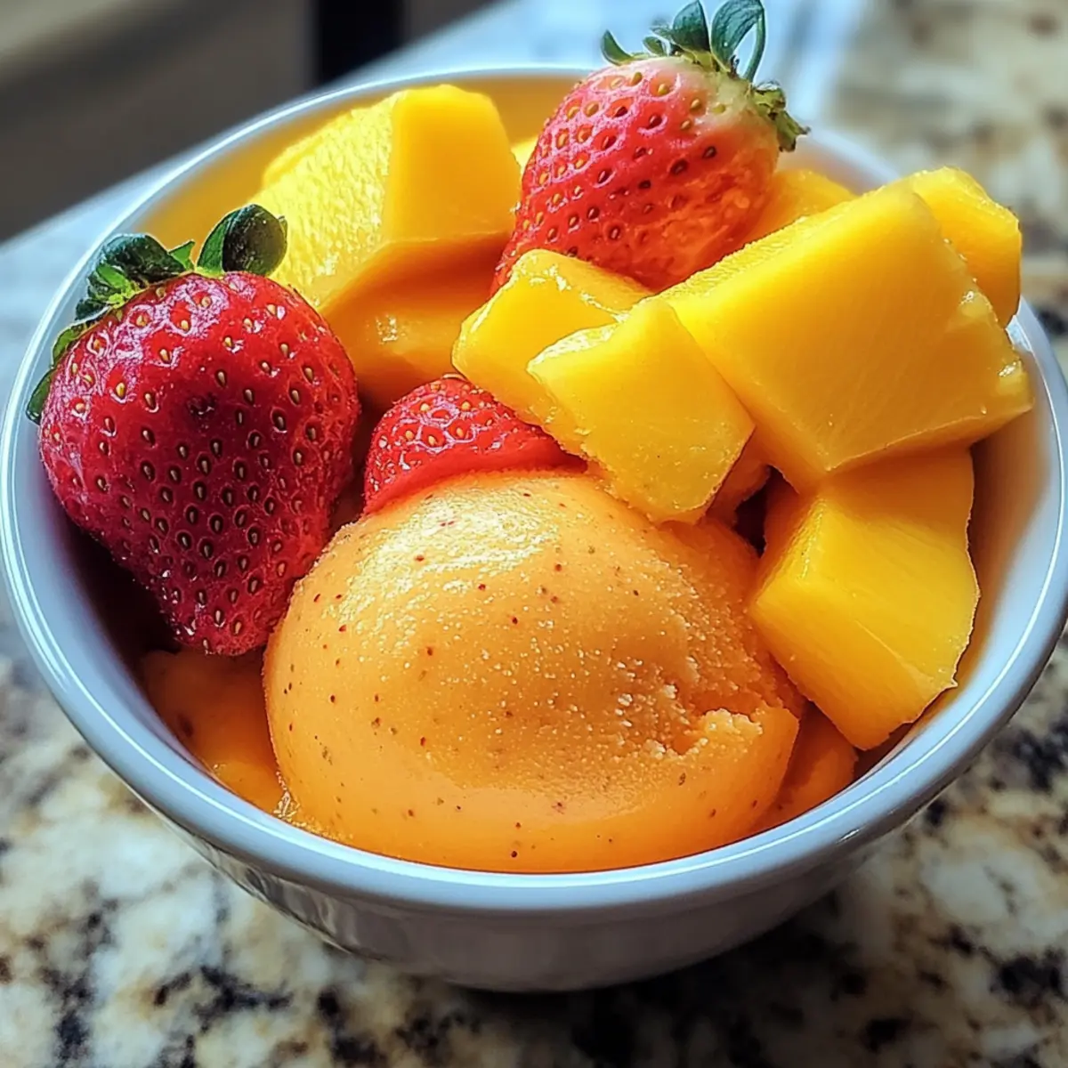 Es war ein heißer Sommertag, als ich in meinem kleinen Garten ein paar reife Mangos und Erdbeeren entdeckte, die darauf warteten, geerntet zu werden. Sofort kam mir die Idee, einen köstlichen Mango Erdbeer Sorbet zu zaubern – die perfekte Kombination aus frischen, fruchtigen Aromen und einer samtigen Textur. Dieses vegane Dessert ist nicht nur ein schneller Genuss, der in wenigen Minuten zubereitet ist, sondern auch eine gesunde Alternative zu herkömmlichem Eis, die ehrlich gesagt jeden Eisliebhaber begeistern wird. Jeder Löffel verspricht eine erfrischende Explosion von Geschmack, die den Sommer direkt in deine Küchenschublade zaubert. Bist du bereit, deine Geschmacksnerven mit diesem leichten, leckeren Sorbet zu verwöhnen? Lass uns gleich loslegen! Warum ist Mango Erdbeer Sorbet besonders? Fruchtige Frische: Die Kombination aus saftigen Mangos und süßen Erdbeeren verleiht diesem Sorbet einen unwiderstehlichen fruchtigen Geschmack, der an sonnige Tage erinnert. Vegan und gesund: Ohne tierische Produkte ist unser Sorbet nicht nur für Veganer geeignet, sondern auch eine leichte, kalorienarme Alternative zu herkömmlichem Eis. Einfach und schnell: Die Zubereitung erfordert nur wenige Minuten und einfaches Equipment, perfekt für spontane Lust auf etwas Süßes. Anpassbar: Du kannst mit verschiedenen Früchten experimentieren oder sogar einen Spritzer Limettensaft hinzufügen, um die Aromen zu intensivieren. Küchenfreund: Ideal für Familienfeiern oder einfach als Erfrischung nach einem langen Tag – jeder wird dieses köstliche Dessert lieben! Vorratshaltung: Bereite es einen Tag im Voraus vor und bewahre es in deinem Gefrierschrank auf, um immer eine kühle Belohnung parat zu haben. Mango Erdbeer Sorbet Zutaten Für die Basis • Mangos – sorgen für natürliche Süße und einen tropischen Geschmack. • Erdbeeren – verleihen fruchtige Frische und ein schönes Aroma. • Zucker – süßt das Sorbet; alternativ kann auch Stevia oder Erythrit für eine zuckerfreie Option verwendet werden. • Wasser – hilft, die Zutaten glatt zu mixen; passe die Menge nach Wunsch an. • Limettensaft – bringt eine erfrischende Note; kann nach Belieben weggelassen werden. Dieses leckere Mango Erdbeer Sorbet ist nicht nur ein Genuss, sondern auch eine gesunde und vegane Dessertoption, die jedem schmecken wird. Schritt-für-Schritt-Anleitung für Mango Erdbeer Sorbet Step 1: Früchte vorbereiten Schäle die Mangos und würfle sie in kleine Stücke. Entferne die grünen Teile der Erdbeeren und schneide diese in Scheiben. Achte darauf, dass die Früchte reif und süß sind, um den besten Geschmack für dein Mango Erdbeer Sorbet zu erzielen. Step 2: Zutaten mixen Gib die gewürfelten Mangos und die geschnittenen Erdbeeren in einen leistungsstarken Mixer. Füge Zucker und Wasser hinzu sowie optional den Limettensaft. Mixe die Zutaten auf hoher Stufe, bis eine glatte und cremige Konsistenz entsteht. Schmecke die Mischung ab und passe die Süße an, falls nötig. Step 3: Mischung einfrieren Gieße die gemixte Mischung in ein flaches, gefriersicheren Behälter und verteile sie gleichmäßig. Decke den Behälter gut ab und stelle ihn für 4 bis 6 Stunden in den Gefrierschrank, bis das Sorbet fest ist. Rühre alle paar Stunden um, um die Bildung von Eiskristallen zu vermeiden und eine glatte Textur zu gewährleisten. Step 4: Servieren Lass das Mango Erdbeer Sorbet vor dem Servieren 5 bis 10 Minuten bei Raumtemperatur stehen, damit es etwas weicher wird, wodurch sich das Portionieren erleichtert. Verwende einen Eislöffel oder einen Löffel, um das Sorbet in schöne Dessertschalen oder Waffeln zu portionieren. Expert Tips für Mango Erdbeer Sorbet Frische Zutaten: Achte darauf, die Mangos und Erdbeeren frisch und reif zu wählen. Diese sorgen für den besten Geschmack in deinem Mango Erdbeer Sorbet. Zuckeranpassung: Beginne mit der angegebenen Zuckermenge, schmecke dann ab und passe sie an. Manchmal reicht es, weniger Zucker zu verwenden, vor allem wenn die Früchte sehr süß sind. Eiskristalle vermeiden: Rühre die Mischung alle paar Stunden während des Gefrierens um. Dies hilft, eine glatte Konsistenz zu bewahren und Eiskristalle im Sorbet zu vermeiden. Variationen ausprobieren: Trau dich, mit verschiedenen Früchten zu experimentieren. Das Ersetzen von Mango durch Pfirsiche oder das Hinzufügen von Minze kann deinem Sorbet einen neuen Twist geben. Richtige Konsistenz: Lass das Sorbet vor dem Servieren kurz bei Raumtemperatur stehen. So bekommt es die richtige Konsistenz für ein perfektes Portionieren und Genießen. Lagerung: Bewahre das Mango Erdbeer Sorbet in einem luftdichten Behälter auf, um es bis zu zwei Wochen frisch zu halten. Was passt gut zu Mango Erdbeer Sorbet? Genieße die erfrischenden Aromen des Sommers und baue mit diesen Beilagen ein rundum perfektes Dessert-Erlebnis auf. Frische Minze: Ihr kühlender Geschmack harmoniert perfekt mit der Süße des Sorbets und verleiht einen zusätzlichen Aroma-Kick. Knusprige Waffeln: Serviere dein Sorbet in knusprigen Waffeln für einen köstlichen Texturkontrast, der jeden Bissen noch aufregender macht. Fruchtige Salsa: Eine Salsa aus Ananas und Limette bringt eine exotische, fruchtige Note hinzu und ergänzt das Mango Erdbeer Sorbet perfekt. Zartbittere Schokolade: Ein oder zwei Raspel von dunkler Schokolade setzen einen geschmacklichen Kontrapunkt und bieten einen soliden, süßen Biss. Kokosnuss-Raspel: Diese sorgen für einen tropischen Flair und eine zusätzliche Textur, die jeden Löffel zum Erlebnis macht. Eiskalte Limonade: Ein spritziges Getränk, das die fruchtigen Aromen des Sorbets unterstreicht und für eine perfekte Erfrischung an heißen Tagen sorgt. Variationen & Alternativen für Mango Erdbeer Sorbet Gestalte dein Mango Erdbeer Sorbet ganz nach deinem Geschmack und erlebe aufregende neue Aromen! Dairy-Free: Für eine cremigere Textur füge eine Banane hinzu, die zusätzlich eine natürliche Süße bringt. Zuckerfrei: Erset