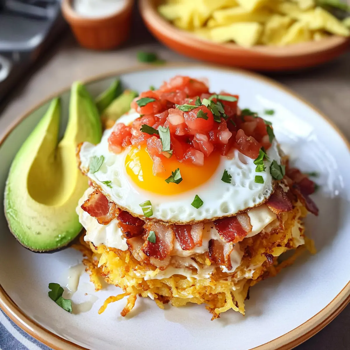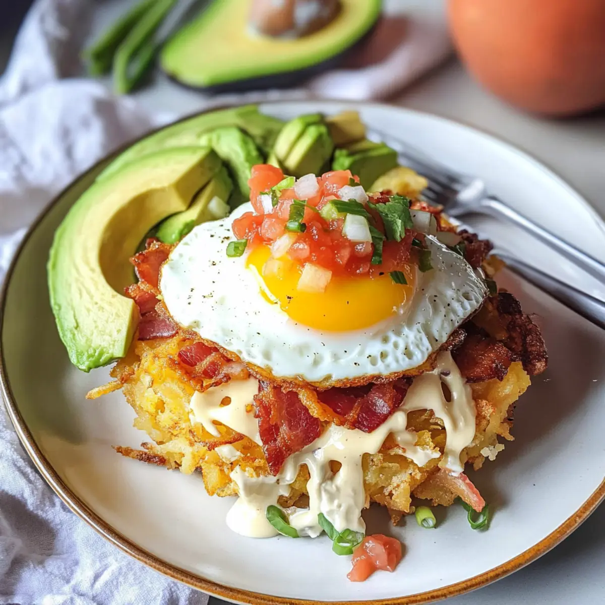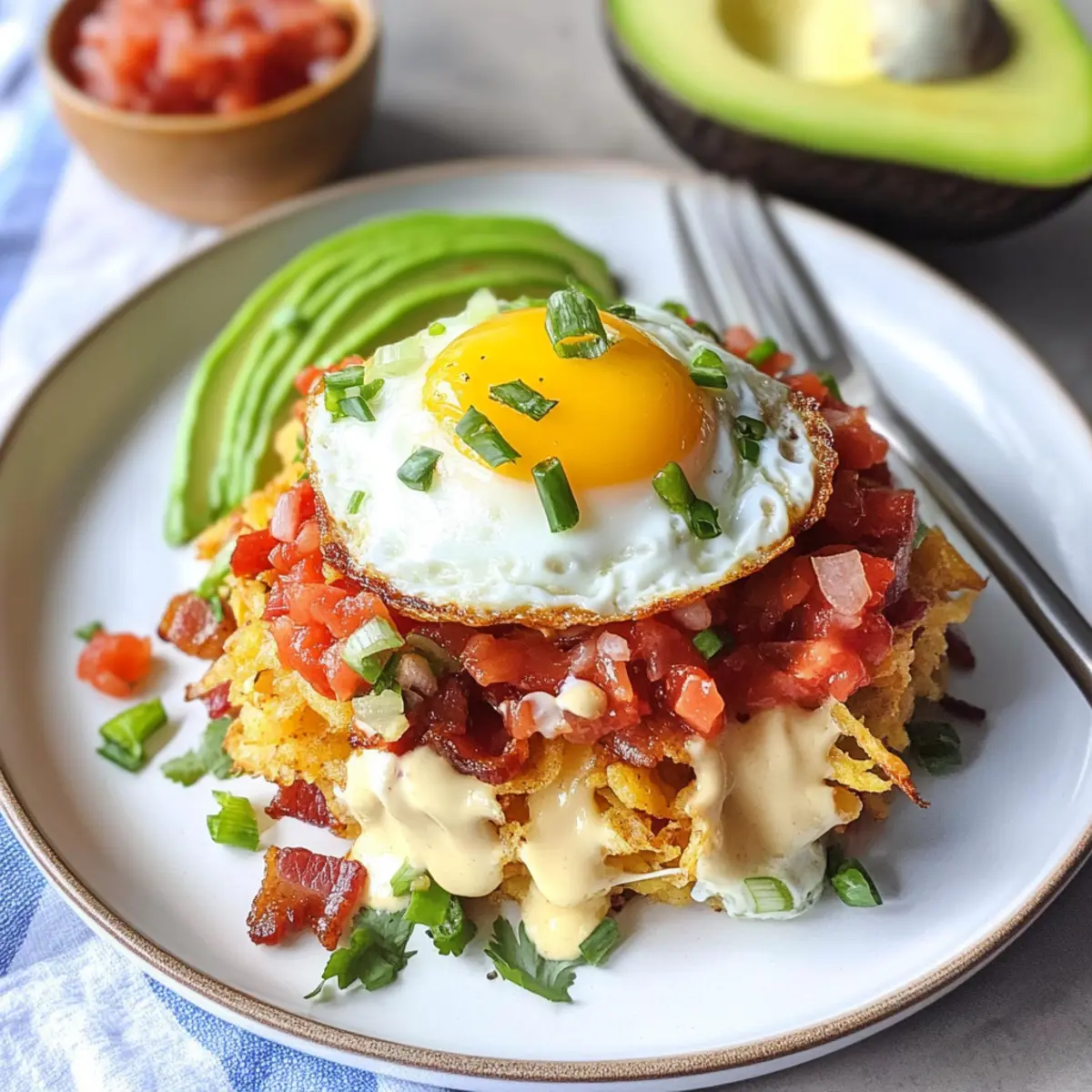 Ein verführerischer Duft zieht durch die Küche, während sich die goldbraunen Rösti-Häufchen langsam rösten. Diese Mexikanischen knusprigen Rösti-Häufchen sind nicht nur ein Hingucker auf jedem Frühstückstisch, sondern auch ein wahres Komfortessen, das jeder liebt. Einfach zuzubereiten und vielseitig anpassbar, vereinen sie die perfekte Textur von knusprigen Kartoffeln, cremigen Avocados und einem perfekt gebratenen Ei. Ob für ein schnelles Wochentagfrühstück oder für einen gemütlichen Brunch mit Freunden, diese Häufchen sind die ideale Lösung für alle, die sich nach einer herzhaften, frisch zubereiteten Mahlzeit sehnen. Neugierig, wie Sie dieses leckere Rezept mit Ihren eigenen Geschmacksvorlieben abwandeln können? Warum sind diese Rösti-Häufchen so besonders? Begeisterung für Komfort: Diese Mexikanischen knusprigen Rösti-Häufchen sind der Inbegriff von Herzhaftigkeit und machen jede Mahlzeit zu etwas Besonderem. Vielseitigkeit in jedem Bissen: Ob Sie sie mit frischem Gemüse, einer Eier Benedict Variante oder zusätzlichen Proteinquellen anpassen, Ihrer Kreativität sind keine Grenzen gesetzt. Einfache Zubereitung: Mit nur wenigen Grundzutaten und einfacher Anleitung sind diese Häufchen in kürzester Zeit fertig, perfekt für hektische Morgen. Familienliebling: Egal ob Jung oder Alt, jeder wird von der Kombination aus knusprigen Rösti und cremigen Toppings begeistert sein. Perfekte Textur: Die knusprigen Rösti vereinen sich wunderbar mit der Cremigkeit der Avocado und dem herzhaften Ei – ein Fest für die Sinne! Optimal für Meal Prepping: Bereiten Sie die Rösti-Häufchen im Voraus vor und genießen Sie sie wann immer Sie Lust auf ein köstliches Gericht haben! Mexikanische knusprige Rösti-Häufchen Zutaten • Für das Grundrezept: Röstikartoffeln – Bilden die knusprige Basis der Häufchen; frisch geriebene Kartoffeln können verwendet werden. Panko-Brösel – Sorgen für zusätzliche Knusprigkeit; reguläre Semmelbrösel sind ein direkter Ersatz. Mexikanische Käsemischung – Fügt cremige Textur und Geschmack hinzu; jedes beliebte schmelzende Käse kann hier verwendet werden. Wasser – Bindet die Mischung; kann durch Milch ersetzt werden, um zusätzlichen Reichtum zu erzeugen. Salz – Verstärkt den Gesamtgeschmack; je nach Vorliebe anpassen. Öl – Wird zum Braten verwendet, um die Rösti schön knusprig zu machen; neutrales Öl kann substituiert werden. • Für die Toppings: Eier – Liefern hochwertiges Protein und können nach Belieben zubereitet werden (z.B. mit flüssigem Eigelb). Sauerrahm – Fügt Cremigkeit und einen Hauch von Säure hinzu; kann durch griechischen Joghurt für eine leichtere Variante ersetzt werden. Avocado – Bringt gesunde Fette und Cremigkeit; Guacamole kann als einfache Alternative verwendet werden. Frische Salsa – Sorgt für Frische und Feuchtigkeit; frische Tomaten sind eine gute Ergänzung für eine hausgemachte Option. Speckstücke – Fügen einen herzhaften, rauchigen Geschmack hinzu; können durch Truthahn-Bacon ersetzt oder für vegetarische Optionen weggelassen werden. Limette – Bringt die Aromen zum Strahlen; Zitronensaft kann als Alternative genutzt werden. Frische Koriander – Ergänzt den Geschmack mit seinen kräuterigen Noten; weglassen, wenn Sie kein Koriander-Fan sind. Entdecken Sie die köstlichen Möglichkeiten mit diesen Mexikanischen knusprigen Rösti-Häufchen! Schritt-für-Schritt-Anleitungen für Mexikanische knusprige Rösti-Häufchen Step 1: Zubereitung des gewürzten Sauerrahms Mischen Sie in einer kleinen Schüssel den Sauerrahm, die geschnittenen Frühlingszwiebeln, frischen Koriander und Taco-Gewürz gut durch. Diese aromatische Mischung bringt eine herrliche Cremigkeit in Ihre Mexikanischen knusprigen Rösti-Häufchen. Lassen Sie die Mischung beiseite, während Sie die anderen Zutaten vorbereiten. Step 2: Vorbereitung der Avocado Schneiden Sie eine reife Avocado auf, entnehmen Sie den Kern und schneiden Sie das Fruchtfleisch in kleine Würfel. Beträufeln Sie die Stücke mit Limettensaft, etwas Salz und Pfeffer, um den Geschmack zu heben. Die cremige und frische Avocado fügt eine köstliche Dimension zu Ihren Rösti-Häufchen hinzu. Step 3: Hashbrown-Mischung herstellen In einer großen Schüssel kombinieren Sie die geriebenen Röstikartoffeln mit Panko-Bröseln, der mexikanischen Käsemischung, Wasser und Salz. Mischen Sie alles gründlich, bis eine gleichmäßige Masse entsteht. Diese Mischung bildet die köstlich knusprige Basis für Ihre Mexikanischen knusprigen Rösti-Häufchen. Step 4: Rösti braten Heizen Sie ein elektrisches Grillgerät auf 180 °C vor und geben Sie etwas Öl hinein. Formen Sie aus der Kartoffelmischung kleine Patties und braten Sie diese goldbraun und knusprig, etwa 5-7 Minuten auf jeder Seite. Achten Sie darauf, dass die Rösti gut durchgegart und knusprig sind – so schmecken sie perfekt! Step 5: Eier zubereiten Verwenden Sie dasselbe Grillgerät und fügen Sie bei Bedarf mehr Öl hinzu. Schlagen Sie die Eier direkt in die Pfanne und braten Sie sie nach Wunsch (zum Beispiel mit flüssigem Eigelb). Die perfekt gebratenen Eier sind das i-Tüpfelchen für Ihre Mexikanischen knusprigen Rösti-Häufchen. Step 6: Zusammenstellen der Häufchen Beginnen Sie mit der Montage Ihrer Rösti-Häufchen, indem Sie ein gebratenes Ei auf jedes knusprige Rösti-Pattie legen. Toppen Sie diese mit Speckstückchen, frischer Salsa, Avocado und dem gewürzten Sauerrahm. Dekorieren Sie nach Belieben und genießen Sie diese köstlichen frisch zubereiteten Häufchen! Was passt zu Mexikanischen knusprigen Rösti-Häufchen? Ein ausgewogenes Frühstück voller Farben und Aromen lässt Ihren Morgen strahlen und öffnet die Augen für den Tag. Frischer Obstsalat: Eine Kombination aus saftigen Früchten sorgt für einen erfrischenden Kontrast zu den herzhaften Rösti-Häufchen. Cremiger Joghurt: Servieren Sie griechischen Joghurt mit Honig und Nüssen für eine proteinreiche Beila