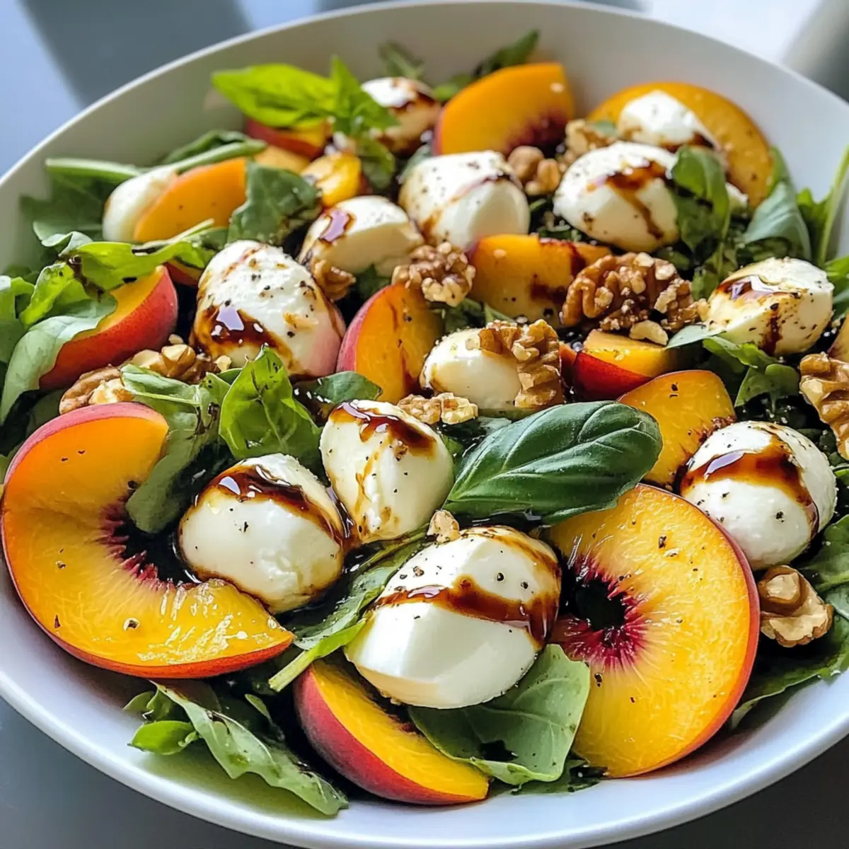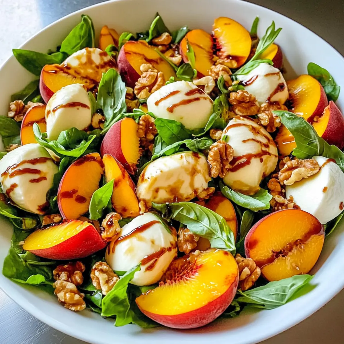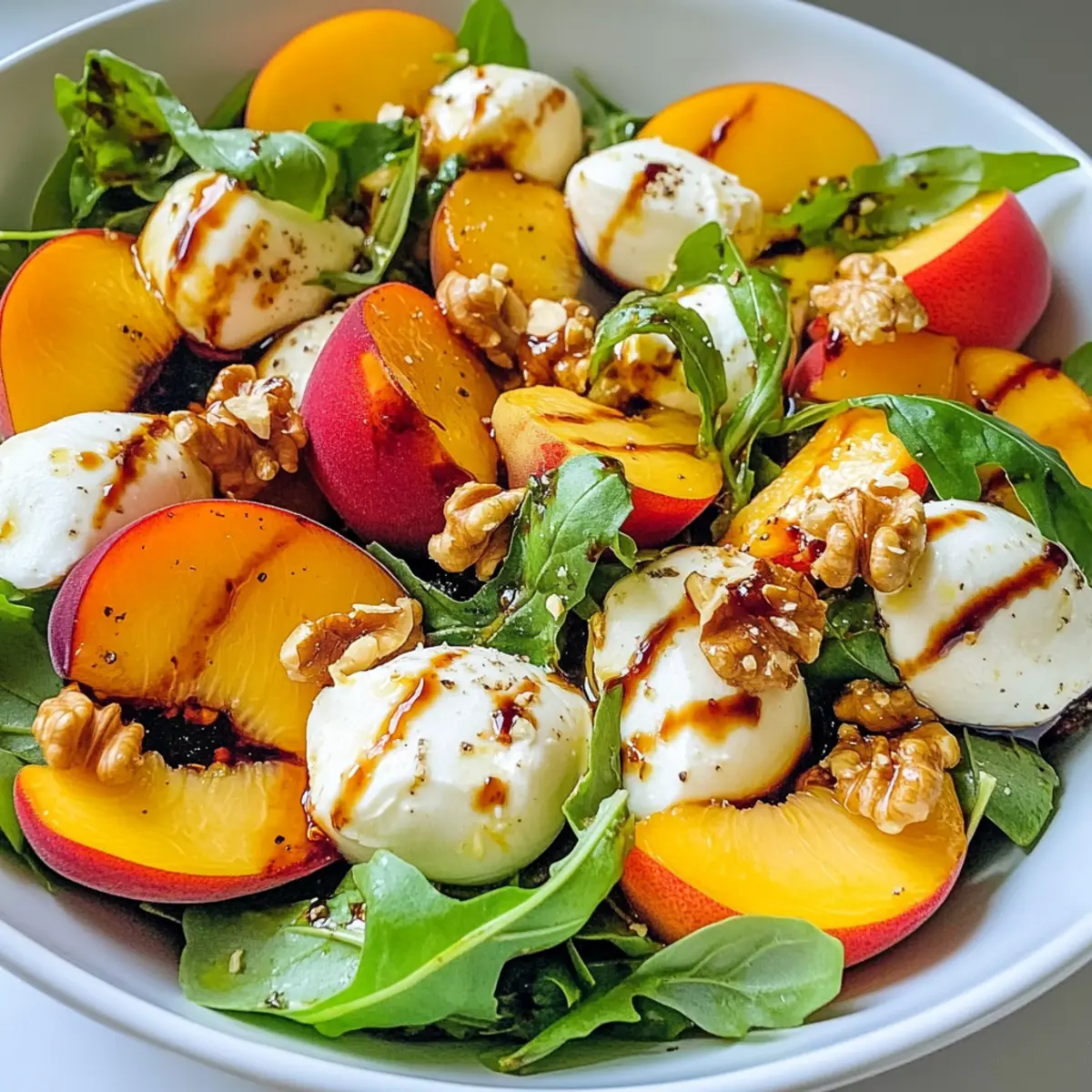 Der Sommer ist endlich da, und mit ihm die perfektionierte Frische des Millionärs-Pfirsichsalats, der nicht nur unsere Geschmacksnerven auftrumpft, sondern auch visuell begeistert. Die saftigen Pfirsiche harmonieren wunderbar mit cremigem Mozzarella, knackigen Walnüssen und duftendem Basilikum und ergeben so eine Mahlzeit, die sowohl leicht als auch sättigend ist. Dieses Rezept ist nicht nur schnell zubereitet, sondern auch äußerst anpassungsfähig – ideal für Grillpartys oder einfach als gesunde Mahlzeit an heißen Tagen. Bereite dich darauf vor, deine Gäste mit diesem köstlichen Salat zu beeindrucken! Welche kreativen Variationen werden dir einfallen, um ihm deinen persönlichen Twist zu verleihen? Warum wirst du diesen Salat lieben? Frische, die begeistert: Der Millionärs-Pfirsichsalat bringt die leuchtenden Farben des Sommers auf deinen Teller. Einfach zuzubereiten: Mit minimalem Aufwand und nur wenigen Zutaten ist er ideal für spontane Grillabende oder ein schnelles Mittagessen. Vielseitigkeit pur: Egal, ob du ihn vegan oder glutenfrei zubereiten möchtest, die Anpassungsmöglichkeiten sind grenzenlos – experimentiere mit verschiedenen Früchten oder Käsesorten! Kombination der Aromen: Die Mischung aus süßen Pfirsichen, cremigem Mozzarella und knusprigen Walnüssen wird dich umhauen. Gesund und nahrhaft: Diese erfrischende Salatvariante enthält gesunde Fette und Vitamine, die perfekt für heiße Sommertage sind. Perfekt für gesellige Anlässe: Egal, ob als Beilage zu Fleischgerichten oder Hauptspeise – dieser Salat wird garantiert der Star deiner nächsten Zusammenkunft sein! Millionärs-Pfirsichsalat Zutaten • Für den Salat Reife Pfirsiche – Sie sorgen für natürliche Süße und Saftigkeit; achte darauf, dass die Pfirsiche leicht nachgeben, wenn du sie drückst. Frische Mozzarellakugeln – Bringen eine cremige Textur; kann durch Burrata oder Ziegenkäse ersetzt werden, um verschiedene Geschmäcker zu kreieren. Rucola oder gemischte Blattsalate – Liefert eine pfeffrige Note, die die Süße ergänzt; problemlos durch Spinat oder Grünkohl austauschbar. Walnüsse – Sorgt für Crunch und nussigen Geschmack; das Toasten verbessert den Geschmack, Alternativen sind Pekannüsse oder Sonnenblumenkerne. Fetakäse – Fügt einen salzigen Kontrast hinzu; kann für eine vegane Version weggelassen oder durch pflanzlichen Käse ersetzt werden. Frische Basilikumblätter – Steigert Aroma und Geschmack; gerne auch durch Minze ersetzen, wenn gewünscht. Balsamico-Glasur – Vereint alle Aromen mit ihrer süß-säuerlichen Note; alternativ kann Balsamicoessig mit etwas Honig gemischt werden. Salz und Pfeffer – Für die richtige Würze beim Abschmecken, hebt die Aromen optimal hervor. Ob du beim Zusammenstellen des Millionärs-Pfirsichsalats schon eine eigene Variation im Kopf hast oder einfach nur die klassischen Zutaten bevorzugst, dieser Salat ist ein echter Genuss für heiße Sommertage! Schritt-für-Schritt-Anleitung für Millionärs-Pfirsichsalat Step 1: Pfirsiche vorbereiten Wasche die reifen Pfirsiche gründlich unter fließendem Wasser und schneide sie in Spalten, nachdem du die Kerne entfernt hast. Achte darauf, dass die Pfirsiche leicht nachgeben, wenn du sie drückst, damit sie süß und saftig sind. Diese frischen Pfirsiche sind die Hauptdarsteller in deinem Millionärs-Pfirsichsalat. Step 2: Salatzutaten kombinieren Gib die geschnittenen Pfirsichspalten in eine große Schüssel und füge die halbierten Mozzarellakugeln sowie die gewählten Blattsalate wie Rucola oder gemischte Greens hinzu. Stelle sicher, dass alle Zutaten gleichmäßig verteilt sind, um eine schöne Mischung zu gewährleisten. Die Kombination dieser Zutaten bringt die Farben und Texturen des Salats zum Strahlen. Step 3: Nüsse und Käse hinzufügen Füge die zuvor gerösteten Walnüsse, den zerbröckelten Feta-Käse und die zerrissenen Basilikumblätter in die Schüssel hinzu. Das Rösten der Walnüsse hebt ihren Geschmack hervor und sorgt für einen knusprigen Biss in deinem Millionärs-Pfirsichsalat. Achte darauf, dass du die Basilikumblätter zerrisst, um ihr Aroma freizusetzen. Step 4: Mit Balsamico verfeinern Träufle die Balsamico-Glasur über die Mischung und würze mit einer Prise Salz und Pfeffer. Diese süß-säuerliche Note aus der Balsamico-Glasur wird die Aromen wunderbar miteinander verbinden und den Geschmack des Salats intensivieren. Achte darauf, es gleichmäßig zu verteilen. Step 5: Sanft vermengen Bewege die Zutaten vorsichtig mit zwei großen Löffeln, um sicherzustellen, dass alles gut vermischt wird, ohne die Pfirsiche oder den Mozzarella zu zerdrücken. Eine sanfte Handhabung sorgt dafür, dass die Texturen des Millionärs-Pfirsichsalats erhalten bleiben und die Optik ansprechend bleibt. Step 6: Kühlen und Servieren Lasse den Salat 10-15 Minuten im Kühlschrank ruhen, damit sich die Aromen vereinen können. Diese kurze Kühlzeit steigert die Frische und Intensität des Salats erheblich. Nach dieser Zeit, serviere den Millionärs-Pfirsichsalat sofort, um das beste Geschmackserlebnis zu gewährleisten. Lagerungstipps für Millionärs-Pfirsichsalat Raumtemperatur: Der Salat sollte frisch serviert werden, um die besten Aromen und die Textur zu genießen. Bei Zimmertemperatur nicht länger als 1-2 Stunden stehen lassen. Kühlschrank: Wenn du Reste hast, lagere sie in einem luftdichten Behälter im Kühlschrank für bis zu 3 Tage. Halte das Dressing separat, um die Frische der Blattsalate zu bewahren. Gefrierschrank: Es wird nicht empfohlen, den Millionärs-Pfirsichsalat einzufrieren, da die Texturen der frischen Zutaten nach dem Auftauen nicht mehr ideal sind. Wiedererwärmung: Der Salat sollte nicht erhitzt werden. Es ist am besten, ihn frisch zu genießen, daher ist das Zusammenstellen ohne Dressing im Voraus eine hervorragende Option, um die Qualität zu bewahren. Expertentipps für Millionärs-Pfirsichsalat Reife Pfirsiche wählen: Achte darauf, dass die Pfirsi
