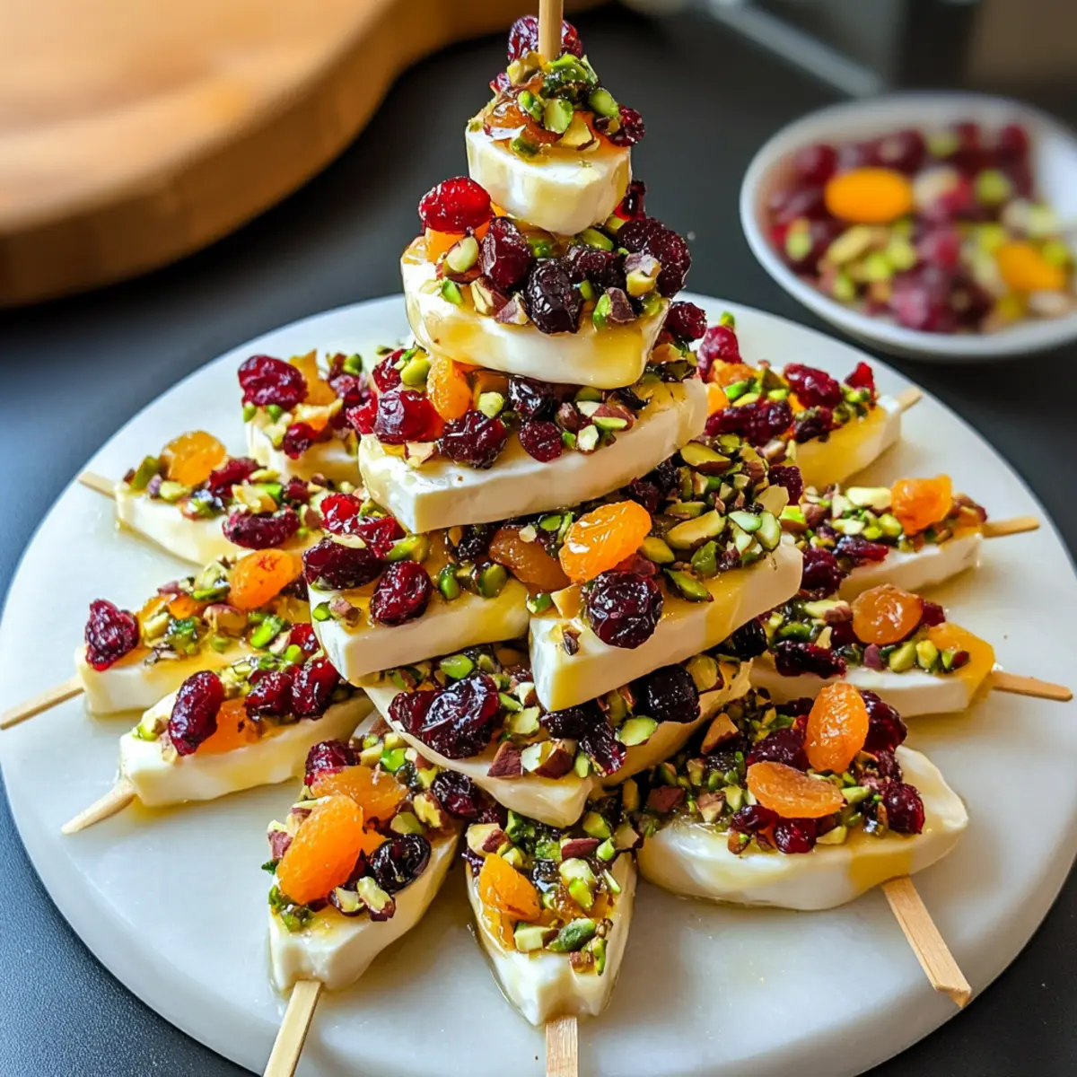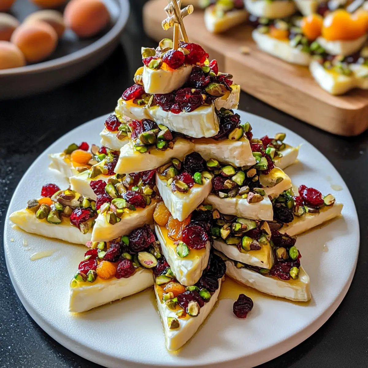 Die festliche Jahreszeit bringt oft das Bedürfnis mit sich, etwas Besonderes auf den Tisch zu zaubern. Wenn ich meine Gäste mit einer schnellen und einfachen Speise überraschen möchte, greife ich zu meinen Mini-Brie-Weihnachtsbäumen. Diese kleinen Kunstwerke aus cremigem Brie, knackigen Nüssen und süßen Trockenfrüchten sind nicht nur ein Blickfang, sondern auch eine wahre Gaumenfreude. Perfekt für jede Feierlichkeit, lassen sie sich im Handumdrehen zubereiten und bereichern jedes Buffet mit ihrer eleganten Präsentation. Wer könnte da widerstehen? Bereit, die Küchenwerkzeuge zu schwingen und einen festlichen Genuss zu kreieren, der lange in Erinnerung bleibt? Warum werden Sie Mini-Brie-Weihnachtsbäume lieben? Einfachheit ist der Schlüssel: Diese Vorspeise erfordert keine komplizierten Techniken und ist in kürzester Zeit zubereitet. Atemberaubende Präsentation: Die Mini-Brie-Weihnachtsbäume sind nicht nur lecker, sondern auch optisch ein Hit auf Ihrem Tisch. Vielseitig in der Gestaltung: Tauschen Sie Nüsse oder Trockenfrüchte nach Ihrem Geschmack aus, um Ihre eigene Note hinzuzufügen. Zufriedenstellender Genuss: Die Kombination aus cremigem Brie und knackigem Topping sorgt für einen unverwechselbaren Geschmack. Und das Beste? Sie können sie im Voraus zubereiten und somit mehr Zeit mit Ihren Gästen verbringen. Genießen Sie diese festlichen Leckereien als Teil eines schmackhaften Käsebretts oder servieren Sie sie einfach mit Crackern – der perfekte Genuss für jede Feierlichkeit! Mini-Brie-Weihnachtsbäume Zutaten Hinweis: Diese Zutatenliste bietet alles, was Sie für köstliche Mini-Brie-Weihnachtsbäume benötigen. Für die Basis Mini runder Brie (125 Gramm) – Cremige Grundlage, die Sie auch durch normalen Brie oder Camembert ersetzen können. Schwarzer Pfeffer – Verstärkt die Aromen; verwenden Sie frisch gemahlenen Pfeffer für das beste Aroma. Für die Toppings ¼ Tasse getrocknete Cranberries (30 Gramm) – Gibt Süße und Textur. 4 getrocknete Aprikosen – Bringt natürliche Süße und einen zähen Biss. ¼ Tasse geschälte Pistazien (25 Gramm) – Für einen knackigen, nussigen Geschmack; alternativ können Sie auch Mandeln oder Walnüsse verwenden. ¼ Tasse frischer Koriander (5 Gramm, locker gepackt) – Für Frische und kräuterige Noten; kann durch Petersilie ersetzt werden. Zum Verfeinern Honig – Ein süßer Tropfen, der die visuellen und geschmacklichen Elemente hebt; heißer Honig fügt einen zusätzlichen Kick hinzu. Nutzen Sie diese Zutaten, um Ihre eigenen festlichen Mini-Brie-Weihnachtsbäume zu kreieren, die nicht nur lecker sind, sondern auch ein echter Hingucker auf Ihrem Tisch werden! Schritt-für-Schritt-Anleitungen für Mini-Brie-Weihnachtsbäume Step 1: Zutaten vorbereiten Zuerst fein hacken Sie die getrockneten Cranberries, getrockneten Aprikosen, Pistazien und den frischen Koriander. Arbeiten Sie sorgfältig, um gleichmäßige Stücke zu erzeugen, die sich gut auf dem Brie verteilen lassen. Geben Sie die gehackten Zutaten in eine Schüssel und stellen Sie sie beiseite, während Sie mit dem Brie fortfahren. Step 2: Brie schneiden Halbieren Sie den Mini-Brie horizontal mit einem scharfen Messer. Teilen Sie jede Hälfte in Viertel und dann in Achtel, sodass Sie insgesamt 16 gleich große Stücke erhalten. Achten Sie darauf, die Schnitte gleichmäßig zu machen, damit die Mini-Brie-Weihnachtsbäume gleichmäßig aussehen. Legen Sie die Wedges vorsichtig auf ein Schneidebrett. Step 3: Mini-Brie-Wedges aufspießen Nehmen Sie einen Zahnstocher und stecken Sie ihn in jedes Brie-Stück bis zur Mitte. Dies gibt Ihnen auch einen schönen Griff zum Halten und Dippen. Achten Sie darauf, dass die Zahnstocher fest sitzen, damit die Mini-Brie-Weihnachtsbäume stabil bleiben, wenn Sie sie dippen und servieren. Step 4: Brötchen in die Mischung tauchen Tauchen Sie jedes Brie-Wedge in die vorbereitete Mischung aus gehackten Zutaten. Rollen Sie das Wedge sanft, um sicherzustellen, dass es gleichmäßig bedeckt ist. Diese Kombination von Aromen wird Ihren Mini-Brie-Weihnachtsbäumen eine bezaubernde Fülle an Textur und Geschmack verleihen. Step 5: Ruhen lassen Legen Sie die bedeckten Brie-Stücke auf eine Teller oder in einen Behälter mit Deckel und stellen Sie sie für mindestens 1 Stunde in den Kühlschrank. Dadurch können die Aromen durchziehen und der Brie festigt sich, was das Servieren erleichtert. Dies ist ein wichtiger Schritt, um die Mini-Brie-Weihnachtsbäume zum Höhepunkt jeder Feiertagsfeier zu machen. Step 6: Garnieren und servieren Kurz bevor Sie die Mini-Brie-Weihnachtsbäume servieren, bestreuen Sie sie großzügig mit frisch gemahlenem schwarzem Pfeffer und träufeln Sie etwas Honig darüber. Diese finale Garnitur bringt nicht nur Geschmack, sondern verleiht den Bäumen auch einen appetitlichen Glanz. Der süße Honig harmoniert perfekt mit dem cremigen Brie und den knackigen Toppings. Expertentipps für Mini-Brie-Weihnachtsbäume Vorbereitung ist alles: Bereiten Sie die Mini-Brie-Weihnachtsbäume bis zu einem Tag im Voraus vor, um Zeit zu sparen und den Geschmack zu intensivieren. Käsewahl: Achten Sie darauf, dass der Brie nicht zu lange im Kühlschrank bleibt. Servieren Sie ihn innerhalb weniger Stunden nach der Kühlung, um die beste Textur zu gewährleisten. Dips richtig auftragen: Tauchen Sie die Brie-Stücke gleichmäßig in die gehackte Mischung, um ein ausgewogenes Verhältnis von Geschmack und Textur zu garantieren. Variationen ausprobieren: Fühlen Sie sich frei, Nüsse oder Trockenfrüchte nach Ihrem Geschmack auszutauschen, um einzigartige Mini-Brie-Weihnachtsbäume zu kreieren, die gut ankommen. Kreative Präsentation: Stellen Sie die Mini-Brie-Weihnachtsbäume auf einem dekorativen Teller an, um die festliche Atmosphäre zu unterstreichen und Ihre Gäste zu beeindrucken. Mini-Brie-Weihnachtsbäume Variationen Lassen Sie Ihrer Kreativität freien Lauf und passen Sie diese köstlichen Mini-Brie-Weihnachtsbäume ganz 