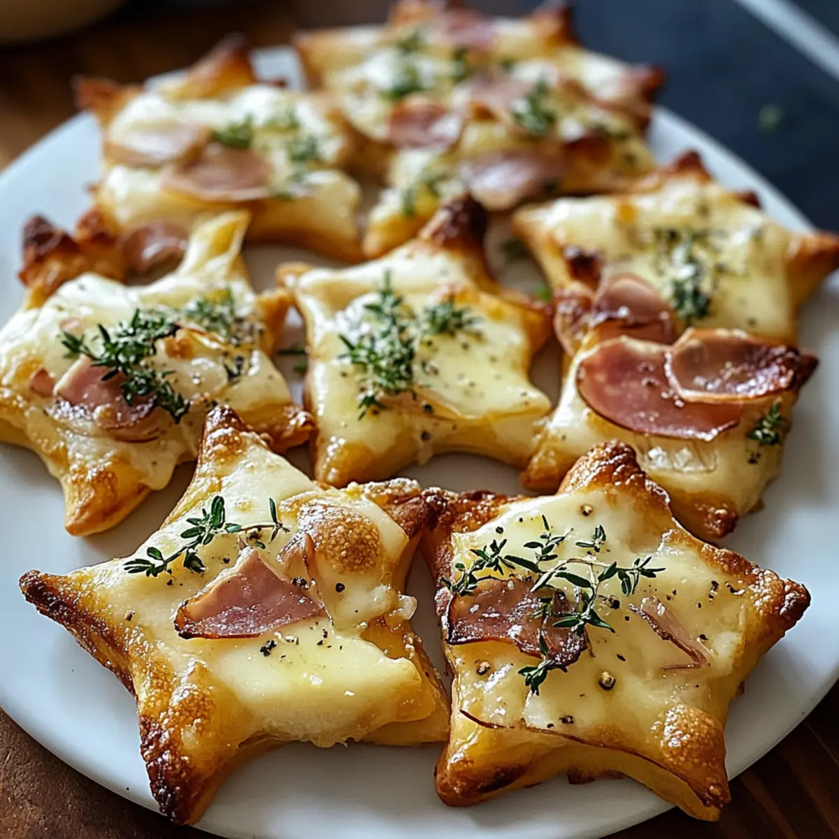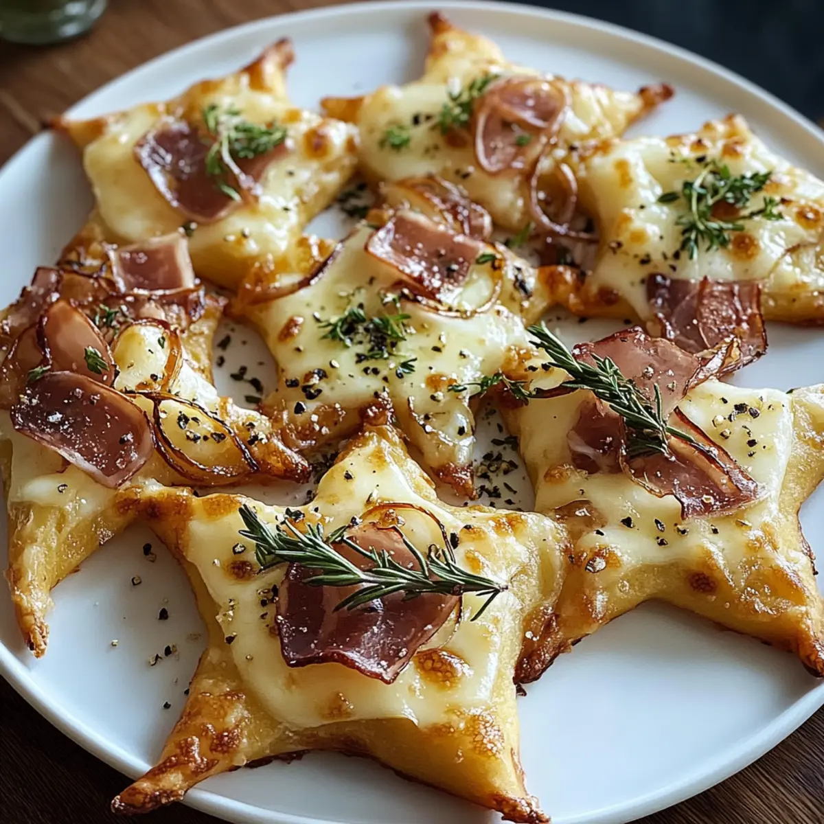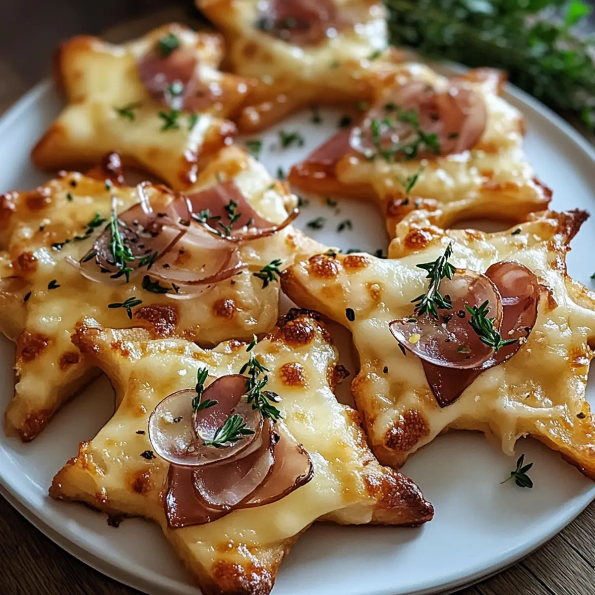 Stellen Sie sich vor, Sie genießen eine festliche Runde mit Freunden, während der verführerische Duft von frisch gebackenem Flammkuchen durch den Raum zieht. Diese Mini Flammkuchen Sterne sind nicht nur ein Augenschmaus, sondern auch das perfekte Partyessen! Mit ihrem knusprigen Boden und der cremigen Mischung aus Schmand und Frischkäse, kombiniert mit herzhaftem Speck und süßen Zwiebeln, sind sie die ideale Abwechslung zu herkömmlichen Snacks. Das Beste: Sie sind im Handumdrehen zubereitet und lassen sich ganz nach Ihrem Geschmack variieren. Egal, ob Sie sie für einen besonderen Anlass oder einfach nur zum Genießen zubereiten – diese kleinen Sterne werden garantiert zum Highlight auf jeder Feier. Was wäre Ihre Lieblingskombination für die Füllung? Warum werden Sie Mini Flammkuchen Sterne lieben? Schnelligkeit und Einfachheit: Die Zubereitung ist unkompliziert und benötigt nur wenige Zutaten, ideal für spontane Zusammenkünfte. Vielseitige Variationen: Passen Sie die Toppings nach Lust und Laune an – von vegetarisch bis herzhaft – und überraschen Sie Ihre Gäste immer wieder. Perfekte Portionsgröße: Die kleinen Sterne sind handlich und eignen sich hervorragend als Fingerfood für Parties oder gemütliche Abende. Himmlischer Geschmack: Der knusprige Boden und die cremige Füllung harmonieren perfekt und sorgen für ein unvergleichliches Geschmackserlebnis. Beeindruckende Präsentation: Mit ihrer ansprechenden Form sind diese Snacks ein wahrer Blickfang auf jedem Buffet. Holen Sie sich weitere Inspirationen für festliche Anlässe mit diesen leckeren Peasy Mini Halloween Snacks! Mini Flammkuchen Sterne Zutaten Hinweis: All diese Zutaten tragen zu einem unvergesslichen Geschmackserlebnis bei den Mini Flammkuchen Sterne bei! Für den Teig Flammkuchenteig – Ideal für die Basis. Benutzen Sie fertigen Teig für noch mehr Zeitersparnis. Für die Füllung Schmand – Sorgt für eine cremige Textur. Kann durch saure Sahne ersetzt werden. Speckwürfel – Liefert den herzhaften Geschmack. Vegetarische Alternativen können verwendet werden. Zwiebel – Fügt beim Kochen eine süße Note hinzu. Optional für diejenigen, die keine Zwiebeln mögen. Frischkäse – Verstärkt die Cremigkeit. Nutzen Sie fettarmen Frischkäse für eine gesündere Variante. Für den Belag Gouda (gerieben) – Gibt einen köstlichen Käsegeschmack und eine goldene Kruste. Jedes schmelzende Käseprodukt kann ebenfalls verwendet werden. Frischer Rosmarin – Aromatische Kräuter für zusätzlichen Geschmack. Thyme oder Oregano sind ebenfalls gute Alternativen. Salz und Pfeffer – Unverzichtbar für die Würze. Passen Sie die Menge je nach Vorlieben an. Schritt-für-Schritt-Anleitung für Mini Flammkuchen Sterne Step 1: Ofen vorheizen Heizen Sie den Ofen auf 200°C (Ober-/Unterhitze) vor. Dies ist ein wichtiger Schritt, um sicherzustellen, dass die Mini Flammkuchen Sterne gleichmäßig garen und eine knusprige Basis erhalten. Während der Ofen aufheizt, haben Sie Zeit, die anderen Zutaten vorzubereiten. Step 2: Teig ausrollen und ausstechen Rollen Sie den Flammkuchenteig gleichmäßig auf einem Backblech aus, das mit Backpapier ausgelegt ist. Verwenden Sie einen Ausstecher oder ein Messer, um Sterne aus dem Teig auszuschneiden. Achten Sie darauf, dass die Sterne gleichmäßig dick sind, damit sie gleichmäßig backen. Step 3: Füllung anrühren Mischen Sie in einer Schüssel den Schmand und den Frischkäse miteinander. Fügen Sie Salz und Pfeffer nach Geschmack hinzu. Diese cremige Mischung bildet die Basis für den Belag der Mini Flammkuchen Sterne und sorgt für einen herrlichen Geschmack. Step 4: Sterne belegen Verteilen Sie die Schmand-Frischkäsemischung gleichmäßig auf den ausgestochenen Sternen. Lassen Sie dabei einen kleinen Rand frei, damit sie beim Backen nicht überlaufen. Dies trägt zur perfekten Präsentation der Mini Flammkuchen Sterne bei. Step 5: Zwiebeln und Speck hinzufügen Geben Sie die Zwiebelringe und die Speckwürfel gleichmäßig über die bestrichenen Sterne. Achten Sie darauf, sie nicht zu überladen, damit die Mini Flammkuchen Sterne knusprig bleiben und die verschiedenen Aromen zur Geltung kommen. Step 6: Mit Käse und Kräutern bestreuen Streuen Sie den geriebenen Gouda und den frischen Rosmarin großzügig über die belegten Sterne. Diese Zutaten werden beim Backen zu einer köstlichen, goldenen Kruste, die den Mini Flammkuchen Sternen den letzten Schliff verleiht. Step 7: Backen Schieben Sie das Backblech in den vorgeheizten Ofen und backen Sie die Mini Flammkuchen Sterne für 10-12 Minuten, bis die Ränder goldbraun sind. Achten Sie darauf, sie im Auge zu behalten, damit sie nicht verbrennen – das Endergebnis sollte knusprig und köstlich sein. Lagerungstipps für Mini Flammkuchen Sterne Raumtemperatur: Frisch gebackene Mini Flammkuchen Sterne sollten nicht länger als 2 Stunden bei Raumtemperatur stehen gelassen werden, um ihre Knusprigkeit zu bewahren. Kühlschrank: Gekühlte Reste können bis zu 3 Tage im Kühlschrank aufbewahrt werden. Lagern Sie die Sterne in einem luftdichten Behälter, um Feuchtigkeitsverlust zu verhindern. Gefrierschrank: Sie können die Mini Flammkuchen Sterne bis zu 3 Monate einfrieren. Wickeln Sie sie gut in Frischhaltefolie und lagern Sie sie in einem Gefrierbeutel, um Gefrierbrand zu vermeiden. Aufwärmen: Zum Aufwärmen können die gefrorenen Sterne direkt im vorgeheizten Ofen für etwa 10 Minuten gebacken werden, bis sie wieder knusprig sind. Meal Prep für Mini Flammkuchen Sterne Die Mini Flammkuchen Sterne sind perfekt für die Vorbereitung im Voraus! Sie können die Sterne aus Flammkuchenteig bis zu 24 Stunden im Voraus ausstechen und auf einem Backblech im Kühlschrank aufbewahren, um die Zubereitung zu erleichtern. Ebenso kann die Schmand-Frischkäse-Mischung bis zu 3 Tagen im Voraus zubereitet und luftdicht verschlossen gelagert werden, damit sie frisch bleibt. Achten Sie darauf, die Toppings erst kurz vor dem Backen hinzuzuf