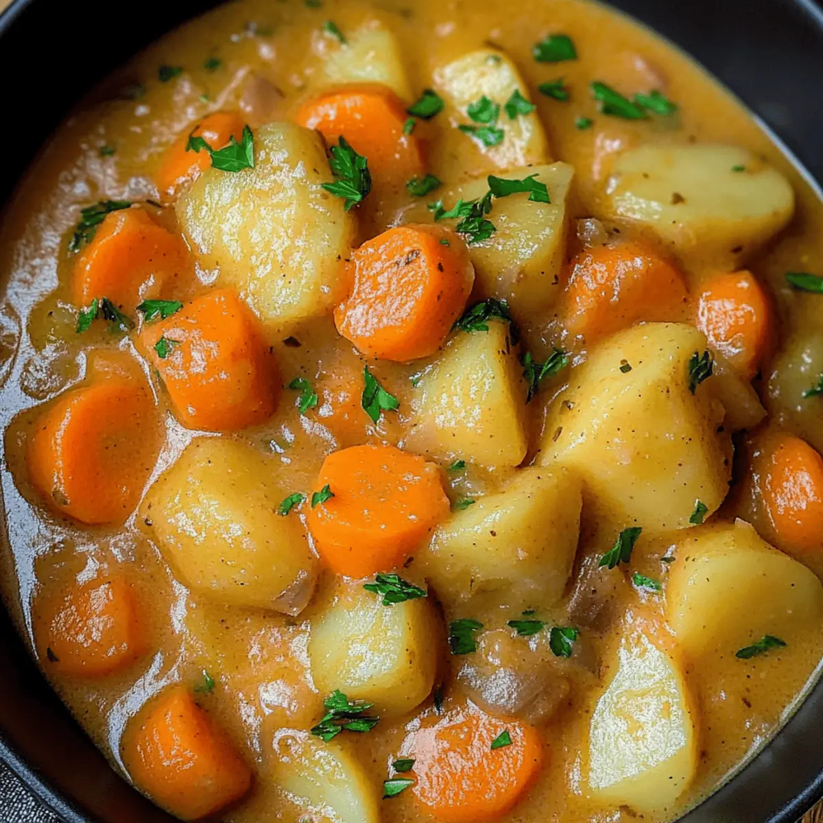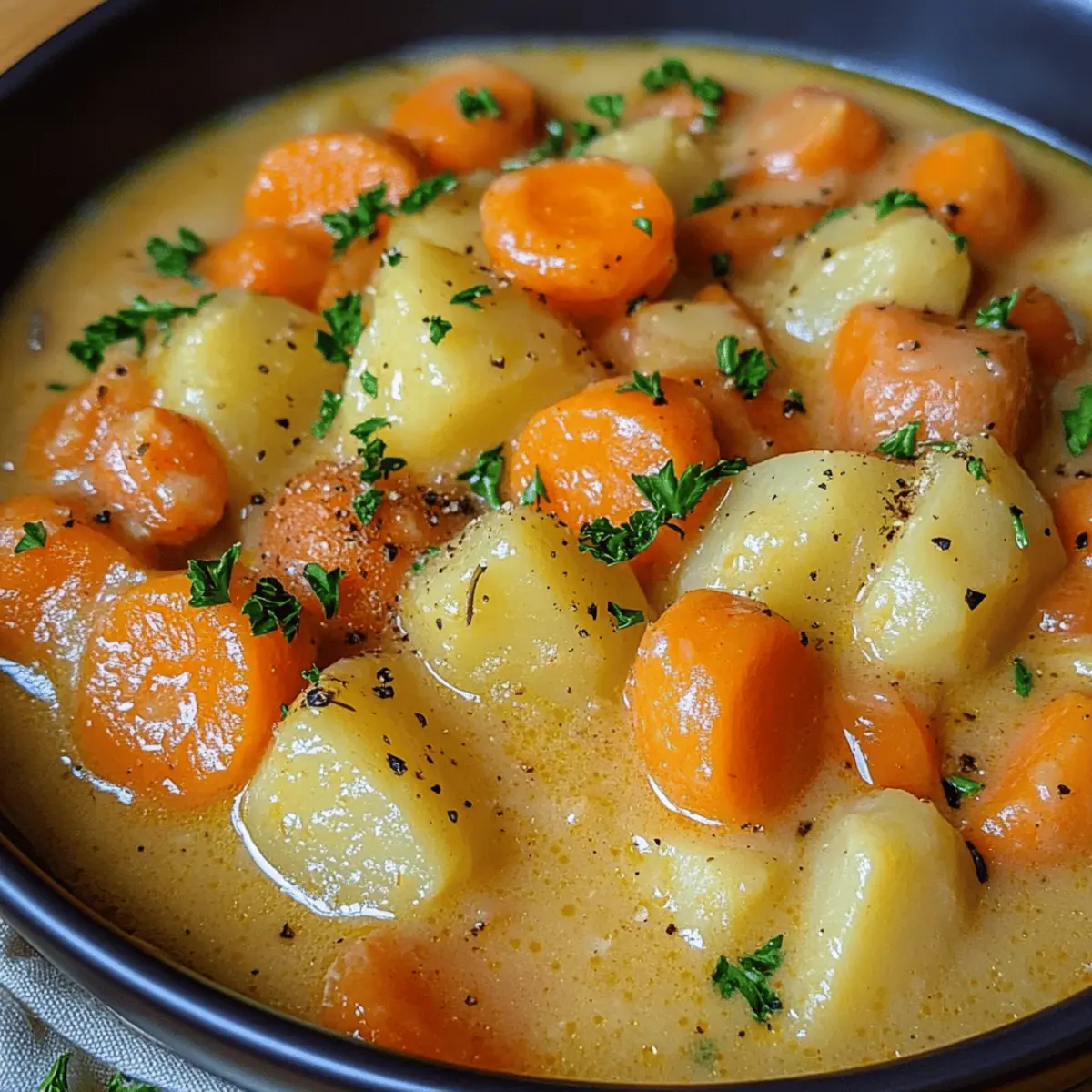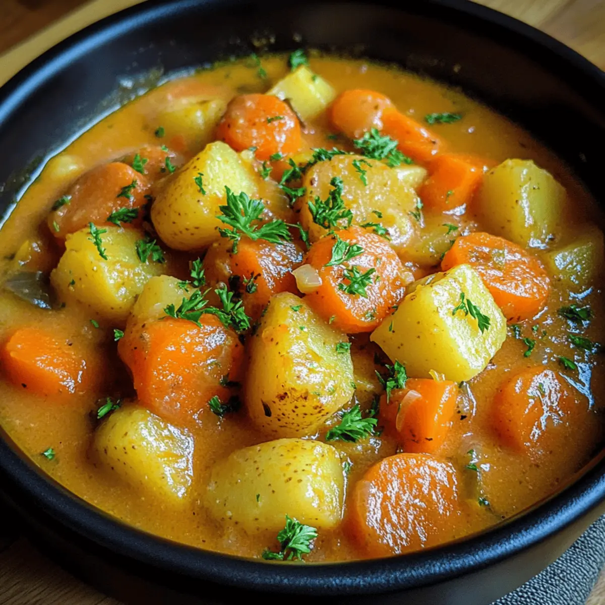 Als ich kürzlich mit einer dampfenden Schüssel Mohren und Kartoffel Eintopf in der Hand an einem kalten Abend saß, wurde mir bewusst, wie sehr dieses Gericht Trost und Wärme in unser Zuhause bringt. Diese herzhafte Kombination aus süßen Möhren und robusten Kartoffeln, die in einer cremigen Brühe köcheln, ist nicht nur ein Genuss für die Seele, sondern auch schnell zubereitet – perfekt für hektische Wochentage oder gemütliche Familientreffen. Egal, ob Sie ein Fleischliebhaber sind oder die vegetarische Variante bevorzugen, dieser Eintopf ist anpassungsfähig und sorgt immer für Begeisterung am Tisch. Sind Sie bereit, das Rezept zu entdecken und Ihre Liebsten mit einem köstlichen, nahrhaften Gericht zu verwöhnen? Warum ist dieser Eintopf so besonders? Vielfalt: Der Mohren und Kartoffel Eintopf ist unglaublich anpassungsfähig und kann leicht zu einer vegetarischen oder veganen Variante umgewandelt werden. Einfache Zubereitung: Die Schritte sind unkompliziert und benötigen keine besonderen Kochfähigkeiten, sodass Sie in kurzer Zeit Genuss auf den Tisch bringen können. Herzhafter Geschmack: Die Kombination aus süßen Möhren und cremigen Kartoffeln sorgt für eine überaus leckere und befriedigende Mahlzeit, die die ganze Familie begeistert. Perfekter Komfort: An kalten Tagen lässt sich dieser Eintopf als warmes, wohltuendes Gericht genießen, das die Seele wärmt. Gesund und nahrhaft: Mit frischen Zutaten wie Karotten und Gemüsebrühe liefert dieser Eintopf viele Vitamine. Entdecken Sie auch unsere Tipps für Vegetarische Varianten oder wie Sie diesen Eintopf gut lagern können! Mohren und Kartoffel Eintopf Zutaten • Hinweis: Für ein perfektes Ergebnis, verwenden Sie frische Zutaten für Ihren Mohren und Kartoffel Eintopf! Für den Eintopf Möhren – sorgen für natürliche Süße; verwenden Sie frische, junge Möhren für den besten Geschmack. Kartoffeln – bringen Fülle und Cremigkeit; können durch Pastinaken für eine interessante Variante ersetzt werden. Zwiebel – aromatische Basis für Geschmack; alternative Verwendung von Schalotten für einen milden Geschmack. Mettenden – geben eine herzhafte Tiefe; ersetzen Sie sie durch vegetarische Würstchen oder lassen Sie sie für eine vegane Option weg. Butter – zum Anbraten der Zwiebeln; kann durch Olivenöl für vegane Variationen ersetzt werden. Gemüsebrühe – die Hauptflüssigkeit für das Kochen; sowohl hausgemacht als auch gekauft sind geeignet. Sahne – verleiht dem Eintopf eine cremige Konsistenz; ersetzen Sie sie durch pflanzliche Sahne für eine leichtere oder vegane Version. Salz – verbessert den gesamten Geschmack; je nach Bedarf anpassen. Muskatnuss – fügt Wärme und Tiefe hinzu; frisch gerieben sorgt für einen intensiveren Geschmack. Petersilie – frisches Kraut zum Garnieren; experimentieren Sie mit anderen Kräutern wie Thymian oder Dill für unterschiedliche Geschmäcker. Step-by-Step Instructions for Mohren und Kartoffel Eintopf Step 1: Gemüse vorbereiten Schälen und schneiden Sie die Möhren in gleichmäßige Runden, würfeln Sie die Kartoffeln und hacken Sie die Zwiebel fein. Achten Sie darauf, dass alles gleichmäßig geschnitten ist, um eine gleichmäßige Garzeit zu gewährleisten. Legen Sie das geschnittene Gemüse beiseite, während Sie den nächsten Schritt vorbereiten. Step 2: Zwiebeln anbraten Erhitzen Sie in einem großen Topf bei mittlerer Hitze die Butter. Geben Sie die Zwiebeln hinein und dünsten Sie sie für etwa 2-3 Minuten, bis sie glasig sind. Rühren Sie regelmäßig um, um ein Anbrennen zu vermeiden. Dieser Schritt entwickelt die grundlegenden Aromen für Ihren Mohren und Kartoffel Eintopf. Step 3: Möhren und Kartoffeln anbraten Fügen Sie die geschnittenen Möhren und Kartoffeln in den Topf hinzu und braten Sie diese für weitere 2 Minuten leicht an. Rühren Sie gelegentlich um, damit das Gemüse gleichmäßig gegart wird. Dies hilft, die Aromen zu intensivieren, bevor Sie die Brühe hinzufügen. Step 4: Brühe hinzufügen und köcheln Gießen Sie die Gemüsebrühe in den Topf, sodass das Gemüse gut bedeckt ist. Erhöhen Sie die Hitze, um die Mischung zum Kochen zu bringen, und reduzieren Sie dann die Hitze, um sie sanft 30 Minuten lang köcheln zu lassen. Das Gemüse sollte zart sein, wenn es fertig ist, und die Aromen sich gut verbunden haben. Step 5: Würzen und verfeinern Sobald das Gemüse weich ist, würzen Sie den Eintopf mit Salz und frisch geriebener Muskatnuss nach Geschmack. Rühren Sie dann die gehackte Petersilie und die Sahne ein, um dem Eintopf eine cremige Konsistenz zu verleihen. Für eine dickere Struktur können Sie die Mischung teilweise mit einem Kartoffelstampfer zerdrücken. Step 6: Mettenden hinzufügen und servieren Fügen Sie die geschnittenen Mettenden hinzu und lassen Sie den Eintopf nochmal aufwärmen, bis die Wurst heiß ist. Prüfen Sie die Konsistenz und die Würze des Mohren und Kartoffel Eintopf, bevor Sie ihn heiß servieren. Genießen Sie dieses herzliche Gericht aus der deutschen Küche besonders an kalten Tagen! Lagerungstipps für Mohren und Kartoffel Eintopf Raumtemperatur:: Lassen Sie den Eintopf nicht länger als 2 Stunden bei Raumtemperatur stehen, um die Lebensmittelsicherheit zu gewährleisten. Kühlschrank:: Bewahren Sie den Mohren und Kartoffel Eintopf in einem luftdichten Behälter im Kühlschrank auf, wo er bis zu 3 Tage frisch bleibt. Gefrierschrank:: Der Eintopf kann portionsweise für bis zu 3 Monate eingefroren werden. Achten Sie darauf, ihn in gefriersicherer Verpackung zu lagern, um Gefrierbrand zu vermeiden. Wiedererwärmen:: Erwärmen Sie den Eintopf langsam auf dem Herd oder in der Mikrowelle. Fügen Sie einen Schuss Brühe oder Wasser hinzu, falls die Konsistenz zu dick erscheint. Perfekte Vorbereitungen für Ihren Mohren und Kartoffel Eintopf Der Mohren und Kartoffel Eintopf ist ideal für die Vorbereitung im Voraus – perfekt für beschäftigte Wochen! Sie können die Möhren (in Scheiben gesc