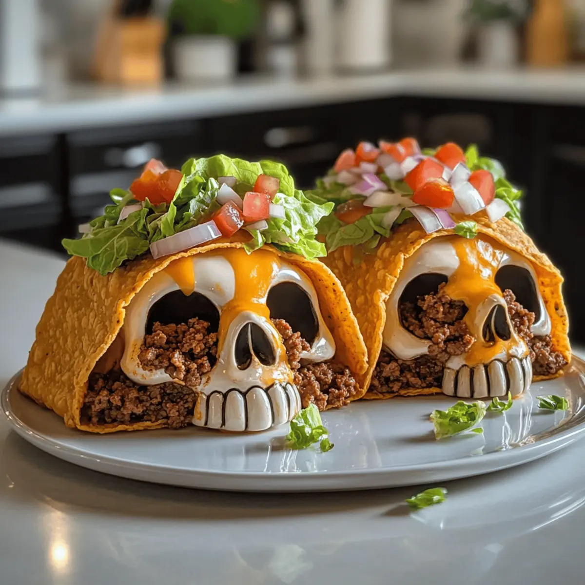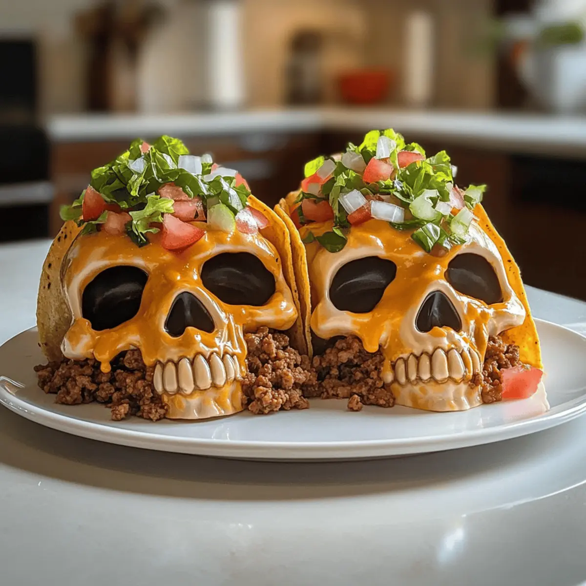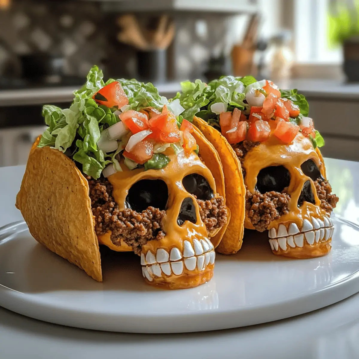 Kaum zu glauben, dass man aus Tacos schaurig-schöne Monster machen kann! Diese Monster Taco Schädel Vorspeise ist der perfekte Hingucker für jede Halloween-Feier oder festliche Zusammenkunft. Mit knusprigen Taco-Schalen, die mit würzigem Hackfleisch und schmelzendem Käse gefüllt sind, bringt dieses Rezept nicht nur Spaß auf die Platten, sondern ist auch unheimlich einfach zuzubereiten. Du kannst die Füllung ganz nach deinem Geschmack anpassen und dabei zum Beispiel auf Pute oder Hähnchen zurückgreifen. Diese herzhaften Snacks sind nicht nur ein wahrer Genuss, sondern auch ein echter Stimmungsmacher bei deinen Gästen. Bist du bereit, deinen Gaumen auf ein Abenteuer zu schicken? Warum wirst du dieses Rezept lieben? Einzigartige Präsentation: Diese Monster Taco Schädel Vorspeise sorgt für Gesprächsstoff auf jeder Feier! Einfache Zubereitung: Mit minimalem Aufwand zauberst du schaurige Leckerbissen, die deine Gäste begeistern. Vielfältige Füllungen: Ob Hackfleisch, Truthahn oder sogar Hähnchen – die Wahl liegt ganz bei dir! Knusprige Textur: Die Taco-Schalen garantieren einen perfekten Crunch, der das Geschmackserlebnis abrundet. Perfekt für jeden Anlass: Ob Halloween oder ein einfaches Grillfest, diese Tacos sind immer ein Erfolg! Bereite sie vor und genieße die Komplimente. Monster Taco Schädel Zutaten • Die perfekte Mischung für schaurige Tacos! Für die Füllung Hackfleisch – sorgt für die herzhafte Proteinbasis; ersetze es durch Putenfleisch für eine leichtere Option. Taco-Gewürz – fügt die essentielle Würze hinzu; bereite eine eigene Mischung für einen persönlichen Touch zu. Geriebener Käse – schmilzt wunderbar in den Tacos und erhöht die Reichhaltigkeit; verwende Pepper Jack für einen scharfen Kick. Für die Taco-Schalen Taco-Schalen – bilden die knusprige äußere Struktur; für eine weichere Textur wähle Tortillas. Für die Toppings Gehackter Salat, Tomaten und Zwiebeln – frische Beläge für zusätzlichen Crunch; passe die Zutaten nach deinem Geschmack an. Sauerrahm und Salsa – Garnituren, die Cremigkeit und Säure hinzufügen; Jalapeño-Salsa bringt Schärfe für Liebhaber des Feurigen. Mit diesen Zutaten bist du bereit, die Monster Taco Schädel Vorspeise zuzubereiten und ein unvergessliches Erlebnis für deine Gäste zu schaffen! Schritt-für-Schritt-Anleitung für Monster Taco Schädel Vorspeise Step 1: Ofen vorheizen Heize den Ofen auf 175°C (350°F) vor, damit die Monster Taco Schädel Vorspeise später schön knusprig läuft. Während der Ofen aufheizt, kannst du die Vorbereitung für die Füllung in Angriff nehmen. Eine vorgeheizte Umgebung sorgt dafür, dass die Taco-Schalen gleichmäßig gebacken werden und den perfekten Crunch erhalten. Step 2: Hackfleisch anbraten Erhitze eine Pfanne bei mittlerer Hitze und gib das Hackfleisch hinein. Brate es für etwa 8-10 Minuten an, bis es gleichmäßig gebräunt ist. Füge dann das Taco-Gewürz hinzu und mische alles gründlich, bis das Fleisch gut gewürzt und aromatisch ist. Dies gibt deiner Monster Taco Schädel Vorspeise den herzhaften Geschmack, den jeder liebt. Step 3: Taco-Schalen füllen Fülle die Taco-Schalen gleichmäßig mit der Hackfleischmischung und streue geriebenen Käse darüber. Drücke die Schalen leicht zusammen, damit die Füllung gut Platz findet und die Form der Monster Schädel erhalten bleibt. Achte darauf, nicht zu viel Füllung zu verwenden, damit sie beim Backen nicht auslaufen. Step 4: In die Schädelformen legen Nimm die gefüllten Taco-Schalen und drücke sie vorsichtig in die Schädel-Backformen. Achte darauf, dass sie gut in der Form sitzen, um die charakteristische Gestalt zu bekommen. Jetzt sind die Monster Taco Schädel bereit für den Ofen! Step 5: Backen Backe die gefüllten Taco-Schalen für etwa 15 Minuten im vorgeheizten Ofen, bis sie goldbraun und knusprig sind. Du wirst sehen, wie der Käse schmilzt und die Taco-Schalen schön knusprig werden, was eine wunderbare Textur für deine Monster Taco Schädel Vorspeise ergibt. Step 6: Abkühlen lassen Lass die gebackenen Monster Taco Schädel für etwa 5 Minuten abkühlen, bevor du sie vorsichtig aus den Formen nimmst. Dies hilft, die Schädel intakt zu halten und erleichtert das Entfernen aus den Formen. Achte darauf, das richtige Timing zu wählen, damit sie nicht zu heiß sind. Step 7: Anrichten und garnieren Serviere die Monster Taco Schädel warm auf einer Platte, dekoriert mit frischem Salat, gehackten Tomaten und Zwiebeln. Kröne die Mischung mit einem Klecks Sauerrahm und einem Spritzer Salsa für einen zusätzlichen Geschmacksboost. Deine Gäste werden begeistert sein von dieser unkomplizierten und schaurigen Vorspeise! Monster Taco Schädel Vorspeise Variationen Fühl dich frei, dein Rezept für die Monster Taco Schädel nach deinen Wünschen zu individualisieren und neue Geschmäcker auszuprobieren! Hühnchen: Ersetze das Hackfleisch durch zartes, shredded Hühnchen für eine leichtere Variante. Diese Option bringt eine neue Textur in deine Tacos. Vegetarisch: Nutze schwarze Bohnen oder Linsen als pflanzliche Proteinquelle, um diese Vorspeise noch gesünder zu machen. So können auch vegetarische Gäste mitfeiern! Vegan: Verwende veganen Käse und skippe den Sauerrahm, um die ganze Vorspeise komplementär zu gestalten. Du kannst sogar Cashew-Sauerrahm für einen cremigen Genuss verwenden. Scharf: Füge gewürfelte Jalapeños oder eine scharfe Salsa hinzu, um den Tacos einen feurigen Kick zu verleihen. Ein absoluter Genuss für Liebhaber von scharfen Speisen! Fruchtig: Verfeinere die Toppings mit frischen Ananasstücken oder Mango-Salsa, um eine süß-säuerliche Note zu erhalten. Diese Mischung bringt Farbe auf den Tisch! Käsevielfalt: Mische verschiedene Käsesorten, wie Gouda und Monterey Jack, um eine abwechslungsreiche Geschmacksexplosion zu kreieren. Der Käse fördert den cremigen Genuss. Knusprige Toppings: Experimentiere mit knusprigen Tortilla-Chips oder crispy Onions für e