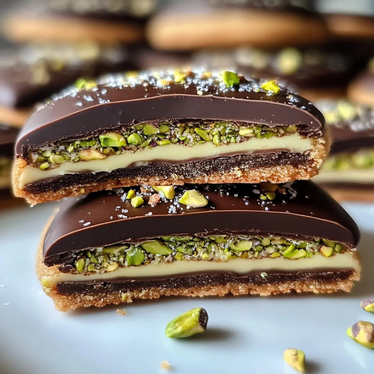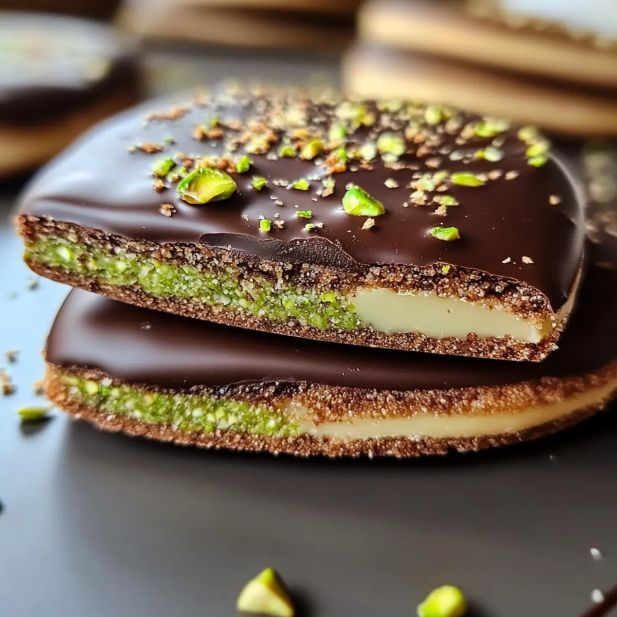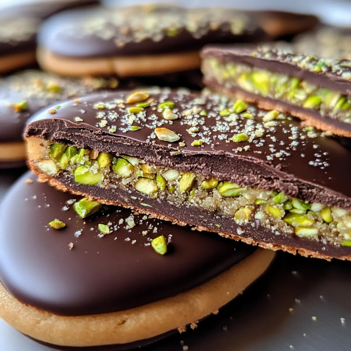 7. Die dunkle Schokolade schmelzen und gleichmäßig über die Kekse gießen. Mit gehackten Pistazien bestreuen und die Schokolade fest werden lassen.