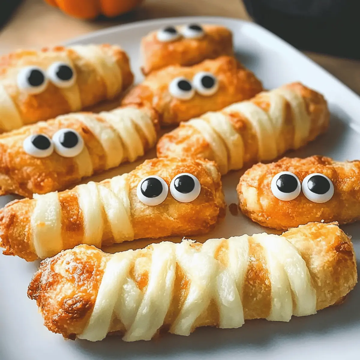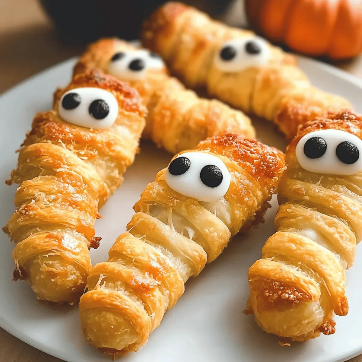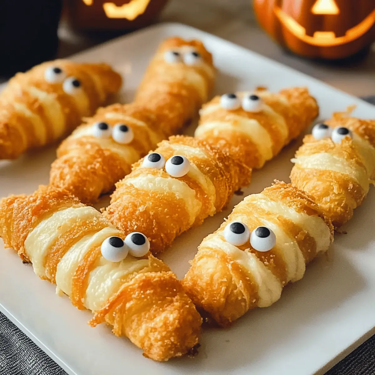 Es war einmal eine gruselige Halloween-Feier, bei der ich nach einem originellen Snack suchte, der sowohl Kinder als auch Erwachsene begeistern könnte. Genau in diesem Moment kamen die Mummy Mozzarella Sticks ins Spiel! Diese köstlichen Häppchen vereinen die cremige Schmelztextur von Mozzarella mit dem knusprigen Biss von Croissantteig und verwandeln sich in eine lustige, festliche Leckerei. Die Zubereitung ist spielend einfach und schnell, sodass sie perfekt für jede Art von Zusammenkunft sind. Dein Publikum wird begeistert sein, während sie die „Mumis“ mit bunten Zuckeraugen anstarren und sich auf den ersten Biss freuen. Bereit, deine Gäste mit diesen unwiderstehlichen Snacks zu überraschen? Lass uns gemeinsam in die Zubereitung eintauchen! Warum sind Mummy Mozzarella-Sticks ein Hit? Einfachheit: Diese Mummy Mozzarella-Sticks sind im Handumdrehen zubereitet, selbst für Kochanfänger! Vielfältig: Du kannst mit verschiedenen Käsesorten experimentieren, wie Cheddar oder Pfefferoni-Käse, um deinem Snack einen persönlichen Touch zu verleihen. Festlich: Die süßen Zuckeraugen bringen nicht nur Kinderaugen zum Leuchten, sondern machen auch deine Halloween-Party unvergesslich. Köstlich: Mit dem perfekten Crunch von Croissantteig und dem schmelzenden Käseinneren ist jeder Biss ein Genuss. Vorratsfähig: Bereite sie im Voraus vor und backe sie frisch, wann immer du magst – ideal für spontane Gäste! Wenn du nach einem einfachen und doch beeindruckenden Snack suchst, sind unsere Mummy Mozzarella-Sticks genau das Richtige. Mummy Mozzarella-Sticks Zutaten Für den Käse • Mozzarella-String Käse-Sticks – Sie sorgen für das schmelzige, gooey Innenleben; ideal sind String Cheese oder andere Mozzarella-Varianten. Für den Teig • Kühlregal-Croissant-Teig – Die perfekte äußere Schicht, die einen knusprigen Biss bietet; du kannst auch Blätterteig verwenden, wenn du eine andere Textur möchtest. Für die Dekoration • Zuckeraugen – Sie verleihen den Sticks einen festlichen und lustigen Look; wähle verschiedene Farben für besondere Anlässe. Diese Mummy Mozzarella-Sticks sind nicht nur gruselig und köstlich, sondern auch ein Hit auf jeder Halloween-Feier! Schritt-für-Schritt-Anleitung für Mumi Mozzarella-Sticks Step 1: Käse einfrieren Lege die Mozzarella-String-Käse-Sticks für 2 bis 4 Stunden in das Gefrierfach. Dies hilft, die Sticks zu festigen, damit sie beim Backen nicht schmelzen. Achte darauf, dass die Käse-Sticks gut eingefroren sind, um die perfekte Konsistenz für deine Mumi Mozzarella-Sticks zu erreichen. Step 2: Ofen vorheizen Heize deinen Ofen auf 190°C vor. Dies ist wichtig, damit die Mumi Mozzarella-Sticks während des Backens sofort die richtige Temperatur erhalten und gleichmäßig knusprig werden. Die Vorheizzeit sorgt dafür, dass der Teig sofort zu goldbraunem Crunch werden kann. Step 3: Teig vorbereiten Rolle ein Rohr des Kühlschrank-Croissant-Teigs aus und drücke die Nähte zusammen, um ein Rechteck zu formen. Schneide den Teig anschließend in lange Streifen. So bereitest du die perfekte Basis, um die gefrorenen Käse-Sticks in die schaurigen „Mumis“ zu verwandeln. Step 4: Käse einwickeln Wickle jeden eingefrorenen Mozzarella-Stick vollständig mit den Teigstreifen ein. Lass kleine Lücken für ein lustiges, „bandagiertes“ Aussehen, und achte darauf, die Enden gut zu versiegeln, um ein Austreten des Käses während des Backens zu verhindern. Step 5: Auf das Backblech legen Lege die eingewickelten Mumi Mozzarella-Sticks auf ein mit Backpapier belegtes Backblech. Diese Vorbereitung hilft, ein Ankleben zu vermeiden und sorgt dafür, dass die Snacks leicht zu servieren sind, sobald sie goldbraun sind. Step 6: Mit Eiweiß bestreichen Verquirle ein Ei und bestreiche die oberste Schicht der Mumi Mozzarella-Sticks mit dem Eiweiß. Dies verleiht den Snacks einen schönen Glanz und eine appetitliche Goldfarbe, die deine Gäste bereits beim Anblick begeistern wird. Step 7: Kühlen Lass die Sticks für mindestens 30 Minuten im Kühlschrank ruhen. Diese kurze Kühlzeit sorgt dafür, dass die Form der Mummies beim Backen stabil bleibt und der Käse im Inneren schön schmelzen kann. Step 8: Backen Backe die Mumi Mozzarella-Sticks für ungefähr 10 Minuten im vorgeheizten Ofen, bis sie goldbraun und knusprig sind. Achte darauf, sie im Auge zu behalten, damit sie nicht zu dunkel werden. Die perfekte Farbe zeigt an, dass sie fertig sind. Step 9: Zuckeraugen anbringen Nimm die Mumi Mozzarella-Sticks aus dem Ofen und presse vorsichtig zwei Zuckeraugen in jeden Stick, solange sie noch warm sind. Diese letzte Handlung verleiht deinen Snacks den spooktacularen Look und bringt deine Halloween-Feier auf die nächste Stufe. Step 10: Servieren und genießen Serviere die Mumi Mozzarella-Sticks heiß mit einer Beilage von Marinara-Sauce oder anderen Dips. Deine Gäste werden begeistert sein, diese spielerische und köstliche Leckerei zu genießen. Mummy Mozzarella-Sticks für die stressfreie Essensvorbereitung Die Mummy Mozzarella-Sticks sind eine ideale Wahl für die Essensvorbereitung, da du sie ganz bequem im Voraus zubereiten kannst! Du kannst die eingefrorenen Mozzarella-Sticks bis zu 24 Stunden im Voraus einwickeln und im Kühlschrank kühlen, was die Zubereitungszeit am Partyabend erheblich verkürzt. Achte darauf, die Teigstreifen gut zu versiegeln, um ein Auslaufen des Käses zu verhindern, und lass die Sticks nach dem Rollen für mindestens 30 Minuten im Kühlschrank ruhen, bevor du sie backst. Wenn du die Sticks vollständig vorbereitet und in den Kühlschrank gelegt hast, kannst du sie ganz einfach für etwa 10 Minuten im vorgeheizten Ofen backen – so hast du frische, köstliche Snacks in kürzester Zeit! Tipps für die besten Mummy Mozzarella-Sticks Käse richtig einfrieren: Stelle sicher, dass die Käse-Sticks gut gefroren sind, um ein Schmelzen während des Backens zu verhindern. So bleibt die Mumi perfekt in Form! Dough gut versiegeln: A