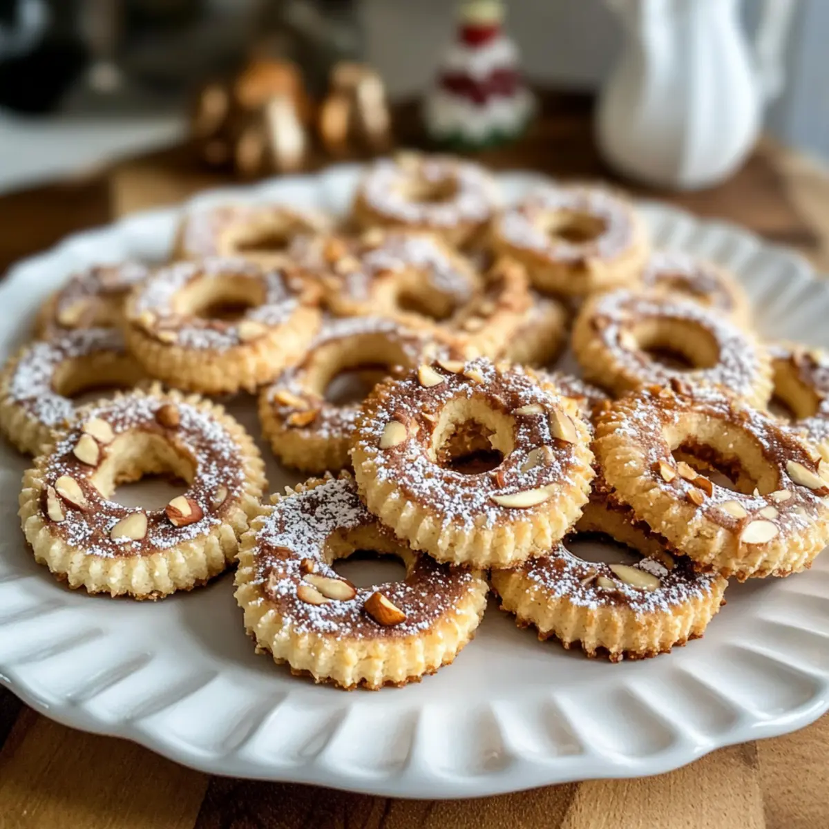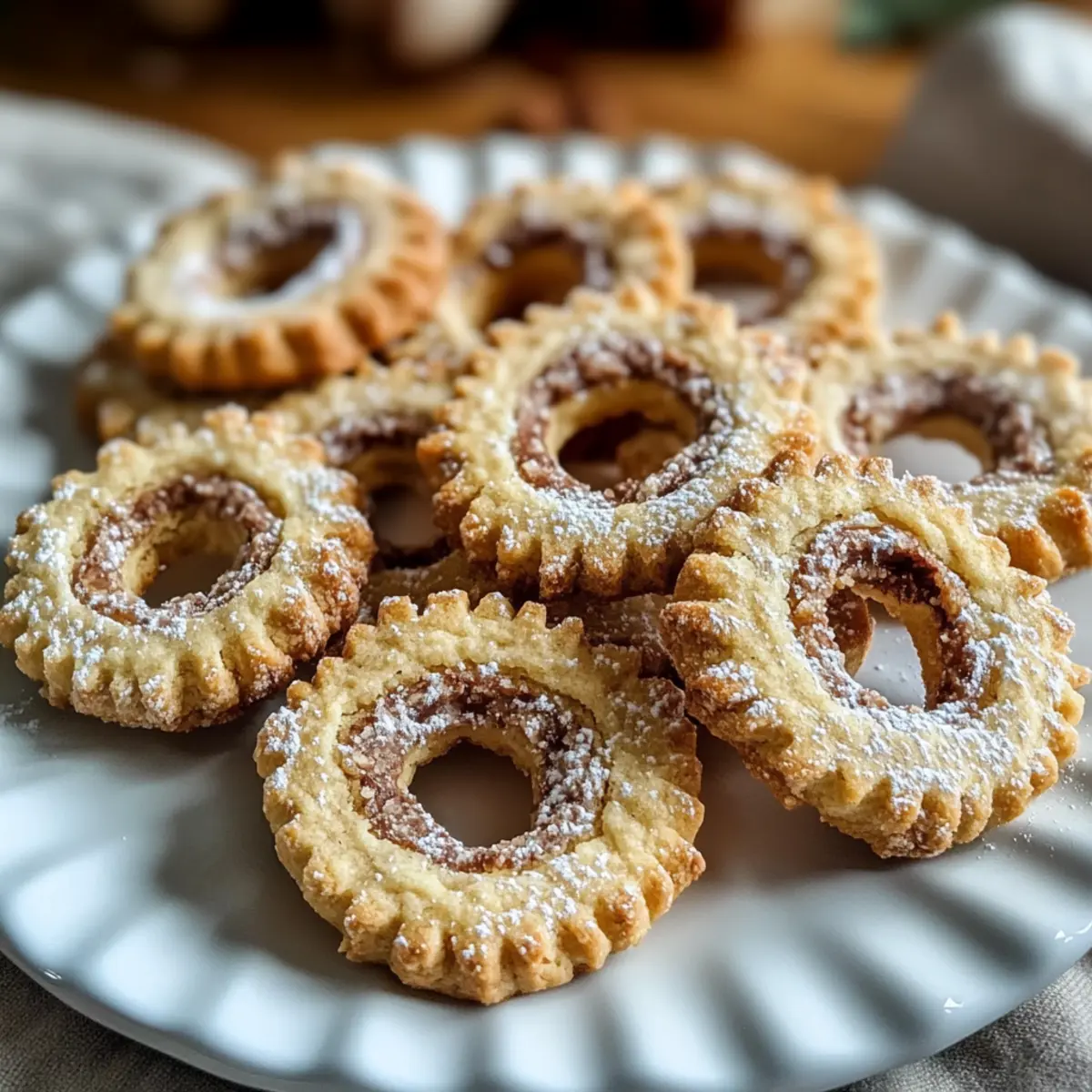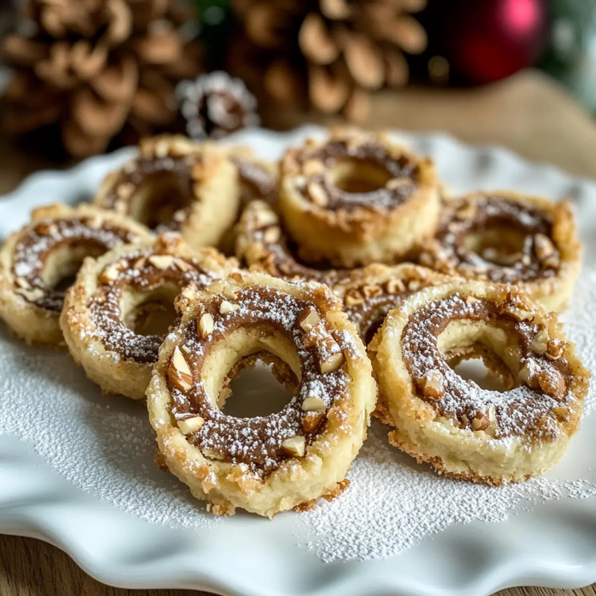 Die erste Kälte des Winters hat mich heute an die köstlichen Mürbe Nusskringel Plätzchen erinnert, die das Weihnachtsgebäck zu etwas ganz Besonderem machen. Die Kombination aus knackigen Haselnüssen und einem feinen Hauch von Zimt und Kakao macht diese Plätzchen nicht nur unwiderstehlich, sondern auch ein heiterer Genuss für die heimische Weihnachtsstimmung. Mit dieser einfach zuzubereitenden Rezeptur sind die Mürbe Nusskringel nicht nur ein Hingucker auf dem festlichen Plätzchenteller, sondern auch ein cremiger, leicht schmelzender Genuss, der Jung und Alt begeistert. Ein weiterer Vorteil? Sie eignen sich hervorragend als Geschenk oder für entspannte Nachmittage mit einer Tasse Tee oder Kaffee. Und hast du schon einmal über Variationen nachgedacht, die deine Plätzchen noch außergewöhnlicher machen könnten? Warum sind Mürbe Nusskringel Plätzchen so besonders? Einfachheit, die begeistert: Dieses Rezept erfordert nur grundlegende Backfähigkeiten und bringt sowohl Anfänger als auch erfahrene Bäcker zusammen. Aromatische Vielfalt: Die Kombination aus Haselnüssen, Zimt und Kakao sorgt für einen unwiderstehlichen Geschmack, der sofort an Weihnachten erinnert. Vielseitigkeit, die überzeugt: Variiere die Nüsse oder füge Schokolade hinzu, um deinen persönlichen Touch zu verleihen. Perfekte Geschenke: Diese Plätzchen sind nicht nur köstlich, sondern auch eine wunderbare Überraschung für Freunde und Familie – ideal für die festliche Jahreszeit! Wenn du auf der Suche nach weiteren köstlichen Weihnachtsleckereien bist, schau dir auch unsere festlichen Kekse an. Mürbe Nusskringel Plätzchen Zutaten • Hier sind die Zutaten für deine köstlichen Weihnachtsplätzchen: Mehl – sorgt für die richtige Struktur; kann durch glutenfreies Mehl ersetzt werden. Butter – gibt den Plätzchen ihre reichhaltige und feuchte Konsistenz; achte darauf, dass sie weich ist für ein einfaches Mischen. Puderzucker – bringt die Süße und eine feine Textur; kann durch Kristallzucker ersetzt werden, jedoch wird die Textur leicht variieren. Ei(er) – binden die Zutaten und sorgen für Feuchtigkeit; als vegane Variante eignet sich ein Leinsamen-Ei. Prise Salz – balanciert die Süße; unverzichtbar zur Geschmacksverstärkung. Gemahlene Haselnüsse – verleihen Geschmack und Textur; können durch gemahlene Mandeln ersetzt werden. Zimt – sorgt für Wärme und Gewürz; kann optional verwendet werden für einen leichteren Geschmack. Kakaopulver – intensiviert die Farbe und fügt einen Hauch von Schokolade hinzu; kann für leichtere Plätzchen weggelassen werden. Gehackte Haselnüsse – bringt einen knusprigen Biss; alternativ können gehackte Walnüsse oder Pekannüsse verwendet werden. Viel Spaß beim Backen deiner Mürbe Nusskringel Plätzchen! Schritt-für-Schritt-Anleitung für Mürbe Nusskringel Plätzchen Step 1: Teig vorbereiten Trenne die Eigelbe von den Eiweiß. In einer großen Schüssel das Mehl, die gewürfelte Butter, ein Eigelb und den Puderzucker zusammengeben. Kneten Sie die Mischung gründlich, bis ein glatter Teig entsteht. Dies sollte etwa 5 Minuten dauern. Achte darauf, dass die Butter weich ist, um sie gut einarbeiten zu können. Step 2: Teig teilen Teile den fertigen Teig in drei gleich große Portionen. Forme zwei Portionen zu kleinen Fladen und lege sie beiseite, während du mit der dritten Portion weiterarbeitest. Diese Portion wird später aromatisiert und dient als Grundlage für die Mürbe Nusskringel Plätzchen. Step 3: Drittel aromatisieren Füge der restlichen Teigportion die gemahlenen Haselnüsse, den Zimt, das Kakaopulver und das zweite Eigelb hinzu. Mische die Zutaten gründlich mit den Händen, bis alles gut integriert ist. Der Teig sollte eine homogene Farbe haben und leicht feucht, aber nicht klebrig sein. Step 4: Teig ausrollen Rolle den hellen Teig auf einer leicht bemehlten Fläche zu einem Rechteck von etwa 4 mm Dicke aus. Verwende Frischhaltefolie, um ein Festkleben des Teigs zu verhindern. Achte darauf, dass die Kanten gleichmäßig sind, damit die Plätzchen später hübsch aussehen. Step 5: Schichten und rollen Rolle den dunklen Teig etwas kleiner aus und lege ihn auf den hellen Teig. Bestreiche die obere Schicht vorsichtig mit dem Eiweiß und drücke die Schichten fest zusammen. Rolle den zusammengesetzten Teig sorgfältig zu einem logförmigen Stück, um die Mürbe Nusskringel Plätzchen zu formen. Step 6: Kühlen Wickle die geformten Teiglogs in Alufolie und lege sie für mindestens 30 Minuten in den Kühlschrank. Dies hilft, die Form während des Backens zu bewahren und gibt dir die Möglichkeit, in der Zwischenzeit die Küche aufzuräumen oder weitere Vorbereitungen zu treffen. Step 7: Backen Heize den Backofen auf 190 °C vor. Schneide die gekühlten Logs in ca. 0,5 cm dicke Runden und lege sie auf ein mit Backpapier ausgelegtes Backblech. Backe die Plätzchen für etwa 10 Minuten oder bis sie leicht goldbraun sind. Achte darauf, dass sie nicht zu dunkel werden. Step 8: Lagern Lasse die Mürbe Nusskringel Plätzchen nach dem Backen auf einem Kuchengitter abkühlen. Bewahre sie anschließend in luftdichten Behältern auf, um ihre Frische zu erhalten. Diese Plätzchen sind die perfekte Ergänzung zu einer Tasse Tee oder Kaffee und halten sich gut für bis zu einer Woche. Expert Tips für Mürbe Nusskringel Plätzchen Butter richtig wählen: Achte darauf, dass die Butter wirklich zimmerwarm ist, damit sie sich besser mit den anderen Zutaten verbinden lässt und die Plätzchen schön mürbe werden. Teig kühl halten: Ein gut gekühlter Teig ist entscheidend, um die Form der Mürbe Nusskringel Plätzchen beim Backen zu bewahren. Vermeide zu warmen Teig! Gleichmäßiges Schneiden: Nutze ein scharfes Messer, um die Teiglogs gleichmäßig in Runden zu schneiden. Das verhindert, dass die Plätzchen beim Backen zerdrückt werden. Wachsam beim Backen: Behalte die Plätzchen während des Backens im Auge, um ein Überbacken zu vermeiden. Sie 