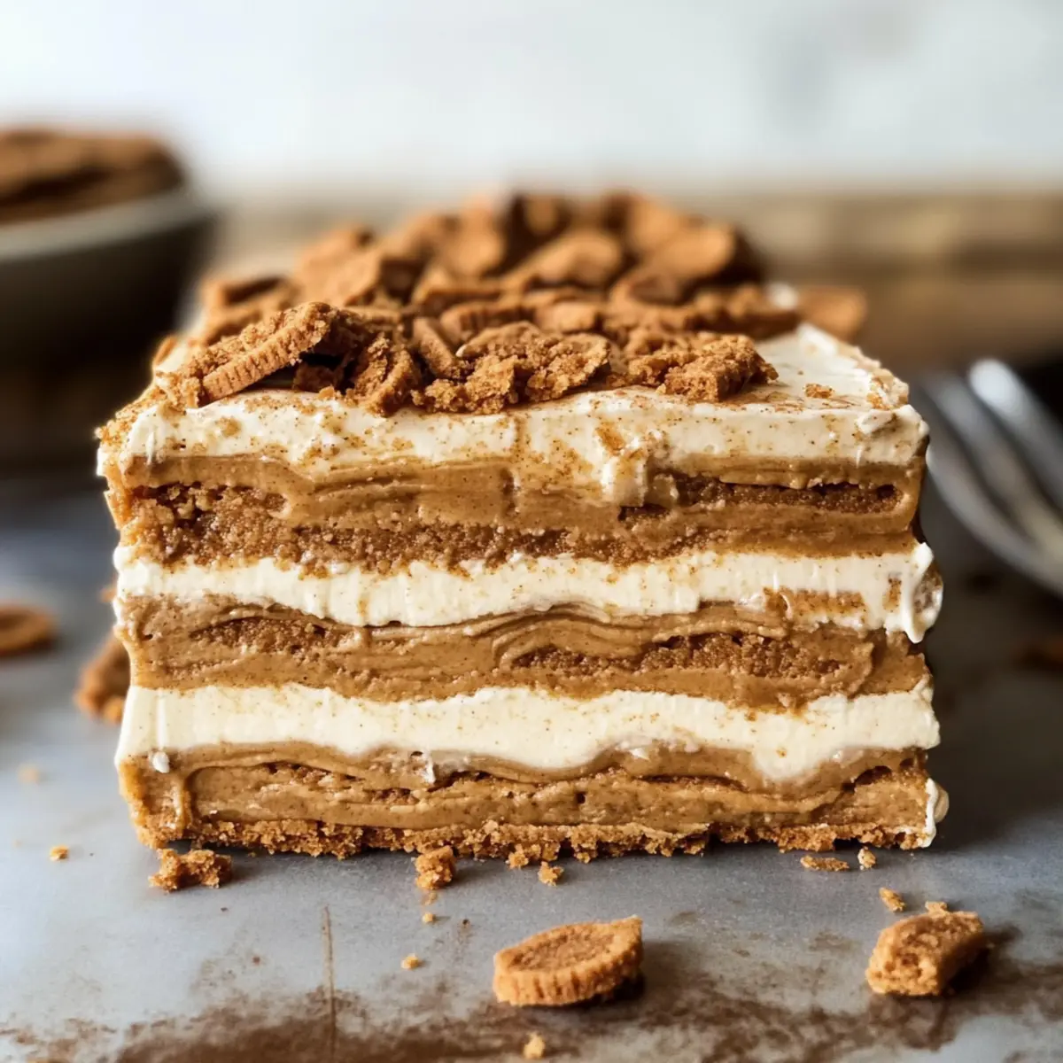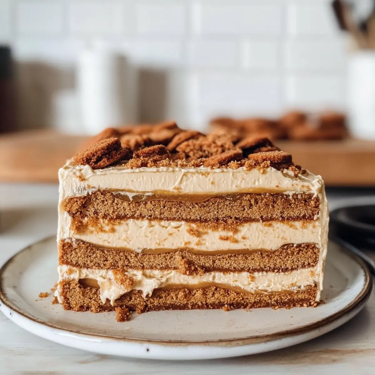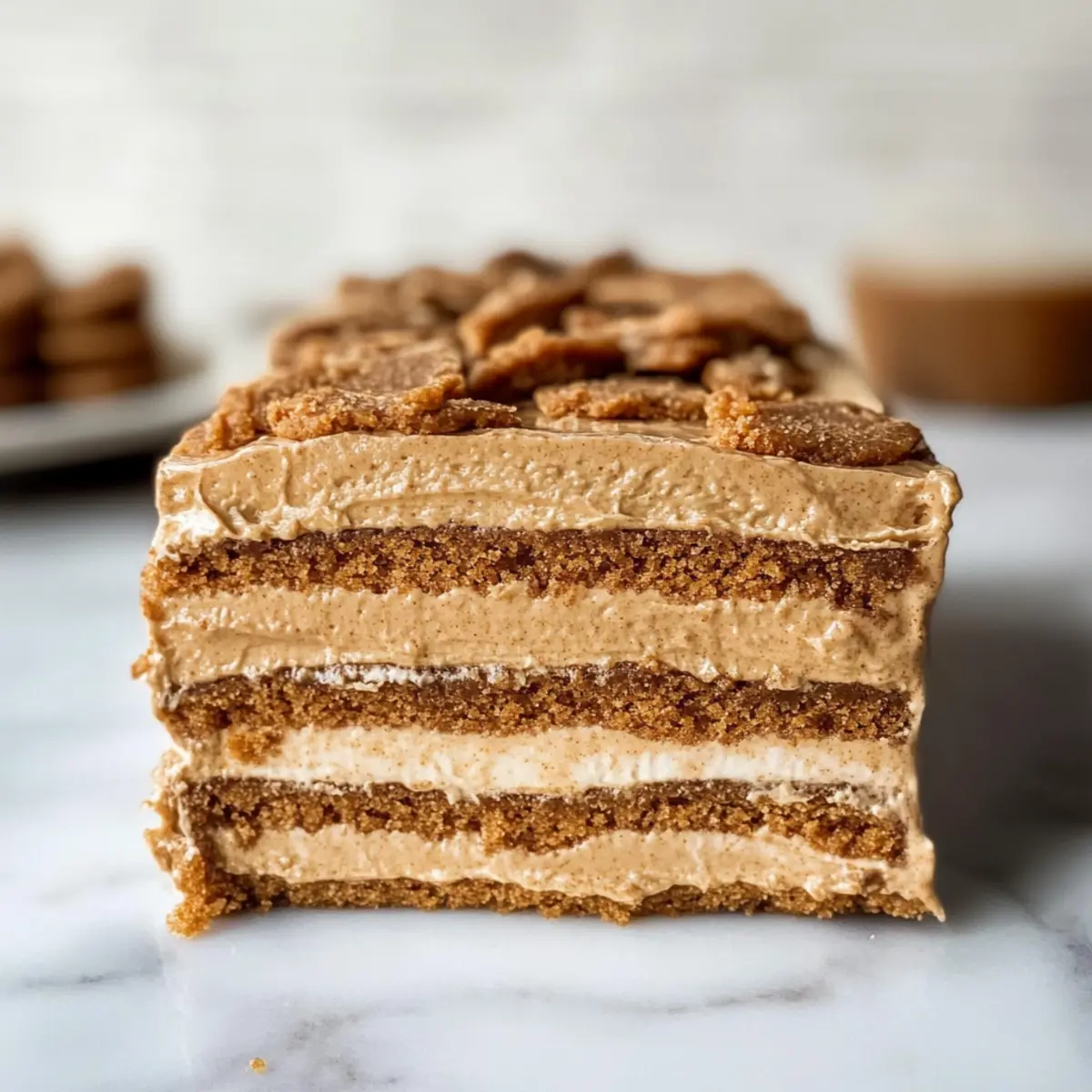 Ein köstlicher No-Bake Keksbutter Eiskasten Kuchen (mit Speculoos) für kreative Dessertliebhaber.