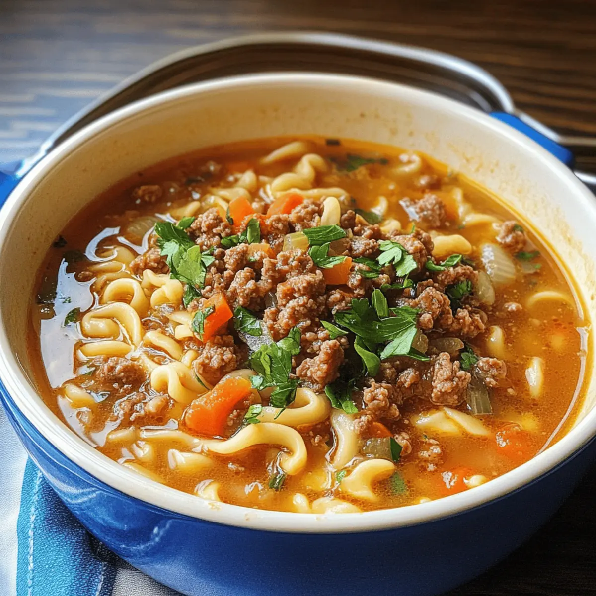 Die Nudel-Hack-Suppe ist ein köstlicher Eintopf, der Ihnen an kühlen Tagen Wärme bringt.