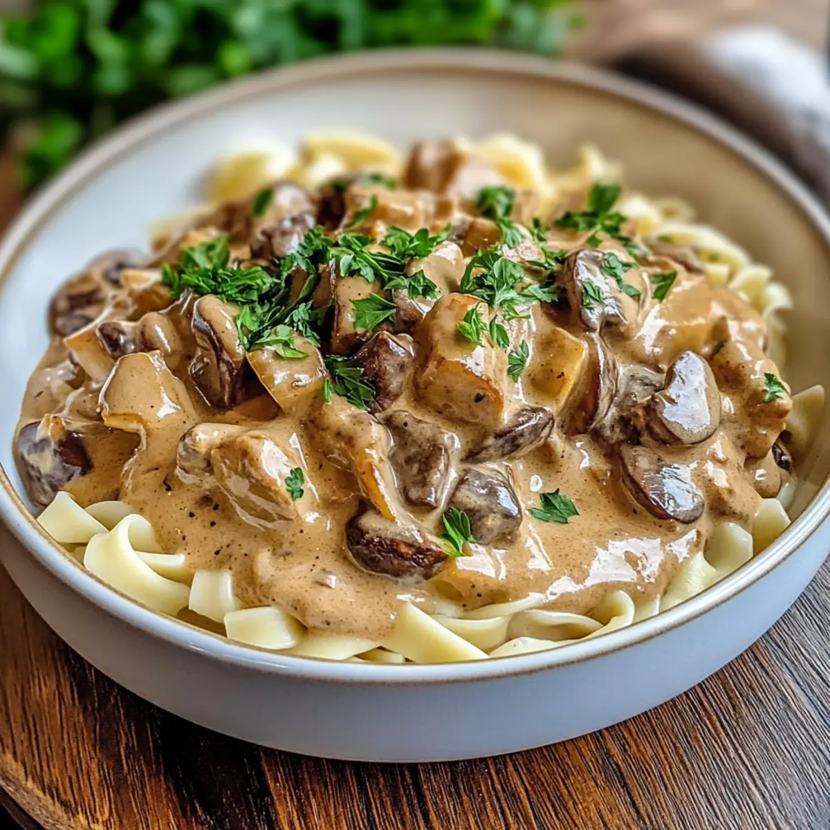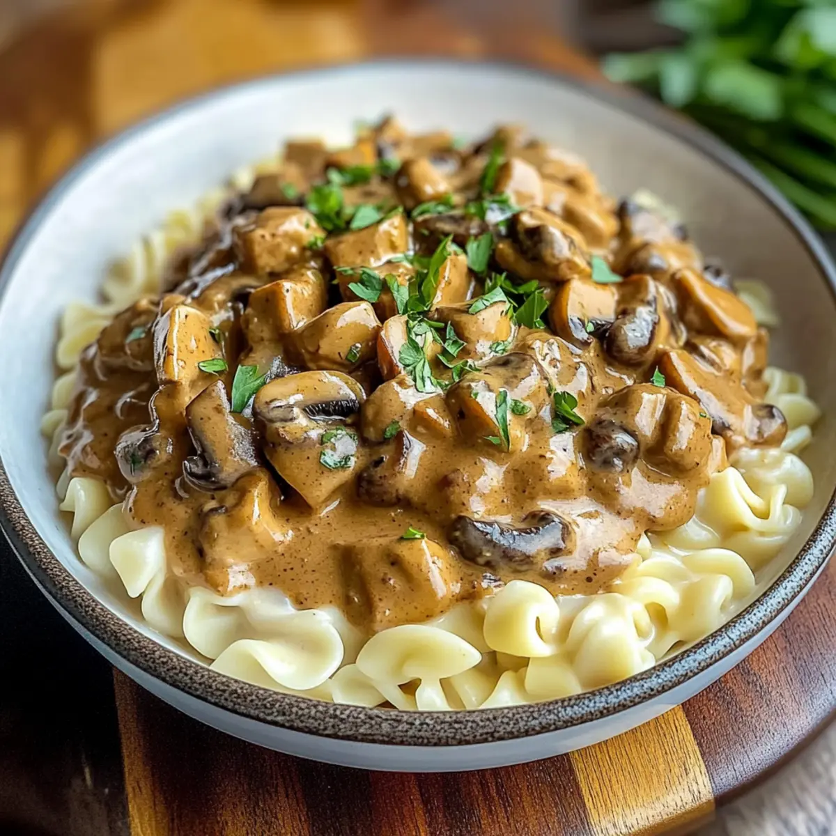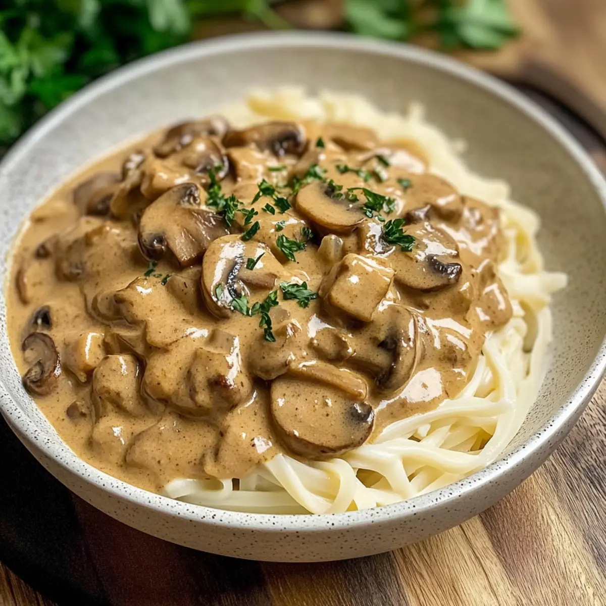 Ein herzhaftes, cremiges Pilz- und Seitan-Stroganoff, ideal für Veggie-Liebhaber und schnell in weniger als 45 Minuten zubereitet.