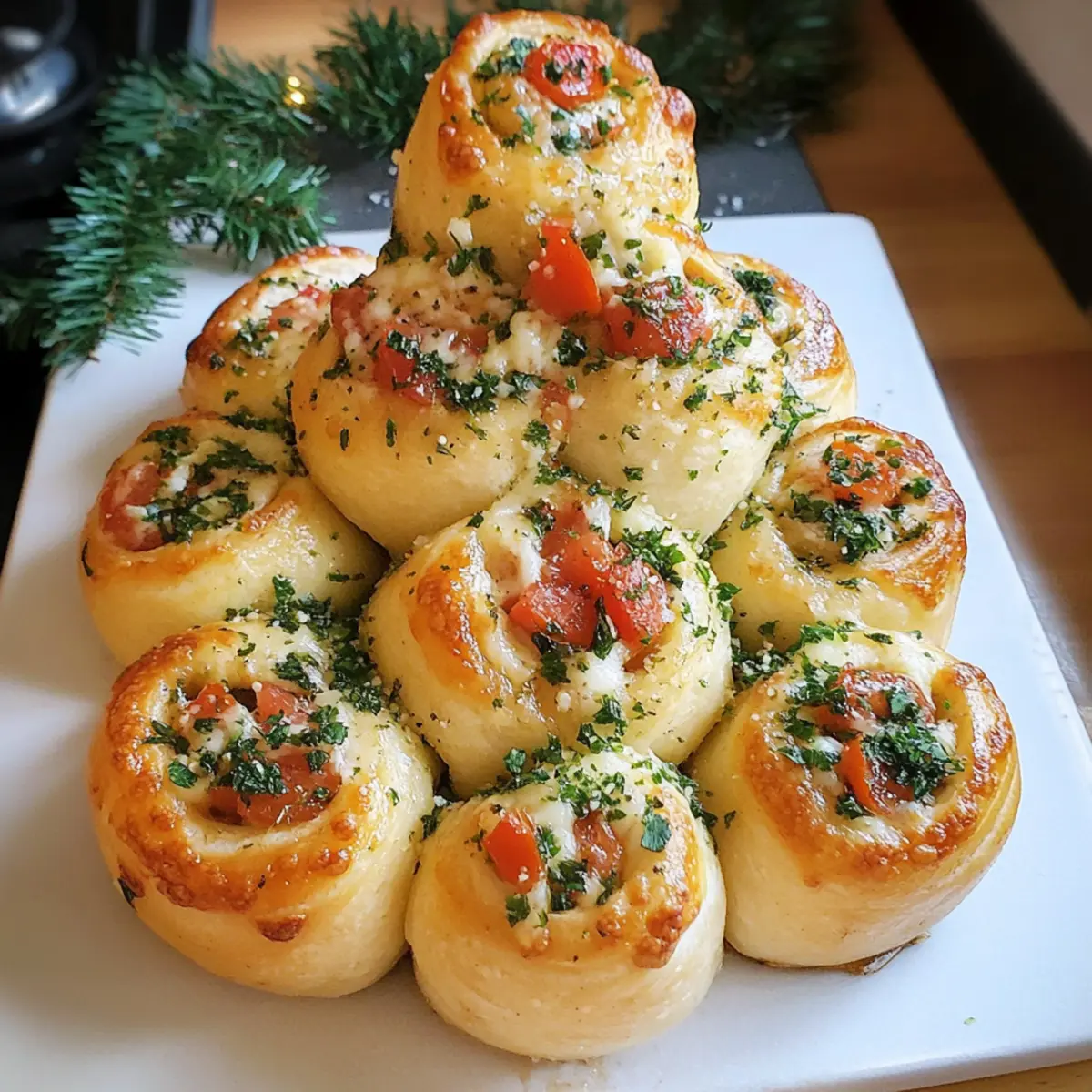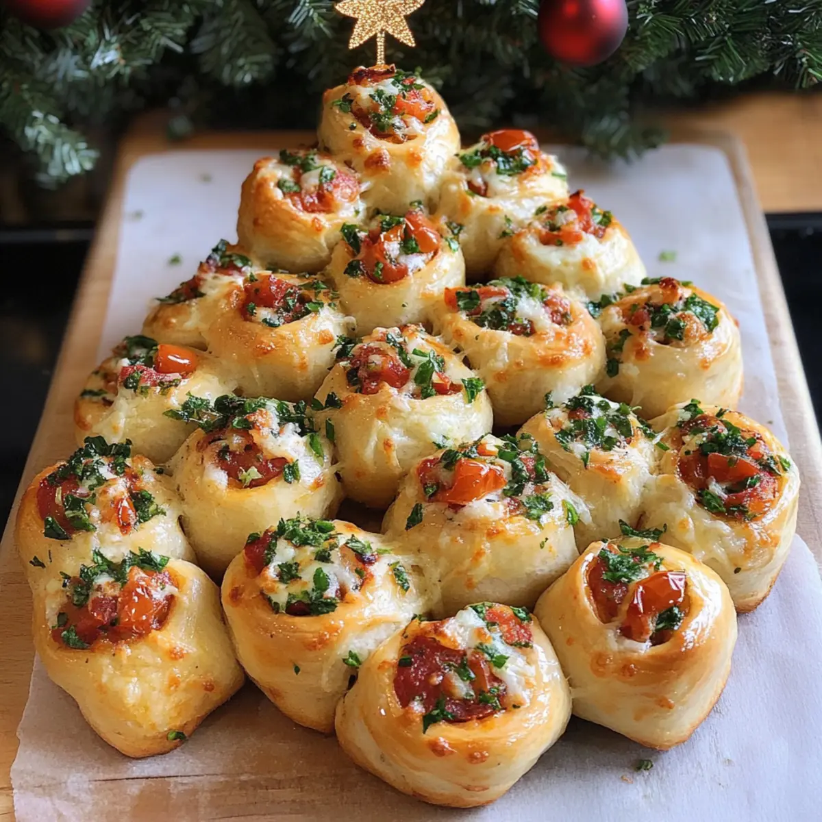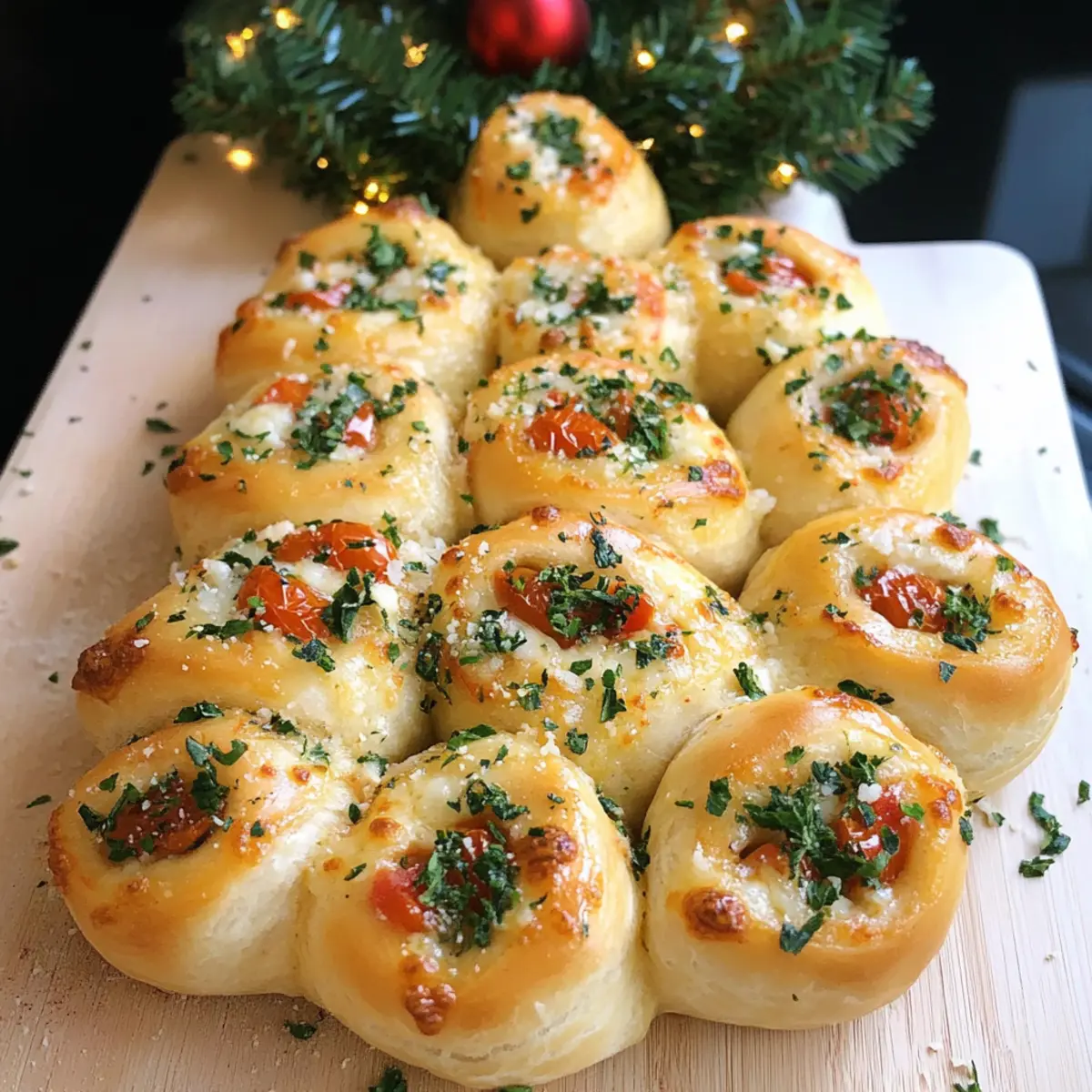 Ein berauschender Duft von frischem Brot und geschmolzenem Käse umhüllt mich, als ich an die festlichen Feiern dieser Jahreszeit denke. Mit dem Pizzabrötchen-Tannenbaum-Rezept bringe ich die gemütliche Atmosphäre direkt in meine Küche – und bei euch sicher auch! Diese herzhaften, kleinen Pizzabrötchen in Form eines Weihnachtsbaums sind nicht nur ein echter Hingucker auf jeder Weihnachtstafel, sondern auch kinderleicht zuzubereiten. In kurzer Zeit verwandelt ihr einfache Zutaten in ein köstliches Fingerfood, das sich ideal für ungezwungene Zusammenkünfte eignet. Ob als Vorspeise oder Snack – mit diesen Pizzabrötchen bringt ihr garantiert alle zum Schmelzen. Seid ihr bereit, eure Liebsten zu beeindrucken? Warum wird euch dieses Rezept begeistern? Einzigartiges Festtagsdesign: Der Pizzabrötchen-Tannenbaum ist nicht nur lecker, sondern auch ein echter Blickfang auf jeder Feier. Einfache Zubereitung: Mit wenigen Zutaten und einfachen Schritten lässt sich dieses Rezept schnell umsetzen – perfekt für spontane Festlichkeiten. Herzhafter Geschmack: Die Kombination aus geschmolzenem Mozzarella und saftigen Tomaten verführt jeden Gaumen. Vielseitig anpassbar: Ob mit Wurst oder Gemüse – gestaltet eure Pizzabrötchen nach Lust und Laune! Vorbereitung im Voraus: Macht den Teig bereits am Vortag und spart Zeit am Festtagsabend. Diese Leckerei wird eure Gäste garantiert überraschen! Pizzabrötchen-Tannenbaum Zutaten • Diese Zutaten werden euch helfen, ein köstliches Pizzabrötchen-Tannenbaum-Rezept zu kreieren. Für den Teig Hefe – Essentiell für die Lockerheit des Teigs; frisch oder trocken verwendbar. Warmes Wasser – Aktiviert die Hefe und lässt den Teig aufgehen, ideal bei 37-40°C. Salz – Verstärkt den Geschmack und die Struktur des Teigs; ohne Salz wird es fade. Mehl – Gibt dem Teig Struktur und Beißfestigkeit; Allzweckmehl ist empfohlen. Italienische Kräuter – Verleiht dem Teig Geschmack; austauschbar durch getrockneten Basilikum oder Oregano. Olivenöl – Macht den Teig geschmeidig und verbessert die Textur; auch durch geschmolzene Butter eretzbar. Für die Füllung Mozzarella-Kugeln – Die Hauptfüllung für cremigen Geschmack; Cheddar oder Feta sind gute Alternativen. Gehackte Tomaten – Fügt Feuchtigkeit und einen herzhaften Geschmack hinzu; frische Tomaten können auch genutzt werden. Mit diesen Zutaten wird euer Pizzabrötchen-Tannenbaum-Rezept ein voller Erfolg und ein Fest für die Sinne! Schritt-für-Schritt-Anleitung für das Pizzabrötchen-Tannenbaum-Rezept Step 1: Teigvorbereitung Lösen Sie die Hefe und das Salz in 300 ml warmem Wasser (37-40°C) auf. Fügen Sie das Mehl, die italienischen Kräuter und das Olivenöl hinzu und kneten Sie alles zu einem glatten Teig. Die perfekte Konsistenz erreichen Sie nach etwa 5-7 Minuten. Der Teig sollte elastisch und leicht klebrig sein. Step 2: Gären lassen Decken Sie den Teig mit einem feuchten Tuch ab und lassen Sie ihn an einem warmen Ort etwa 30 Minuten ruhen, bis er sich verdoppelt hat. Achten Sie darauf, dass der Teig nicht austrocknet, um eine optimale Gärung zu gewährleisten. Ein zarter Duft von Hefe wird bald aufsteigen und für Vorfreude sorgen. Step 3: Formen Teilen Sie den Teig in 16 gleich große Stücke und formen Sie sie zu flachen Scheiben. Legen Sie jeweils einen Teelöffel gehackte Tomaten und eine Mozzarella-Kugel in die Mitte jeder Scheibe. Falten Sie den Teig über der Füllung zusammen und drücken Sie die Ränder gut zu, sodass keine Füllung herausquillt. Step 4: Weihnachtsbaum formen Rollen Sie 15 der gefüllten Teigstücke zu Kugeln und arrangieren Sie diese auf einem mit Backpapier belegten Blech in Form eines Weihnachtsbaums. Verwenden Sie das letzte Stück, um den Stamm des Baumes zu formen und es am unteren Ende zu platzieren. Die verschiedenen Größen der Kugeln werden den Baum noch festlicher wirken lassen. Step 5: Finish Bestreichen Sie den zusammengestellten Weihnachtsbaum mit einem verquirlten Ei, um eine goldene Kruste zu erzielen. Achten Sie darauf, dass jede Seite gut bestrichen wird, sodass der Teig gleichmäßig bräunt und eine appetitliche Farbe annimmt. Ihre Pizzabrötchen-Tannenbaum bekommen dadurch ein schönes glänzendes Finish. Step 6: Backen Heizen Sie den Ofen auf 200°C vor und backen Sie den Pizzabrötchen-Tannenbaum für etwa 20 Minuten. Die Brötchen sind fertig, wenn sie golden-braun und leicht knusprig sind. Ein verführerischer Duft wird durch Ihre Küche ziehen – Ihr Pizzabrötchen-Tannenbaum ist nun bereit, serviert zu werden. Step 7: Servieren Lassen Sie die Pizzabrötchen im Blech kurz abkühlen, bevor Sie sie auf eine Servierplatte legen. Bestreichen Sie sie nach dem Backen leicht mit geschmolzener Butter, die mit Kräutern vermischt ist, um zusätzlichen Geschmack zu verleihen. Genießen Sie diese festlichen Snacks warm oder als Fingerfood auf Ihren Feiertagsfeiern. Vorbereitung für den Pizzabrötchen-Tannenbaum: So bleibt ihr stressfrei! Die Zubereitung des Pizzabrötchen-Tannenbaums lässt sich großartig im Voraus planen – perfekt für hektische Feiertage! Den Teig könnt ihr bis zu 24 Stunden vor dem Backen vorbereiten und im Kühlschrank aufbewahren. Rollt einfach die gefüllten Teigstücke zu Kugeln und lagert sie auf einem Backblech in einer luftdichten Box. Wenn ihr bereit seid, die Pizzabrötchen-Tannenbaum zu backen, nehmt sie heraus, lasst sie für 15-30 Minuten auf Raumtemperatur kommen und backt sie wie gewohnt. Achte darauf, die Brötchen vor dem Backen gut mit Ei zu bestreichen, um eine goldene Kruste zu erzielen – das hält sie ebenso frisch und köstlich wie beim ersten Mal. So spart ihr Zeit und sorgt dafür, dass eure Gäste nicht auf die festlichen Snacks warten müssen! Lagerungstipps für Pizzabrötchen-Tannenbaum Raumtemperatur: Bewahren Sie ungebackene Pizzabrötchen-Tannenbaum für bis zu 30 Minuten bei Raumtemperatur auf, während Sie den Ofen vorheizen. Kühlschrank: Abgekühlte, gebackene Pizzabröt