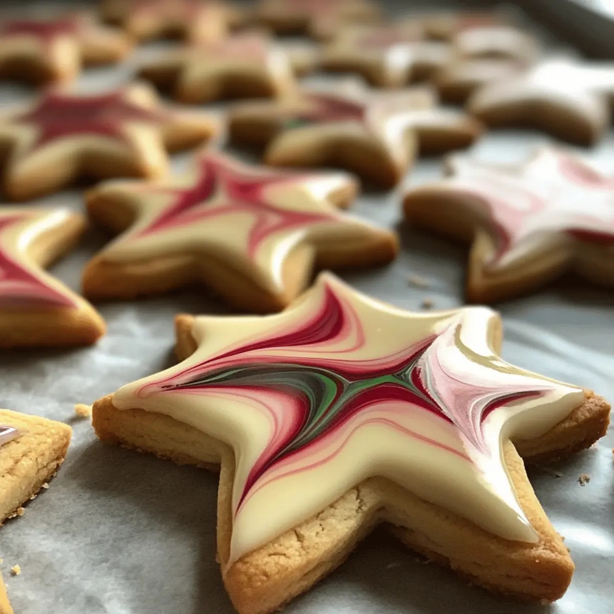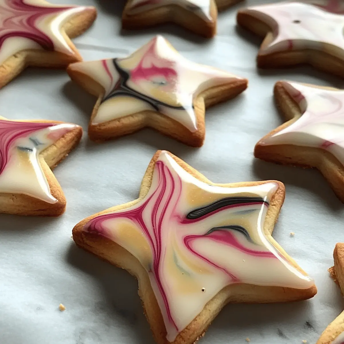 Trage die Glasur großzügig auf die abgekühlten Punschsterne auf. Verwende einen Zahnstocher, um in der Glasur schöne Marmoreffekte zu erzeugen, indem du die Farben sanft verwischst. Achte darauf, dass die Glasur gleichmäßig verteilt ist, um ein ansprechendes Aussehen zu erzielen.