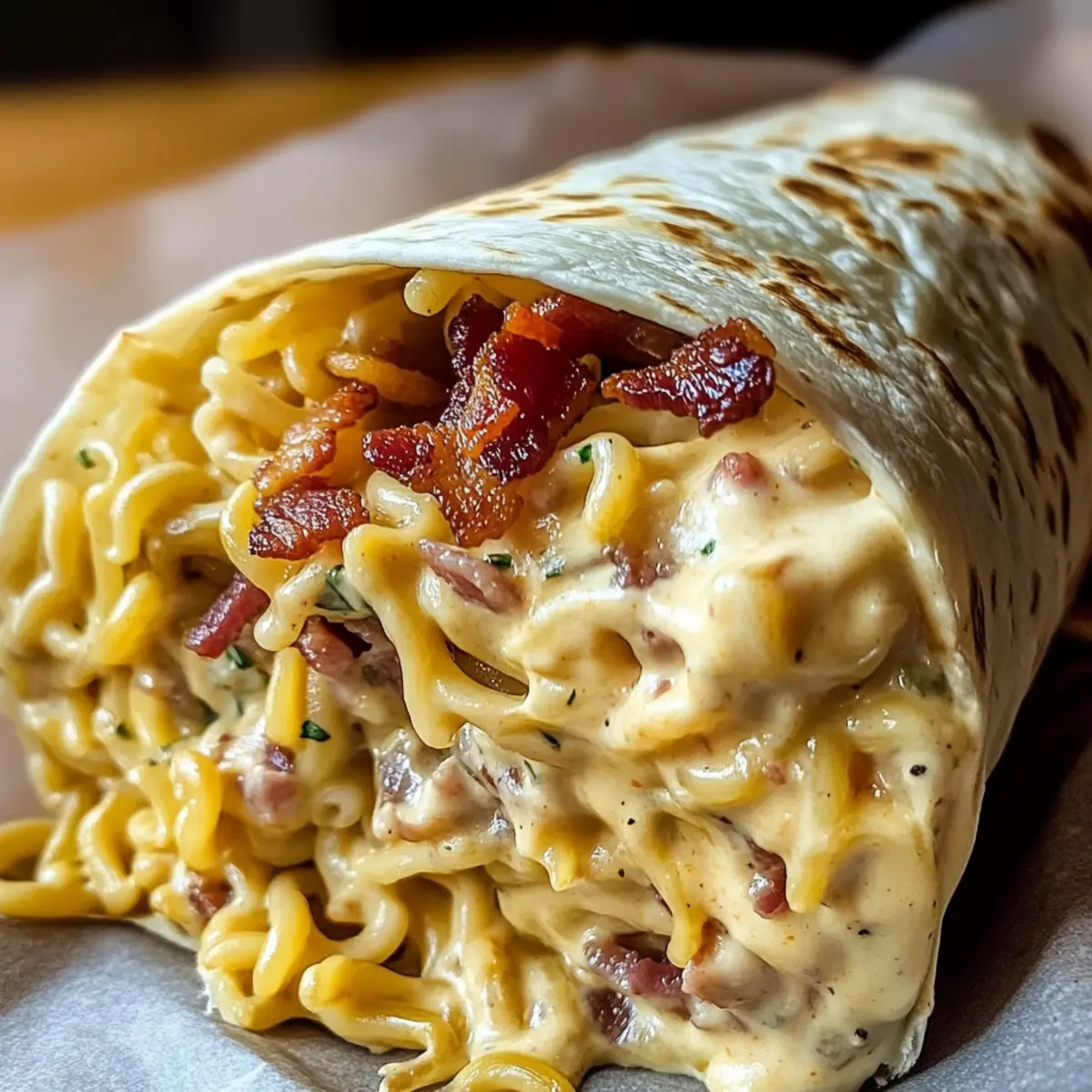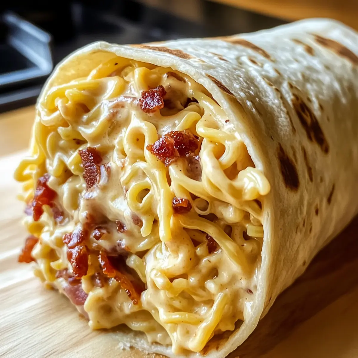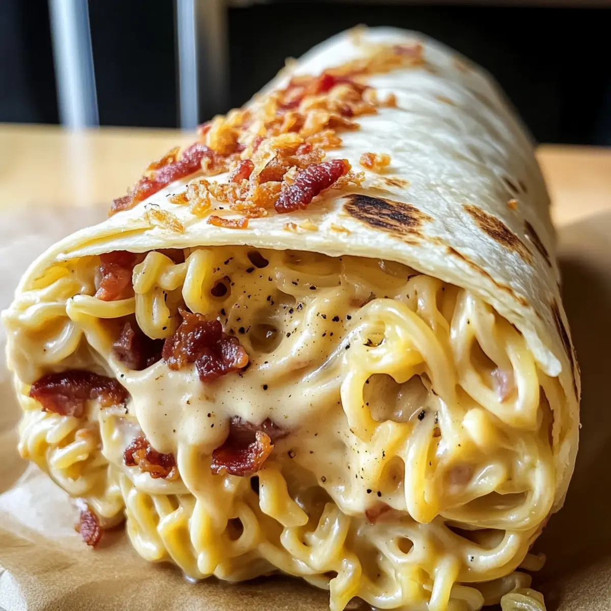 Das Ramen Carbonara Burrito kombiniert cremige Carbonara mit zarten Ramen-Nudeln, umwickelt in einer Tortilla.