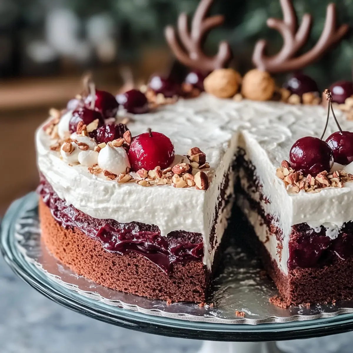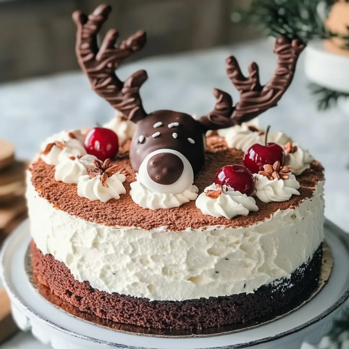Als ich das erste Mal einen Rentier Kuchen sah, war ich sofort fasziniert von seiner festlichen Ausstrahlung und den verführerischen Schichten. Dieser zauberhafte Weihnachtskuchen kombiniert eine luftige Nuss-Kakao-Biskuitbasis mit einer fruchtigen Kirschkompottfüllung und einer cremigen Quark-Sahne-Oberschicht – ein wahres Highlight auf jedem festlichen Tisch! Was mich besonders begeistert, ist die Tatsache, dass das Rezept überraschend einfach umzusetzen ist, sodass sowohl Anfänger als auch erfahrene Küchenchefs Freude daran haben. Zudem ist der Rentier Kuchen perfekt für gesellige Zusammenkünfte oder Kindergeburtstage im Winter, da er nicht nur köstlich schmeckt, sondern auch alle mit seiner schönen Optik verzaubert. Neugierig geworden, wie du dieses festliche Meisterwerk selbst zaubern kannst? Lass uns gemeinsam ins Backvergnügen starten! Warum ist der Rentier Kuchen einzigartig? Einfachheit: Du wirst überrascht sein, wie unkompliziert das Rezept ist – auch unerfahrene Bäcker können mit Leichtigkeit glänzen! Festlicher Genuss: Das harmonische Zusammenspiel von Nuss-Kakao-Biskuit und fruchtigen Kirschkompott macht diesen Kuchen zu einem unvergesslichen Geschmackserlebnis. Flexible Zutaten: Variiere die Füllung nach deinem Geschmack – probiere zum Beispiel andere Beeren oder füge einen Hauch von Zimt hinzu für eine persönliche Note! Perfekte Präsentation: Sein schöner, mehrstöckiger Aufbau verleiht dem Kuchen eine beeindruckende Optik, die jeden Tisch schmückt. Gemeinsames Backen: Ideal für die ganze Familie! Kinder können beim Schichten helfen und erleben, wie aus einfachen Zutaten ein Kunstwerk entsteht. Rentier Kuchen Zutaten • Bereite dich darauf vor, mit diesen köstlichen Zutaten deinen Rentier Kuchen zu kreieren! Für den Biskuit: Nüsse – bieten eine nussige Tiefe; nutze gemahlene Mandeln oder Haselnüsse. Kakaopulver – bringt den schokoladigen Geschmack; wähle gutes, ungesüßtes Kakaopulver für beste Ergebnisse. Zucker – süßt den Biskuit; verwende braunen Zucker für eine karamelartige Note. Eier – geben Struktur; achte darauf, sie Zimmertemperatur haben, um die besten Ergebnisse zu erzielen. Mehl – dient als Grundlage; weiche Weizenmehl kann verwendet werden, um die Glutenstruktur zu optimieren. Backpulver – sorgt für die nötige Lockheit; stelle sicher, dass es frisch ist. Für die Kirschkompott: Kirschen – sie liefern die fruchtige Fülle; wähle frische oder tiefgefrorene Kirschen gründlich abgetropft. Zucker – verstärkt die Süße der Kirschen; passend zur Fruchtigkeit, variiere die Menge je nach Süße der Früchte. Zitronensaft – bringt Frische; ein Spritzer verhindert die Überreife der Kirschen. Für die Füllung: Quark – für die cremige Textur; griechischer Joghurt kann als Ersatz verwendet werden. Sahne – sorgt für die fluffige Konsistenz; frisch geschlagene Sahne ist ideal, um Luftigkeit zu garantieren. Mit diesen einfachen Zutaten bist du bestens ausgestattet, um deinen Rentier Kuchen – einfaches Rezept für Weihnachten – zu kreieren und deine Lieben zu begeistern! Schritt-für-Schritt-Anleitung für Rentier Kuchen – Einfaches Rezept für Weihnachten Step 1: Biskuit vorbereiten Beginne damit, die gemahlenen Nüsse, Kakaopulver, Zucker, Mehl und Backpulver in einer großen Schüssel gut zu vermischen. Die Eier hinzufügen und alle Zutaten mit einem Handmixer bei mittlerer Geschwindigkeit für etwa 5 Minuten glatt rühren. Die Masse sollte luftig und gut verbunden sein. Den Teig in eine gefettete Springform füllen und im vorgeheizten Ofen bei 180°C für etwa 25 Minuten backen, bis ein Zahnstocher sauber herauskommt. Step 2: Kuchen auskühlen lassen Nachdem der Biskuitkuchen gebacken ist, nimm ihn aus dem Ofen und lasse ihn etwa 10 Minuten in der Form abkühlen. Danach vorsichtig aus der Form lösen und auf einem Gitterrost vollständig auskühlen lassen. Dies ist wichtig, um sicherzustellen, dass der Kuchen nicht zu feucht ist, wenn du ihn in Schichten schneidest. Step 3: Kirschkompott zubereiten In einem kleinen Topf die entsteinten Kirschen mit etwas Zucker und einem Spritzer Zitronensaft vermengen. Bei mittlerer Hitze unter ständigem Rühren ca. 10 Minuten köcheln lassen, bis die Kirschen weich sind und der Saft leicht eingedickt ist. Achte darauf, die Mischung hin und wieder umzurühren, damit nichts anbrennt. Danach vollständig abkühlen lassen. Step 4: Füllung vorbereiten In einer großen Schüssel den Quark mit der geschlagenen Sahne vorsichtig vermengen, um eine luftige und cremige Füllung zu erhalten. Mit einem Spatel langsam und vorsichtig falten, damit die Luft nicht entweicht. Dies sorgt für eine leichtere Konsistenz. Halte die Füllung bereit für die Schichtung des Rentier Kuchen. Step 5: Kuchen zusammenbauen Den vollständig ausgekühlten Biskuitkuchen in drei gleichmäßige Schichten ausschneiden. Lege die erste Schicht auf eine Kuchenplatte und verteile eine großzügige Menge Kirschkompott darauf. Dann eine Schicht der Quark-Sahne-Füllung darüber geben und die nächste Schicht Biskuit darauflegen. Diesen Schritt mit den restlichen Schichten der Zutaten wiederholen, bis alle Schichten übereinander gestapelt sind. Step 6: Kühlen Der Rentier Kuchen sollte nun für mindestens 4 Stunden oder über Nacht im Kühlschrank gekühlt werden. Diese Kühlzeit hilft, die Aromen zu intensivieren und die Textur zu stabilisieren, sodass sich die Füllung und das Kompott perfekt mit dem Biskuit verbinden können. Decke den Kuchen während dieser Zeit gut ab, um ein Austrocknen zu vermeiden. Step 7: Dekorieren Vor dem Servieren deinen festlichen Rentier Kuchen dekorieren. Verwende dazu frische Kirschen, Schokoladenspäne oder andere weihnachtliche Verzierungen, um den Kuchen optisch ansprechend zu gestalten. Lass deiner Kreativität freien Lauf, denn eine hübsche Dekoration macht den Kuchen zu einem echten Hingucker auf dem Weihnachtstisch. Was passt zum Rentier Kuchen? Der Rentier Kuc