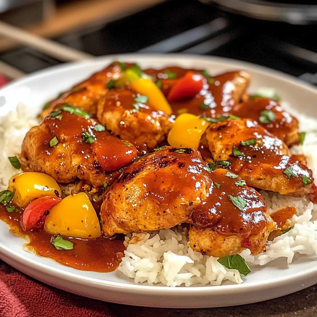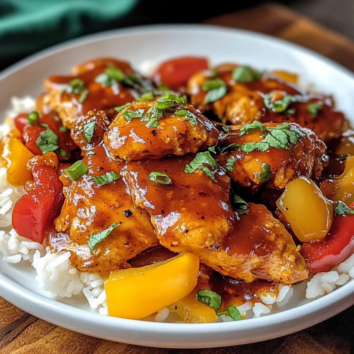 Die farbenfrohen Aromen von „Scharf Süßes Hühnchen Diablo“ verzaubern mich immer wieder! Bei jedem Bissen fühle ich die perfekte Balance zwischen dem feurigen Kick von Sriracha und der verlockenden Süße von Honig. Dieses einfache Rezept ist nicht nur ein Genuss für den Gaumen, sondern auch ein echter Publikumsmagnet, der Eure Familie und Freunde begeistert. Die zarten Hähnchenschenkel, umhüllt von einer glänzenden süß-scharfen Soße, machen es zum idealen Gericht für ein schnelles Abendessen unter der Woche. Und das Beste? Es ist äußerst vielseitig: Ihr könnt spielend leicht eine vegetarische Variante mit Tofu zaubern. Bereit, Euren Abend mit einem fröhlichen Geschmackserlebnis zu bereichern? Warum ist Scharf Süßes Hühnchen Diablo unverzichtbar? Einfachheit, die man lieben wird: Dieses Rezept erfordert keine Meisterköche, nur eine Prise Freude am Kochen. In weniger als 30 Minuten zaubert Ihr ein köstliches Gericht auf den Tisch! Vielseitig und anpassbar: Ob mit zarten Hühnchenschenkeln oder Tofu – Ihr entscheidet! Experimentiert mit Euren Lieblingsgemüsesorten, um jedes Mal eine neue Geschmackskombination zu entdecken. Süß und scharf: Die harmonische Mischung aus Sriracha und Honig wird Eure Geschmacksnerven zum Tanzen bringen. Es ist der perfekte Feierabendgenuss! Ein Publikumsmagnet: Egal ob für ein Familienessen oder ein Dinner mit Freunden – dieses Gericht sorgt für Begeisterung. Serviert es mit fluffigem Reis oder in Wraps, um ihm eine persönliche Note zu verleihen. Lasst Euch diese Erfahrung nicht entgehen! Schafft unvergessliche Geschmacksmomente mit diesem reichen und einladenden Gericht. Zutaten für Scharf Süßes Hühnchen Diablo • Entdeckt die essenziellen Zutaten, die dieses Gericht zu einem Geschmackserlebnis machen! Für das Hühnchen Hähnchenschenkel – Zartheit und eine hervorragende Proteinquelle; Ihr könnt sie auch durch Hähnchenbrust oder Tofu für eine vegetarische Variante ersetzen. Für das Gemüse Rote und Gelbe Paprika – Fügen Süße und Crunch hinzu; andere Paprika oder Gemüsesorten können ebenfalls verwendet werden. Zwiebel – Bildet die Geschmacksbasis und verstärkt die Süße beim Garen; jede Zwiebelvariante funktioniert gut. Knoblauch – Unverzichtbar für Aroma; frischer Knoblauch sorgt für den besten Geschmack. Ingwer – Bringt Wärme und Würze; kann durch gemahlenen Ingwer ersetzt werden, wenn nötig. Für die Soße Olivenöl – Ideal zum Anbraten; kann durch Sesamöl für ein anderes Geschmacksprofil ersetzt werden. Sojasauce – Verleiht Umami; verwendet eine kochsalzarme Sojasauce, um den Salzgehalt zu kontrollieren. Honig – Sorgt für Süße und hilft bei der Karamellisierung; kann durch Ahornsirup für eine vegane Option ersetzt werden. Reisessig – Bietet eine tangy Balance; weißer Weinessig kann eine Alternative sein. Sriracha – Die Schärfe die ihr anpassen könnt; kann auch durch Chilipaste ersetzt oder für milderen Geschmack weg gelassen werden. Maisstärke – Verdicker für die Soße; kann weggelassen oder durch Pfeilwurzpulver ersetzt werden. Wasser – Verdünnt die Soße; keine substitutions notwendig. Sesamöl – Fügt eine nussige Note hinzu; optional, aber verstärkt das Gericht. Für die Garnitur Grüne Zwiebeln – Frische Garnitur; können weggelassen oder durch Schnittlauch ersetzt werden. Sesamsamen – Fügen Crunch und visuelle Attraktivität hinzu; perfekt zur Garnierung, optional. Für die Beilage Gekochter Reis – Die Basis für das Servieren; ersetzt durch Quinoa oder Nudeln für Variation. Mit dieser Rundum-Zutatenliste für Scharf Süßes Hühnchen Diablo seid Ihr bestens für ein gelungenes Dinner vorbereitet! Schritt-für-Schritt-Anleitung für Scharf Süßes Hühnchen Diablo Step 1: Hähnchen marinieren In einer Schüssel das Hühnchen mit 1 EL Sojasauce, 1 EL Honig, 1 TL Reisessig, ½ TL Sriracha, 1 TL Maisstärke und 1 TL Sesamöl vermischen. Alles gut umrühren, bis das Hühnchen gleichmäßig be coated ist. Deckt die Schüssel ab und lasst sie für mindestens 30 Minuten, idealerweise bis zu 2 Stunden, im Kühlschrank marinieren, damit die Aromen gut einziehen können. Step 2: Soße zubereiten In einer separaten Schüssel die restliche Sojasauce, Honig, Reisessig, Sriracha und Wasser gut miteinander verquirlen. Dies wird die Grundlage für die süß-scharfe Soße des Scharfen Süßen Hühnchens Diablo. Behaltet die Mischung bereit, um sie später mit dem Hähnchen zu kombinieren. Step 3: Hühnchen anbraten Erhitzt 1 EL Olivenöl in einer großen Pfanne bei mittlerer Hitze. Legt das marinierte Hühnchen in einer einzigen Schicht in die Pfanne und bratet es etwa 5-7 Minuten an, bis es goldbraun und durchgegart ist. Wendet die Stücke auf der anderen Seite und sorgt dafür, dass sie gleichmäßig bräunen. Nehmt das Hühnchen nach dem Braten aus der Pfanne und stellt es beiseite. Step 4: Gemüse sautieren Fügt in derselben Pfanne das verbleibende 1 EL Olivenöl hinzu und erwärmt es. Gebt die Zwiebel, die Paprika, den Knoblauch und den Ingwer dazu und sautiert alles für etwa 5-7 Minuten. Rührt regelmäßig um, bis die Gemüsehälften zart, aber noch knackig sind. Dies verleiht dem Scharfen Süßen Hühnchen Diablo einen frischen Geschmack. Step 5: Hühnchen und Soße kombinieren Legt das gebräunte Hühnchen zurück in die Pfanne zu den sautierten Gemüse und gießt die vorbereitete Soße darüber. Lasst die Mischung für 3-5 Minuten köcheln, bis die Soße leicht eindickt und das Hühnchen gut glasiert ist. Dabei regelmäßig umrühren, um sicherzustellen, dass alles gleichmäßig bedeckt ist. Step 6: Servieren Serviert das Scharfe Süße Hühnchen Diablo heiß über frisch gekochtem Reis. Garnieren Sie das Gericht mit gehackten grünen Zwiebeln und vielleicht ein paar Sesamsamen für zusätzlichen Crunch und visuelle Attraktivität. Genießt die harmonische Mischung aus süß und scharf! Aufbewahrungstipps für Scharf Süßes Hühnchen Diablo Zimmertempe