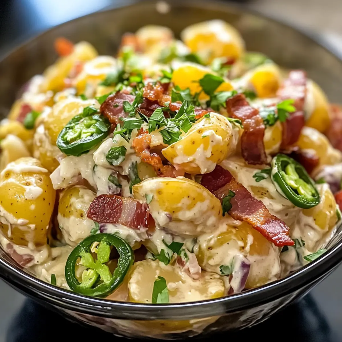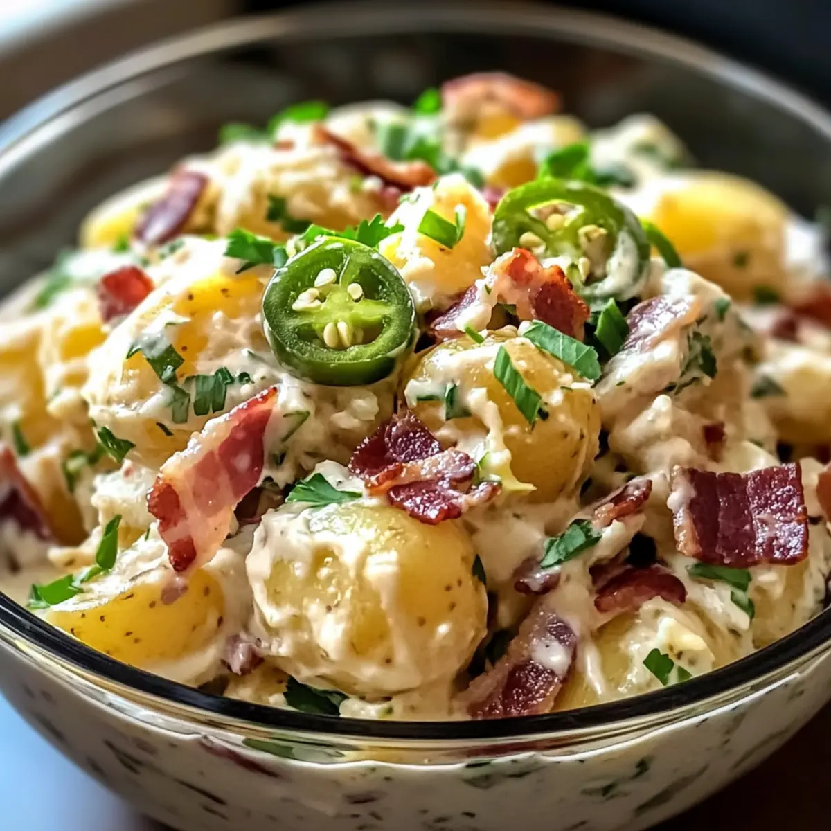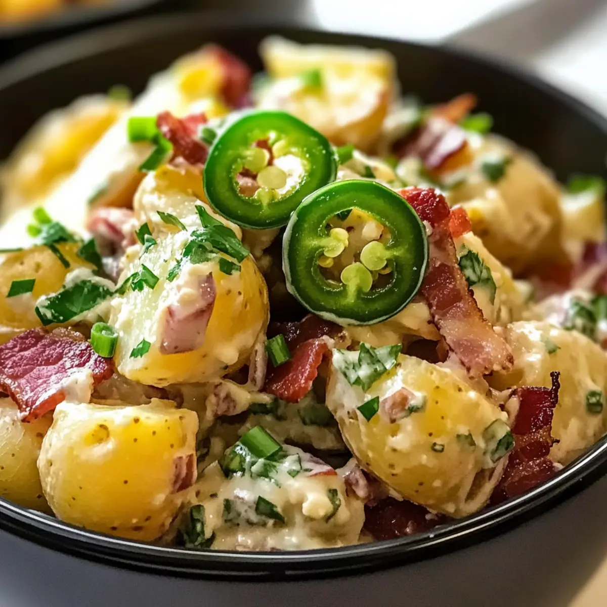 Es gibt nichts Besseres, als an einem warmen Sommertag frische, gemeinsam zubereitete Speisen zu genießen, die nach Ferien und Geselligkeit schmecken. Mein scharfer Jalapeno Kartoffelsalat Rezept ist die perfekte Ergänzung für Ihr nächstes Grillfest oder Familienessen! Diese köstliche, cremige Kombination aus zarten Kartoffeln und würzigen Jalapeños begeistert nicht nur Ihre Geschmacksnerven, sondern ist auch ein absoluter Publikumsliebling. Mit der Möglichkeit, verschiedene Kartoffelsorten und individuelle Zutaten zu verwenden, können Sie dieses Gericht ganz nach Ihren Vorlieben anpassen. Ob als leichtes Hauptgericht oder als aufregende Beilage, dieser Salat bringt Pepp auf den Tisch und ist schnell zubereitet. Neugierig auf die Geheimnisse, wie Sie diesen Kartoffelsalat noch unwiderstehlicher machen können? Warum dieser Kartoffelsalat unwiderstehlich ist? Einfachheit in der Zubereitung: Mit nur wenigen Schritten und gängigen Zutaten ist dieses Rezept ein Kinderspiel für jeden Koch. Schmackhafte Kombination: Die Mischung aus cremigen Kartoffeln und scharfen Jalapeños sorgt für einen Geschmack, der Ihre Sinne belebt. Vielseitig anpassbar: Sie können mit verschiedenen Kartoffelsorten und Zutaten experimentieren, um den Salat nach Ihrem Geschmack zu gestalten. Perfekt für jeden Anlass: Ob Grillfest oder Familienessen, dieser Salat wird zum Highlight auf jedem Tisch. Zeitersparnis: Bereiten Sie ihn im Voraus vor, um mehr Zeit mit Ihren Gästen zu verbringen, während sie sich über den köstlichen Geschmack freuen. Scharfe Jalapeno Kartoffelsalat Zutaten • Enthält die besten Zutaten für einen geschmacklichen Höhepunkt in Ihrem Sommeressen. Für den Salat Rote Kartoffeln – bilden die Basis und bieten eine cremige Textur; Yukon Gold kann als Ersatz für einen buttrigen Geschmack verwendet werden. Frischkäse – sorgt für eine reiche Cremigkeit im Dressing; achten Sie darauf, ihn vorher weich zu machen, damit er sich gut vermischen lässt. Mayonnaise – kombiniert sich mit Frischkäse für ein cremiges Dressing; probieren Sie griechischen Joghurt für eine leichtere Variante. Eingelegte Jalapeños – bringen würzige und saftige Noten; frische Jalapeños können für zusätzlichen Schärfe verwendet werden. Frühlingszwiebeln – verleihen Frische und eine milde Zwiebelnote; Chives sind eine großartige Alternative. Geriebener Käse – sorgt für zusätzlichen Geschmack und Cremigkeit; Cheddar oder Monterey Jack sind empfehlenswert. Bacon – fügt Rauchigkeit und Knusprigkeit hinzu; für eine vegetarische Version weglassen und stattdessen geräuchertem Paprika verwenden. Paprika & frische Kräuter – zur Garnierung, bieten Geschmack und ein schönes Aussehen; frische Petersilie oder Koriander harmonieren gut. Für die Garnitur Frische Jalapeño-Scheiben – für zusätzlichen Kick und Farbe; ideal für die dekorative Note. Paprika – verleih dem Gericht nicht nur Farbe, sondern auch einen Hauch von süßem Geschmack. Dieser scharfe Jalapeno Kartoffelsalat Rezept ist eine hervorragende Wahl für jeden Anlass! Schritt-für-Schritt-Anleitung für Scharfe Jalapeno Kartoffelsalat Rezept Step 1: Kartoffeln kochen Die roten Kartoffeln in einen mittelgroßen Topf geben und mit kaltem Wasser bedecken. Fügen Sie eine Prise Salz hinzu, bringen Sie das Wasser zum Kochen und lassen Sie die Kartoffeln 10–15 Minuten köcheln, bis sie mit einer Gabel zart sind. Achten Sie darauf, sie nicht zu überkochen, um eine matschige Konsistenz zu vermeiden. Step 2: Dressing vorbereiten In einer großen Schüssel den Frischkäse, die Mayonnaise, Knoblauchpulver und Pfeffer zusammengeben. Mit einem Handmixer oder einem Schneebesen gut vermengen, bis eine cremige, homogene Mischung entsteht. Das Dressing sollte leicht und geschmeidig sein, damit es sich später gut mit den Kartoffeln verbindet. Step 3: Zutaten kombinieren Die gekochten Kartoffeln abgießen und etwas abkühlen lassen, damit sie nicht zu heiß sind. Fügen Sie die abgekühlten Kartoffeln vorsichtig zur Frischkäsemischung hinzu und rühren Sie sanft, bis die Kartoffeln gleichmäßig mit dem Dressing überzogen sind. Achten Sie darauf, die Kartoffeln dabei nicht zu zerdrücken. Step 4: Zutaten hinzufügen Jetzt ist es an der Zeit, die Eingelegten Jalapeños, die Frühlingszwiebeln, den geriebenen Käse und den gebratenen Bacon einzufügen. Falten Sie diese Zutaten vorsichtig unter die Kartoffelmischung, damit der Salat frisch und knusprig bleibt. Wenn Sie die Zutaten gut vermengen, entsteht ein harmonisches Geschmacksprofil für Ihren scharfen Jalapeno Kartoffelsalat. Step 5: Würzen und kühlen Sobald alles gut kombiniert ist, schmecken Sie den Salat ab und passen Sie das Salz nach Ihrem Geschmack an. Garnieren Sie den Salat mit frischen Jalapeño-Scheiben und einer Prise Paprika, um ihm etwas Farbe zu verleihen. Decken Sie die Schüssel ab und stellen Sie den Salat für mindestens 2 Stunden in den Kühlschrank, damit die Aromen gut durchziehen. Tipps zur Vorbereitung des Scharfen Jalapeno Kartoffelsalat Rezepts Dieser Scharfe Jalapeno Kartoffelsalat ist perfekt für eine effiziente Essensplanung! Sie können die roten Kartoffeln bis zu 24 Stunden im Voraus kochen und im Kühlschrank aufbewahren, damit sie optimal abkühlen. Auch das Dressing aus Frischkäse und Mayonnaise lässt sich bereits bis zu 3 Tage vorher zubereiten; bewahren Sie es in einem luftdichten Behälter auf, um die Frische zu gewährleisten. Wenn Sie bereit sind, den Salat zu servieren, kombinieren Sie einfach die abgekühlten Kartoffeln mit dem Dressing und fügen Sie die restlichen Zutaten hinzu. Um die Knusprigkeit des Bacons zu erhalten, geben Sie diesen erst kurz vor dem Servieren dazu. So bleibt der Salat frisch und köstlich, und Sie sparen wertvolle Zeit an einem geschäftigen Abend! Scharfe Jalapeno Kartoffelsalat Variationen Hier können Sie Ihrer Kreativität freien Lauf lassen und den Kartoffelsalat ganz nach Ihrem Geschmack anpassen! Dairy-Fre