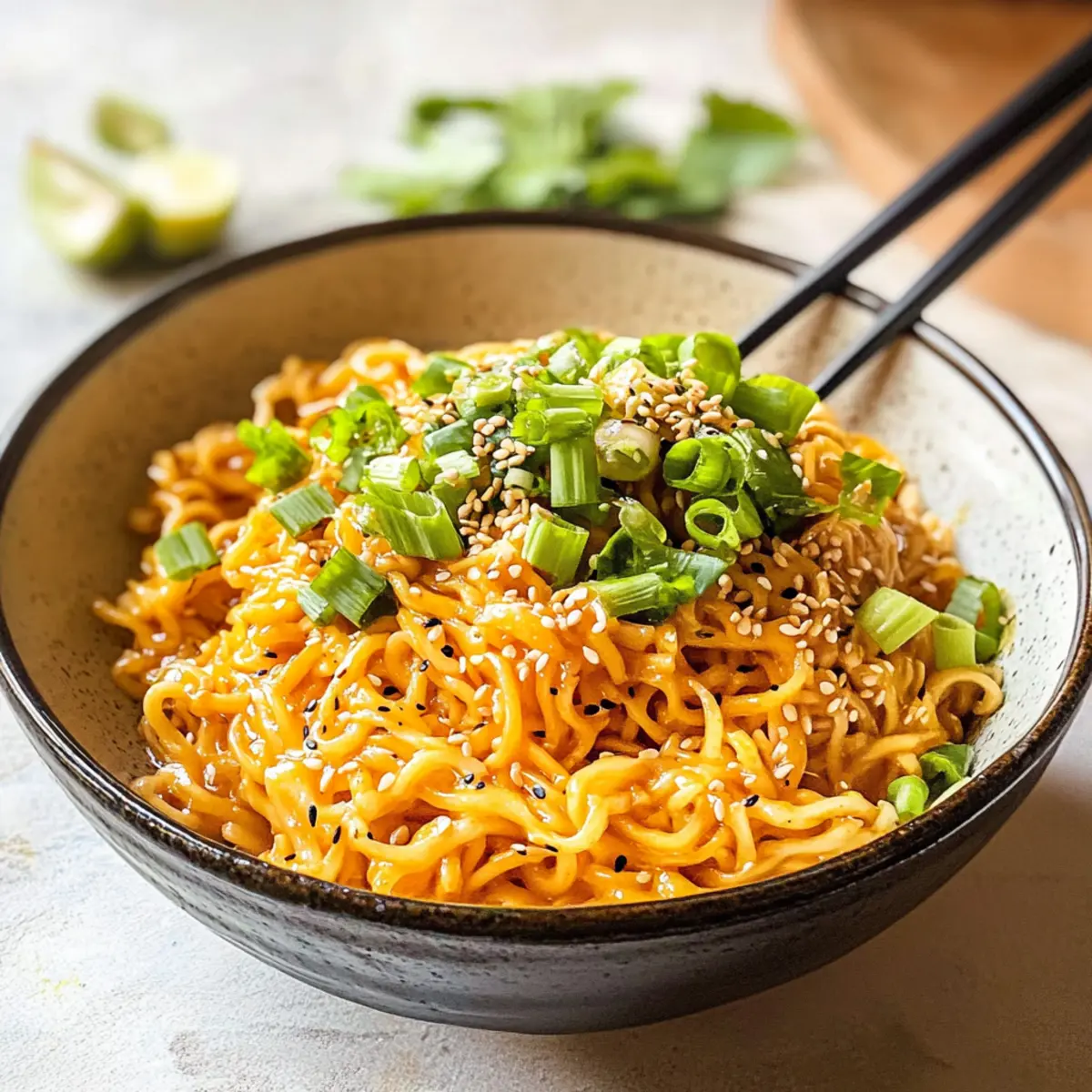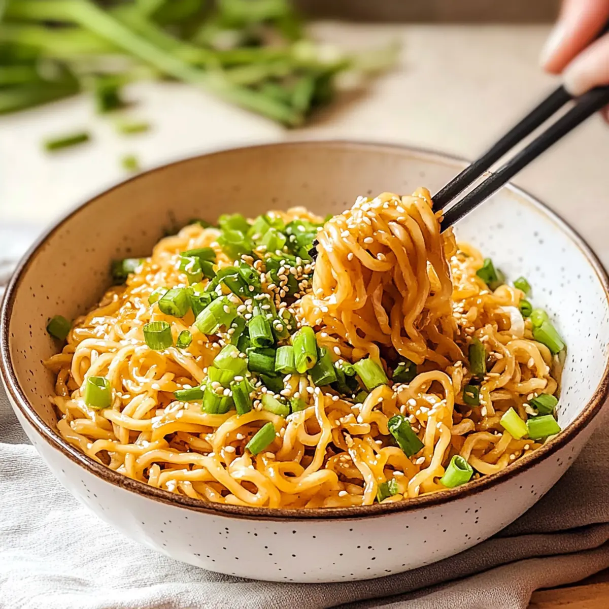 Nimm die Pfanne vom Herd und füge die in Ringe geschnittenen Frühlingszwiebeln zur Mischung hinzu. Rühre die Zwiebeln vorsichtig unter die Nudeln, um eine frische Geschmackskombination zu erreichen. Serviere die scharfen Miso-Nudeln sofort und streue nach Belieben Sesamkörner darüber, um das Gericht visuell ansprechend zu gestalten.