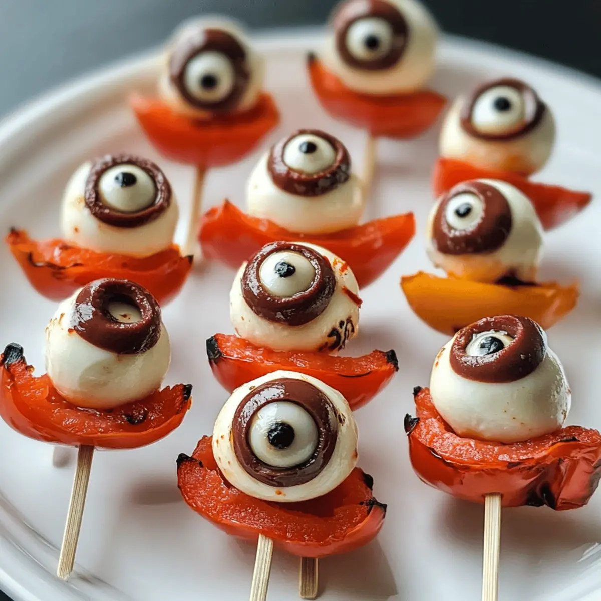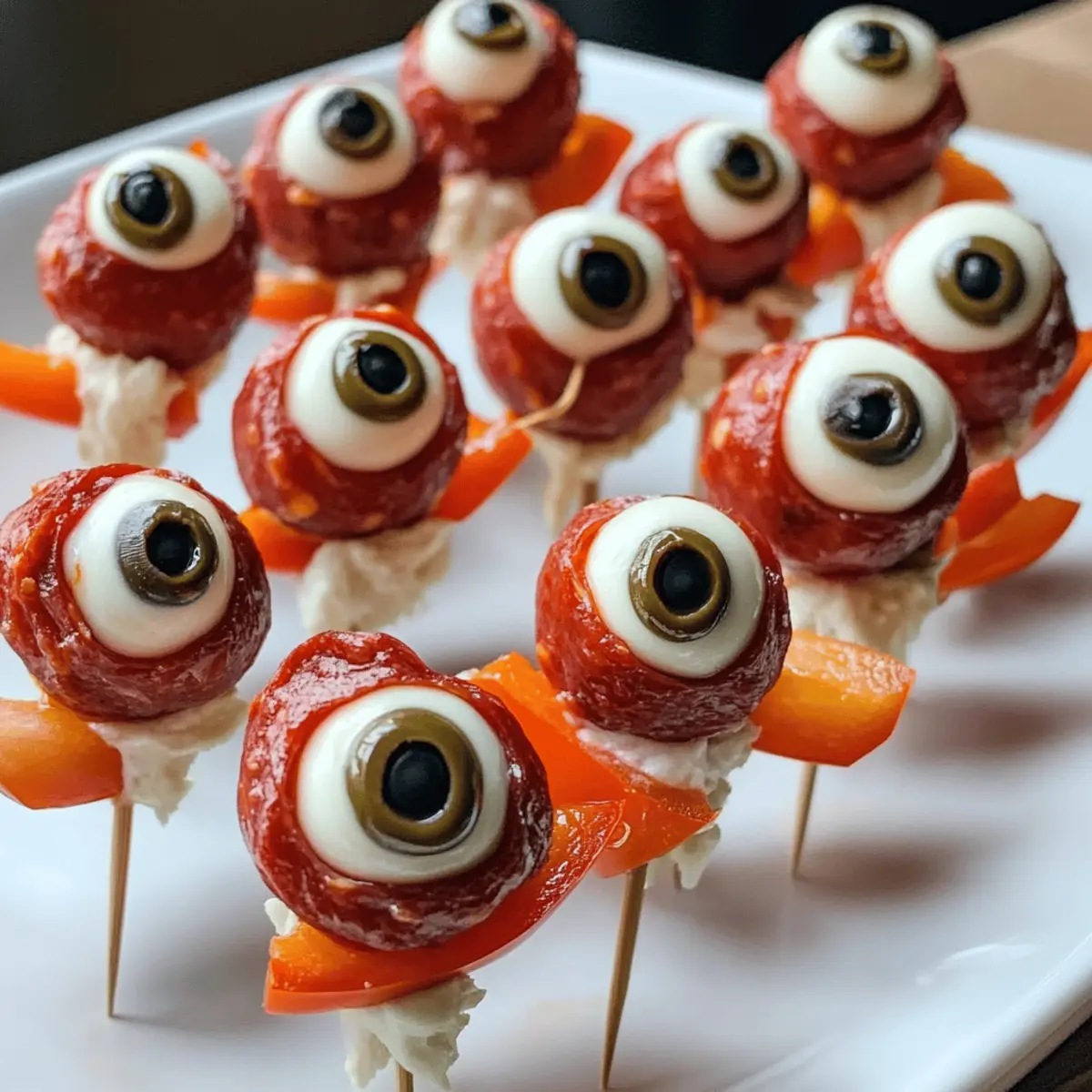 Kürbisse und Spinnweben hüllen die Straßen ein, während die Aufregung von Halloween in der Luft liegt. Genau jetzt ist der perfekte Zeitpunkt, um eure Freunde mit etwas Unheimlichem und Leckerem zu überraschen! Meine Spieße mit Salamieaugen sind nicht nur ein visuelles Highlight, sondern auch ein köstlicher Genuss, der euch in nur 20 Minuten ins Gruselfieber versetzt. Die Kombination aus cremigem Mozzarella, würzigem Pepperoni und einer bunten Paprikadarstellung lässt diese Appetizer nicht nur spielerisch aussehen, sondern sind auch blitzschnell zubereitet. Ob für eine gruselige Halloween-Party oder einfach zum Genießen beim Filmabend – sie sorgen definitiv für Spaß und Gesprächsstoff. Seid ihr bereit, eure Gäste mit diesem schaurig-schönen Snack zu begeistern? Warum sind diese Spieße so besonders? Schnell und einfach: In nur 20 Minuten sind diese schaurigen Snacks bereit zum Servieren – perfekt, wenn die Zeit drängt! Köstliche Aromen: Die Kombination aus cremigem Mozzarella und würzigem Pepperoni sorgt für einen unverwechselbaren Geschmack. Visuelles Highlight: Diese Spieße sind nicht nur lecker, sondern auch ein echter Hingucker auf jeder Halloween-Party! Vielfältige Variationen: Probiert verschiedene Käsesorten oder Olive-Varianten aus, um neue Geschmäcker zu entdecken. Gesellige Snacks: Ideal als Gesprächsanlass – jeder wird begeistert sein, ein Stück „Augen“ zu genießen! Verbessert eure Halloween-Vorbereitungen mit weiteren kreativen Ideen wie einem Halloween-Buffet, um eure Gäste zu überraschen. Zutaten für Spieße mit Salamieaugen • Hier sind die notwendigen Zutaten für dieses gruselige Snack-Erlebnis! Für die Spieße Mozzarella-Bällchen – Sie bilden die Basis der „Augen“ und sorgen für Cremigkeit; für eine ähnliche Wirkung können Mini-Bocconcini verwendet werden. Rote Paprika – Sie fügt eine lebendige Farbe hinzu und simuliert einen dekorativen „Bluteffekt“; getrocknete Chilischoten bringen einen zusätzlichen Kick. Kalamata-Oliven – Sie kreieren die „Augen“ auf den Mozzarella-Bällchen; grüne Oliven können für einen lustigen cartoonhaften Look verwendet werden. Pepperoni-Streifen – Sie sorgen für Geschmack und Struktur; bereits geschnittene Pepperoni sparen Zeit in der Vorbereitung. Für die Dekoration Schwarze Servierplatte – Für eine dramatische Präsentation der Spieße bei eurer Halloween-Party. Diese Spieße mit Salamieaugen sind nicht nur einfach zuzubereiten, sondern verleihen auch jedem Halloween-Event einen unheimlich-leckeren Touch. Schritt-für-Schritt-Anleitung für Spieße mit Salamieaugen Step 1: Mozzarella vorbereiten Schneide in jeden Mozzarella-Ball kleine Einkerbungen, um Augenhöhlen zu formen. Dies sorgt für das ikonische „Augen“-Aussehen. Nutze ein scharfes Messer und arbeite vorsichtig, um die Form zu erhalten. Dieser Schritt sollte nicht länger als 5 Minuten dauern und kann auf einem stabilen Schneidebrett durchgeführt werden. Step 2: Die Augen machen Hacke die Kalamata-Oliven sehr fein und fülle sie in die Einkerbungen der Mozzarella-Bälle. Achte darauf, dass eine gute Menge Olive in jeder Höhle sitzt, damit die „Augen“ gut sichtbar sind. Dieser Vorgang sollte ebenfalls zügig gehen und etwa 5 Minuten in Anspruch nehmen. Step 3: Pepperoni schneiden Schneide die Pepperoni in kleine Stücke und dünne Streifen. Du brauchst sowohl die kleinen Stücke für die Anordnung als auch die langen Streifen für die Spieße. Leg die geschnittenen Pepperoni beiseite und achte während des Schneidens darauf, gleichmäßige Stücke zu erzielen – für ein ansprechendes Aussehen. Dieser Schritt kann in 5 Minuten erledigt werden. Step 4: Paprika dekorieren Schneide die rote Paprika in Wedges oder kleine Stücke zur Dekoration. Diese sorgen nicht nur für Farbe, sondern geben den Spießen auch einen interessanten „blutigen“ Effekt. Die kleine Mühe, die du in die Paprika steckst, wird die gesamte Präsentation aufwerten. Plane hier etwa 5 Minuten ein. Step 5: Spieße zusammenstellen Beginne das Zusammenstecken der Spieße, indem du mit einem Stück roter Paprika startest. Füge dann ein Stück Pepperoni, einen Mozzarella-Ball mit Olive, eine dickere Scheibe Pepperoni, gefolgt von weiteren dünnen Pepperoni, und beende mit einem weiteren Mozzarella-Ball. Jeder Spieß sollte bunt und gruselig aussehen. Dies könnte etwa 10 Minuten dauern. Step 6: Kühlen und servieren Lasse die fertigen Spieße für mindestens 10 Minuten im Kühlschrank kühlen, bevor du sie auf einem dekorativen Halloween-Teller servierst. Dies gibt den Aromen Zeit, sich zu verbinden, und sorgt für eine erfrischende Präsentation. Achte darauf, die Spieße schnell zu servieren, um die beste Frische zu gewährleisten. Was passt zu Spießen mit Salamieaugen? Eine schaurige Halloween-Feier braucht nicht nur gruselige Snacks, sondern auch ansprechende Begleiter für ein unvergessliches Erlebnis. Kürbiscremesuppe: Diese samtige Suppe bringt einen warmen, saisonalen Geschmack und ergänzt die herzhafte Note der Spieße. Eine wärmende Kürbiscremesuppe kann wunderbar als Vorspeise dienen und die Geschmacksknospen auf weihnachtliche Aromen einstimmen. Geröstete grüne Bohnen: Die knackige Textur der Bohnen bietet einen frischen Kontrast zu den cremigen Spießen mit Salamieaugen. Ein Hauch von Knoblauch und Zitrone kann die Bohnen perfekt aufpeppen und bringt zusätzliche Frische auf den Tisch. Cremiger Kartoffelsalat: Dieser füllende Salat bietet eine wunderbar cremige Ergänzung zu den schaurigen Snacks und ist super einfach zuzubereiten. Er sorgt für eine familiäre Stimmung und ist immer ein Hit bei Gästen jeden Alters. Apfel-Mandel-Salat: Dieser knackige Salat mit süßen Äpfeln und nussigen Mandeln sorgt für ein harmonisches Zusammenspiel der Aromen. Erfrischend und leicht, passt er perfekt zu den herzhaften Spießen und bringt eine fruchtige Note ins Spiel. Halloween-Cocktail: Ein blutrotes Getränk, das m