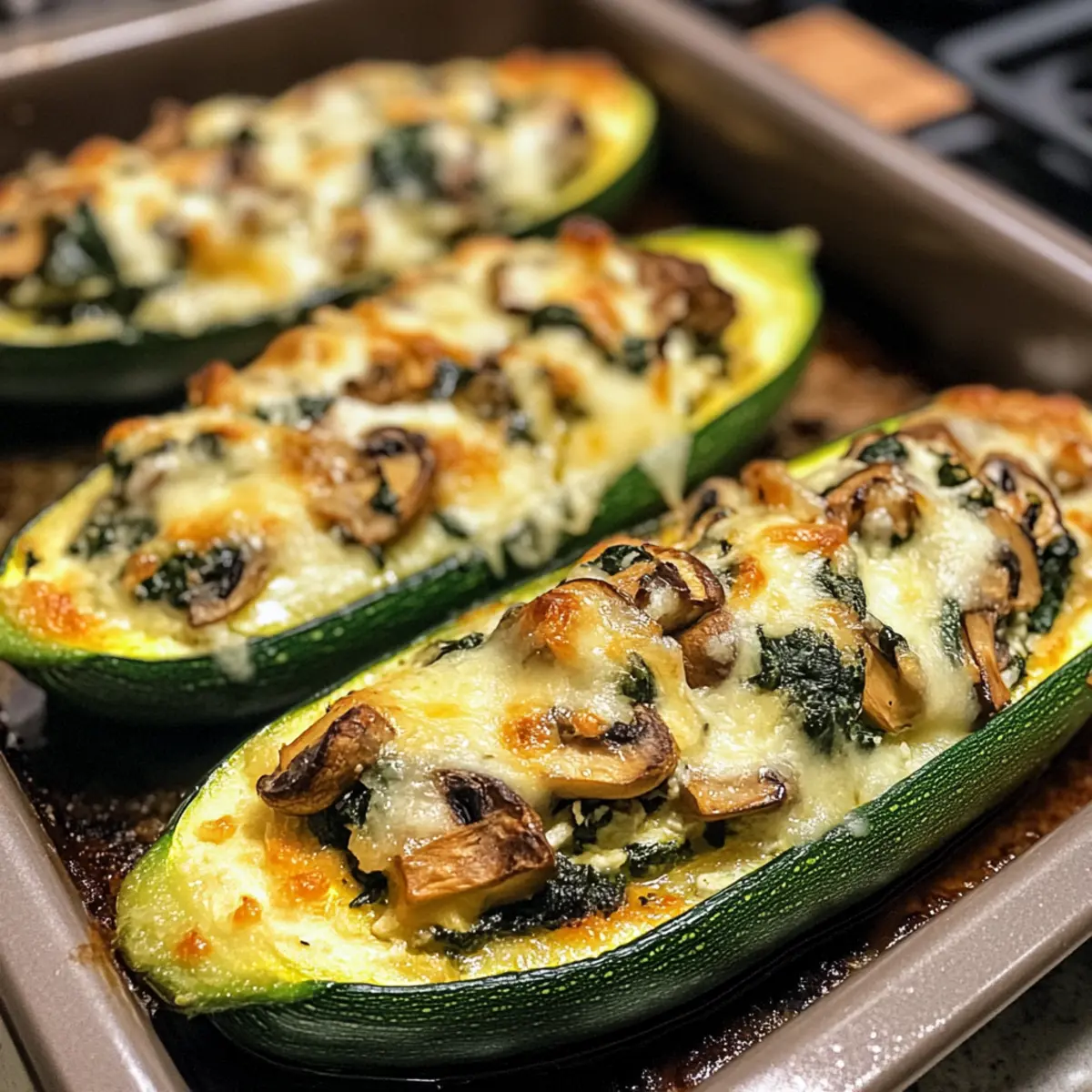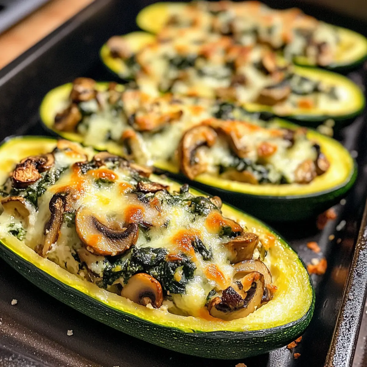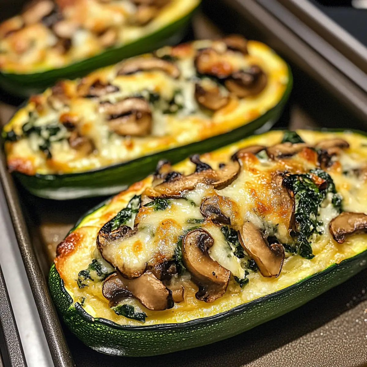 Die sanften Wellen des Mittelmeers scheinen in meiner Küche zu wehen, während ich diese köstlichen Spinat, Pilz und Ricotta gefüllten Zucchini-Boote zubereite. Sie sind nicht nur ein wahrhaftiger Genuss für das Auge, sondern auch ein unvergleichliches Geschmackserlebnis! Dieses Rezept vereint frische Zutaten und schafft eine gesunde, vegetarische Mahlzeit, die sowohl leicht als auch sättigend ist. Mit ihrem cremigen Ricotta-Füllung, ergänzt durch erdige Pilze und frischen Spinat, bringen diese Zucchini-Boote eine wunderschöne mediterrane Note auf den Tisch. Und das Beste daran? Sie sind ausgesprochen einfach zuzubereiten und perfekt für die kommenden Wochenenden, wenn wir gemeinsam am Tisch sitzen möchten. Neugierig, wie man diese leckeren Boote noch variieren kann? Lass uns gemeinsam in die Details eintauchen! Warum sind diese Zucchini-Boote so besonders? Einfachheit: Die Zubereitung dieser Zucchini-Boote ist kinderleicht und erfordert keine besonderen Kochkünste! Vielfalt: Sie können das Rezept ganz nach Ihrem Geschmack anpassen und frische Kräuter oder verschiedene Käsesorten hinzufügen. Wie wäre es mit ein wenig Nutritional Yeast, um das Gericht noch herzhaft zu machen? Gesund: Mit frischen, nährstoffreichen Zutaten ist dies ein tolles low-carb Gericht, das Sie und Ihre Familie lieben werden. Sättigend: Diese gefüllten Zucchini sind leicht, aber dennoch sättigend und können sowohl als Hauptgericht als auch als Beilage serviert werden. Aromatisch: Die Kombination aus cremigem Ricotta, erdigen Pilzen und frischem Spinat sorgt für ein unvergleichliches Geschmackserlebnis – perfekt für jedes mediterrane Menü! Spinat, Pilz und Ricotta gefüllte Zucchini-Boote Zutaten Entdecken Sie die wichtigsten Zutaten für das Spinat, Pilz und Ricotta gefüllte Zucchini-Boote Rezept, das Ihre Geschmacksknospen verzaubern wird! Für die Zucchini-Boote Zucchini – dient als perfekte Basis; wählen Sie mittelgroße Zucchini für die optimale Größe. Olivenöl – ideal zum Sautieren der Gemüse; Avocadoöl ist eine schmackhafte Alternative. Knoblauch – sorgt für aromatischen Geschmack; frisch ist am besten, aber auch Knoblauchpulver funktioniert. Zwiebel – bringt Süße in die Füllung; Schalotten können für einen milderen Geschmack verwendet werden. Für die Füllung Champignons – verleihen der Füllung eine erdige Note; verwenden Sie Button- oder Braune Champignons. Frischer Spinat – nährstoffreich und bringt frische Farbe; kann durch Grünkohl ersetzt werden, aber die Kochzeit anpassen. Ricotta-Käse – sorgt für eine cremige Textur; alternativ können Sie Hüttenkäse oder vegane Ricotta verwenden. Parmesan-Käse – hebt das Geschmacksprofil an; Nährhefe ist eine großartige laktosefreie Option. Würze und Garnierung Rote Pfefferflocken – für eine optionale Schärfe; nach Belieben anpassen oder für ein milderes Gericht weglassen. Salz und Pfeffer – grundlegende Gewürze nach Geschmack. Mit diesen Zutaten wird das Spinat, Pilz und Ricotta gefüllte Zucchini-Boote Rezept zu einem echten Highlight auf Ihrem Tisch! Schritt-für-Schritt-Anleitung für das Spinat, Pilz und Ricotta gefüllte Zucchini-Boote Rezept Step 1: Ofen vorheizen Heizen Sie den Ofen auf 190°C vor und legen Sie ein Backblech mit Backpapier aus. Diese Vorbereitung ist wichtig, damit die Zucchini-Boote gleichmäßig garen und nicht ankleben. Der Ofen sollte bereit sein, wenn die Zucchini gefüllt sind. Step 2: Zucchini vorbereiten Halbieren Sie die Zucchini der Länge nach und verwenden Sie einen Löffel, um das Fruchtfleisch auszuschöpfen und hölzerne “Boote” zu formen. Achten Sie darauf, die Schale nicht zu durchstechen, da sie die Füllung festhalten muss. Legen Sie die Zucchinihälften auf das Backblech. Step 3: Gemüse sautieren Erhitzen Sie in einer Pfanne einen Esslöffel Olivenöl bei mittlerer Hitze. Geben Sie die gehackte Zwiebel und den fein gehackten Knoblauch hinein und sautieren Sie das Ganze für etwa 2 Minuten, bis es aromatisch ist. Dies gibt der Füllung eine köstliche Basis und weckt die Aromen. Step 4: Pilze hinzufügen Fügen Sie die gewürfelten Champignons in die Pfanne hinzu und braten Sie sie für 3-4 Minuten, bis sie weich sind und ihre Flüssigkeit verloren haben. Rühren Sie dabei regelmäßig um, damit sie gleichmäßig garen. Diese erdigen Pilze harmonieren perfekt mit der Füllung der Spinat, Pilz und Ricotta gefüllten Zucchini-Boote. Step 5: Spinat hinzufügen Incorporate den frischen Spinat in die Pfanne und kochen Sie ihn etwa 2 Minuten lang, bis er zusammenfällt. Rühren Sie regelmäßig um, damit der Spinat gleichmäßig welkt und seine leuchtende Farbe behält. Dies sorgt für eine gesunde und farbenfrohe Füllung. Step 6: Ricotta und Gewürze einmischen Nehmen Sie die Pfanne vom Herd und fügen Sie die Ricotta- und Parmesan-Käse hinzu. Mischen Sie alles gut, bis eine cremige Füllung entsteht. Würzen Sie die Mischung mit roten Pfefferflocken, Salz und Pfeffer nach Geschmack. Diese cremige Mischung wird die Zucchini perfekt bereichern. Step 7: Zucchini füllen Füllen Sie die vorbereiteten Zucchinihälften großzügig mit der Ricotta-Mischung. Achten Sie darauf, die Zucchini gut zu füllen, damit jede Hälfte einen köstlichen Biss erhält. Dies ist der entscheidende Schritt für die finale Geschmacksintensität unserer gefüllten Zucchini-Boote. Step 8: Zucchini backen Platzieren Sie die gefüllten Zucchini auf dem Backblech und backen Sie sie für 20-25 Minuten im Ofen. Sie sind fertig, wenn die Zucchini zart sind und die Füllung goldbraun ist. Dies gibt einen schönen, appetitanregenden Anblick und sorgt für einen herzhaften Geschmack. Step 9: Anrichten Garnieren Sie die heißen Zucchini-Boote vor dem Servieren mit frischem Basilikum für zusätzliche Frische und einen Hauch von Farbe. Diese finalen Zutaten heben das Spinat, Pilz und Ricotta gefüllte Zucchini-Boote Rezept auf das nächste Level und machen es perfekt für jedes Essen. 