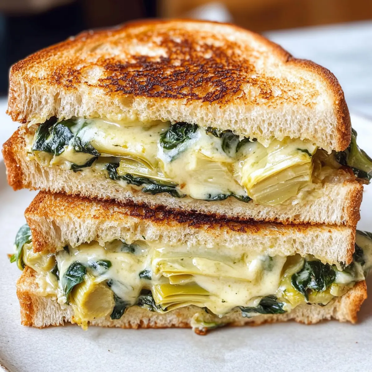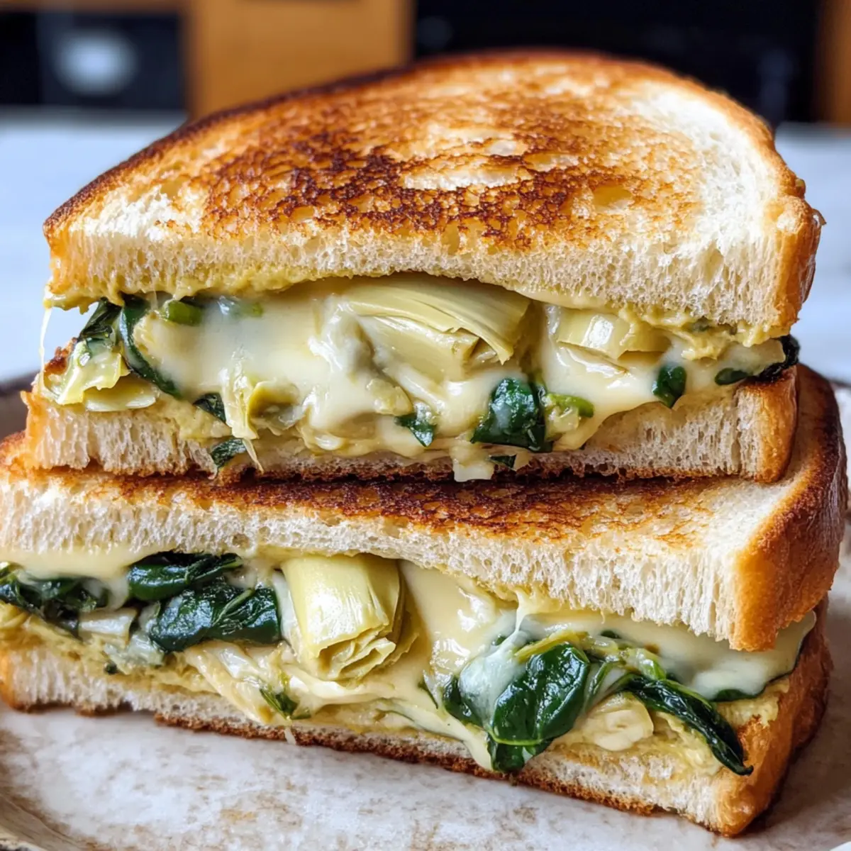 Es war ein regnerischer Nachmittage, als ich die perfekte Lösung für die Untätigkeit in der Küche fand: den Spinat- und Artischocken-Schmelz. Inspiriert von dem beliebten Spinat-Artischocken-Dip bringt dieses Rezept die geliebte Kombination aus cremigem Käse, frischem Spinat und herzhaften Artischocken auf ein neues Level — zwischen zwei perfekt gerösteten Brotscheiben. Diese köstlichen Sandwiches sind nicht nur ein schneller Genuss, sondern auch eine großartige vegetarische Option für jede Mahlzeit. Egal, ob du deine Familie oder Freunde verwöhnen möchtest, oder einfach nur Lust auf etwas Herzhaftes hast, dieses Rezept wird garantiert begeistern und sich sogar für glutenfreie Varianten anpassen lassen. Bist du bereit, deinem nächsten Mittagessen einen köstlichen Twist zu verleihen? Warum solltest du diesen Spinat-Schmelz probieren? Komfort auf höchstem Niveau: Diese Spinat- und Artischocken-Schmelze sind die perfekte Wahl für jeden Käseliebhaber. Einfache Zubereitung: Mit nur wenigen Zutaten und klaren Anweisungen kannst du in kürzester Zeit ein herzhaftes Gericht zaubern. Kreative Variationen: Experimentiere mit verschiedenen Käsesorten oder füge Zutaten wie getrocknete Tomaten hinzu für zusätzliche Farbtupfer. Harmonische Geschmäcker: Die Kombination aus cremigem Käse und frischem Gemüse sorgt für ein unvergessliches Geschmackserlebnis. Vielseitige Beilage: Kombiniere dein Sandwich mit einer einfachen Salat- oder Tomatensuppe für das perfekte Mittagessen. Geselliges Kochen: Ideal für Familienessen oder Einladungen, wird dieses Rezept alle begeistern! Spinat- und Artischocken-Schmelz Zutaten Für die Füllung Butter – sorgt für ein reichhaltiges Aroma und hilft, das Brot goldbraun zu rösten. Verwende Olivenöl für eine milchfreie Option. Knoblauch (2 Zehen, gehackt) – bringt intensiven Geschmack in die Füllung. Frischer Knoblauch ist für den besten Geschmack empfohlen. Zwiebel (1/4 Tasse, gehackt) – fügt der Füllung Süße und Tiefe hinzu. Alternativ kannst du Schalotten oder Frühlingszwiebeln verwenden. Peperoncini (1/4 Tasse, fein gehackt) – sorgt für eine würzige Note. Bei milderem Geschmack kann dieser auch weggelassen werden. Frischkäse (2 Unzen) – verleiht der Füllung Cremigkeit. Für eine milchfreie Version nutze veganen Frischkäse. Artischockenherzen (1 Dose, 15 Unzen) – sorgt für Textur und Geschmack. Frische oder gefrorene Artischocken können ebenfalls verwendet werden. Babyspinat (8 Unzen) – bietet Frische und Nährstoffe. Kann auch durch Grünkohl oder Mangold ersetzt werden. Mozzarella (6 Unzen, gerieben) – sorgt für die schmelzende und fadenartige Textur. Probiere alternativ Provolone oder Gruyère für unterschiedliche Aromen. Cheddar (5 Unzen, gerieben) – fügt eine kräftige Note hinzu; hier kann auch weißer Cheddar verwendet werden. Parmesan (2 Unzen, gerieben) – verstärkt das Gesamtaroma; ersetze ihn mit Pecorino Romano für einen intensiveren Geschmack. Salz (1/4 Teelöffel) – hebt alle Aromen hervor. Nach Geschmack anpassen. Schwarzer Pfeffer (1/4 Teelöffel) – sorgt für eine milde Schärfe; kann durch rote Pfefferflocken für mehr Würze ersetzt werden. Für das Brot Sauerteigbrot (8 Scheiben) – sorgt für den idealen Crunch und die leichten Säurenoten. Glutenfreies Brot kann als Ersatz für spezielle Ernährungsbedürfnisse verwendet werden. Schritt-für-Schritt-Anleitung für Spinat- und Artischocken-Schmelz: Käsekomfortessen Step 1: Butter und Zwiebeln anbraten Erhitze 2 Esslöffel Butter in einer Pfanne bei mittlerer bis niedriger Hitze. Füge den gehackten Knoblauch und die Zwiebeln hinzu und brate sie 3-4 Minuten lang an, bis sie weich und duftend sind. Achte darauf, dass die Temperatur nicht zu hoch ist, damit der Knoblauch nicht verbrennt. Step 2: Peperoncini und Frischkäse hinzufügen Rühre die fein gehackten Peperoncini in die Pfanne und koche sie 2 Minuten lang mit den Zwiebeln. Anschließend füge den Frischkäse hinzu und rühre, bis dieser geschmolzen und gut mit den anderen Zutaten vermischt ist. Die Füllung sollte jetzt cremig und aromatisch sein. Step 3: Artischocken und Spinat einrühren Füge die abgetropften Artischockenherzen, den Babyspinat, Salz und Pfeffer hinzu. Rühre die Mischung gut um und koche weiter, bis der Spinat zusammengefallen ist, etwa 4 Minuten. Die Füllung sollte jetzt eine lebendige Farbe und eine angenehm lockere Textur haben. Step 4: Käse unterrühren Nimm die Pfanne vom Herd und mische die geriebenen Mozzarella-, Cheddar- und Parmesan-Käsesorten unter die Füllung, bis sie gleichmäßig verteilt sind. Diese Mischung sollte jetzt dick und schmelzbar sein, perfekt für deinen Spinat- und Artischocken-Schmelz. Step 5: Brot vorbereiten Bestreiche eine Seite jeder Brotscheibe mit Butter. Auf der unbutterten Seite von der Hälfte der Scheiben verteilst du etwa 1/3 Tasse der Käsemischung gleichmäßig. Lege dann die restlichen Brotscheiben mit der buttrigen Seite nach außen darauf und drücke sie leicht zusammen. Step 6: Sandwiches braten Erhitze eine große Pfanne oder ein Grillgerät bei mittlerer bis niedriger Hitze. Lege die Sandwiches in die Pfanne und brate sie 6 Minuten lang, bis die Unterseite goldbraun und knusprig ist. Wende die Sandwiches vorsichtig und brate auch die andere Seite, bis sie ebenfalls goldbraun wird. Step 7: Servieren und genießen Sobald die Sandwiches fertig sind, schneide sie in der Mitte durch und serviere sie sofort. Diese Spinat- und Artischocken-Schmelze sind nicht nur ein toller Leckerbissen, sondern auch eine köstliche Option für dein nächstes Mittagessen. Was passt zu Spinat- und Artischocken-Schmelz? Entdecke die perfekten Begleiter für dein köstliches Sandwich und genieße eine rundum harmonische Mahlzeit. Frischer Garten-Salat: Ein leichter, knackiger Salat mit saisonalem Gemüse bringt Frische und sorgt für einen schönen Kontrast zu dem cremigen Schmelz. Tomatensuppe: Eine warme, saftige Tomatensupp