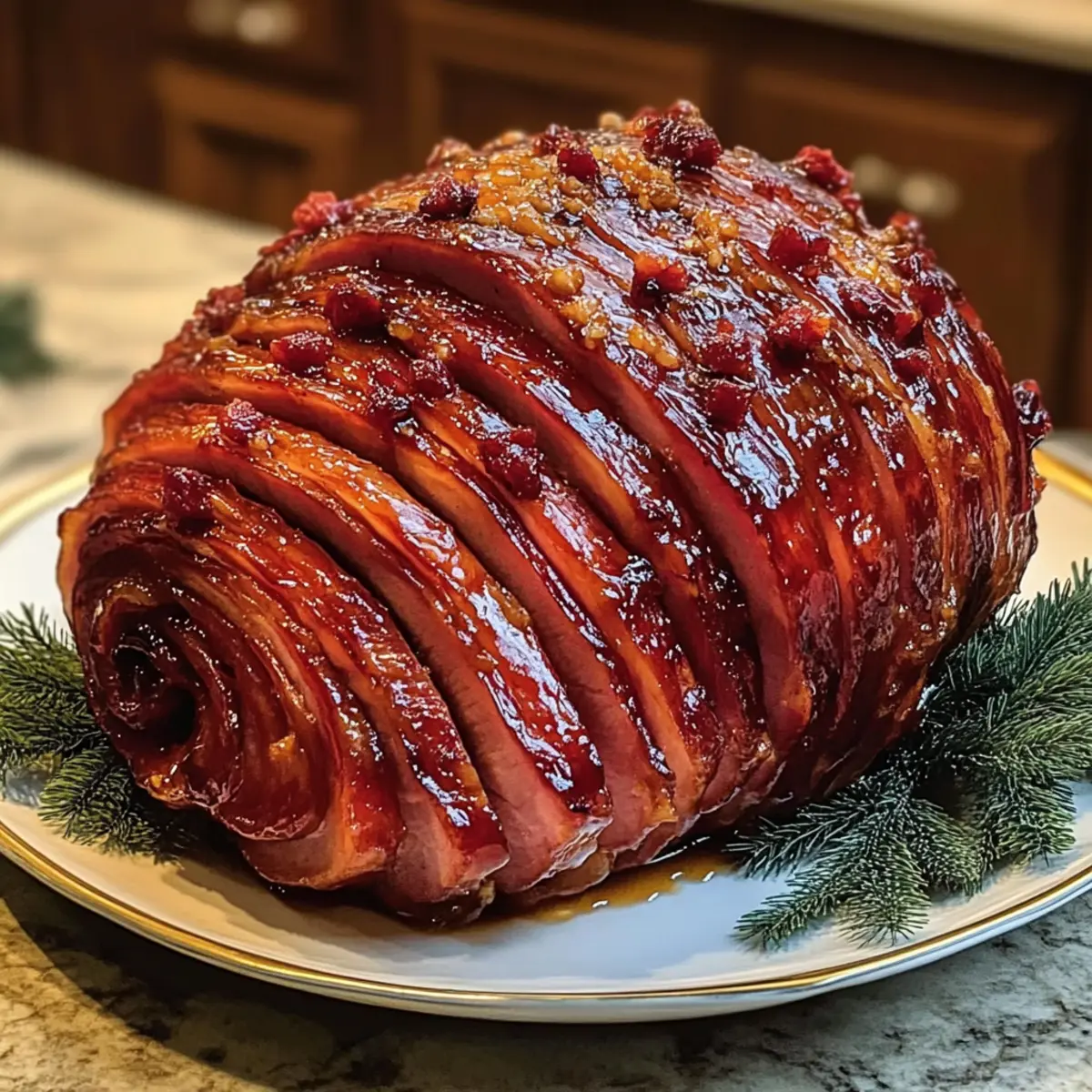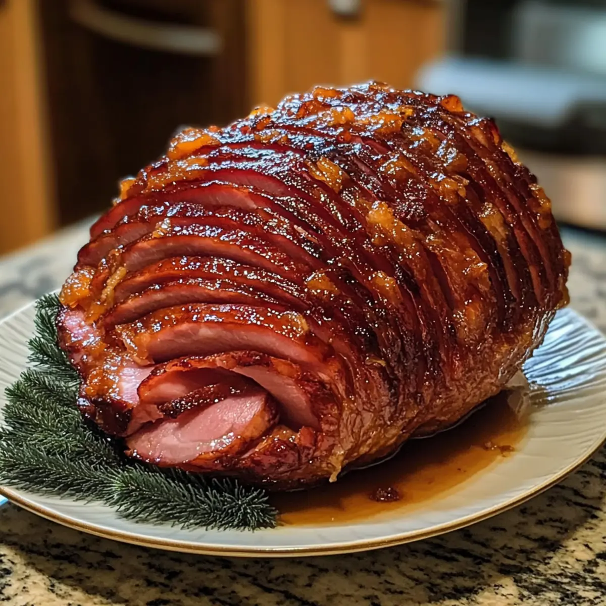 Ein verführerischer Duft weht durch die Küche und zaubert sofort festliche Stimmung, wenn ich den glänzenden, süßen Glasierte Schinken aus dem Ofen hole. Dieser Süßer glasierter Schinken wird mit einer perfekt karamellisierten Honig-Zucker-Glasur verfeinert, die sich harmonisch mit aromatischen Gewürzen verbindet. Saftig, zart und unendlich köstlich – er ist der ultimative Mittelpunkt jedes Festes und wird alle Gäste an deinem Feiertagstisch begeistern. Ob für ein großes Familientreffen oder ein romantisches Abendessen, dieses Rezept vereint die Vorteile von einfacher Zubereitung und beeindruckender Optik. Hast du schon einmal darüber nachgedacht, wie viel Freude ein solch hinreißendes Gericht bringen kann? Lass uns gemeinsam eintauchen und diesen festlichen Klassiker zubereiten! Warum ist dieser Schinken so besonders? Einzigartig im Geschmack: Die Kombination aus Honig und braunem Zucker sorgt für eine unwiderstehliche Süße, die mit den warmen Gewürzen harmoniert. Einfach zuzubereiten: Selbst unter Zeitdruck kannst du diesen Schinken mit minimalem Aufwand perfekt zubereiten. Für jeden Anlass: Egal ob Weihnachten, Ostern oder ein Familienfest – dieser Schinken wird zum Gesprächsthema des Abends. Vielfältig anpassbar: Füge deinem Rezept mit einer Keto-freundlichen Glasur eine gesunde Note hinzu oder experimentiere mit internationalen Aromen für einen einzigartigen Twist. Ein Fest für die Sinne: Der verführerische Duft und die glänzende Oberfläche machen bereits beim Servieren Eindruck! Süßer glasierter Schinken Zutaten Für den Schinken • Bone-in Spiral-cut Holiday Roast – Wähle einen 8-10 Pfund schweren Braten für optimale Saftigkeit und Geschmack. Für die Glasur • Light Brown Sugar – Sorgt für eine köstliche Süße; dunkler Zucker kann für mehr Tiefe verwendet werden. • Pure Honey – Bringt natürliche Süße rein und hilft der Glasur zu haften; probiere für Abwechslung auch Ahornsirup. • Dijon Mustard – Verleiht eine angenehme Säure, die die Süße ausbalanciert; ein einfacher Ersatz ist gelber Senf. • Apple Cider Vinegar – Fügt Säure hinzu und vertieft den Geschmack; alternativer ist weißer Essig. • Freshly Squeezed Orange Juice – Gibt Frische und Süße; du kannst auch Zitronensaft für eine zesty Note verwenden. • Unsalted Butter – Bringt Reichhaltigkeit und verbessert die Konsistenz der Glasur; ersetze sie durch Margarine für eine milchfreie Version. • Ground Cinnamon, Cloves, Ginger – Fügen Wärme und aromatische Gewürznoten hinzu; frisch geriebener Ingwer verstärkt den Geschmack. • Black Pepper & Cayenne Pepper (optional) – Geben Tiefe und Wärme; lass das Cayenne weg für eine mildere Variante. • Whole Cloves – Zum Stecken des Schinkens; optional für extra Aroma und Dekoration. • Fresh Rosemary Sprigs – Für die Garnitur, die Geschmack und optische Attraktivität hinzufügt. Dieser Süßer glasierter Schinken ist nicht nur der Star des Festmahls, sondern bereichert auch jede Zusammenkunft mit seiner einzigartigen Kombination aus Aromen und Texturen! Schritt-für-Schritt-Anleitung für Süßer glasierter Schinken Step 1: Ofen vorheizen Heize deinen Ofen auf 163°C (325°F) vor. Lege eine Bratform mit Alufolie aus und platziere einen Rost darin. Diese Vorbereitung sorgt dafür, dass der Schinken gleichmäßig gart und die Glasur perfekt haften bleibt. Step 2: Schinken vorbereiten Nimm den Süßen glasierten Schinken 30 Minuten vor dem Garen aus dem Kühlschrank, um ihn auf Zimmertemperatur zu bringen. Tupfe die Oberfläche gründlich mit Küchenpapier trocken, um überschüssige Feuchtigkeit zu entfernen und eine knusprige Glasur zu ermöglichen. Step 3: Glasur herstellen In einem mittelgroßen Topf kombinierst du braunen Zucker, Honig, Dijon-Senf, Apfelessig und frisch gepressten Orangensaft. Erwärme die Mischung bei mittlerer Hitze und rühre, bis sich der Zucker vollständig aufgelöst hat. Dies dauert etwa 5 Minuten und sorgt für eine köstliche, süße Basis für die Glasur. Step 4: Butter und Gewürze hinzufügen Füge die Butter zusammen mit dem Zimt, den Nelken und dem Ingwer zur Glasur hinzu. Reduziere die Hitze auf niedrig und lasse die Mischung 8-10 Minuten sanft köcheln, bis sie leicht eingedickt ist. Achte darauf, die Glasur gelegentlich umzurühren, damit sie nicht anbrennt. Step 5: Schinken glasieren und vorbereiten Setze den Schinken mit der flachen Seite nach unten auf den Rost. Wenn der Schinken nicht spiralgeschnitten ist, ritze die Oberfläche in ein Rautenmuster ein. Du kannst an den Schnittstellen ganze Nelken einsetzen, um das Aroma zu verstärken und eine ansprechende Optik zu erzielen. Step 6: Schinken abdecken Decke den Schinken locker mit Alufolie ab und gieße 1 Tasse Wasser in den Boden der Bratform. Dies sorgt dafür, dass der Schinken saftig bleibt, während er im Ofen gart. Die Folie sollte genug Schutz bieten, aber auch den Dampf ablassen können. Step 7: Schinken rösten Roste den Süßen glasierten Schinken im vorgeheizten Ofen und lasse ihn nach 45 Minuten ohne Folie weitergaren. Baste den Schinken alle 15-20 Minuten mit der vorbereiteten Glasur, um eine reichhaltige Geschmacksschicht zu bilden. Insgesamt sollte der Schinken etwa 35-55 Minuten unbedeckt garen. Step 8: Kerntemperatur prüfen Überprüfe die Innentemperatur des Schinkens mit einem Fleischthermometer, bevor du ihn aus dem Ofen nimmst. Die Zieltemperatur von 60°C (140°F) sollte erreicht sein, um sicherzustellen, dass er perfekt gegart ist. Decke den Schinken nach dem Garen mit Folie ab und lasse ihn 15-20 Minuten ruhen, bevor du ihn aufschneidest. Step 9: Glasur eindicken Koche die übrig gebliebene Glasur nochmals kurz auf, um sie einzudicken. Dies ist nicht nur eine köstliche Sauce, sondern auch ein hervorragendes Topping für die Servierung. Drucke die Glasur auf dem warmen Schinken aus, um jedem Stück eine süße, glänzende Note zu verleihen. Was passt gut zu Süßer glasierter Sc