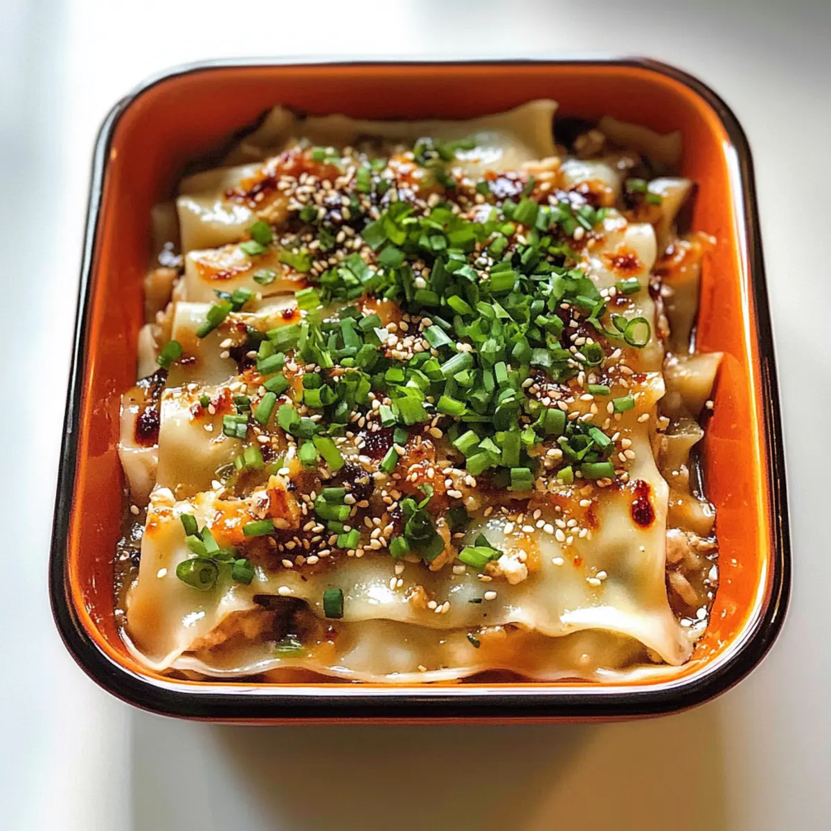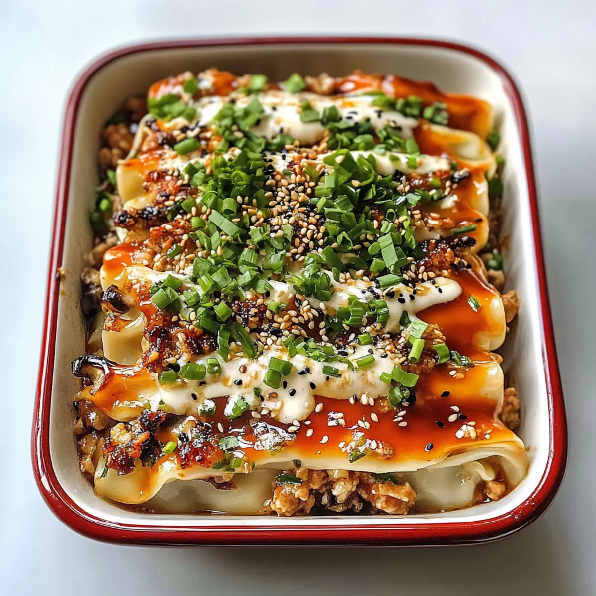 Hast du schon einmal von der aufregenden Kombination aus Teigtaschen und Lasagna gehört? Diese Viral Dumpling Lasagna bringt die Aromen Chinas direkt auf deinen Teller und sorgt für ein unvergessliches Geschmackserlebnis! Dieses Rezept vereint zarte Schichten aus gewürztem Hühnerfleisch und luftigen Dumpling-Teigblättern, die im Dampf garen, und das Beste ist: Es ist ein schnelles und einfaches Gericht, das jede Menge Bewunderung bei deinen Freunden oder der Familie weckt. Ob für ein gemütliches Abendessen oder als Teil eines festlichen Buffets – diese Teigtaschen-Lasagne ist nicht nur ein absoluter Crowd-Pleaser, sondern auch eine tolle Möglichkeit, dem alltäglichen Fast Food ein Ende zu setzen. Bist du bereit, deine Suiten in die Welt der asiatischen Küche zu entführen? Warum wirst du diese Teigtaschen-Lasagne lieben? Einzigartige Kombination: Diese Teigtaschen-Lasagne vereint die besten Elemente zweier Klassiker und bringt einen aufregenden Twist in dein Essensrepertoire. Zeitsparend und unkompliziert: Mit dieser Rezeptur hast du in kurzer Zeit ein köstliches Gericht, das völlig unkompliziert zubereitet werden kann. Vielseitig und anpassbar: Egal, ob du Hühnerfleisch, Tofu oder andere Gemüsevariationen verwenden möchtest, diese Lasagne passt sich deinen Vorlieben an. Saftiger Geschmack: Der Geschmack von frischem Ingwer und Knoblauch in Verbindung mit umami-beladenen Shiitake-Pilzen liefert ein wahres Geschmacksfeuerwerk. Beeindruckend und festlich: Diese Lasagne wird sicher bei deinen Gästen für Staunen sorgen und ist ideal für besondere Anlässe. Wenn du noch mehr abwechslungsreiche Rezepte suchst, schau dir auch unsere vegane Manti Teigtaschen an. Geselligkeit garantiert: Perfekt für ein gemeinsames Essen, bei dem jeder einen Löffel voll genießen kann! Teigtaschen-Lasagne Zutaten • Entdecke die geheimen Zutaten, die dieses Rezept zum Hit machen! Für die Füllung Hackfleisch vom Huhn – Hauptprotein, kann durch gemahlenen extra festen Tofu für eine vegetarische Variante ersetzt werden. Frühlingszwiebeln – Bringt Frische und eine knackige Textur; nutze grüne Zwiebeln, wenn diese nicht verfügbar sind. Shiitake-Pilze – Bieten umami Geschmack und Feuchtigkeit; durch fein gehackte Champignons ersetzen, wenn gewünscht. Knoblauch – Sorgt für eine tiefere Geschmacksnote; frischer Knoblauch ist empfehlenswert. Ingwer – Fügt Wärme und Spritzigkeit hinzu; frischer Ingwer ist ideal, kann aber auch durch gemahlenen Ingwer ersetzt werden. Hellsojasauce – Für eine tiefere Würze; Verwende natriumarme Sojasauce als Alternative. Reisessig – Führt Säure und Helligkeit ein; weißer Essig kann bei Bedarf substituiert werden. Sesamöl – Für einen nussigen Geschmack; sollte nicht weggelassen werden für die besten Ergebnisse. Zucker – Balanciert die Aromen; kann für eine zuckerärmere Version weggelassen werden. Schwarzer Pfeffer – Für eine milde Schärfe; nutze weißen Pfeffer für ein anderes Geschmacksprofil. MSG (optional) – Hebt den umami Geschmack; kann weggelassen werden, wenn gewünscht. Teigtaschen-Wrapper – Geben der Lasagne Struktur; Runde oder quadratische Wrapper können je nach Vorliebe verwendet werden. Wasser – Erleichtert das Dampfen; benutze genau 75 ml für beste Ergebnisse. Für die Sauce Tahini (oder Erdnussbutter) – Basis für die Sauce, die die Cremigkeit erhöht; nutze Tahini für Authentizität, Erdnussbutter ist im Notfall in Ordnung. Limettensaft – Fügt der Sauce Säure hinzu; frische Limetten sind am besten, Flaschenlimettensaft ist akzeptabel. Chiliöl – Für zusätzliche Schärfe und Geschmack; die Menge je nach persönlichem Schärfewunsch anpassen. Schnittlauch – Frische Garnitur, die das Gericht perfekt ergänzt; grüne Zwiebeln können als Ersatz dienen. Sesamkörner – Für die Garnitur und zusätzliche Textur. Genieße die Zubereitung dieser köstlichen Teigtaschen-Lasagne und lass dich von den Aromen Chinas verzaubern! Step-by-Step Instructions für Teigtaschen-Lasagne Step 1: Füllung vorbereiten In einer großen Schüssel das Hackfleisch vom Huhn mit den Frühlingszwiebeln, Shiitake-Pilzen, Knoblauch, Ingwer, Hellsojasauce, Reisessig, Sesamöl, Zucker, schwarzem Pfeffer und optional MSG gut vermengen. Knete die Mischung, bis sie eine glatte, gleichmäßige Konsistenz hat. Dieser Schritt dauert etwa 5-7 Minuten und sorgt für den perfekten Geschmack in deiner Teigtaschen-Lasagne. Step 2: Gericht schichten Nimm eine hitzebeständige Form und beginne mit einer Schicht von einem Drittel der Fleischmischung. Darauf kommen neun Teigtaschen-Wrapper, gefolgt von einer weiteren Schicht der Fleischmischung. Wiederhole diesen Vorgang, bis alle Zutaten aufgebraucht sind. Schließlich solltest du 75 ml Wasser gleichmäßig über die Schichten gießen, um das Dampfen zu erleichtern. Step 3: Gericht dämpfen Platziere die vorbereitete Form in einem Dampfkorb über einem Topf mit sanft köchelndem Wasser. Decke den Korb ab und dampfe die Teigtaschen-Lasagne bei starker Hitze für etwa 17 Minuten. Die Teigtaschen-Wrapper sollten am Ende leicht zusammengeschnurrt und aufgeplustert aussehen, was anzeigt, dass sie perfekt gegart sind. Step 4: Sauce zubereiten Während die Teigtaschen-Lasagne dampft, die Sauce zubereiten. In einer Schüssel Tahini, Zucker, Sojasauce, Limettensaft, Sesamöl und fein gehackten Knoblauch gut verrühren. Diese Mischung sollte eine cremige Konsistenz haben und ist eine herrliche Ergänzung zu deiner Lasagne. Step 5: Anrichten und servieren Sobald die Teigtaschen-Lasagne fertig ist, vorsichtig aus dem Dampfkorb nehmen und auf einen Servierteller geben. Die vorbereitete Sauce gleichmäßig darüber träufeln und mit frischem Schnittlauch sowie Sesamkörnern garnieren. Sofort servieren und genießen – diese köstliche Teigtaschen-Lasagne wird garantiert beeindrucken! Variationen & Substitutionen für Teigtaschen-Lasagne Erlaube dir, mit diesem Rezept zu experimentieren und deine eigen