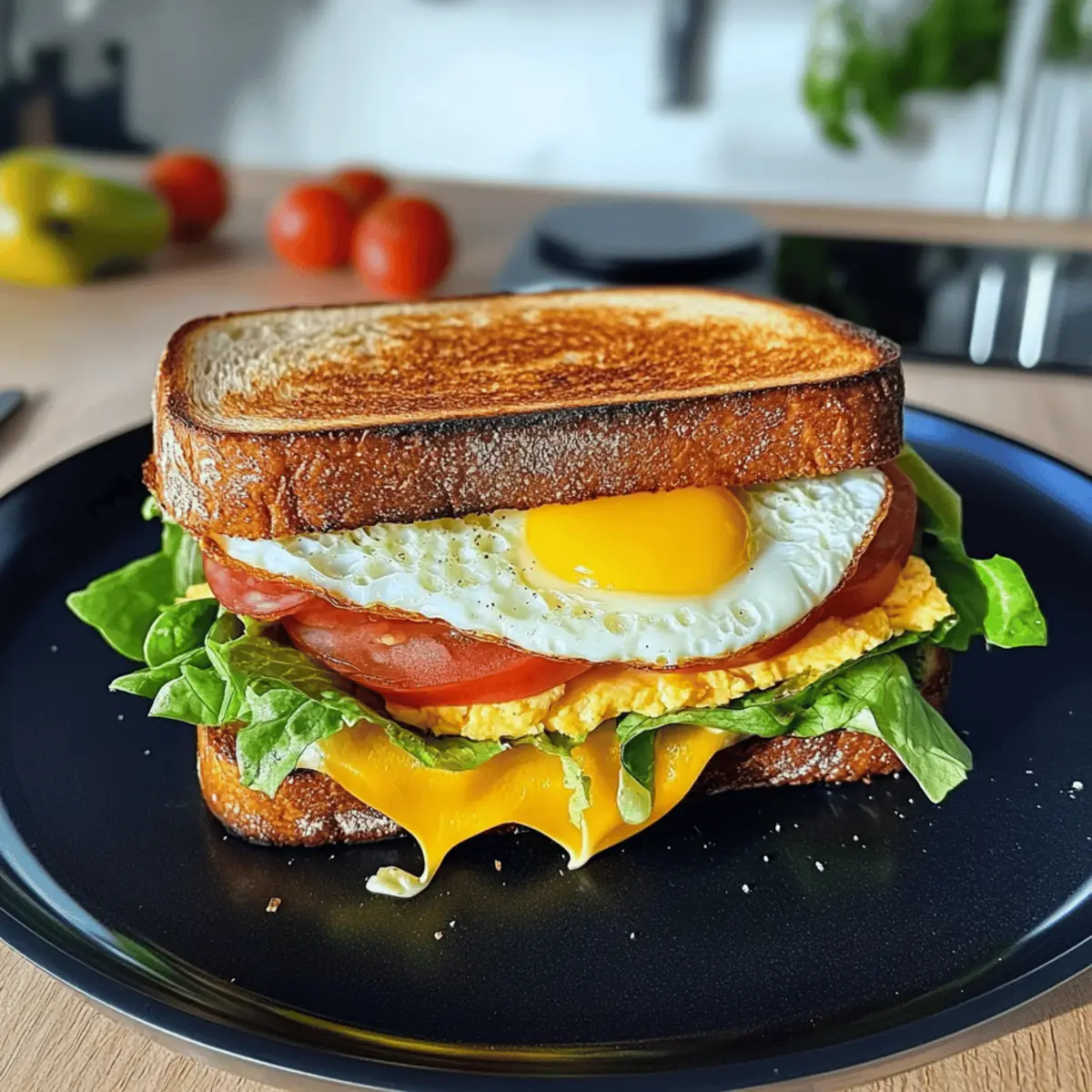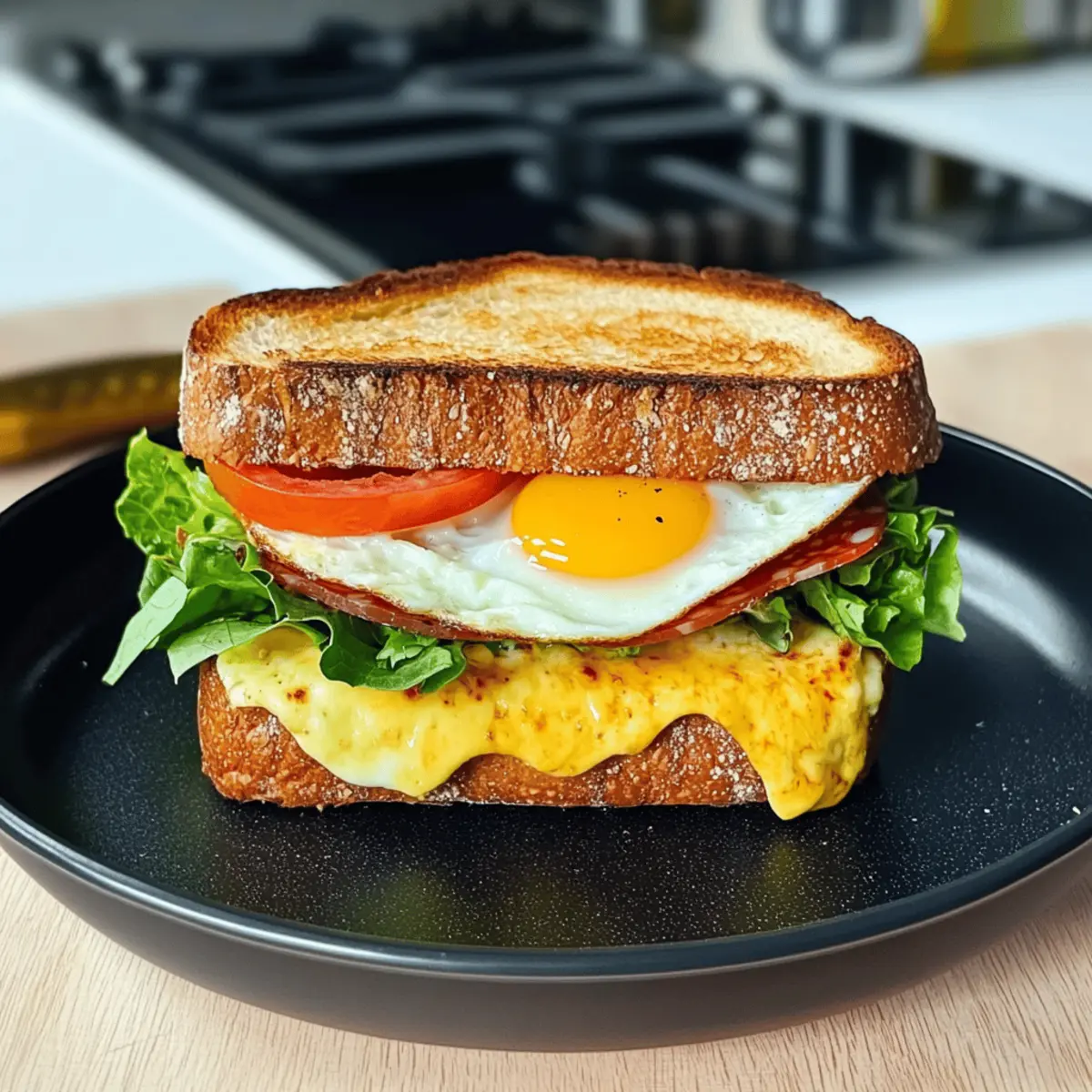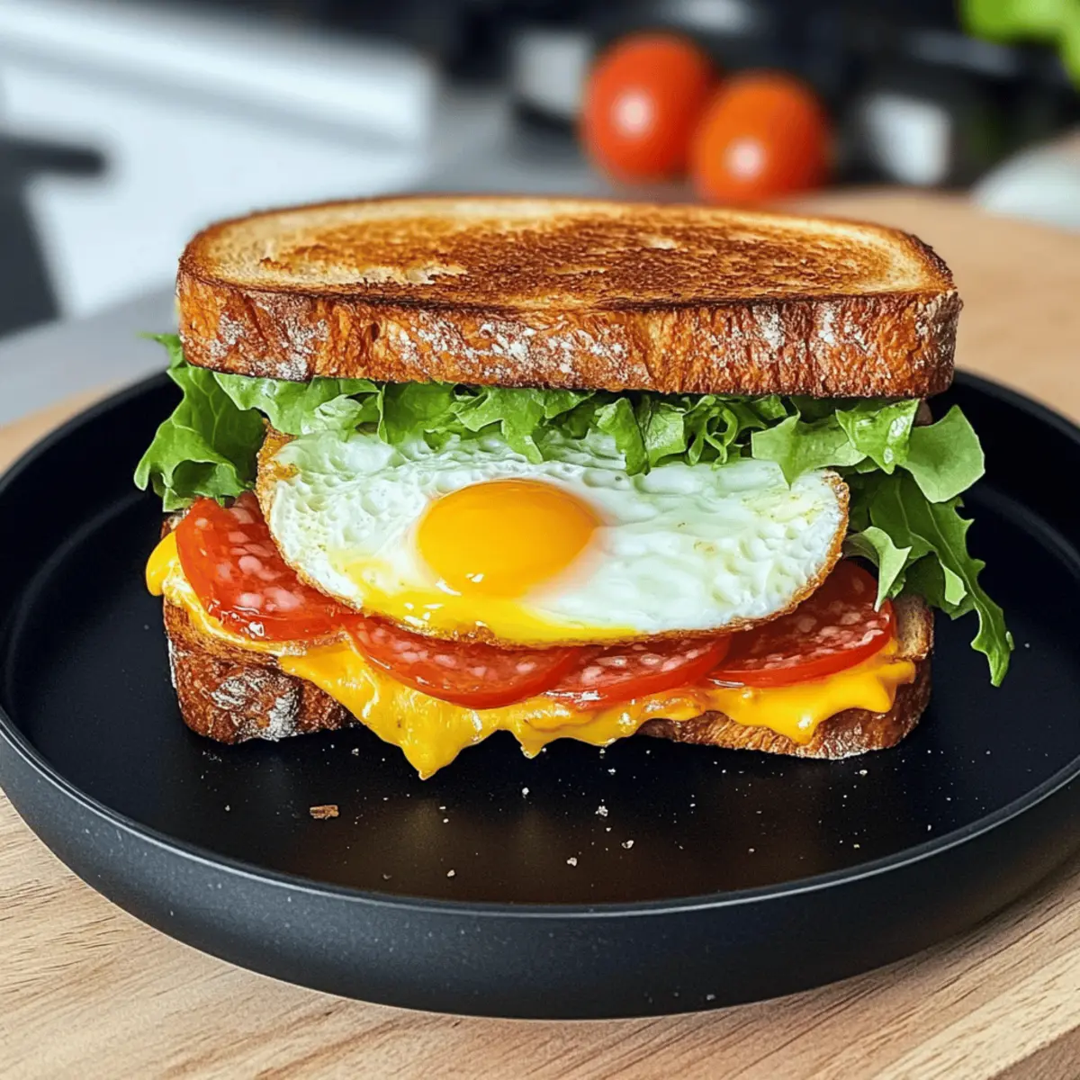 „Ich habe eine köstliche Entdeckung gemacht!“ rief mein Freund, während er sich einen Bissen von seinem Toast Sandwich mit Ei, Käse und Salami genehmigte. Diese einfache, aber genussvolle Kombination von Zutaten ist dem perfekten Frühstück so nah, dass sie schnell zu einem Favoriten werden kann. Mit den Zutaten, die du ganz nach deinem Geschmack variieren kannst, ist dieses Rezept nicht nur hochproteinreich, sondern auch blitzschnell zubereitet – ideal für hektische Morgen. In nur 15 Minuten zauberst du ein warmes, herzhaftes Sandwich, das sowohl den Gaumen verzaubert als auch für gute Laune sorgt. Neugierig, wie du dieses köstliche Gericht zubereiten kannst? Lass uns gleich loslegen und deinen eigenen Toast Sandwich kreieren! Warum wirst du dieses Rezept lieben? Einfachheit: Die Zubereitung ist schnell und benötigt keine komplexen Kochkünste. Vielseitigkeit: Du kannst die Zutaten nach deinem Geschmack anpassen – probiere verschiedene Proteinvarianten wie Schinken oder sogar vegetarische Optionen! Reichhaltiger Geschmack: Die Kombination aus Käse, Salami und Ei verleiht deinem Frühstück eine herzhafte Note, die dich begeistern wird. Hoher Proteingehalt: Ideal für einen energischen Start in den Tag – perfekt für alle, die gesund leben möchten. Schnell und unkompliziert: In nur 15 Minuten kannst du ein leckeres Frühstück zaubern, das auch auf hektischen Morgen eine Freude ist. Beliebt bei allen: Dieses Sandwich ist ein echter Crowd-Pleaser! Serviere es bei einem Brunch oder als Snack und überrascht damit Familie und Freunde. Du wirst sehen, sie werden nach dem Rezept fragen! Toast Sandwich mit Ei Zutaten • Um die Neugier zu wecken: Hier sind die wichtigsten Zutaten für dein köstliches Toast Sandwich mit Ei, Käse und Salami! Für das Sandwich Eier – Versorgen dich mit Protein und Geschmack; ersetze sie durch Eiweiß für eine leichtere Variante. Toast oder Croissant Toast – Bildet die Basis; wähle Vollkorn- oder glutenfreies Brot als Alternative. Salatblätter – Bringen Frische und Crunch; tausche sie gegen Spinat oder Rucola für mehr Geschmack. Käse (Cheddar oder Gouda) – Sorgt für Cremigkeit und würzigen Geschmack; nimm Mozzarella oder vegane Käsealternativen, wenn gewünscht. Salami – Fügt herzhafte Tiefe hinzu; ersetze sie durch Schinken, Putenfleisch oder lasse sie bei einer vegetarischen Version weg. Tomate – Sorgt für Feuchtigkeit und Säure; verwende Avocado für zusätzliche Cremigkeit. Salz & Pfeffer – Hebt den Gesamtgeschmack hervor; nach Belieben anpassen. Etwas Öl – Wird zum Braten verwendet; kann durch Butter oder eine Antihaftspray ersetzt werden. Nutze diese Zutatenliste, um das perfekte Toast Sandwich mit Ei zu kreieren – eine leckere und schnelle Frühstücksidee! Step-by-Step Instructions for Toast Sandwich mit Ei, Käse und Salami Step 1: Eier verquirlen Beginne mit dem Verquirlen der Eier in einer Schüssel. Füge eine Prise Salz und Pfeffer hinzu, um den Geschmack zu intensivieren. Verquirle die Eier gut, bis sie eine einheitliche, leicht schaumige Konsistenz erreichen. Diese Mischung sorgt für einen reichhaltigen und leckeren Geschmack in deinem Toast Sandwich mit Ei, Käse und Salami. Step 2: Öl erhitzen Erhitze etwas Öl in einer beschichteten Pfanne bei mittlerer Hitze. Warte, bis das Öl dünnflüssig und leicht glänzend ist, was etwa 1 bis 2 Minuten dauert. Achte darauf, dass das Öl nicht zu heiß wird, um ein Anbrennen der Eier zu vermeiden. Diese Vorbereitung ist der Schlüssel für eine perfekte Grundlage für dein Sandwich. Step 3: Eier in die Pfanne gießen Gieße die verquirlten Eier vorsichtig in die heiße Pfanne. Bewege die Pfanne leicht, um die Eier gleichmäßig zu verteilen. Lass die Eier für 2 bis 3 Minuten leicht stocken, bis die Ränder anfangen fest zu werden und die Mitte noch leicht flüssig ist. Dies sorgt für eine geschmeidige Textur in deinem Toast Sandwich. Step 4: Toastscheiben platzieren Lege die Toastscheiben vorsichtig auf die Eier, während sie noch in der Pfanne sind. Die Scheiben sollten sanft in die Eimasse gedrückt werden, damit sie den köstlichen Geschmack aufnehmen können. Lass das Ganze für weitere 1-2 Minuten in der Pfanne, damit das Brot leicht bräunt und die Eier darunter weiter garen. Step 5: Sandwich umdrehen Benutze einen großen Spatel, um das Ganze vorsichtig umzudrehen, sodass das Toast Sandwich jetzt auf der anderen Seite liegt. Koche es für etwa 2 bis 3 Minuten weiter, bis die Eier fest und das Brot goldbraun ist. Achte darauf, es nicht zu überkochen, um eine cremige Textur zu bewahren. Step 6: Füllung hinzufügen Falte die Seiten der Omelette über die Mitte und lege dann Käse, Salami und frische Salatblätter sowie Scheiben von Tomaten auf eine der Toastscheiben. Die Hitze sorgt dafür, dass der Käse schön schmilzt und eine köstliche Füllung für dein Toast Sandwich mit Ei, Käse und Salami entsteht. Step 7: Sandwich schließen und grillen Decke das Sandwich mit der anderen Toastscheibe ab und drücke es leicht zusammen. Grill das Ganze für etwa 1-2 Minuten auf jeder Seite, bis das Brot goldbraun und knusprig ist. Diese letzte Grillphase sorgt für den perfekten Crunch und einen leckeren, warmen Biss. Step 8: Servieren Nimm das Toast Sandwich aus der Pfanne und lass es kurz abkühlen, bevor du es in der Mitte durchschneidest. Serviere es warm, eventuell mit frischen Früchten oder einer Tasse Kaffee, um dein Frühstück zu vervollständigen. Dein köstliches Toast Sandwich mit Ei, Käse und Salami ist nun fertig! Meal Prep für dein Toast Sandwich mit Ei, Käse und Salami Diese Toast Sandwich mit Ei, Käse und Salami sind perfekt für die Meal Prep! Du kannst die Eier bis 24 Stunden im Voraus verquirlen und im Kühlschrank aufbewahren, was dir an hektischen Morgen wertvolle Zeit spart. Ebenso kannst du das Toastbrot vorab toasten und in einem luftdichten Behälter aufbewahren, um die Frische zu erhalten. Wenn du bereit bist, dein Sandwic