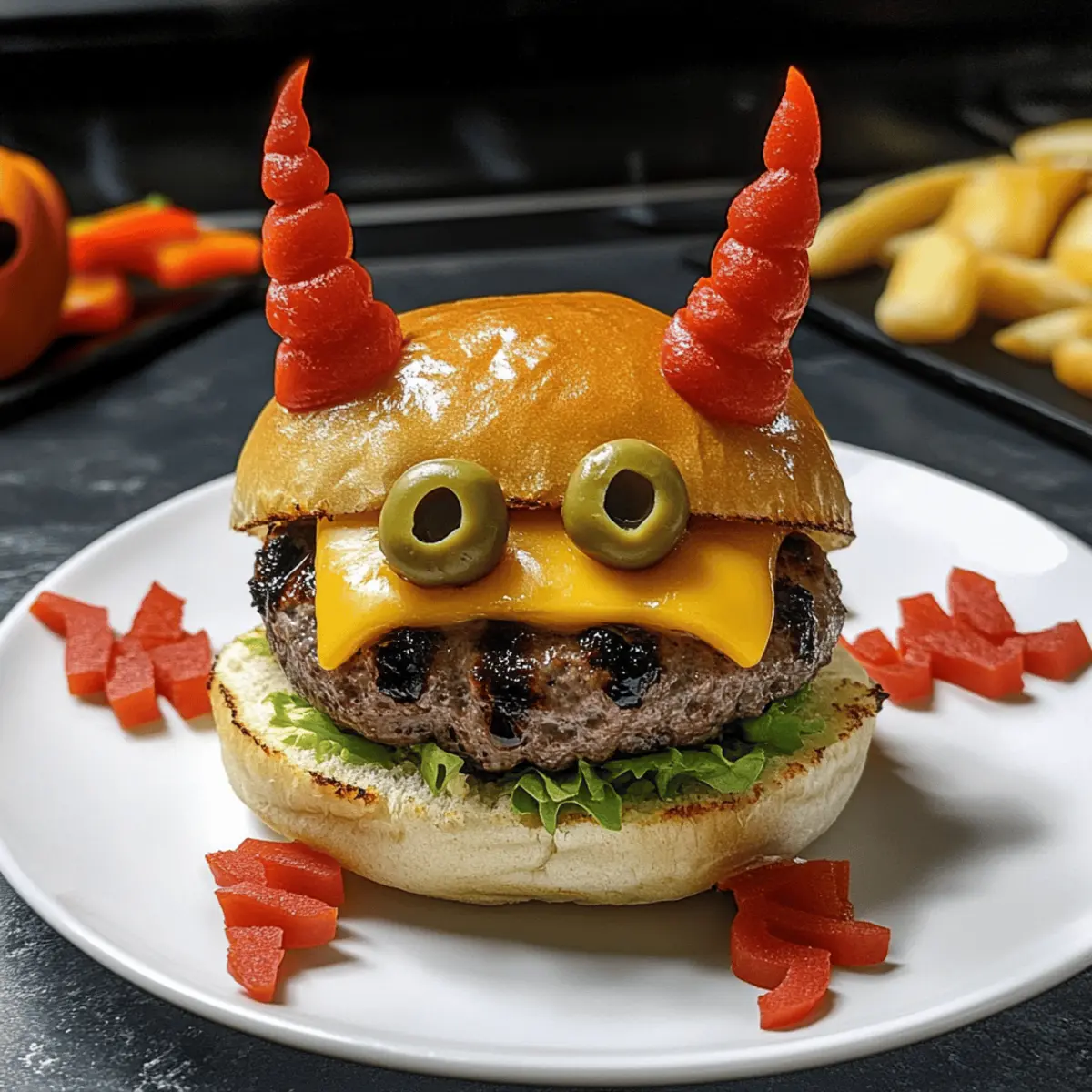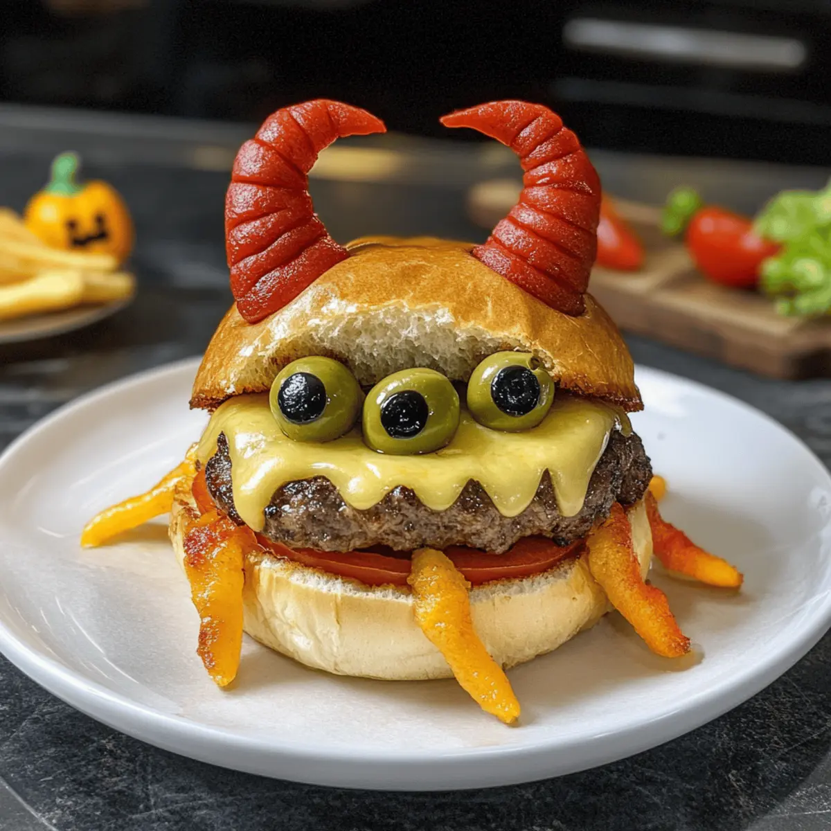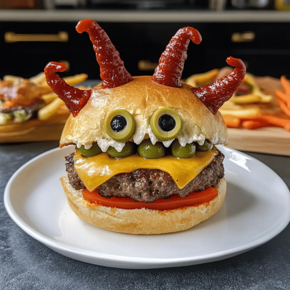 Die Luft ist erfüllt von Aufregung und der Duft von herbstlichen Köstlichkeiten – perfekt für die gruseligste Nacht des Jahres! Mit meinen tollen Halloween-Burgern verwandelt ihr die Küche in eine schaurig schöne Festtagszone, die sowohl Kinder als auch Erwachsene verzaubert. Diese einfachen und familienfreundlichen Burger sind nicht nur ein Genuss für den Gaumen, sondern auch ein Hit für die Augen. Mit saftigen Rinderpattys, die in luftigen Brioche-Brötchen stecken und mit schaurigen Dekorationen wie Teufelshörnern und Spinnenbeinen auffallen, sorgt ihr für einen unvergesslichen Abend. Lasst uns gemeinsam in die Welt dieser köstlichen Halloween-Burger eintauchen – wer kann da schon widerstehen? Warum werden Sie diese Burger lieben? Einzigartiges Erlebnis: Diese tollen Halloween Burger bieten nicht nur einen unvergesslichen Geschmack, sondern verwandeln auch jede Mahlzeit in ein spaßiges Event für die ganze Familie. Einfache Zubereitung: Dank der unkomplizierten Anleitung sind sie schnell und ohne viel Aufwand zubereitet – perfekt für stressfreie Halloween-Feiern. Visuelle Highlights: Mit kreativen Dekorationen wie perfekten Teufelshörnern und lustigen Spinnenbeinen sind sie ein echter Blickfang auf jedem Tisch. Vielfältige Variationen: Ob mit Rindfleisch, Hähnchen oder Gemüse – diese Burger lassen sich ganz nach Belieben anpassen „Gesunde Burger Variationen“. Familienfreundlich: Diese Burger bringen sowohl Kinder als auch Erwachsene zum Staunen, sodass sie bei jedem Halloween-Event große Freude bereiten. Perfekte Beilage: Servieren Sie sie mit gruseliger Deko und festlichen Snacks, wie zum Beispiel einem gespenstischen Obstteller für noch mehr Halloween-Spaß! Toller Halloween Burger Zutaten Notiz: Bereiten Sie sich auf eine schaurig-schöne kulinarische Vorstellung mit diesen tollen Halloween Burgern vor! Für den Teig Warmes Wasser – aktiviert die Hefe; achten Sie darauf, dass das Wasser nicht wärmer als 40°C ist. Milch – fügt Feuchtigkeit und Reichhaltigkeit hinzu. Zucker – nährt die Hefe und hilft, den Teig aufgehen zu lassen; alternativ kann Honig oder Agavendicksaft verwendet werden. Trockenhefe – sorgt dafür, dass der Teig aufgeht; verwenden Sie aktive Trocken- oder Instanthefe. Eier – geben Struktur und Reichtum zu den Brötchen; können durch einen Flachsei-Ersatz für eine vegane Option ersetzt werden. Weißes Mehl (550g) – bildet die Hauptstruktur für die Brötchen; Vollkornmehl für dichtere Brötchen ist ebenfalls möglich. Salz – verbessert den Geschmack und ist entscheidend für die Teigstärke. Butter (80g, weich) – sorgt für Geschmack und Feuchtigkeit in den Brötchen; kann durch Margarine für eine laktosefreie Variante ersetzt werden. Für die Burger-Patties Rinderhackfleisch (1,2 kg) – Basis für die Patties; verwenden Sie Fleisch mit höherem Fettanteil für saftigere Patties, oder pflanzliches Hackfleisch für eine vegetarische Option. Sandwichkäse (8 Scheiben) – schmilzt gut und fügt Geschmack hinzu; vegane Käsescheiben sind auch möglich. Für die Dekoration Grüne Oliven (16) – dienen als Augen für die Dekoration; kleine Gewürzgurken sind eine alternative Option. Rote Paprika (2) – zuschneiden in die Form von Hörnern; sorgt für einen farblichen Akzent; auch Karotten können verwendet werden. Ketchup – zum Dekorieren, wirkt wie eine Soße; hausgemachte Saucen können nach Belieben verwendet werden. Lollo Rosso Salat – sorgt für Frische und Knusprigkeit; andere Blattsalate oder Spinat sind ebenfalls möglich. Riffelpommes – als Dekoration und Knusprigkeit; normale Pommes oder selbstgemachte gewürzte Pommes können verwenden werden. Schritt-für-Schritt-Anleitung für Toller Halloween Burger Step 1: Teig vorbereiten Mischen Sie das warme Wasser, die Milch, den Zucker und die Trockenhefe in einer großen Schüssel und lassen Sie die Mischung 5 Minuten stehen, bis sie schäumt. In einer separaten Schüssel das Ei verquirlen und mit dem Mehl, Salz und der weichen Butter vermengen. Kombinieren Sie alles und kneten Sie den Teig 10 Minuten lang, bis er glatt ist. Decken Sie die Schüssel ab und lassen Sie den Teig 1 Stunde an einem warmen Ort gehen. Step 2: Brioche-Brötchen formen Teilen Sie den aufgegangenen Teig in 8 gleich große Stücke und formen Sie diese zu Kugeln. Legen Sie die Teigkugeln auf ein mit Backpapier ausgelegtes Blech und decken Sie sie mit einem Tuch ab. Lassen Sie die Brötchen erneut für 1 Stunde ruhen, damit sie aufgehen und schön luftig werden. Step 3: Brötchen backen Heizen Sie den Ofen auf 200°C vor, während die Brötchen weiter aufgehen. Bestreichen Sie die Brötchen vorsichtig mit dem verquirlten Ei und bestreuen Sie sie nach Belieben mit Sesam. Backen Sie die Brötchen für etwa 15 Minuten, bis sie goldbraun sind und eine schöne Kruste haben. Anschließend auf einem Gitter auskühlen lassen. Step 4: Burger-Patties zubereiten Schneiden Sie das Rinderhackfleisch in Stücke und würzen Sie es großzügig mit Salz und Pfeffer. Verwenden Sie eine Fleischmühle oder einen Fleischwolf, um das Fleisch gleichmäßig zu mahlen. Formen Sie daraus gleichmäßige Patties, die gut in die Brötchen passen, und drücken Sie eine kleine Delle in die Mitte jedes Patties, damit sie beim Braten gleichmäßig garen. Step 5: Patties garen Erhitzen Sie in einer großen Pfanne etwas Öl bei mittlerer Hitze. Legen Sie die Patties vorsichtig in die heiße Pfanne und braten Sie sie für 2-3 Minuten auf jeder Seite, bis sie eine schöne Bräunung haben und durchgegart sind. Überprüfen Sie die Garstufe, um sicherzustellen, dass sie saftig und lecker bleiben. Step 6: Zusammenstellen und dekorieren Schneiden Sie die Brioche-Brötchen auf und rösten Sie sie leicht, um eine goldene Farbe zu erzielen. Bestreichen Sie die unteren Brötchen mit Ketchup, fügen Sie eine Schicht Salat und dann die geschmolzenen Käsescheiben hinzu. Platzieren Sie die heißen Patties darauf und dekorieren Sie d