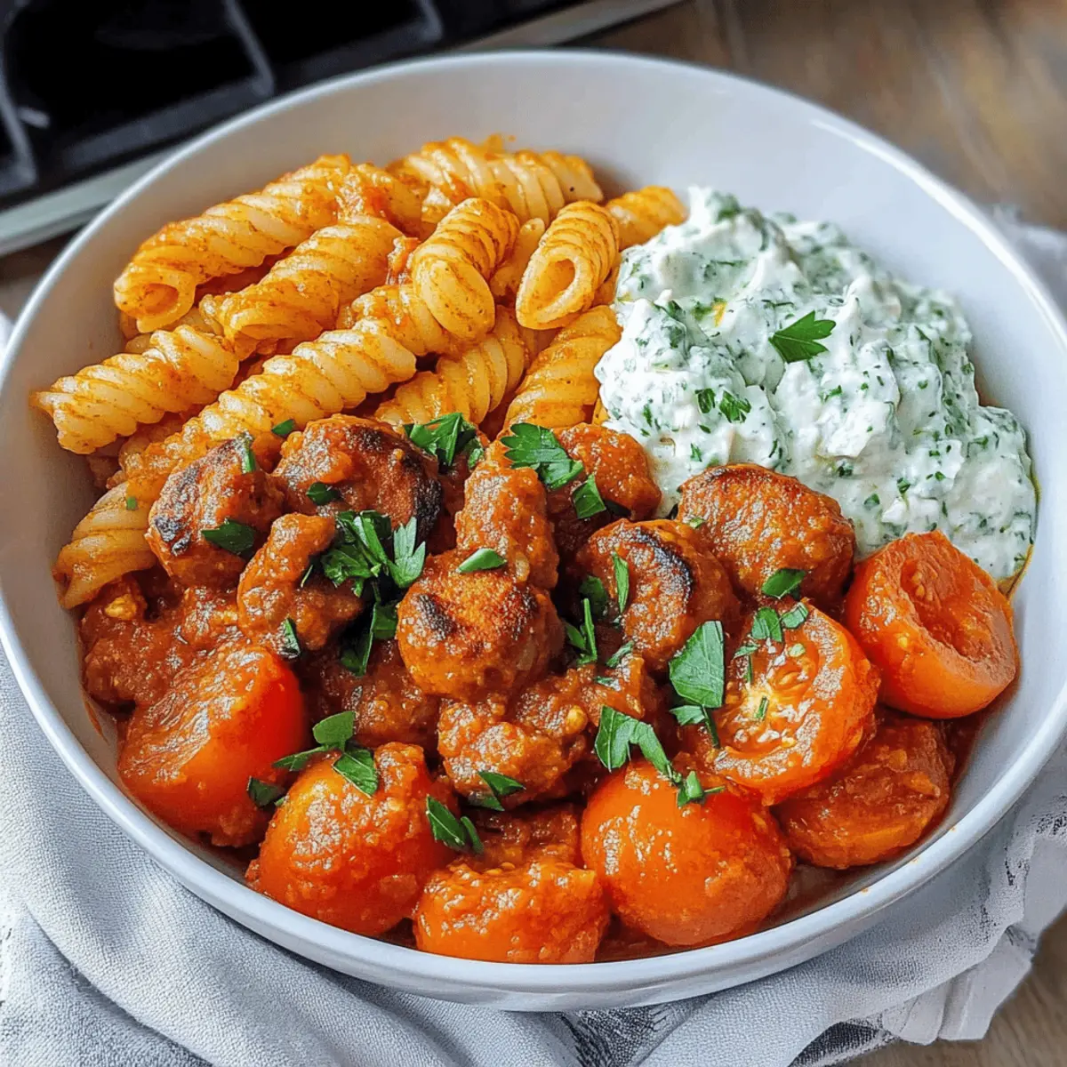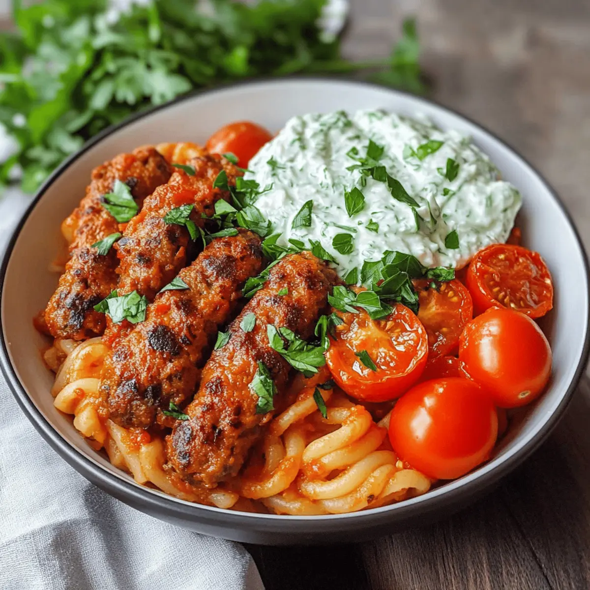 Wenn ich an ein schnelles, wohlschmeckendes Abendessen denke, strahlen mir die Farben von Tomaten Kritharaki mit veganen Cevapcici und Tzatziki entgegen. Dieses Gericht kombiniert zarte Kritharaki-Nudeln mit einer aromatischen Tomatensauce, umhüllt von herzhafter, pflanzlicher Cevapcici und einem erfrischenden, selbstgemachten Tzatziki. In nur 30 Minuten zauberst du nicht nur einen köstlichen Genuss auf den Tisch, sondern schaffst auch ein vegetarisches Highlight, das alle begeistert. Diese einfache und gesunde Mahlzeit ist perfekt für alle, die sich nach einer Abwechslung von Fast Food sehnen. Bist du bereit, deine Kochkünste zu entfalten und etwas Besonderes zuzubereiten? Lass uns gemeinsam loslegen! Warum wirst du dieses Rezept lieben? Einfachheit: Die Zubereitung ist unkompliziert und erfordert nur grundlegende Kochkenntnisse. Du kannst die Tomaten Kritharaki mit veganen Cevapcici und Tzatziki in weniger als 30 Minuten genießen! Vielseitigkeit: Dieses Gericht lässt sich leicht anpassen – ob mit Kokosmilch für eine exotische Note oder verschiedenen Gemüsesorten, die du zur Hand hast. Frische Aromen: Die Kombination aus frischen Kirschtomaten, aromatischem Knoblauch und dem kühlen Tzatziki verleiht deinem Abendessen eine Geschmacksexplosion. Crowd-Pleaser: Egal, ob du Familie oder Freunde bewirten möchtest, dieses Rezept wird alle begeistern und ist perfekt für gesellige Abende! Gesund und nahrhaft: Mit einer ausgewogenen Mischung aus pflanzlichen Proteinen und Kohlenhydraten ist dieses Gericht nicht nur schmackhaft, sondern auch sättigend. Wenn du mehr Inspiration brauchst, schau dir auch mein Rezept für Veganer Tzatziki an! Tomaten Kritharaki Zutaten • Hier sind die Zutaten für diese köstliche Tomaten Kritharaki mit veganen Cevapcici und Tzatziki. Für den Eintopf • 1 EL Öl – sorgt für Geschmack und eignet sich hervorragend zum Anbraten; verwende Olivenöl für ein mediterranes Aroma. • 1 bis 2 Zwiebeln (ca. 130 g) – bringt Süße und Tiefe ins Gericht; gelbe Zwiebeln sind ideal für eine ausgewogene Geschmacksnote. • 4 Zehe Knoblauch – intensiviert den Geschmack; frischer Knoblauch ist am besten, kann aber bei Bedarf durch Knoblauchpulver ersetzt werden. • 250 g Kritharaki Nudeln (Orzo, Risoni) – die Basis des Gerichts, die eine einzigartige Textur bietet; glutenfreie Varianten können verwendet werden. • 250 ml vegane Kochsahne oder Cuisine – sorgt für Cremigkeit; du kannst auch Kokosmilch verwenden, um einen exotischen Geschmack zu erzielen. • 250 g Kirschtomaten – verleihen Frische und Säure; kannst du auch durch Dosentomaten ersetzen, wenn nötig. • 2 EL Tomatenmark (30 g) – intensiviert den Tomatengeschmack. • 400 g Wasser – notwendig zum Kochen der Nudeln. • 2 TL Gemüsebrühe Pulver – verstärkt den Umami-Geschmack. • Chiliflocken – bringen Schärfe ins Gericht; nach persönlichem Geschmack dosieren. • Schwarzer Pfeffer – für die Würze; ebenfalls nach Geschmack hinzufügen. • Gehackte Petersilie – sorgt für eine frische Garnitur. Für die Cevapcici • 1 Packung Vegane Cevapcici – liefert pflanzliches Protein; Marken wie Greenforce sind eine gute Wahl. Verwende deine Lieblings-Vegan-Wurst als Alternative. Für den Tzatziki • Veganer Tzatziki – frischer Dip, der hervorragend zu diesem Gericht passt; du kannst auch eine fertige Variante nutzen, wenn es schneller gehen soll. Schritt-für-Schritt-Anleitung für Tomaten Kritharaki mit veganen Cevapcici und Tzatziki Step 1: Vorbereitung Schäle und würfle die Zwiebeln und drücke den Knoblauch. Halbiere die Kirschtomaten und lege sie zur Seite. Diese Vorbereitungen sind wichtig, um die Aromen gleichmäßig freizusetzen, wenn du die Tomaten Kritharaki mit veganen Cevapcici und Tzatziki zubereitest. Step 2: Anbraten Erhitze 1 EL Öl in einer großen Pfanne bei mittlerer Hitze. Füge die gewürfelten Zwiebeln hinzu und brate sie für etwa 5 Minuten, bis sie durchsichtig sind. Rühre dann das Tomatenmark und den gepressten Knoblauch ein und koche alles für weitere 1 Minute, bis es aromatisch duftet. Step 3: Tomaten hinzufügen Gib die halbierten Kirschtomaten in die Pfanne und dünste diese für 4 Minuten. Rühre gelegentlich um, damit die Tomaten weich werden und ihren Saft freisetzen. Dies wird die Grundlage für die reichhaltige Sauce der Tomaten Kritharaki. Step 4: Nudeln kombinieren Füge die Kritharaki-Nudeln hinzu und brate sie für 1 Minute an, damit sie das Aroma der anderen Zutaten aufnehmen. Stelle sicher, dass sie gleichmäßig mit dem Gemüse vermischt sind, bevor du die Flüssigkeit hinzufügst. Step 5: Kochen Gieße 400 g Wasser, die pflanzliche Kochsahne und 2 TL Gemüsebrühe-Pulver in die Pfanne. Bring die Mischung zum Kochen, ohne den Deckel aufzusetzen. Reduziere die Hitze und lasse die Kritharaki etwa 12 Minuten köcheln, bis sie al dente sind. Rühre gelegentlich um, damit nichts ansetzt. Step 6: Würzen Sobald die Kritharaki gar sind, schmecke die Mischung mit Chiliflocken, schwarzem Pfeffer und Salz ab. Passe die Gewürze deinem Geschmack an, um die perfekte Balance für die Tomaten Kritharaki mit veganen Cevapcici und Tzatziki zu finden. Step 7: Servieren Löffele die Kritharaki auf Teller, lege die veganen Cevapcici darauf und garniere alles mit frisch gehackter Petersilie und einem Klecks Tzatziki. Dieses aromatische Gericht ist nun bereit, serviert zu werden – ein Genuss für jeden Tisch! Meal Prep für Tomaten Kritharaki mit veganen Cevapcici und Tzatziki Die Tomaten Kritharaki mit veganen Cevapcici und Tzatziki sind perfekt geeignet für die Meal Prep, da du die Kritharaki bis zu 3 Tage im Voraus zubereiten kannst. Koche die Pasta einfach und lasse sie vor dem Zusammenstellen abkühlen, um ein Verkleben zu vermeiden. Lagere die Kritharaki in einem luftdichten Behälter im Kühlschrank, um die Qualität zu erhalten. Die veganen Cevapcici können ebenfalls vorgebraten und dann in einer separaten Box aufbewahrt werden. Wenn du