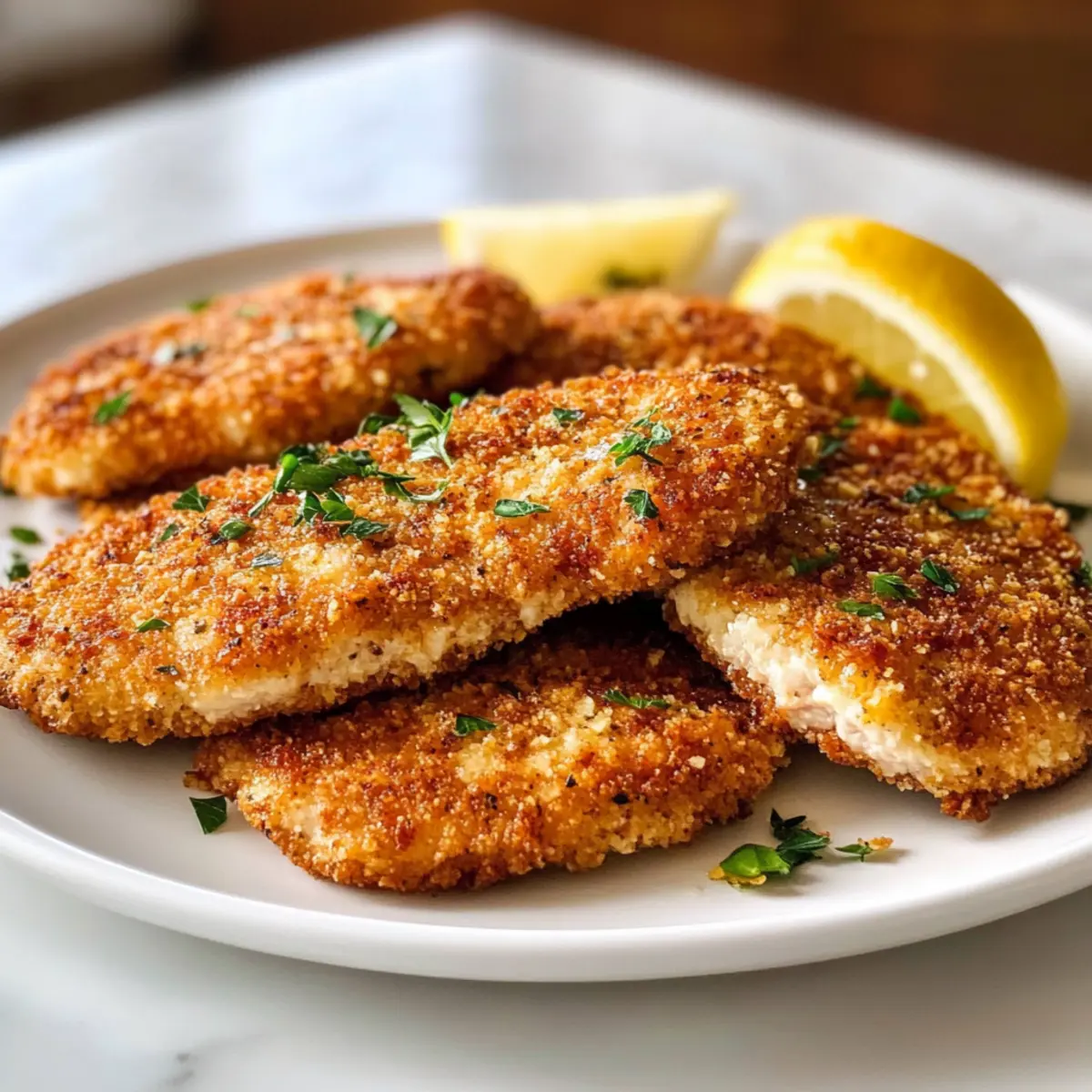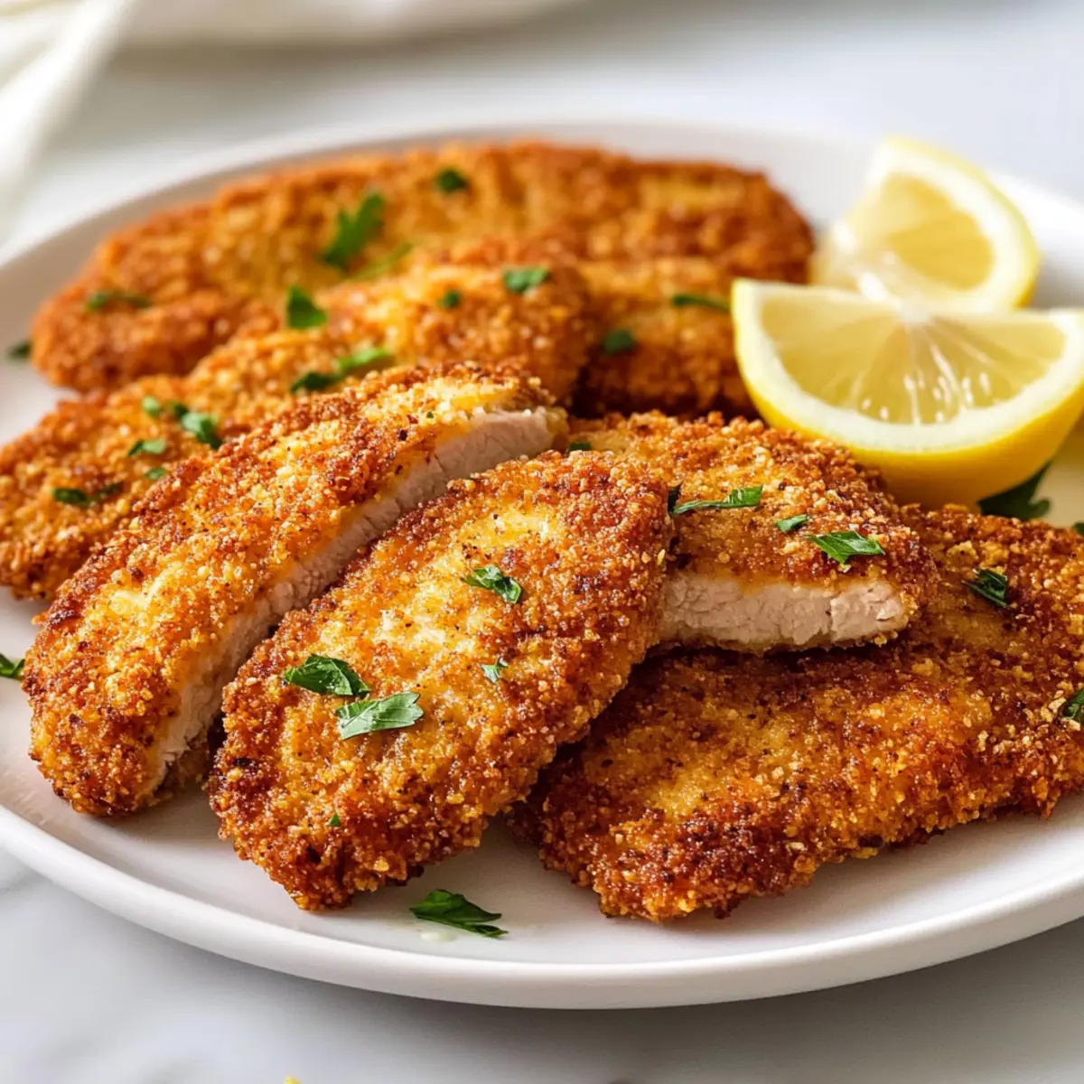 Hast du jemals die Freude erlebt, wenn du ein einfaches, aber unglaublich leckeres Gericht zauberst und deine Liebsten damit überraschen kannst? Dieses Truthahn Schnitzel Rezept wird dir genau das bieten! Diese saftigen und knusprigen Truthahn-Cutlets sind nicht nur ein schnelles Abendessen für hektische Wochentage, sie sind auch ein wahrer Genuss für jeden Gaumen. Stell dir vor, wie du in die goldene, knusprige Kruste beißt und die zarte Füllung genießt – ein perfektes Wohlfühlessen, das in wenigen Minuten zubereitet ist. Lass uns gemeinsam in die Welt der einfachen amerikanischen Küche eintauchen und dieses köstliche Gericht entdecken! Bist du bereit, eine geschmackliche Entdeckung zu machen? Warum wirst du dieses Schnitzel Rezept lieben? Einfachheit in Vollendung: Die Zubereitung dieses Truthahn Schnitzel Rezepts ist denkbar einfach und erfordert nur grundlegende Kochkenntnisse. Vielseitigkeit: Ob mit einer frischen Salatbeilage oder klassischen Beilagen wie Kartoffelpüree serviert, es passt zu jedem Menü. Aromatische Explosion: Die Kombination aus Parmesan und Gewürzen sorgt für einen herzhaften Geschmack, der deine Geschmacksknospen erfreut. Schnelles Abendessen: In nur wenigen Minuten zubereitet, ist es ideal für geschäftige Wochentage. Klassisches Wohlfühlessen: Die goldene, knusprige Kruste und das zarte Fleisch bringen die Gemütlichkeit von amerikanischem Komfortessen direkt auf deinen Tisch. Gesunde Alternativen: Probier die Back-Variante für ein leichtes, fettärmeres Gericht oder stelle deine eigenen kreativen Variationen zusammen – wie wäre es mit einem Hauch von frischen Kräutern? Zutaten für das Truthahn Schnitzel Rezept • Entdecke die Hauptzutaten für ein köstliches und schnelles Abendessen! Für die Panade Truthahn-Cutlets – Diese zarte Proteinbasis lässt sich auch durch Hühnchenschnitzel ersetzen. Weizenmehl – Dient zum Wenden; hilft, die Panade besser haften zu lassen. Glutenfreies Mehl kann als Ersatz verwendet werden. Eier – Binden die Panade; du kannst ein oder zwei Eiweiß nutzen, um den Fettgehalt zu reduzieren. Paniermehl – Sorgt für eine knusprige Außenhülle; frisches Paniermehl ergibt die beste Textur. Vollkorn-Paniermehl ist eine gesündere Option. Geriebener Parmesan – Verleiht der Panade zusätzlichen Geschmack; Nährhefe kann für eine milchfreie Variante genutzt werden. Knoblauchpulver – Intensiviert das Aroma; frischer, gehackter Knoblauch kann für einen intensiveren Geschmack verwendet werden. Paprika – Bringt eine milde Schärfe und Farbe; geräucherte Paprika sorgt für ein zusätzliches rauchiges Aroma. Salz und schwarzer Pfeffer – Grundlegende Gewürze für den Geschmack; nach persönlichem Belieben anpassen. Für das Braten Olivenöl & Butter – Zum Braten; Avocadoöl kann für einen anderen Geschmacksprofil verwendet werden. Zitronenschnitze – Serviere sie, um den Geschmack zu verfeinern; können auch durch Limetten ersetzt werden, um eine fruchtige Note zu bringen. Dieses Truthahn Schnitzel Rezept vereint all diese köstlichen Zutaten für ein schnelles und befriedigendes Gericht! Step-by-Step Instructions für das Truthahn Schnitzel Rezept Step 1: Truthahn-Cutlets vorbereiten Trockne die Truthahn-Cutlets mit Küchenpapier ab und würze beide Seiten großzügig mit Salz und Pfeffer. Diese Vorbereitung sorgt dafür, dass das Fleisch gut gewürzt wird und beim Braten den vollen Geschmack entfaltet. Lass die gewürzten Cutlets für etwa 10 Minuten ruhen, damit die Gewürze gut einziehen können. Step 2: Panierstation einrichten Richte eine Panierstation mit drei Schalen ein: eine für das Weizenmehl, die zweite für die verquirlten Eier und die dritte für das mit Parmesan und Gewürzen vermischte Paniermehl. Diese Anordnung ermöglicht einen reibungslosen Panierprozess. Achte darauf, dass die Schalen breit genug sind, damit du die Cutlets leicht wenden kannst. Step 3: Truthahn-Cutlets panieren Nehme jeweils ein Truthahn-Cutlet, wende es zuerst im Weizenmehl und schüttle überschüssiges Mehl ab. Tauche es dann in die verquirlten Eier und schließlich in die Paniermehl-Mischung. Drücke leicht an, damit die Panade gut haftet. Dieser Schritt trägt zur knusprigen Textur des fertigen Truthahn Schnitzels bei. Step 4: Öl erhitzen Erhitze in einer großen Pfanne bei mittlerer Hitze etwa 2 Esslöffel Olivenöl und 1 Esslöffel Butter, bis das Fett heiß, aber nicht rauchend ist. Du weißt, dass das Öl bereit ist, wenn es zu schimmern beginnt. Achte darauf, dass die Pfanne groß genug ist, um die Cutlets nicht zu überfüllen, was eine gleichmäßige Bräunung fördert. Step 5: Cutlets braten Lege die panierten Truthahn-Cutlets vorsichtig in die heiße Pfanne und brate sie für etwa 4–5 Minuten auf jeder Seite, bis sie goldbraun und durchgegart sind. Das Fleisch sollte beim Drücken leicht nachgeben und eine Innentemperatur von 75 °C erreichen. Achte darauf, die Cutlets nicht zu oft zu bewegen, damit sie eine schöne Kruste entwickeln können. Step 6: Abtropfen lassen und servieren Nehme die fertig gebratenen Cutlets aus der Pfanne und lege sie auf ein mit Küchenpapier ausgelegtes Kühlregal, um das überschüssige Öl abzutropfen. Serviere die heißen Truthahn-Cutlets sofort mit Zitronenschnitzen, die du über das Fleisch pressen kannst, um den Geschmack zu erhöhen. Genieße dein köstliches Truthahn Schnitzel Rezept! Nützliche Tipps für das Truthahn Schnitzel Rezept Richtige Temperatur: Stelle sicher, dass das Öl heiß genug ist, bevor du die Cutlets hinzufügst. So wird die Kruste schön knusprig und das Fleisch bleibt saftig. Panade fest drücken: Drücke die Panade leicht an, damit sie beim Braten gut haftet. Eine gut haftende Panade sorgt für das perfekte Crunch-Erlebnis. Nicht überfüllen: Brate die Cutlets in kleinen Portionen. Überfüllung der Pfanne verhindert eine gleichmäßige Bräunung und macht die Cutlets matschig. Ruhen lassen: Lasse die fertig gebratenen Cutlets kurz ruhen