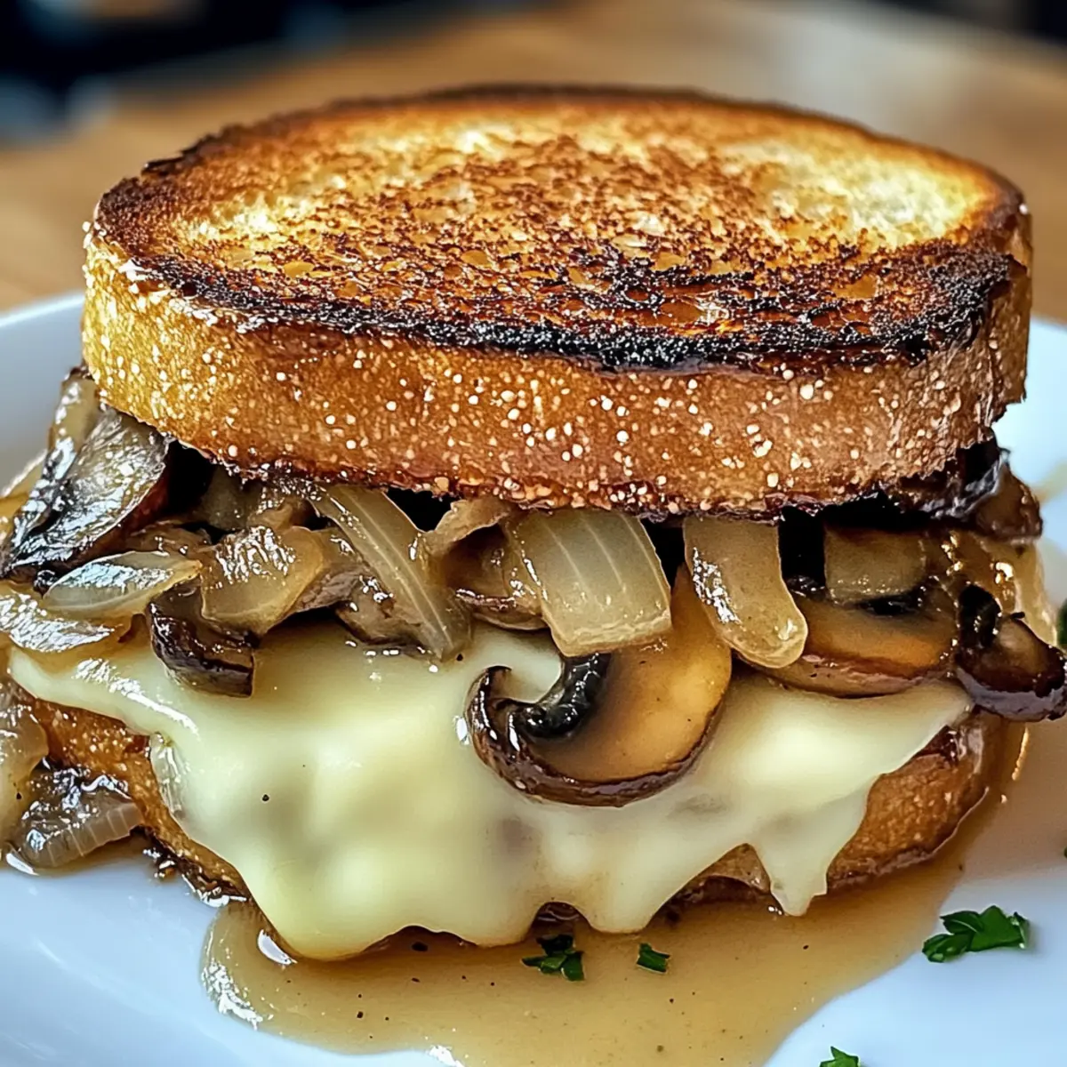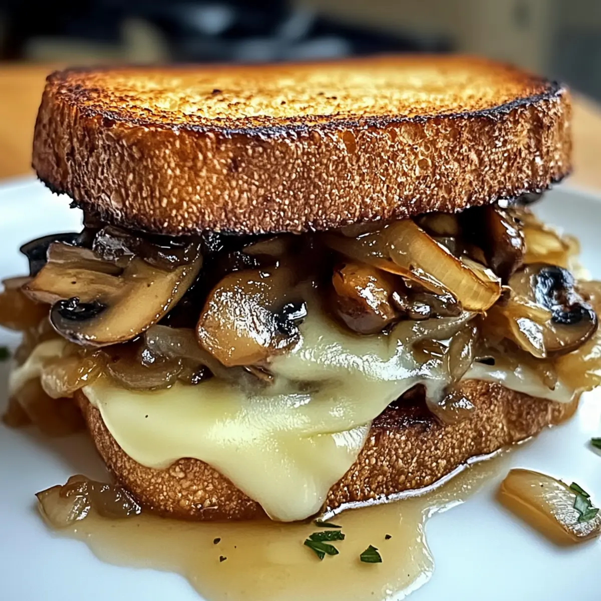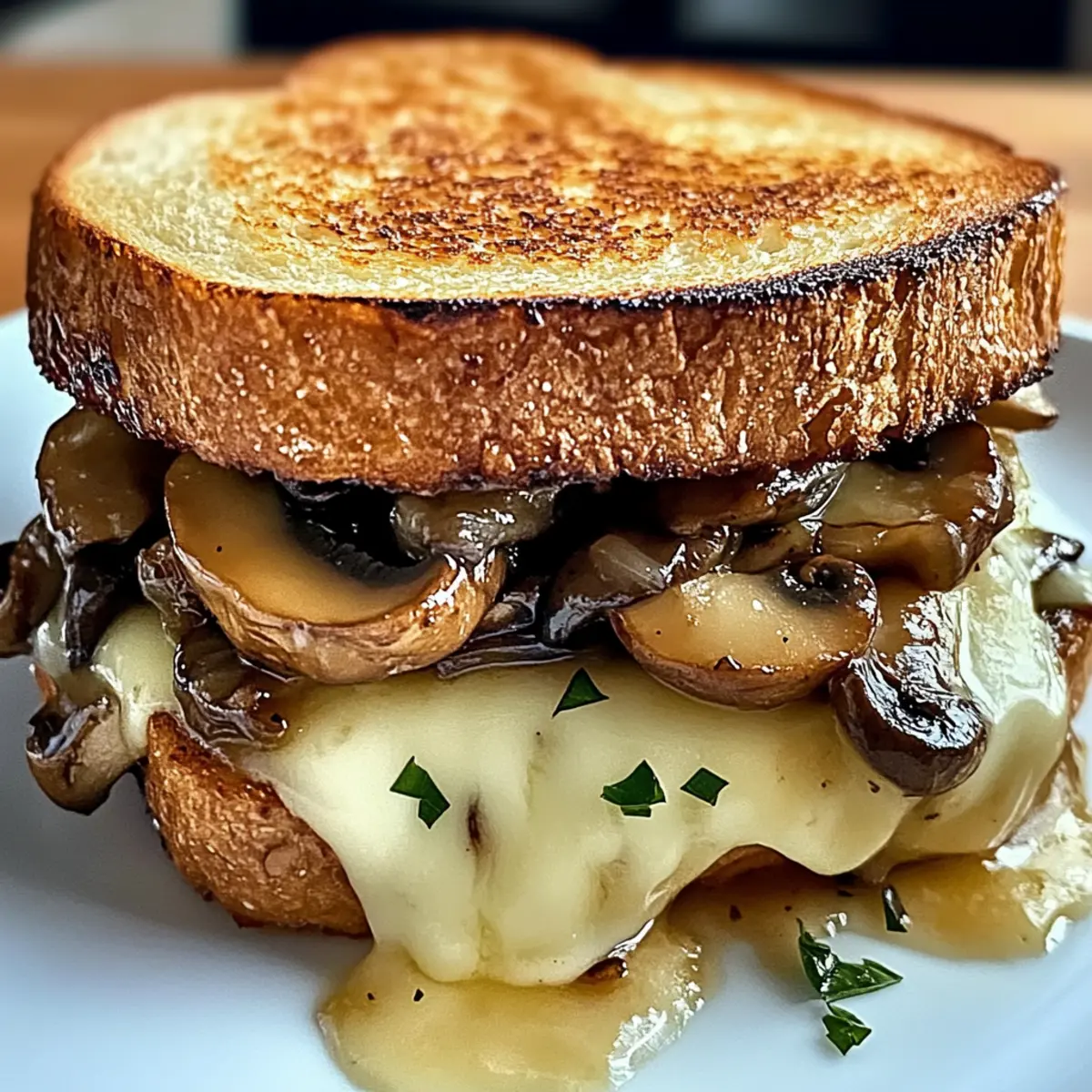 Jedes Mal, wenn ich in meine Küche zurückkehre, um ein unwiderstehliches Schweizer Pilzschmelz-Sandwich für gemütliche Mittagessen zuzubereiten, erfüllt sich der Raum mit einem Duft, der Erinnerungen an kleine, einladende Cafés weckt. Dieses Rezept kombiniert herzhafte, sautierte Champignons und süße, karamellisierte Zwiebeln mit dem schmelzenden Komfort von nussigem Schweizer Käse. In weniger als 30 Minuten zubereitet, ist es nicht nur eine schnelle Lösung für hungrige Herzen, sondern auch ein Garant für Begeisterung bei Familie und Freunden. Und das Beste daran? Ihr könnt es ganz nach euren Vorlieben anpassen, sei es mit gerösteten Paprika oder einer anderen Käsesorte. Neugierig, wie ihr diese köstliche Kreation selbst zaubern könnt? Lasst uns gemeinsam in die Zubereitung eintauchen! Warum wird dieses Sandwich Ihr Favorit sein? Vielfältigkeit: Dieses Sandwich ist nicht nur köstlich, sondern auch extrem anpassbar! Ob mit gerösteten Paprika oder extra Käse – Ihrer Kreativität sind keine Grenzen gesetzt. Schnell zubereitet: In weniger als 30 Minuten können Sie dieses Gourmet-Gericht genießen. Perfekt für stressige Tage oder gemütliche Abendessen. Herzhafter Geschmack: Die Kombination aus süßen, karamellisierten Zwiebeln und herzhaften Champignons sorgt für ein Geschmackserlebnis, das einfach glücklich macht. Beliebter Publikumsmagnet: Egal, ob Sie Ihre Familie oder Freunde überraschen möchten, dieses Rezept wird sicher für Begeisterung sorgen. Hausgemachte Qualität: Anstatt auf Fastfood zurückzugreifen, können Sie mit diesem Rezept ein echtes Café-Gefühl in Ihre Küche bringen und sich ganz im Stil von cremiger Tomatensuppe oder einem bunten Salat bedienen. Unwiderstehliches Schweizer Pilzschmelz-Sandwich Zutaten • Für eine perfekte Zubereitung! Für die Füllung Gelbe Zwiebeln – Essenziell für die Karamellisierung; können durch rote Zwiebeln für mehr Schärfe ersetzt werden. Olivenöl – Ideal zum Sautieren; Avocadoöl kann eine gute Alternative sein. Butter – Verleiht den Zwiebeln Reichhaltigkeit; ungesalzene Butter oder Margarine funktioniert ebenfalls. Brauner Zucker – Betont die Süße der karamellisierten Zwiebeln; Ahornsirup kann hier ebenfalls verwendet werden. Balsamico-Essig – Fügt den Zwiebeln eine angenehme Säure hinzu; Apfelessig bietet einen milderen Geschmack. Cremini-Pilze – Sorgen für die erdige Textur der Füllung; Champignons sind eine gute Ersatzoption. Knoblauch – Bringt aromatische Tiefe; Knoblauchpulver kann zur Vereinfachung genutzt werden. Trockener Weißwein – Deglaziert die Pfanne und verstärkt den Pilzgeschmack; für eine alkoholfreie Version kann Gemüsebrühe verwendet werden. Thymian – Verleiht kräutrige Noten; getrockneter Thymian ist eine interessante Alternative. Für das Sandwich Sauerteigbrot – Dient als Basis des Sandwiches; Vollkorn- oder glutenfreies Brot sind ebenfalls mögliche Optionen. Schweizer Käse – Schmilzt wunderschön und sorgt für die gewünschte cremige Konsistenz; Gruyère oder Provolone sind ebenfalls als Ersatz geeignet. Dijon-Senf – Optional für einen Kontrast im Geschmack; grobkörniger Senf kann ebenfalls verwendet werden. Genießt dieses unwiderstehliche Schweizer Pilzschmelz-Sandwich auf eure ganz persönliche Art! 🍽️ Schritt-für-Schritt-Anleitung für das Unwiderstehliches Schweizer Pilzschmelz-Sandwich Step 1: Zwiebeln karamellisieren Die gelben Zwiebeln dünn schneiden und in einer Pfanne bei niedriger Hitze Olivenöl und Butter erhitzen. Unter häufigem Rühren 30-45 Minuten lang garen, bis die Zwiebeln goldbraun und weich sind. Halten Sie die Temperatur niedrig, um ein Verbrennen zu vermeiden und die Süße optimal zu entwickeln. Step 2: Zwiebeln süßen Den braunen Zucker und den Balsamico-Essig in die karamellisierten Zwiebeln einrühren und weitere 2-3 Minuten dünsten, bis die Mischung eingedickt und glänzend ist. Stellen Sie die Zwiebeln zur Seite und nutzen Sie die Pfanne für die nächsten Schritte des unwiderstehlichen Schweizer Pilzschmelz-Sandwiches. Step 3: Pilze sautieren In derselben Pfanne bei mittelhoher Hitze gegebenenfalls etwas mehr Olivenöl hinzufügen. Sliced vergleichbare große Cremini-Pilze 8-10 Minuten lang braten, bis sie goldbraun und zart sind. Diese Pilze verleihen dem Sandwich eine erdige Textur und sind eine hervorragende Ergänzung zum Geschmack. Step 4: Pilze würzen Die gehackten Knoblauchzehen und frischen Thymian zu den Pilzen geben, dann den trockenen Weißwein hinzugeben. Kurz aufkochen lassen, bis der Wein fast vollständig verdampft ist. Mit Salz und Pfeffer abschmecken, um das Aroma der saftigen Pilze weiter zu entwickeln. Step 5: Brot vorbereiten Eine Seite jeder Scheibe Sauerteigbrot mit Butter bestreichen. Auf die ungebutterte Seite von zwei Brotscheiben Dijon-Senf streichen, um zusätzliche Geschmacksschichten für das unvergessliche Schweizer Pilzschmelz-Sandwich hinzuzufügen. Step 6: Sandwiches zusammenstellen Auf einer Brotscheibe eine Schicht Schweizer Käse, die süßen karamellisierten Zwiebeln und die sautierten Pilze gleichmäßig verteilen. Dann mit der anderen Brotscheibe abschließen, um das Sandwich zu formen, das es wert ist, serviert zu werden. Step 7: Sandwiches braten Die Sandwiches sorgfältig in die Pfanne zurücklegen und bei mittlerer bis niedriger Hitze 3-5 Minuten pro Seite braten, bis sie goldbraun sind und der Käse geschmolzen ist. Achten Sie darauf, die Pfanne abzudecken, um das Schmelzen des Käses zu beschleunigen und eine gleichmäßige Küche zu gewährleisten. Step 8: Servieren und genießen Die Sandwiches diagonal durchschneiden und heiß servieren. Kombinieren Sie sie mit einer cremigen Tomatensuppe oder einem frischen Salat für ein unvergleichliches Gourmet-Erlebnis, das einfach glücklich macht und das Unwiderstehliche Schweizer Pilzschmelz-Sandwich zum perfekten Mittagessen erhebt. Unwiderstehliches Schweizer Pilzschmelz-Sandwich Variationen Eure Kreativität in