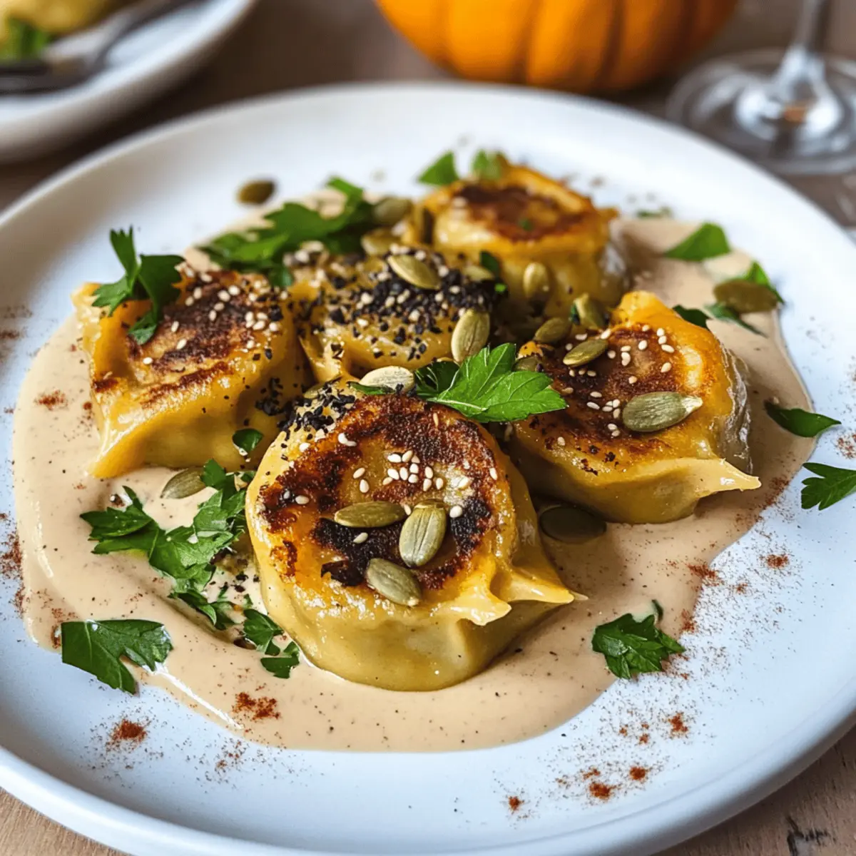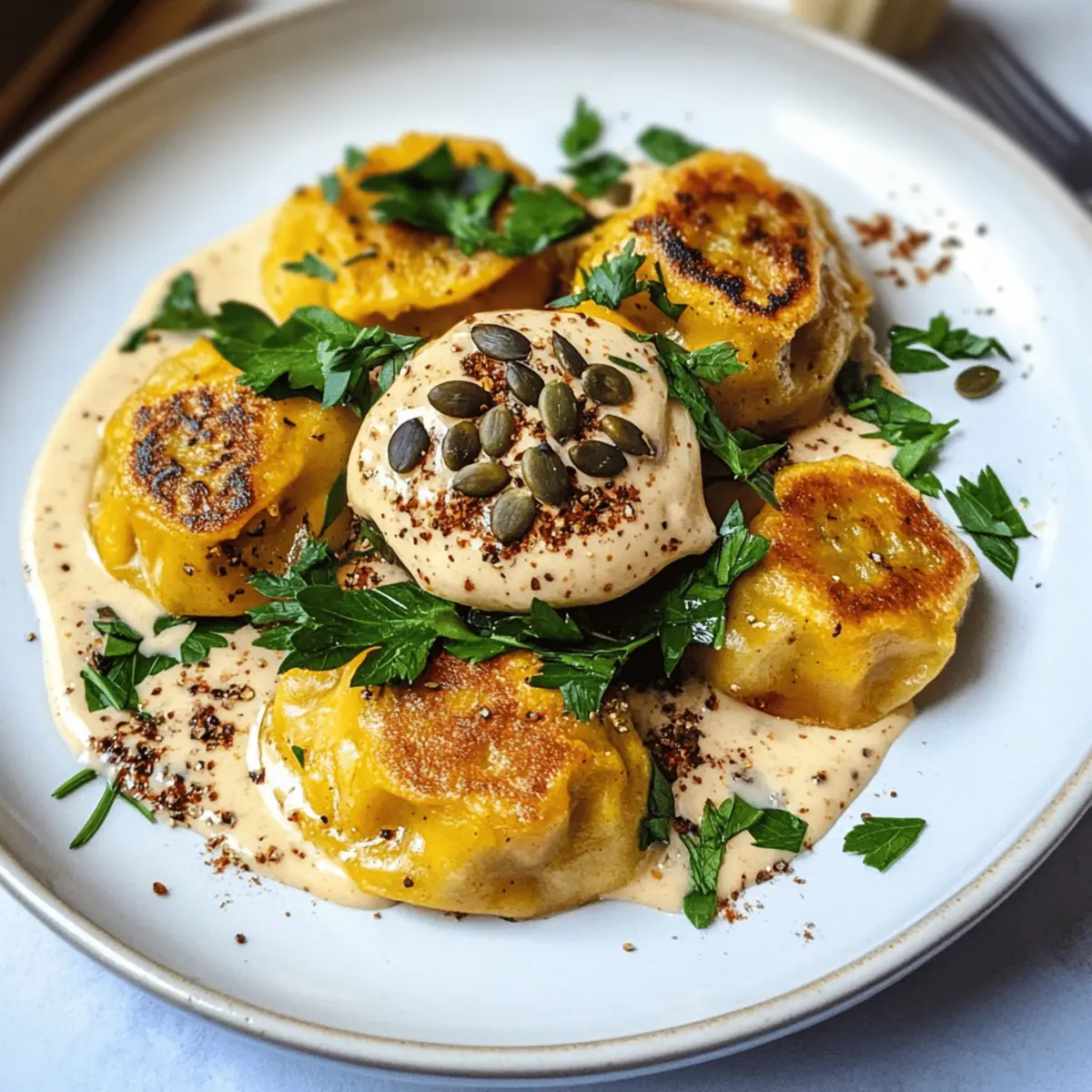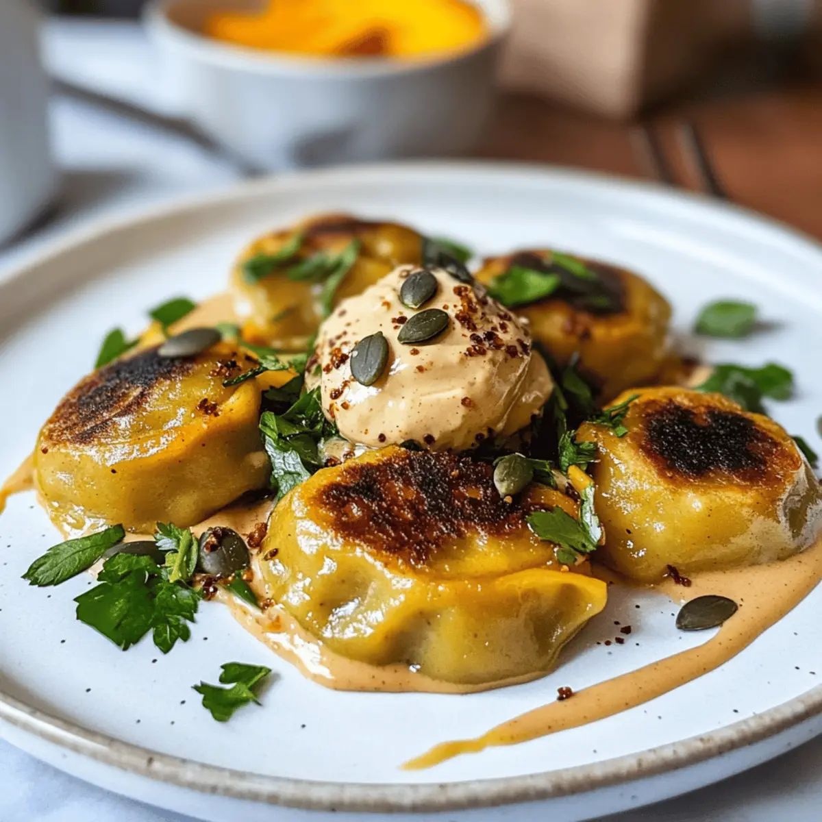 Als ich neulich in der Küche stand, um eine wohltuende Mahlzeit zuzubereiten, dachte ich an die perfekten herbstlichen Aromen, die mein Haus erfüllen sollten. Diese Vegane Kürbisknödel auf Miso-Tofu-Creme sind die Antwort auf mein Verlangen nach Komfortessen, das gleichzeitig gesund und sättigend ist. Sie vereinen die Süße des Kürbisses mit der herzhaften Tiefe von Miso und Tofu und sind somit ideal für kalte Tage. Das Beste? Sie sind einfach zuzubereiten und können nach Belieben gekocht oder gebraten werden, was sie zu einer flexiblen Wahl für jeden Abendessen-Moment macht. Lass uns gemeinsam in diese herzhafte und kreative Küche eintauchen – bereit für eine köstliche Entdeckung? Warum sind diese Kürbisknödel einzigartig? Einfachheit: Die Zubereitung ist kinderleicht! Mit nur wenigen Zutaten und schrittweisen Anleitungen lassen sich die Knödel problemlos im Handumdrehen meistern. Vielfalt: Ob gekocht oder gebraten, du kannst die Zubereitung ganz nach deinem Geschmack anpassen. Probiere auch die saisonalen Variationen, die den Herbst richtig zur Geltung bringen. Herzhafter Geschmack: Die Kombination aus süßem Kürbis und umami-reichem Miso sorgt für ein wahres Geschmackserlebnis, das jeden Teller aufwertet. Nährstoffreich: Diese Knödel sind nicht nur köstlich, sondern auch voller pflanzlicher Proteine und Vitamine. Perfekt für eine gesunde Ernährung! Ideal für Geselligkeit: Überrasche deine Freunde oder Familie mit diesem Gericht – die Veganen Kürbisknödel kommen immer gut an! Sie sind ein wahrer Hit bei jeder Gelegenheit, ob im kleinen Kreis oder bei feierlichen Anlässen. Lass dich von diesem rezept für vegane Gerichte inspirieren und verwandle deine nächsten Kochabende in ein Genussfest! Vegane Kürbisknödel Zutaten Hinweis: Für diese Genussreise ist es wichtig, alle frischen Zutaten bereitzuhalten! Für die Knödel: Hokkaido Kürbis – gibt den Knödeln ihren Hauptgeschmack und sorgt für die nötige Feuchtigkeit; Butternut lässt sich als schöne Alternative nutzen. Zwiebel – sorgt für eine angenehme Süße und Tiefe im Geschmack; Schalotten sind hier eine mildere Option. Knoblauchzehen – intensiviert den Geschmack; alternativ kann auch Knoblauchpulver verwendet werden. Vegane Butter – nutzt man zum Sautieren und um den Knödeln eine gewisse Reichhaltigkeit zu verleihen; Kokosöl ist ein passender Ersatz. Sojamehl – bindet die Zutaten und macht die Knödel stabil; alternativ passt Allzweckmehl, wenn nicht vegan. Pflanzliche Milch – sorgt für die nötige Feuchtigkeit; jede ungesüßte Pflanzenmilch ist geeignet. Altbackene Brötchen – liefern Textur und sorgen für den Zusammenhalt; frisches Brot sollte gut getrocknet werden, wenn keine alten Brötchen zur Hand sind. Frische Petersilie – gibt einen knackigen Kräutergeschmack; andere Kräuter wie Schnittlauch oder Thymian bringen mehr Abwechslung. Wasser – nötig zum Dämpfen der Knödel; hier sind keine Alternativen notwendig. Salz – hebt den Geschmack hervor; verwende Meersalz oder Salz deiner Wahl. Pfeffer – fügt eine leichte Schärfe hinzu; kannst du nach Belieben weglassen. Für die Tofu-Creme: Natur Tofu – die Hauptzutat für eine cremige Basis; Silken Tofu sorgt für eine andere Textur und ist noch cremiger. Sojamilch – die flüssige Grundlage der Creme; andere pflanzliche Milchalternativen sind ebenfalls möglich. Misopaste – verleiht der Creme einen umami Geschmack; in Notfällen können Salz und wenig getrocknete Kräuter dienen. Pflanzliches Öl – hilft beim Vermischen; neutrales Öl wie Raps- oder Sonnenblumenöl ist in Ordnung. Harissa – sorgt für eine feurige Note; kannst es weglassen oder mit Chili-Pulver ersetzen, wenn es milder sein soll. Für das Topping: Kürbiskerne – sorgen für Crunch und Nährstoffe; Sonnenblumenkerne sind eine tolle Alternative. Apfelessig – balanciert die Aromen; Zitronensaft kann hier ebenfalls Verwendung finden. Chiliflocken – optional für zusätzliche Schärfe; weglassen, wenn du es milder magst. Für den Salat: Kürbiskernöl – bringt einen nussigen Geschmack mit in den Salat; alternativ ist Olivenöl eine feine Wahl. Senf – sorgt für eine angenehme Säure; wenn du es möchtest, wäre eine Vinaigrette eine schmackhafte Alternative. Agavendicksaft – fügt der Soße eine süße Note hinzu; auch Ahornsirup ist dafür eine hervorragende Option. Feldsalat – frische Blätter für die Beilage; jede andere Salatsorte funktioniert hier gleichermaßen. Mit diesen einfachen Zutaten bist du bereit, die köstlichen Veganen Kürbisknödel auf Miso-Tofu-Creme zuzubereiten! Schritt-für-Schritt-Anleitung für Vegane Kürbisknödel auf Miso-Tofu-Creme Step 1: Kürbis vorbereiten Den Hokkaido Kürbis in 1 cm große Stücke schneiden und in einem Topf mit kochendem Wasser für etwa 10 Minuten garen, bis er weich ist. Nach 5 Minuten die Hälfte der Stücke entfernen, um sie später für die Füllung zu verwenden und die restlichen Stücke weiter kochen, bis sie zart sind. Step 2: Kürbis pürieren Die weichen Kürbisstücke abgießen und in einer Schüssel mit einer Gabel oder einem Kartoffelstampfer pürieren, bis eine glatte Masse entsteht. Dies bildet die Basis für die Veganen Kürbisknödel auf Miso-Tofu-Creme, die danach zubereitet werden. Step 3: Aromaten anbraten Die Zwiebel und die Knoblauchzehen fein würfeln und in einer Pfanne mit veganer Butter bei mittlerer Hitze sautieren, bis sie glasig und weich sind. Dies dauert etwa 5 Minuten. Anschließend die Mischung zu dem pürierten Kürbis hinzufügen und gut vermengen. Step 4: Zutaten kombinieren In einer separaten Schüssel das Sojamehl, die pflanzliche Milch, die gewürfelten altbackenen Brötchen und die gehackte Petersilie vermengen. Diese Mischung dann zusammen mit den zurückbehaltenen Kürbisstücken in die Schüssel mit dem pürierten Kürbis geben und alles gut durchmischen. Mit Salz und Pfeffer abschmecken und für 15 Minuten ruhen lassen. Step 5: Tofu-
