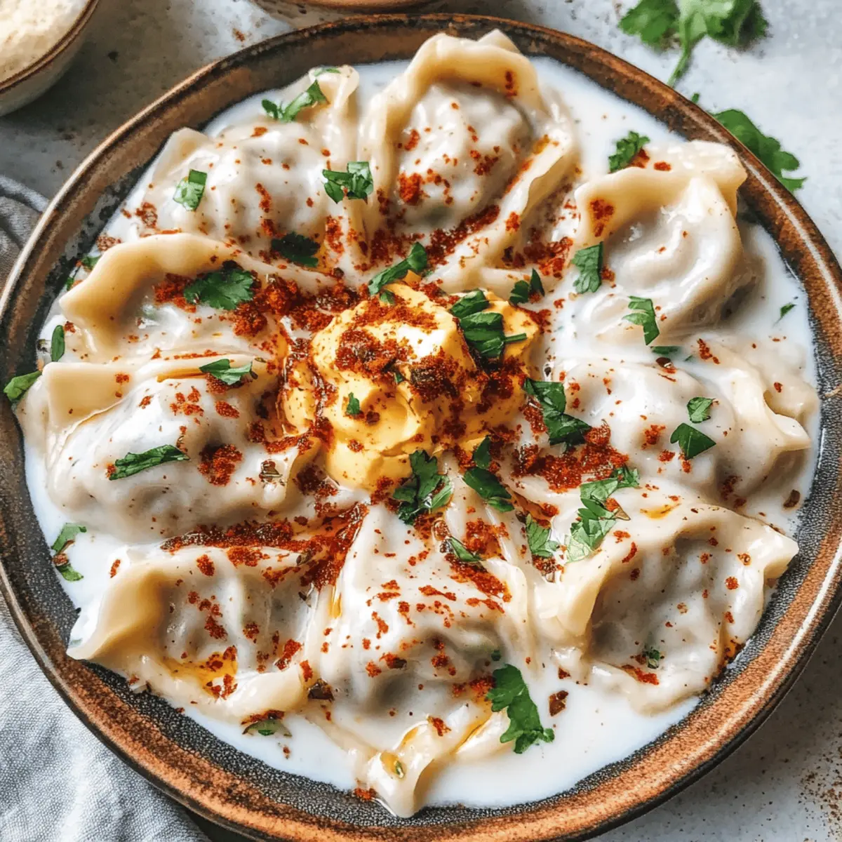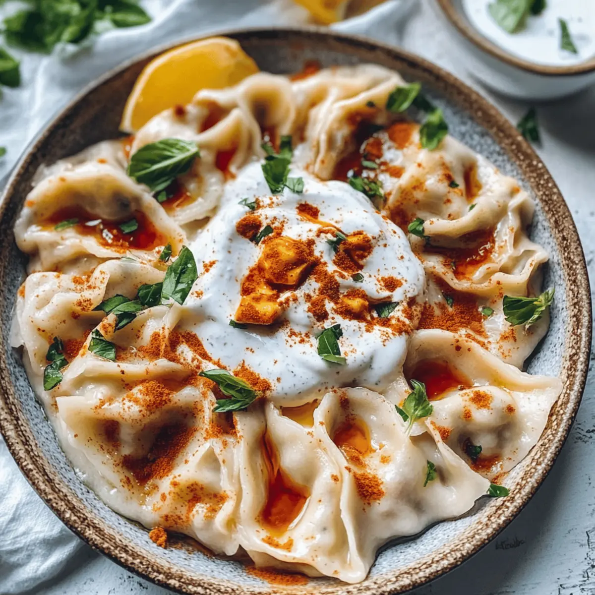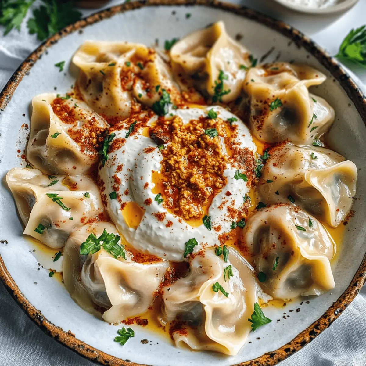 Die köstlichen vegane Manti-Teigtaschen sind nicht nur eine Freude für den Gaumen, sondern bringen auch das Gefühl von Tradition auf den Tisch. Als ich das erste Mal diese zarten Teigtaschen zubereitet habe, hat das Aroma der würzigen Füllung meine Küche in einen kleinen türkischen Markt verwandelt. Diese wunderbaren Teigtaschen bestehen aus einem selbstgemachten Teig, der mit einer herzhaften vegetarischen Mischung gefüllt ist. Die Kombination aus cremiger Joghurt-Sauce und würziger Paprika-Butter macht sie zu einem echten Highlight, das sowohl Veganer als auch Nicht-Veganer begeistern wird. Darüber hinaus sind sie schnell zubereitet und perfekt für Familienfeiern oder eine gemütliche Mahlzeit zu Hause. Habt ihr schon darüber nachgedacht, wie einfach es sein könnte, euren eigenen Genussmoment zu kreieren? Warum sind vegane Manti-Teigtaschen so besonders? Einzigartig: Diese vegane Manti-Teigtaschen sind eine kreative Abwandlung des klassischen Rezepts, das Tradition und modernste Ernährungsbedürfnisse vereint. Einfach zuzubereiten und perfekt für Kochanfänger oder Profis, die Abwechslung suchen. Vielseitig: Fülle sie mit deinen Lieblingszutaten – ob Pilze oder Linsen, die Möglichkeiten sind endlos! Herrlicher Geschmack: Die Kombination aus zartem Teig, würziger Füllung und cremiger Joghurtsoße macht jede Bissen unvergesslich. Und falls du Abwechslung suchst, warum nicht diese vegane Manti Teigtaschen mit anderen aufregenden Füllungen ausprobieren? Vegane Manti-Teigtaschen Zutaten Hinweis: Die Zutaten für diese vegane Manti-Teigtaschen sind einfach zu beschaffen und ermöglichen dir, kreative Füllungen zu verwenden! Für den Teig Mehl – Für den Teig der Manti; Allzweck- oder Pasta-Mehl ist ideal. Alternative: Vollkornmehl für eine gesündere Option. Salz – Verstärkt den Geschmack des Teigs; keine substitutions notwendig. Wasser – Befeuchtet den Teig; nutze lauwarmes Wasser für eine bessere Mischung. Für die Füllung Zwiebel – Fügt Süße und Tiefe zur Füllung hinzu; ersetze durch Schalotten für eine mildere Note. Knoblauch – Sorgt für ein starkes Aroma und Geschmack; frischer Knoblauch wird bevorzugt, nutze Knoblauchpulver als Alternative, falls nicht erhältlich. Veganes Hackfleisch – Hauptproteinbestandteil der Füllung; ersetze durch pürierte Linsen, Bohnen oder Kartoffelbrei für Variation. Tomatenmark – Verleiht der Füllung Reichhaltigkeit; du kannst auch getrocknetes Tomatenmark für einen intensiveren Geschmack verwenden. Paprikapulver – Gibt der Füllung Wärme und Charakter; geräuchertes Paprikapulver kann für zusätzliche Tiefe verwendet werden. Petersilie – Frische Kräuter, die das Gericht aufhellen; ersetze durch Koriander oder lasse es weg, wenn gewünscht. Für die Sauce Dairy-Free Joghurt – Zum Servieren; sorgt für Cremigkeit; verwende Cashewcreme für eine reichhaltigere Alternative. Gepresster Knoblauch (für die Sauce) – Fügt der Joghurtsoße Geschmack hinzu; frischer Knoblauch ist am besten; Knoblauchsalz kann als Ersatz verwendet werden. Für die Paprikabutter Vegane Butter – Wird in der Paprikabutter verwendet; ersetze durch Olivenöl, wenn nötig. Paprikapaste oder Ajvar – Für eine würzige Note in der Butter; Sriracha kann als Alternative für Schärfe dienen. Getrocknete Minze – Verleiht der Butter Geschmack; frische Minze kann für intensiveren Geschmack substituiert werden. Frische Minze (zum Garnieren) – Optional, um Frische hinzuzufügen; verwende Basilikum, wenn Minze nicht verfügbar ist. Schritt-für-Schritt-Anleitung für vegane Manti-Teigtaschen Step 1: Teig zubereiten Mische das Mehl mit dem Salz in einer großen Schüssel. Erstelle eine Mulde in der Mitte und füge langsam das lauwarme Wasser hinzu. Knete den Teig kräftig für etwa 8–10 Minuten, bis er glatt und elastisch ist. Wickele den fertigen Teig in Frischhaltefolie und lasse ihn 20–30 Minuten ruhen, damit er geschmeidiger wird. Step 2: Füllung zubereiten Erhitze das Öl in einer Pfanne und brate die fein gehackte Zwiebel, bis sie etwa 5 Minuten lang glasig ist. Füge anschließend den gepressten Knoblauch hinzu und brate ihn kurz mit. Gib das vegane Hackfleisch in die Pfanne und kochen, bis es krümelig ist. Mit Tomatenmark, Paprikapulver sowie Salz und Pfeffer abschmecken, dann die Mischung kühlen lassen. Step 3: Joghurtsoße herstellen Mische den pflanzlichen Joghurt mit dem gepressten Knoblauch und einer Prise Salz in einer Schüssel. Rühre alles gut um, bis eine homogene Soße entsteht. Stelle die Joghurtsoße im Kühlschrank kalt, während du die Manti-Teigtaschen zubereitest, damit die Aromen gut ziehen können. Step 4: Manti füllen und formen Roll den ruhenden Teig auf einer bemehlten Arbeitsfläche dünn aus, etwa 2–3 mm dick. Schneide das ausgerollte Teigblatt in gleichmäßige Quadrate von etwa 5 cm. Platziere einen Teelöffel der Füllung in die Mitte jedes Quadrates, falte die Ecken zusammen und forme sie zu kleinen Teigtaschen. Lege die Manti-Teigtaschen auf ein bemehltes Brett. Step 5: Manti kochen Bring einen großen Topf mit Salzwasser zum Kochen. Gib die Manti-Teigtaschen vorsichtig hinein und koche sie für etwa 5 Minuten, bis sie an die Oberfläche steigen und zart sind. Sie sollten weich, aber fest bleiben. Nimm die Mantis mit einer Schaumkelle heraus und lasse sie gut abtropfen. Step 6: Paprikabutter zubereiten In einem kleinen Topf die vegane Butter bei mittlerer Hitze schmelzen. Füge die Paprikapaste und die getrocknete Minze hinzu und rühre die Mischung gründlich um. Lass die Butter kurz simmer und achte darauf, dass sie nicht verbrennt; die Farben sollten leuchtend rot sein und ein aromatisches Aroma verbreiten. Step 7: Servieren Lege die heißen Manti-Teigtaschen auf einen Teller und gib großzügig die Joghurtsoße darüber. Träufle die würzige Paprikabutter darüber und garniere mit frischer Minze oder Chiliflocken, wenn gewünscht. Diese veganen Manti-Teigtaschen sind jetzt berei