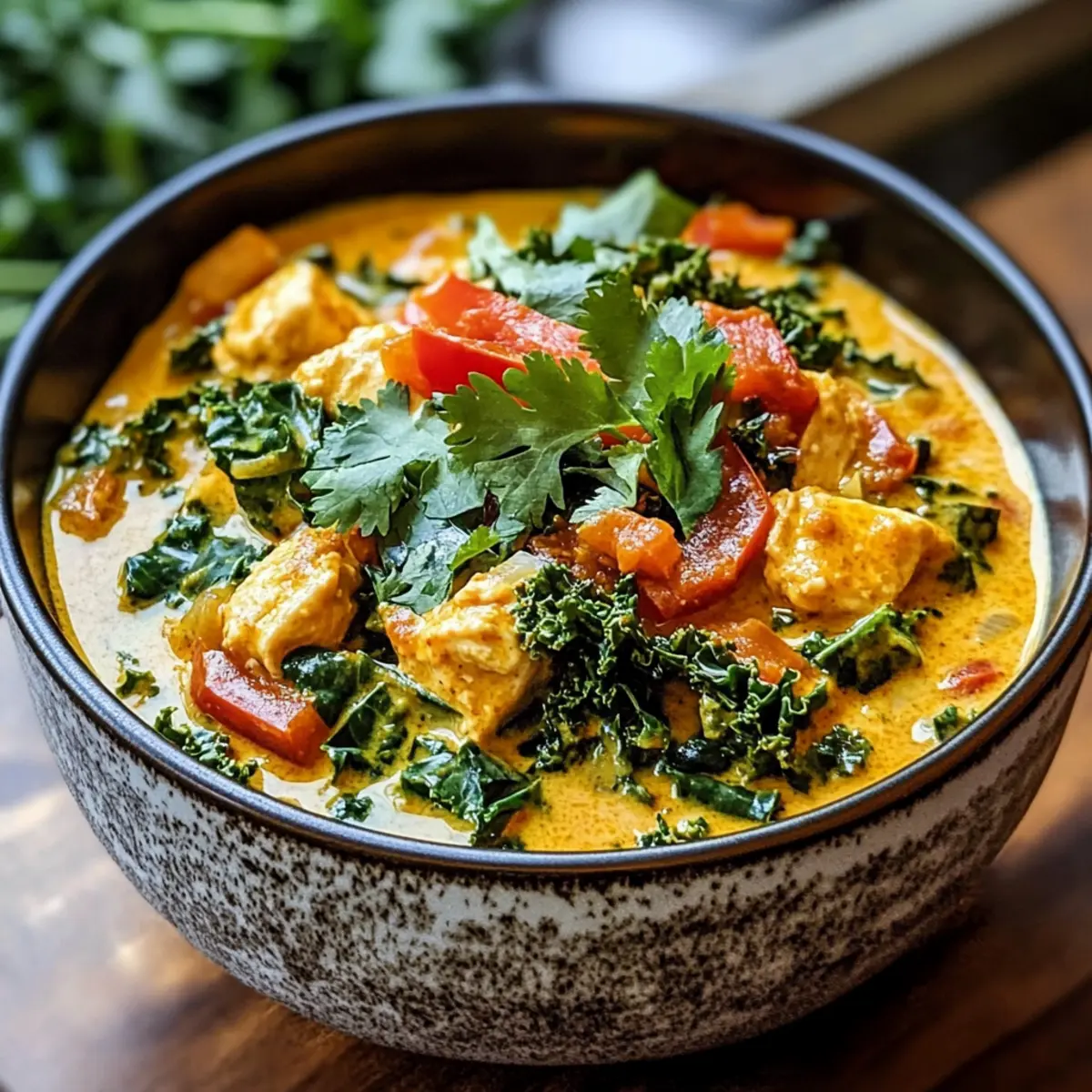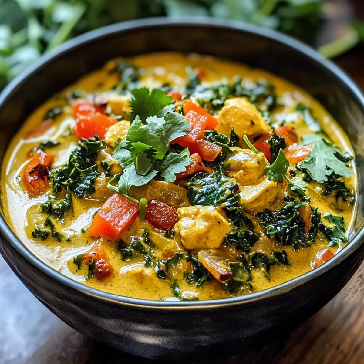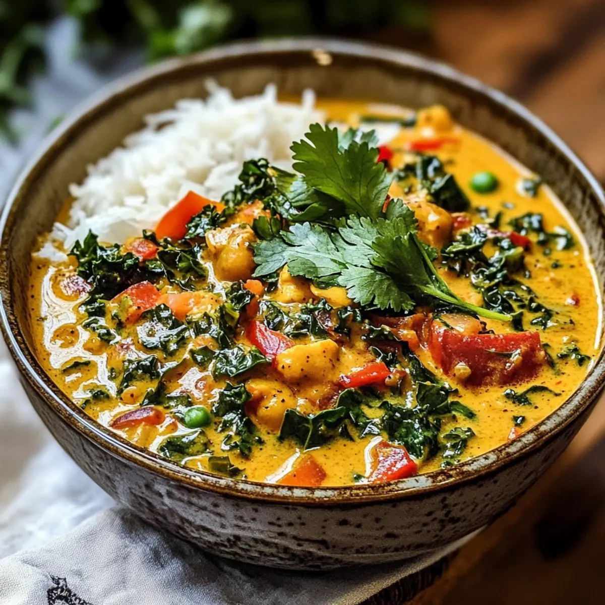 Die kalte Jahreszeit bringt nicht nur kuschelige Decken und heißen Kakao mit sich, sondern auch die perfekte Gelegenheit, um neue, wärmende Rezepte auszuprobieren. Ich freue mich, mit euch mein veganes Grünkohl-Curry zu teilen. Dieses Gericht vereint zarten Grünkohl mit einer cremigen Kokosmilch und aromatischen Gewürzen und ist ideal, um eurer Küche ein wenig Lebendigkeit zu verleihen. Es ist nicht nur schnell zubereitet, sondern auch nährstoffreich und perfekt für all jene, die gesund essen möchten, ohne auf Geschmack zu verzichten. Ob an einem trüben Nachmittag oder als Highlight eures Dinner-Abends – dieses Rezept wird euch begeistern. Was sagt ihr, bereit für eine Geschmacksexplusion? Warum wirst du dieses Rezept lieben? Einfache Zubereitung: Die Zubereitung dieses veganen Grünkohl-Currys ist ein Kinderspiel, sodass du mit minimalem Aufwand ein köstliches Gericht zaubern kannst. Nährstoffreich: Vollgepackt mit Vitaminen und Mineralien, ist dieses Curry nicht nur lecker, sondern auch gesund. Grünkohl bringt eine Fülle an Nährstoffen, die dein Wohlbefinden fördern. Vielfältige Modifikationen: Du kannst das Rezept ganz nach deinem Geschmack anpassen. Probiere alternative Gemüsesorten oder füge für mehr Protein Kichererbsen oder Tofu hinzu! Gemütlicher Genuss: Die warme, cremige Textur und die unwiderstehlichen Aromen machen dieses Gericht zum perfekten Comfort Food für kalte Tage. Schnell und zeitsparend: In weniger als einer halben Stunde kannst du ein köstliches, gesundes Essen auf den Tisch bringen – ideal für hektische Wochentage. Veganes Grünkohl-Curry Zutaten Für das Curry: Pflanzenöl – sorgt für Feuchtigkeit beim Kochen; ersetze es durch Kokos- oder Olivenöl für zusätzliche Geschmacksnuancen. Zwiebel – bildet die Geschmacksbasis; Schalotten können verwendet werden, wenn du eine mildere Note magst. Knoblauch – verstärkt den Geschmack; verwende Knoblauchpulver, wenn frischer nicht zur Hand ist. Ingwer – bringt Wärme und eine gewisse Schärfe; gemahlener Ingwer kann in der Not verwendet werden. Paprika – sorgt für Süße und Knackigkeit; kannst du durch jede Farbvariante oder eine scharfe Paprika ersetzen, wenn du es pikant magst. Karotten – fügen Süße und Nährstoffe hinzu; Süßkartoffeln sind eine tolle Alternative für eine andere Textur. Grünkohl – ein Superfood, reich an Vitaminen K und C; Grünkohl kann durch Mangold oder Blattgemüse ersetzt werden. Kokosmilch – verleiht eine cremige Konsistenz und vollen Geschmack; Mandel- oder Cashewmilch können für eine andere Note verwendet werden. Currypulver – sorgt für warme, komplexe Aromen; Garam Masala kann als Alternative für ein anderes Geschmacksprofil eingesetzt werden. Kreuzkümmel – unterstützt die Verdauung und fügt einen erdigen Geschmack hinzu; Koriander kann dafür eine Variation bieten. Kurkuma – besitzt entzündungshemmende Eigenschaften und verleiht eine goldene Farbe; ist optional, bringt aber gesundheitliche Vorteile. Salz und Pfeffer – verstärken den Gesamtschmack; passe die Menge deinen Vorlieben an. Frischer Koriander – zur Garnierung und für ein frisches Aroma; kann durch Petersilie ersetzt werden, wenn du einen anderen Kräutergeschmack möchtest. Viel Spaß beim Kochen dieses köstlichen und gesunden veganen Grünkohl-Currys! Schritt-für-Schritt-Anleitung für Veganes Grünkohl-Curry Step 1: Öl erhitzen Erhitze in einem großen Topf bei mittlerer Hitze etwas Pflanzenöl. Sobald das Öl schimmert, fügst du die Zwiebel hinzu. Brate sie für etwa 2-3 Minuten an, bis sie weich und leicht durchscheinend ist. Dies bildet die aromatische Basis für dein veganes Grünkohl-Curry. Step 2: Gewürze hinzufügen Gib den gehackten Knoblauch und den geriebenen Ingwer zur Zwiebel in den Topf. Sauté die Mischung für weitere 2 Minuten, bis du die Aromen der Gewürze riechen kannst. Achte darauf, dass der Knoblauch nicht anbrennt, da er sonst bitter wird und den Geschmack des Currys beeinträchtigen könnte. Step 3: Gemüse anbraten Füge die gewürfelte Paprika und die Karotten in den Topf hinzu. Brate alles zusammen für etwa 3 Minuten, bis das Gemüse leicht weich wird und die Farben intensiver leuchten. Dies sorgt für eine angenehme Süße in deinem veganen Grünkohl-Curry. Step 4: Grünkohl und Kokosmilch einrühren Jetzt ist es Zeit, den Grünkohl hinzuzufügen. Rühre ihn gut unter und lasse ihn für 2-3 Minuten zusammenfallen. Danach gieße die Kokosmilch in den Topf und füge die Gewürze – Currypulver, Kreuzkümmel und Kurkuma – hinzu. Rühre alles gut um, bis sich die Zutaten gleichmäßig vermischen. Step 5: Kochen und abschmecken Bring die Mischung zum Kochen und lasse sie dann bei niedriger Hitze für 20-25 Minuten köcheln. Überprüfe zwischendurch, ob das Gemüse zart ist, aber dennoch etwas Biss hat. Nach Belieben mit Salz und Pfeffer abschmecken, um das vegane Grünkohl-Curry perfekt auszubalancieren. Step 6: Servieren und garnieren Verteile das vegane Grünkohl-Curry in Schüsseln und garniere es mit frisch gehacktem Koriander. Serviere das Curry direkt warm – es passt hervorragend zu Basmatireis oder Naan. Die lebhaften Farben und der köstliche Duft machen dein Gericht zu einem echten Genuss für die Sinne. Veganes Grünkohl-Curry: Variationen & Ersatzmöglichkeiten Entdecke die vielen Möglichkeiten, wie du mein veganes Grünkohl-Curry anpassen kannst, um es noch leckerer zu machen! Anderes Grün: Verwandle dein Curry, indem du Grünkohl durch Mangold oder Spinat ersetzt – so bleibt es frisch und aufregend. Protein-Reich: Füge Kichererbsen oder Tofu hinzu, um das Gericht nicht nur nahrhafter, sondern auch sättigender zu gestalten. Diese Ergänzungen bringen eine tolle Textur und lassen dich länger satt fühlen. Würzige Note: Wenn du es gerne schärfer magst, experimentiere mit roten Chiliflocken oder einem Spritzer scharfer Sauce für den extra Kick. Diese kleinen Änderungen machen einen großen Unterschied! N