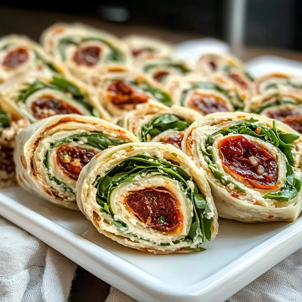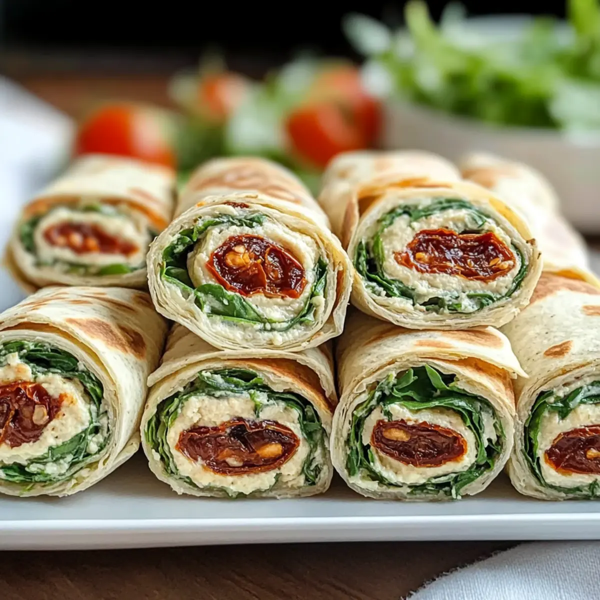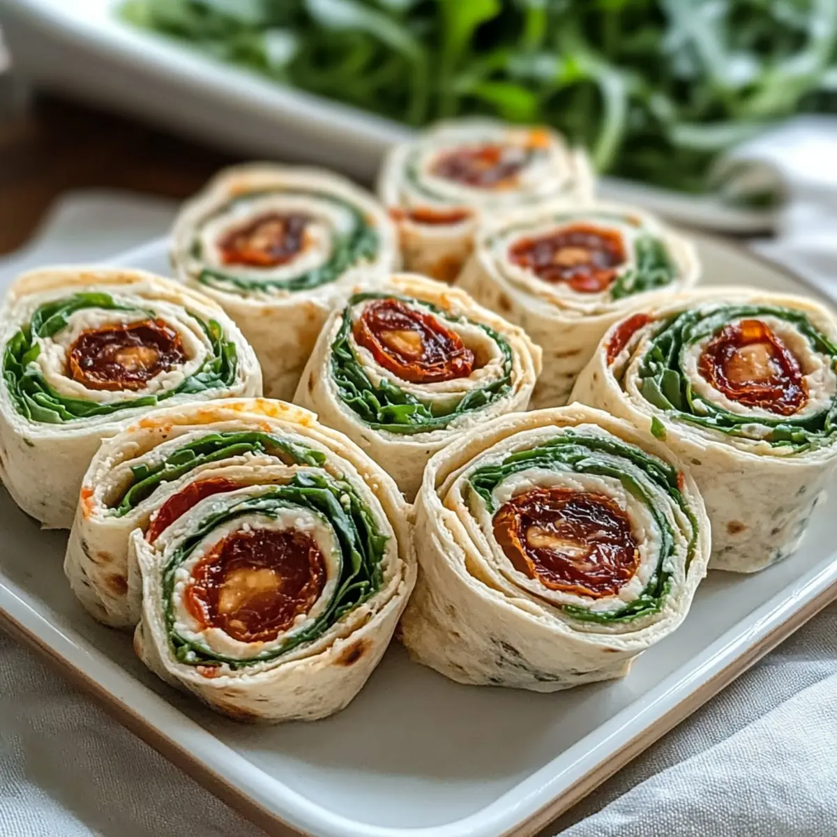 Stellen Sie sich vor, Sie sitzen an einem sonnigen Tag im Freien, umgeben von Freunden und leckerem Essen. Genau so fühlen sich die köstlichen Vegetarischen Wrap Röllchen mit Rucola und Tomaten an – sie bringen den Geschmack des Sommers direkt auf Ihren Tisch! Diese Wraps sind nicht nur schnell zubereitet, sie bieten auch die perfekte Kombination aus cremigen und frischen Aromen. Das würzige Aroma von Rucola harmoniert ganz hervorragend mit der süßlichen Fruchtigkeit getrockneter Tomaten. Mit nur 15 Minuten Vorbereitungszeit sind sie ideal für jede Gelegenheit, sei es ein Picknick im Park oder eine Feier im Freundeskreis. Neugierig auf eine einfache, gesunde Option, die garantiert alle begeistern wird? Dann lassen Sie uns gleich anfangen! Warum sind diese Wrap Röllchen so besonders? Frische Zutaten: Diese Wrap Röllchen vereinen knackigen Rucola und aromatische getrocknete Tomaten für eine unverwechselbare Geschmacksnote. Schnelle Zubereitung: In nur 15 Minuten sind sie fertig – perfekt für eilige Tage oder spontane Gäste. Vielseitigkeit pur: Mit verschiedenen Füllungen und veganen Optionen sind sie für alle geeignet. Gesunde Wahl: Reich an Vitaminen und gesunden Fetten, sind sie eine nahrhafte Alternative zu Fast Food. Schöne Präsentation: Diese farbenfrohen Röllchen machen auf jedem Buffet Eindruck und werden Ihre Freunde und Familie begeistern! Vegetarische Wrap Röllchen Zutaten Für die Füllung Rucola – verleiht Frische und eine pfeffrige Note; kann durch Spinat oder frische Kräuter ersetzt werden. Getrocknete Tomaten in Öl – sorgt für süße und umami Aromen; frische Tomaten sind ebenfalls möglich, aber die Gewürze anpassen. Frischkäse – schafft eine cremige Textur; für eine vegane Variante kann pflanzlicher Frischkäse verwendet werden. Knoblauch – intensiviert den Geschmack; nach Belieben weglassen oder mit Knoblauchpulver ersetzen. Bio-Zitrone – bringt Helligkeit; ein Spritzer Zitronensaft kann zusätzlichen Schwung geben. Salz & Pfeffer – nach Geschmack würzen. Weizen-Tortillas – Hauptbestandteil; für glutenfreie Versionen eignen sich Vollkorn- oder Maistortillas. Für die Präsentation Optional: extra Rucola – für eine hübsche Garnitur beim Servieren. Optional: Dip – ein leichter Joghurt- oder Basilikum-Pesto-Dip passt hervorragend dazu. Diese köstlichen Vegetarischen Wrap Röllchen mit Rucola und Tomaten sind nicht nur schnell zubereitet, sondern bieten auch eine wunderbare Möglichkeit, frische Zutaten zu genießen! Schritt-für-Schritt-Anleitung für Vegetarische Wrap Röllchen mit Rucola und Tomaten Step 1: Rucola vorbereiten Waschen Sie den Rucola gründlich unter fließendem Wasser, um Schmutz zu entfernen. Lassen Sie ihn in einer Saladschleuder abtropfen oder tupfen Sie ihn mit einem Küchentuch trocken. Anschließend hacken Sie den Rucola fein und geben ihn in eine große Schüssel als Basis für Ihre köstlichen Vegetarischen Wrap Röllchen. Step 2: Tomaten hacken Öffnen Sie das Glas mit den getrockneten Tomaten und lassen Sie das Öl abtropfen. Schneiden Sie die Tomaten in kleine Stücke und fügen Sie sie zur Schüssel mit dem Rucola hinzu. Die süßen und umami-reichen Aromen der Tomaten werden die Füllung für die Wraps wunderbar ergänzen. Step 3: Füllung kombinieren Geben Sie den Frischkäse, den gepressten Knoblauch, die Zitronenschale, Salz und Pfeffer in die Schüssel mit Rucola und Tomaten. Mischen Sie alles gründlich mit einem Löffel oder einem Spatel, bis eine cremige Konsistenz erreicht ist. Achten Sie darauf, dass alle Zutaten gut verteilt sind, um den Geschmack in den Vegetarischen Wrap Röllchen mit Rucola und Tomaten optimal zu entfalten. Step 4: Füllen und rollen Legen Sie eine Weizen-Tortilla auf ein sauberes Schneidebrett oder eine Arbeitsfläche. Verteilen Sie eine großzügige Menge der Füllung gleichmäßig über die gesamte Fläche der Tortilla. Rollen Sie die Tortilla straff auf, so dass die Füllung gut eingeschlossen bleibt. Wickeln Sie die fertigen Wraps in Frischhaltefolie und lassen Sie sie für mindestens eine Stunde im Kühlschrank ruhen, damit sie sich setzen. Step 5: Schneiden und servieren Nehmen Sie die Wraps aus dem Kühlschrank und entfernen Sie vorsichtig die Frischhaltefolie. Schneiden Sie jeden Wrap in etwa 8 gleich große Stücke, damit sie leicht zu essen sind. Arrangieren Sie die Röllchen auf einem Servierteller und garnieren Sie sie nach Belieben mit extra Rucola. Jetzt sind Ihre Vegetarischen Wrap Röllchen mit Rucola und Tomaten bereit zum Servieren! Variationen der Vegetarischen Wrap Röllchen Lassen Sie Ihrer Kreativität freien Lauf und passen Sie diese köstlichen Wraps an Ihre Vorlieben an! Vegan: Ersetzen Sie den Frischkäse durch einen pflanzlichen Frischkäse, um eine vegane Variante zu kreieren. So genießen auch Pflanzenliebhaber den vollen Geschmack! Kräuter-Boost: Fügen Sie frische Kräuter wie Basilikum, Petersilie oder Minze hinzu, um einen zusätzlichen Geschmackskick zu bekommen. Diese frischen Aromen verleihen den Wraps eine ganz neue Dimension. Nachhaltig: Verwenden Sie saisonales Gemüse wie Paprika oder Gurken, um die Füllung zu variieren. Dies macht die Wraps nicht nur lecker, sondern auch umweltfreundlich! Schärfe: Für mehr Würze können Sie gehackte Jalapeños oder einen Spritzer scharfe Sauce in die Füllung integrieren. Eine aufregende Kombination für alle, die es lieben, ihre Speisen scharf zu genießen! Getrocknete Früchte: Experimentieren Sie mit gehackten getrockneten Aprikosen oder Feigen für eine süßliche Note, die perfekt mit dem Rucola harmoniert. Eine unerwartete, aber köstliche Ergänzung! Crunchy Texture: Fügen Sie geröstete Sonnenblumenkerne oder Nüsse hinzu, um einen crunchy Effekt zu erzielen. Dies verleiht den Wraps nicht nur mehr Textur, sondern auch zusätzliche Nährstoffe. Glutenfrei: Nutzen Sie glutenfreie Tortillas aus Reis oder Mais, um diese Wraps für alle erreichbarer zu machen. So genießen auch glu