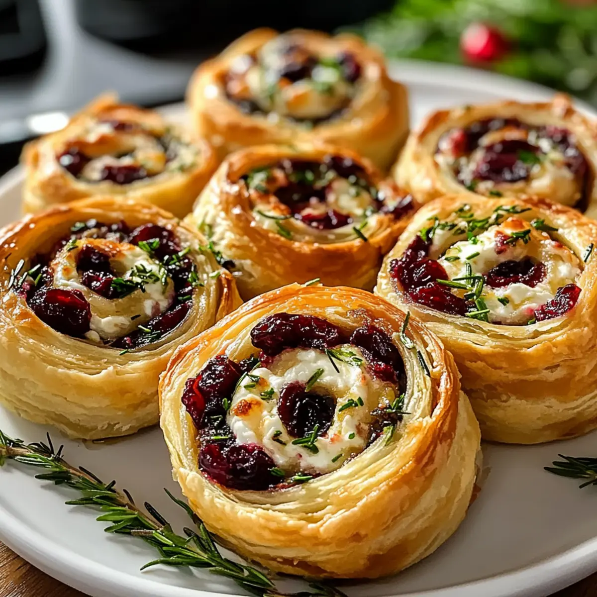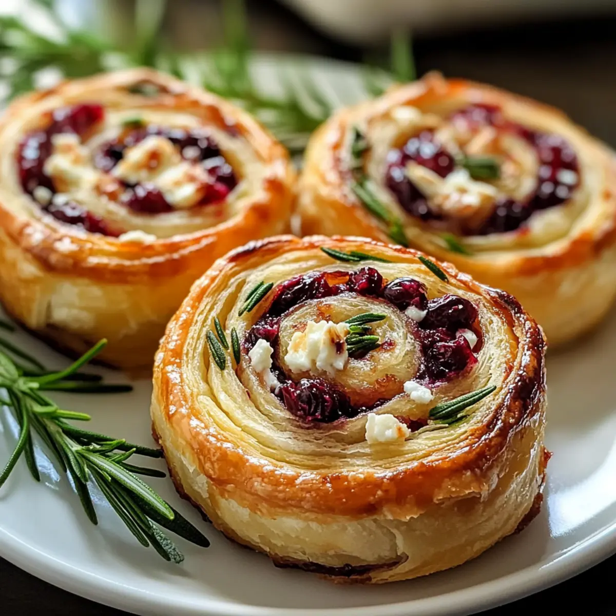 In der hektischen Vorweihnachtszeit kann es eine echte Herausforderung sein, etwas Festliches und Einladendes auf den Tisch zu bringen. Doch die Weihnachts-Cranberry-Feta-Pinwheels sind die perfekte Lösung für stressfreie Festtagsvorbereitungen! Diese köstlichen kleinen Röllchen vereinen die süße Säure von Cranberries mit dem herzhaften Geschmack von Feta und sind dabei so einfach zuzubereiten, dass Sie mehr Zeit für Ihre Lieben haben. Sie sind nicht nur ein wahrer Blickfang für jede Feier, sondern auch eine vielseitige Option, die sich hervorragend vorbereiten und sogar einfrieren lässt. Seien Sie bereit, Ihre Gäste mit diesem vegetarischen Leckerbissen zu verzaubern – oder sogar einfach nur sich selbst eine kleine Freude zu machen! Wer kann denn schon dem Duft von frisch gebackenem Teig und würzigen Kräutern widerstehen? Lassen Sie uns gemeinsam in die Zubereitung dieser festlichen Köstlichkeit eintauchen! Warum sind diese Pinwheels unverzichtbar? Vielfältig einsetzbar: Diese Weihnachts-Cranberry-Feta-Pinwheels sind die perfekte Ergänzung für jede Feier. Einfache Zubereitung: Der unkomplizierte Prozess erfordert nur grundlegende Kochfähigkeiten und minimalen Aufwand. Aromatische Aromen: Die Kombination aus süßen Cranberries und salzigem Feta bringt einen einzigartigen Geschmack, der Ihre Gäste begeistern wird. Vorschau mit Vorfreude: Ideal zum Vorbereiten – Sie können sie im Voraus zubereiten und sogar einfrieren, was Zeit und Stress spart. Verführerische Optik: Diese kleinen Röllchen sind nicht nur lecker, sondern auch ein echter Hingucker auf jedem Tisch! Überzeugen Sie sich selbst, und vergessen Sie nicht, dazu ein Glas sprudelnden Apfelwein zu servieren! Zutaten für Weihnachts-Cranberry-Feta-Pinwheels Puff Pastry – Sorgt für eine flauschige und knusprige Textur; nutzen Sie am besten Butter-Puff-Pastry für intensiveren Geschmack. Frischkäse – Fügt Cremigkeit hinzu und bindet die Füllung; verwenden Sie immer weichen Frischkäse für eine einfache Verarbeitung. Feta-Käse – Bringt einen salzigen, würzigen Kick, der die Süße der Cranberries ausgleicht; substituieren Sie ihn nach Belieben durch Ziegenkäse für einen milderen Geschmack. Getrocknete Cranberries – Liefert Süße und eine fruchtige Note; sicherstellen, dass sie fein gehackt sind, damit sie gleichmäßig verteilt sind. Frischer Rosmarin – Fügt aromatisches Flair hinzu; kann durch Thymian ersetzt oder ganz weggelassen werden. Frische Thymianblätter – Ergänzen den Geschmack der Kräuter; kann durch Salbei ersetzt werden, wenn gewünscht. Heller Brauner Zucker – Verstärkt die Süße und balanciert die Aromen; verwenden Sie auch normalen Zucker als Ersatz. Schwarzer Pfeffer – Gibt einen Hauch von Würze; frisch gemahlen sorgt für die besten Ergebnisse. Knoblauchpulver (optional) – Verleiht dem Geschmack eine tiefere Dimension; weglassen für einen milderen Geschmack. Salz – Hebt die Aromen hervor; nach Geschmack anpassen. Ei – Wird für die Eierreinigung verwendet, um eine goldbraune Oberseite zu erzielen; für eine vegane Option können Sie auch einen Ersatz verwenden. Wasser oder Milch – Zum Verdünnen der Eierreinigung; jede Pflanzenmilch kann für eine milchfreie Option verwendet werden. Garnitur (optional) – Frische Rosmarinzweige oder ganze Cranberries für eine ansprechende Präsentation. Schritt-für-Schritt-Anleitung für Weihnachts-Cranberry-Feta-Pinwheels Step 1: Füllung zubereiten Weichen Sie den Frischkäse bei Raumtemperatur auf, und schlagen Sie ihn in einer Schüssel cremig. Fügen Sie den zerbröckelten Feta, die gehackten getrockneten Cranberries, den braunen Zucker, die frisch gemahlenen schwarzen Pfefferkörner und optional das Knoblauchpulver hinzu. Mischen Sie alles gut, bis die Zutaten gleichmäßig vermengt sind. Schmecken Sie die Füllung ab und passen Sie die Gewürze nach Belieben an. Step 2: Ersten Log rollenzusammenstellen Rollen Sie ein Blatt Blätterteig auf einer leicht bemehlten Fläche zu einem Rechteck von etwa 25×30 cm aus. Verteilen Sie die Hälfte der Füllung gleichmäßig auf dem Blätterteig, und lassen Sie dabei einen Rand von etwa 2,5 cm frei. Rollen Sie den Teig vorsichtig aber fest von der kurzen Seite her auf, um einen Log zu formen, und drücken Sie die Kanten zusammen, um sie zu versiegeln. Step 3: Kühlen und schneiden Wickeln Sie den Blätterteig-Log in Frischhaltefolie und legen Sie ihn für 15-20 Minuten in das Gefrierfach oder für 30-45 Minuten in den Kühlschrank. Dadurch wird das Schneiden der Weihnachts-Cranberry-Feta-Pinwheels erleichtert. Nehmen Sie den Log heraus und schneiden Sie ihn in 1,5 cm dicke Scheiben mit einem scharfen Messer. Step 4: Zweite Logrolle wiederholen Nutzen Sie das zweite Blatt Blätterteig zusammen mit der verbleibenden Füllung, und folgen Sie denselben Schritten wie in der vorherigen Anleitung. Achten Sie darauf, die Füllung gleichmäßig zu verteilen und den Teig wieder fest aufzurollen. Dies stellt sicher, dass jede Rolle köstlich gefüllt ist. Step 5: Für das Backen vorbereiten Heizen Sie den Ofen auf 200 °C vor und legen Sie ein Backblech mit Backpapier aus. Platzieren Sie die geschnittenen Pinwheels mit genügend Abstand auf dem Blech, damit sie beim Backen ausreichend Platz haben. Dies sorgt dafür, dass sie gleichmäßig aufgehen und knusprig werden. Step 6: Eierreinigung auftragen und backen Verquirlen Sie das Ei mit etwas Wasser oder Milch in einer kleinen Schüssel und verwenden Sie einen Pinsel, um die Oberseite der Pinwheels gleichmäßig mit der Eierreinigung zu bestreichen. Backen Sie die Weihnachts-Cranberry-Feta-Pinwheels im vorgeheizten Ofen für etwa 15-20 Minuten, bis sie goldbraun und flauschig sind. Drehen Sie das Blech während des Backens einmal, um eine gleichmäßige Bräunung zu gewährleisten. Step 7: Abkühlen und servieren Lassen Sie die Pinwheels nach dem Backen einige Minuten ruhen, damit sie etwas abkühlen und fester werden. Servieren Sie 